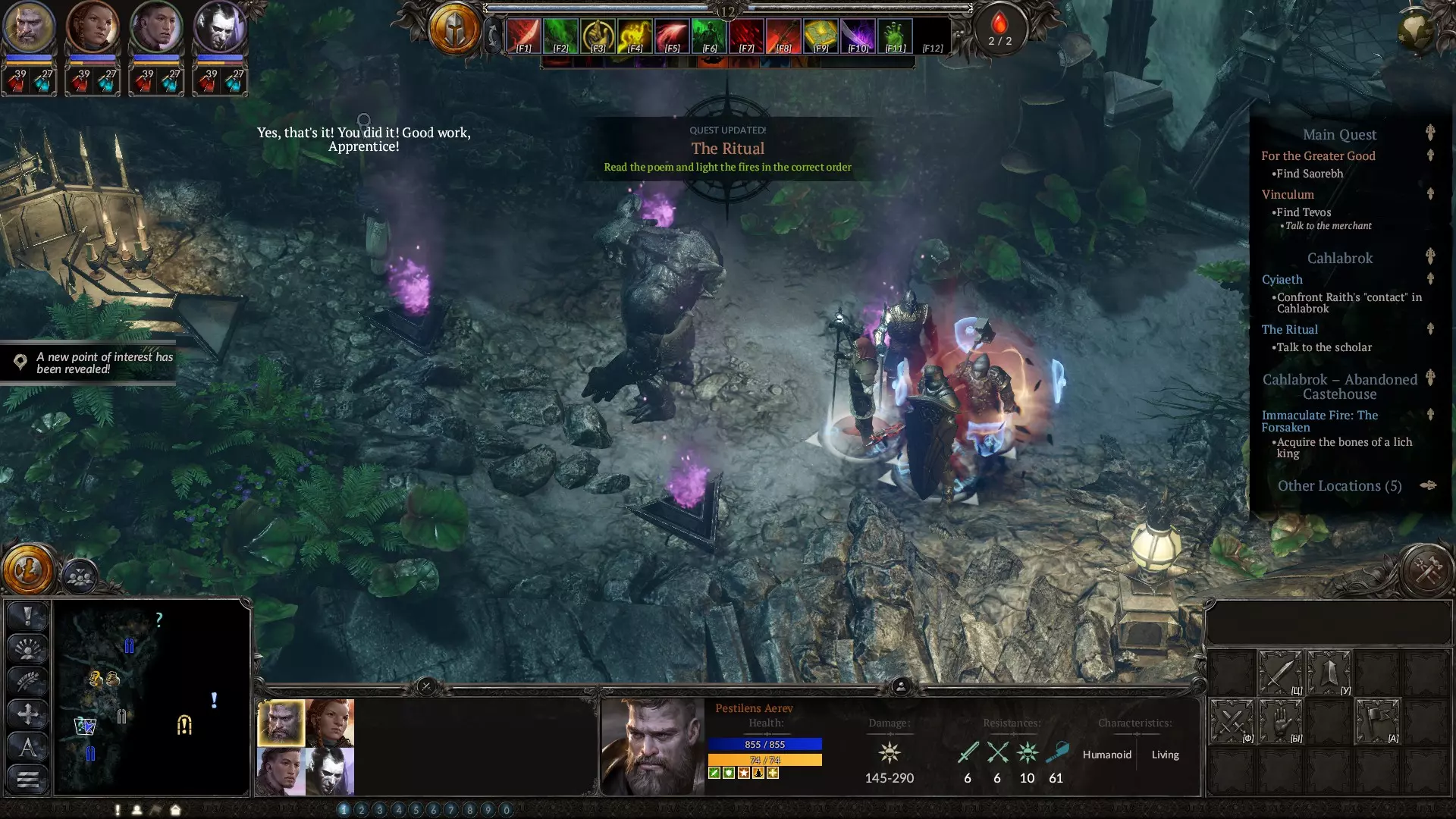 3.引诱敌人。在战役初期的纯角色扮演任务中行进时,对付小股敌人是个不错的策略。 4.尝试专注使用少量主动技能。嗯,至少如果你和我一样是休闲玩家,在无法暂停的实时游戏中,你很难同时使用大量技能,而且技能环形菜单对我来说不太方便,所以我采用以下方案: F1 - 单体技能,主要用于强大目标,例如【灵魂收割】, F2 - 范围技能,【腐蚀之地】, F3-F4 - 紧急治疗技能,如【祝福】和【生命绽放】, F5 - 任何我觉得有用的技能,比如另一个治疗技能、某种护盾或【虚空箭】,我通常就是这么做的。F6-F12是我会使用的技能,但使用频率不高,也不是紧急技能。按住Shift键可以解锁第二技能栏,我通常会把所有光环技能放在这里。F1-F4应该留给那些冷却时间长或效果持续久的技能,比如召唤尸骸魔像。 5. 选择你的种族。作为圆环法师,你的敌人相当难缠,而且在最近的补丁更新后变得更强了。购买能够降低建筑和单位成本的图纸是个不错的主意。由于它们的成本较高,最好选择一个你喜欢的种族一直使用。为了本攻略的游戏流程,我选择了黑暗精灵,以增强自己作为终极黑暗领主—— necromancer的感觉。