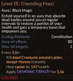 不错,但也就这样了。这是个不错的技能,具有高额的反生命纯伤害,对某些 bosses 效果很好。三级时有范围伤害,但范围太小,实际效果有限,冷却时间也相当长。在我看来,它并非绝对必要,但学了也不会后悔。 4. 不洁盛宴(防御技艺协同)