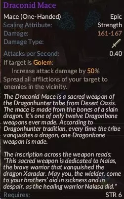 击败树人后可从卡拉布罗克铁匠处获得。这是一把总体不错的武器,能让你在法术冷却期间吸取一些专注值和生命值。