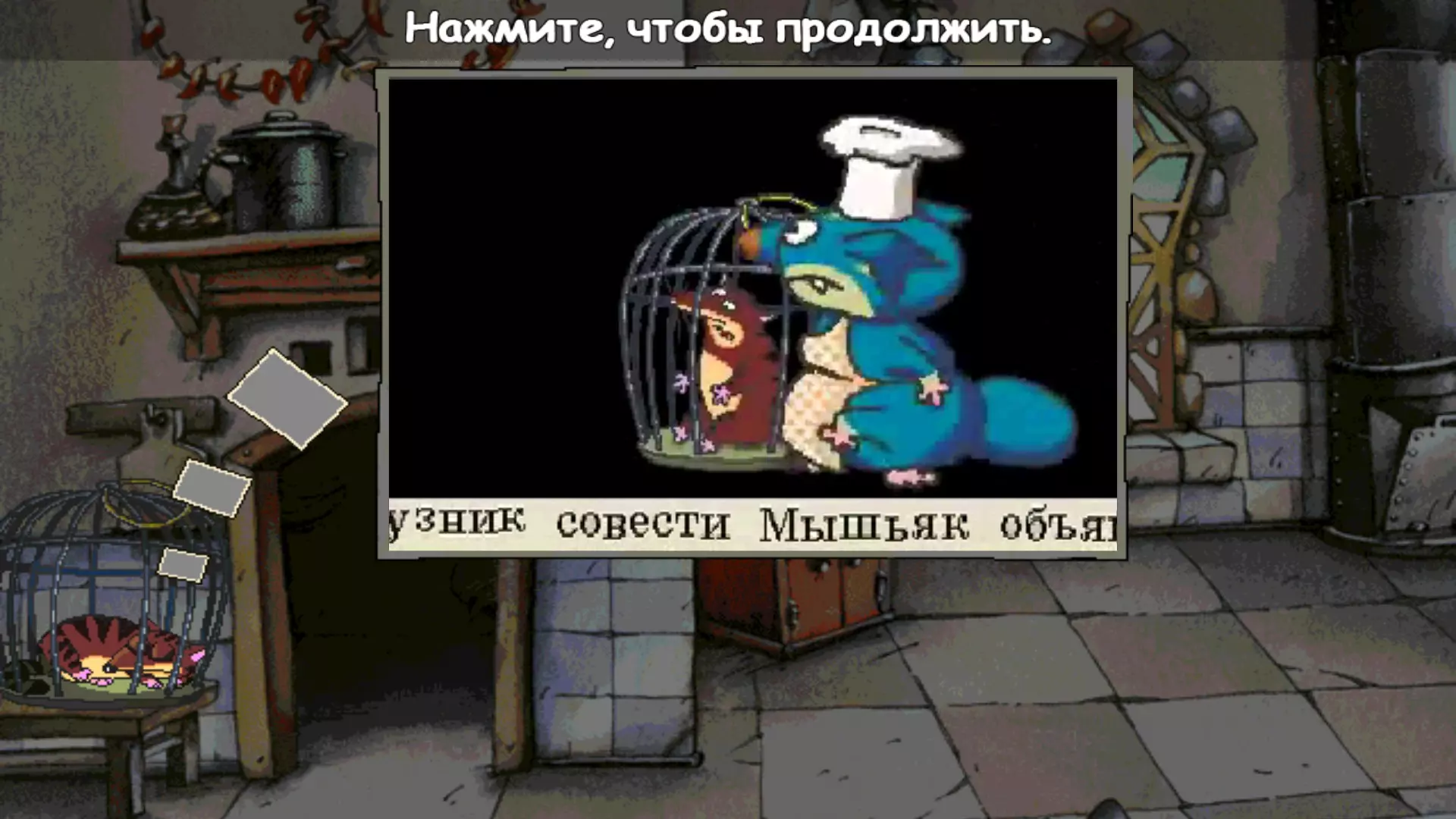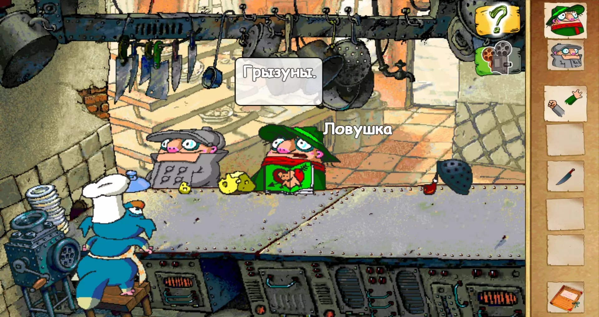 操作方面,这里会相当特别。我们有两个角色,其中一个集智慧与力量于一身,另一个则天真烂漫且运气极佳。有时需要在他们之间进行切换(可以通过物品栏条,也可以直接点击所需角色)。特别是那位搭档,他坚决不肯拿物品(或许他没有口袋?),还会说出这个系列的标志性台词——“我什么都不明白!”这可能会引发不健康的怀旧情绪,让人想要重温这部动画片。为了完成任务,在每个“场景”中我们都必须收集主要物品,并按照正确的顺序在特定位置使用它们。不过不必担心,这款游戏的年龄分级是6+。因此,为了不让玩家费心,游戏中添加了一个可以观看谜题正确解法视频的按钮。虽然这里不太可能出现太大的困难——所有可互动物品都有标注。 煤铲 好吧,这玩意儿甚至都不能算是铲子,更像是个更实在的东西。 1) 游戏的画面依然保持着它发行时的样子。提醒一下——那可是1998年。 2) 游戏的分辨率大概是800乘600。 3) 实际上没有什么设置选项。我们只能关闭音乐或文字。 4) 配音文本有时与角色头顶显示的台词不符。我个人使用Win 8.1系统,光标动画始终没有出现。但我记得以前是有的。