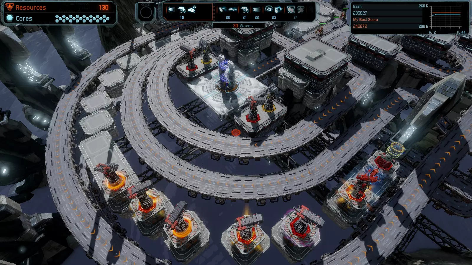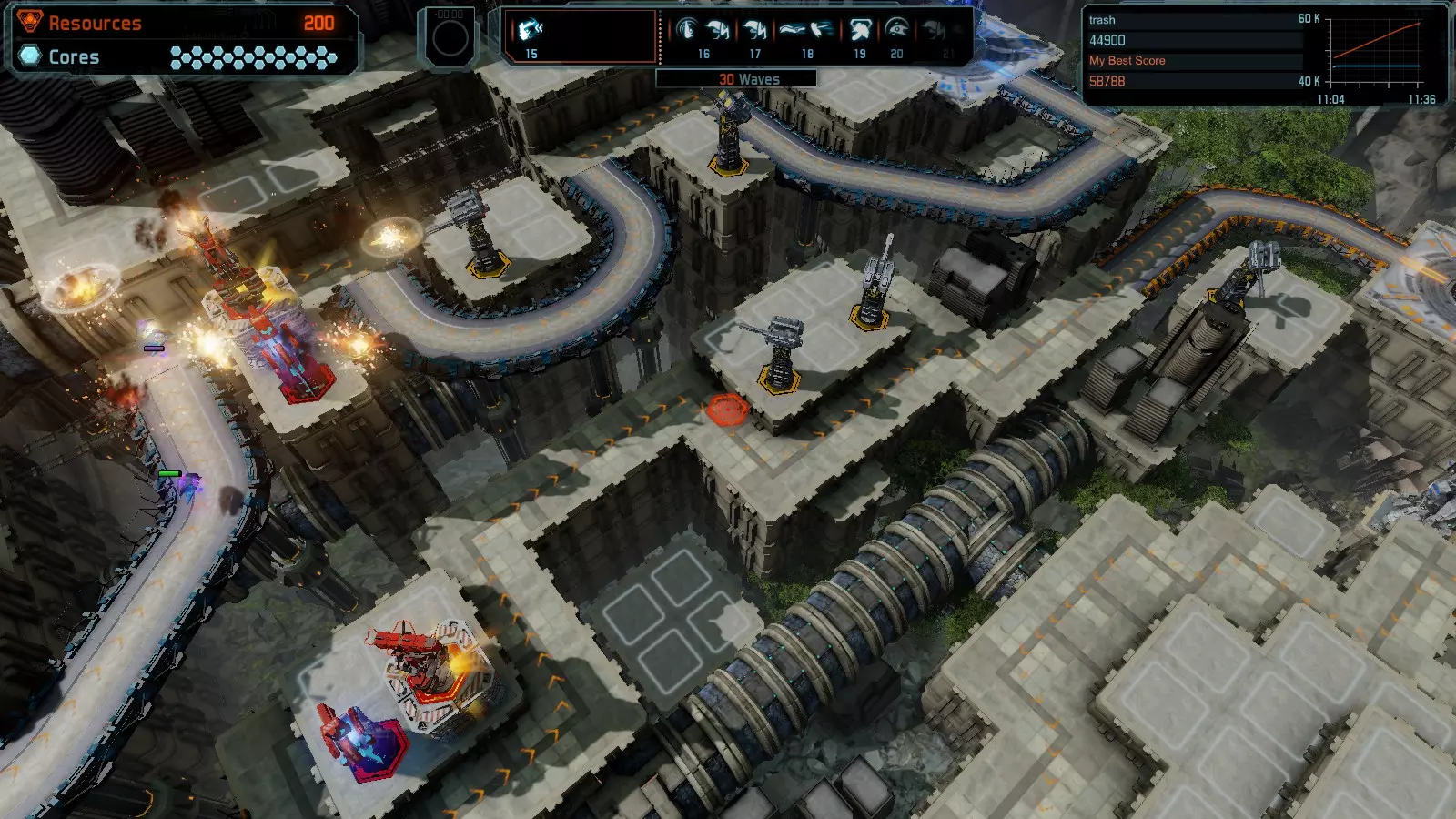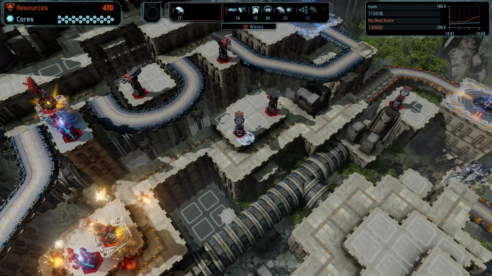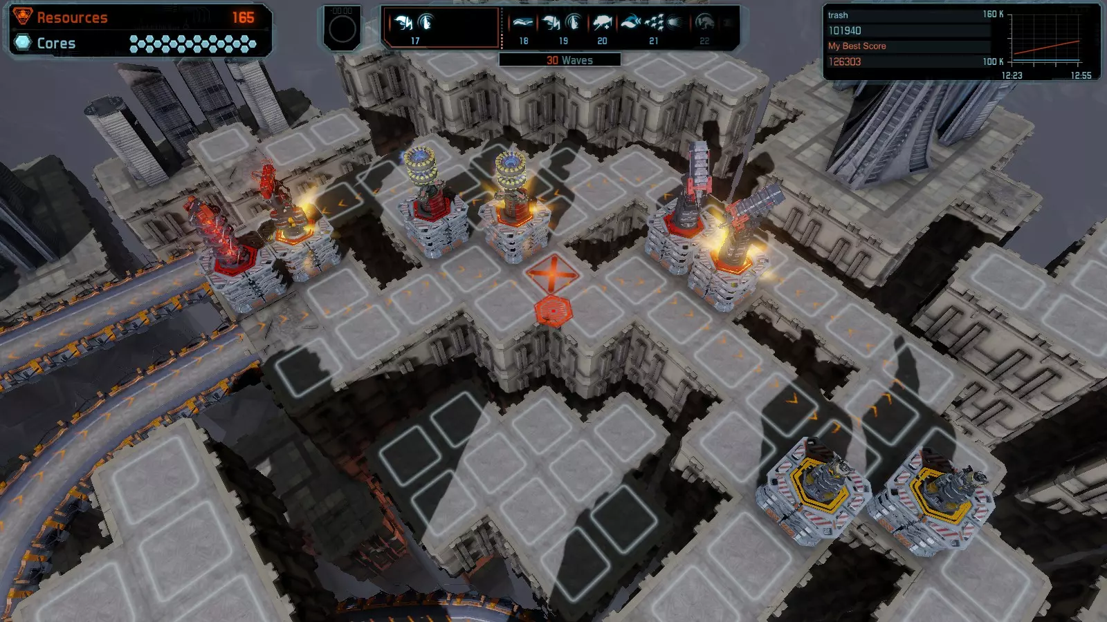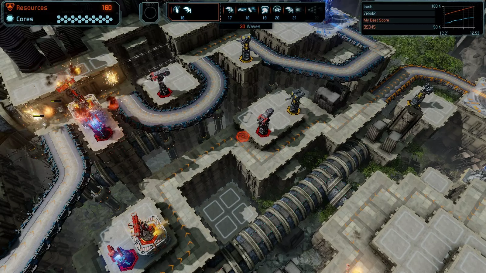 第19关 失控 本指南将介绍如何在简单难度下的开放模式和竞争模式中在此地图获得金牌。 此布局可在以下所有模式中获得金牌: 固定资源 焦点模式 有限塔防 全装模式 冰封核心 练习模式 建造方案: 1座红色时间塔 1座强化塔搭配1座红色激光塔 3座强化塔作为障碍物 4座强化塔搭配4座红色震荡塔,其中1座配备干扰器,1座配备得分加成 17座红色加农炮