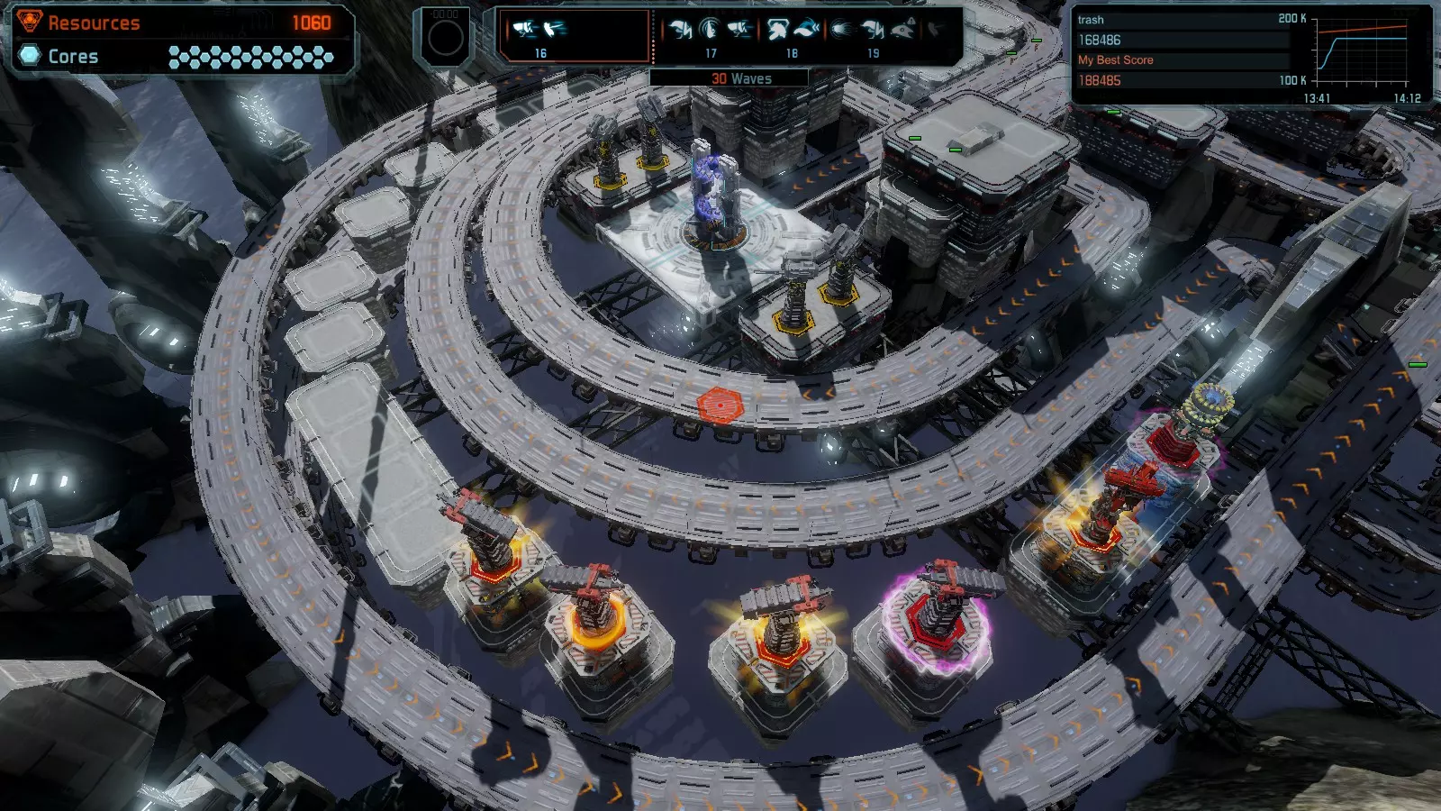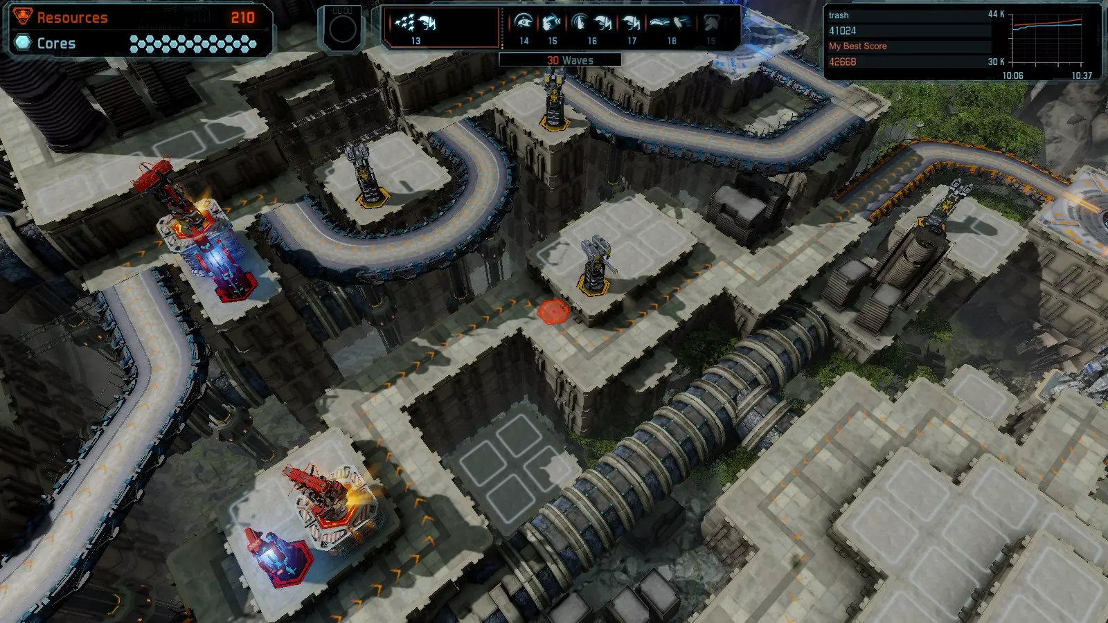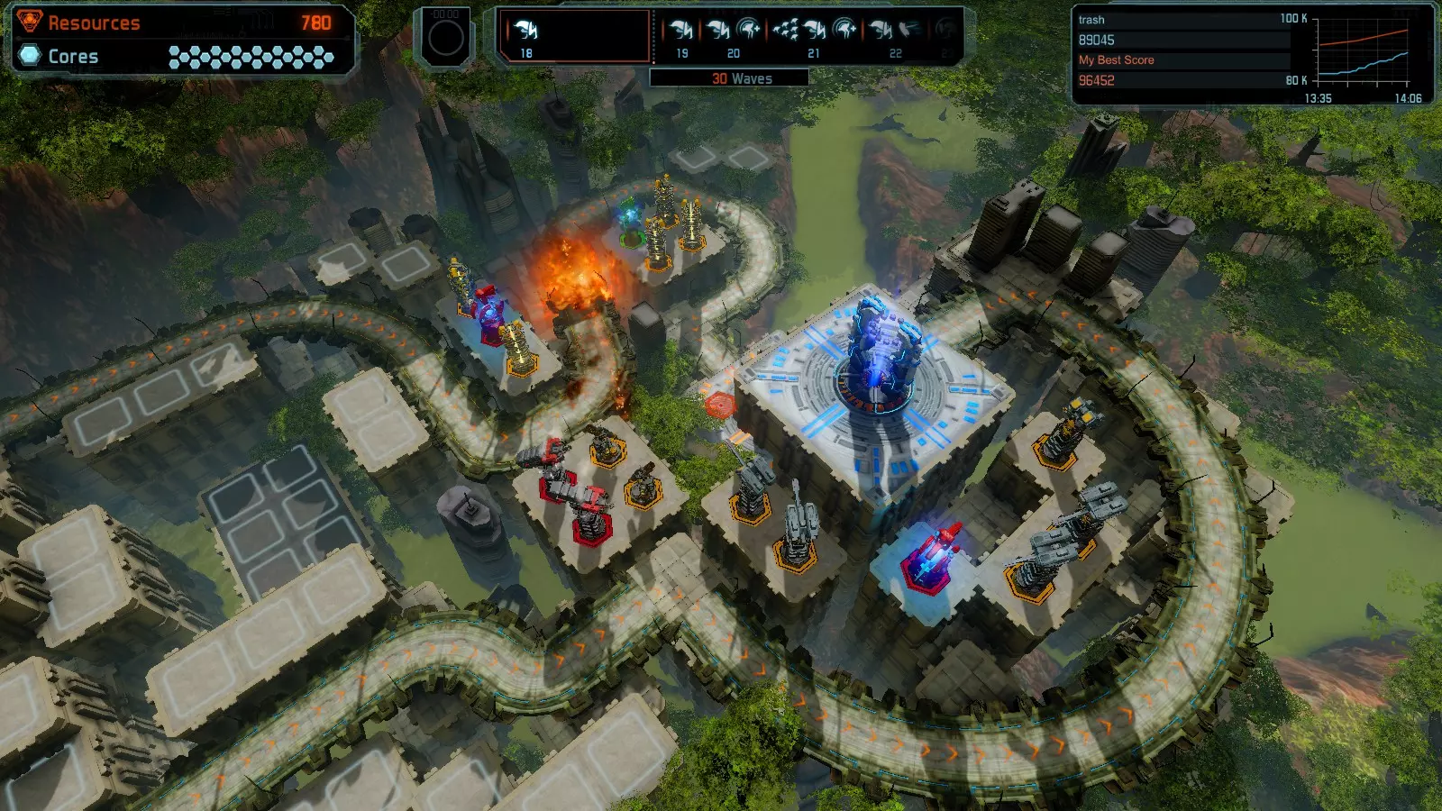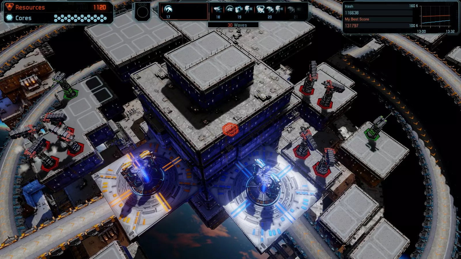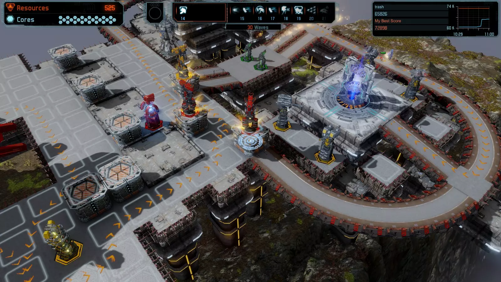 第19关 失控 本指南将介绍如何在简单难度下的开放模式和竞争模式中在此地图获得金牌。 此布局可在以下所有模式中获得金牌: 固定资源 焦点模式 有限塔防 全装模式 冰封核心 练习模式 建造方案: 1座红色时间塔 1座强化塔搭配1座红色激光塔 3座强化塔作为障碍物 4座强化塔搭配4座红色震荡塔,其中1座配备干扰器,1座配备得分加成 17座红色加农炮
