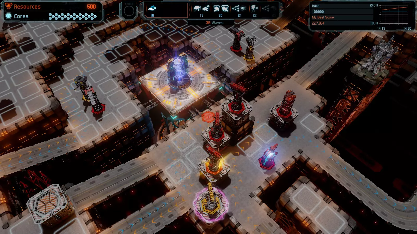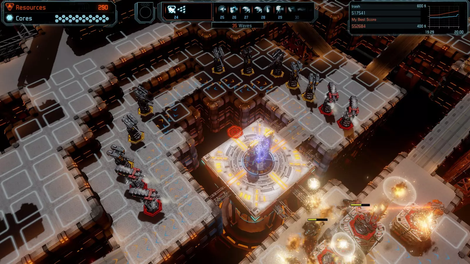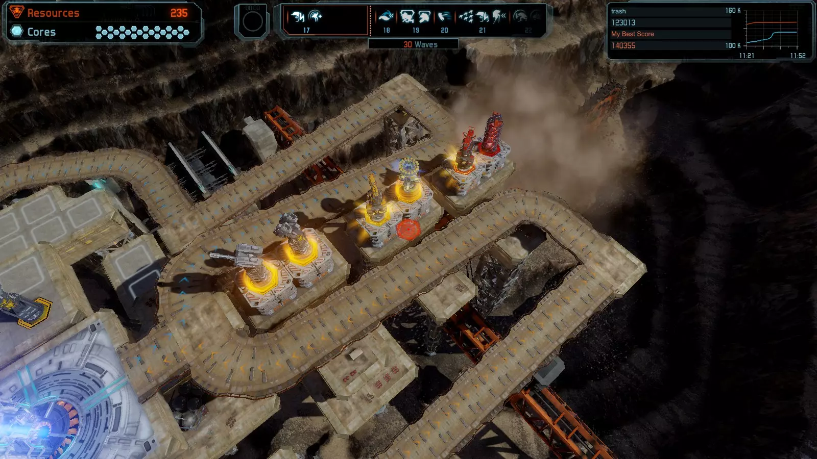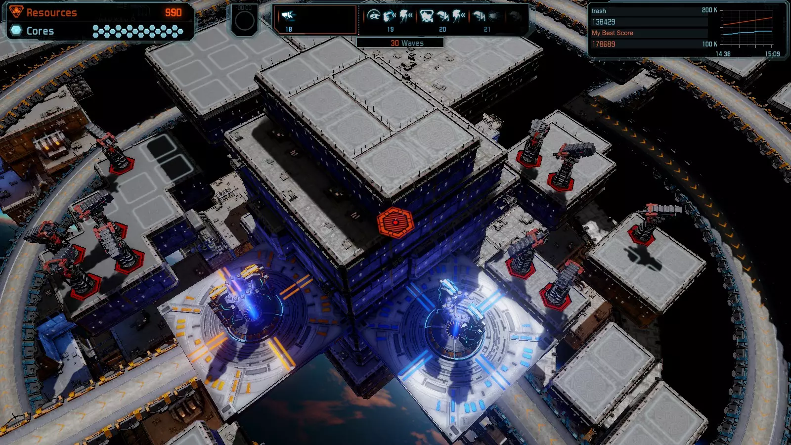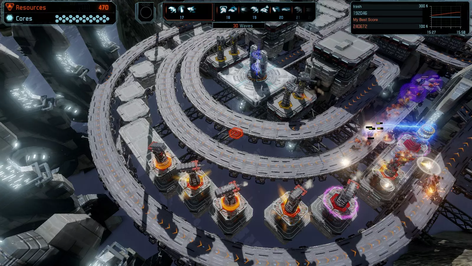 第19关 失控 本指南将介绍如何在简单难度下的开放模式和竞争模式中在此地图获得金牌。 此布局可在以下所有模式中获得金牌: 固定资源 焦点模式 有限塔防 全装模式 冰封核心 练习模式 建造方案: 1座红色时间塔 1座强化塔搭配1座红色激光塔 3座强化塔作为障碍物 4座强化塔搭配4座红色震荡塔,其中1座配备干扰器,1座配备得分加成 17座红色加农炮