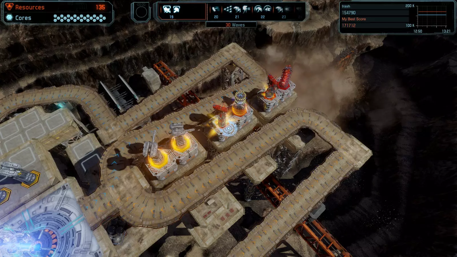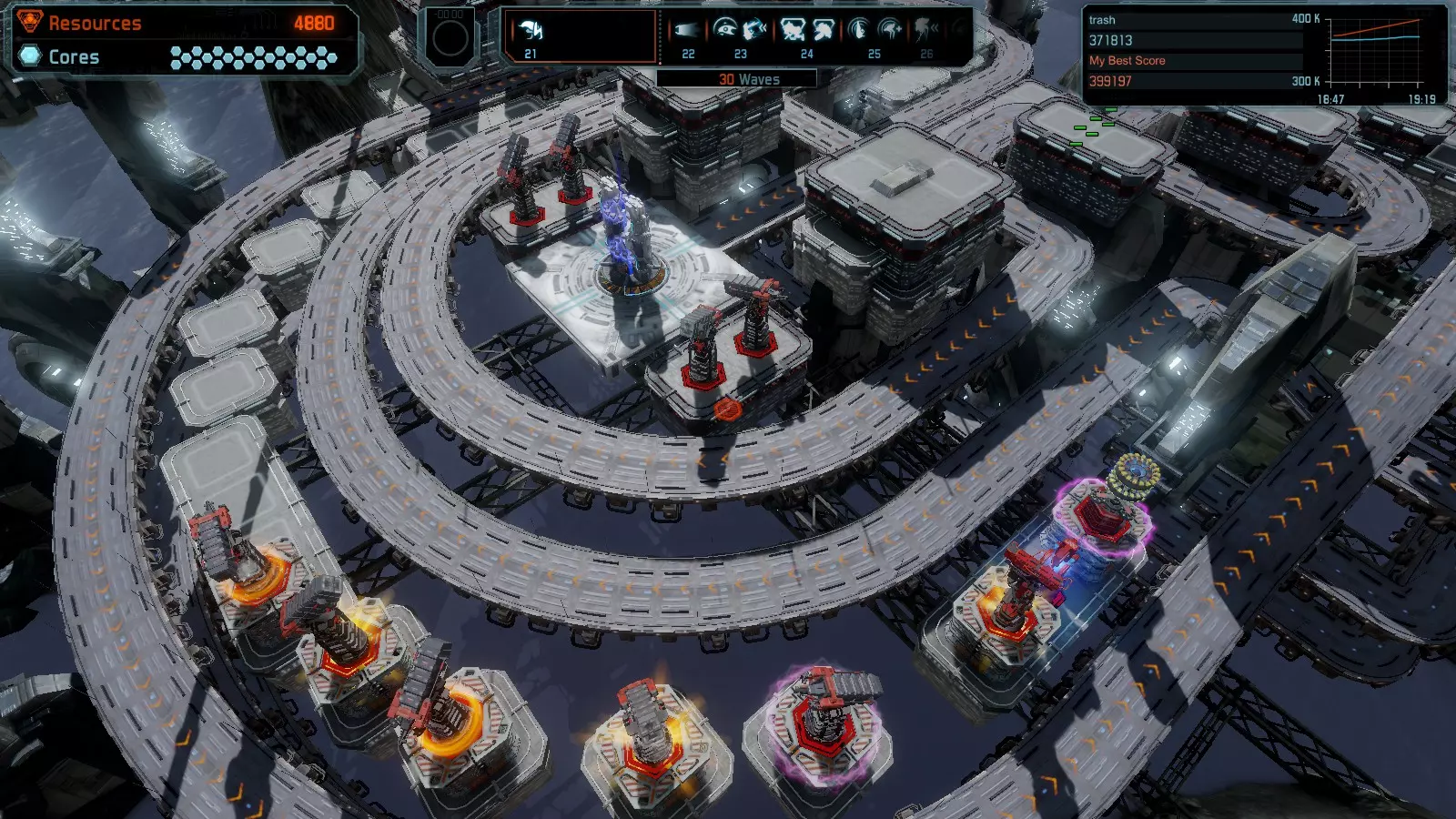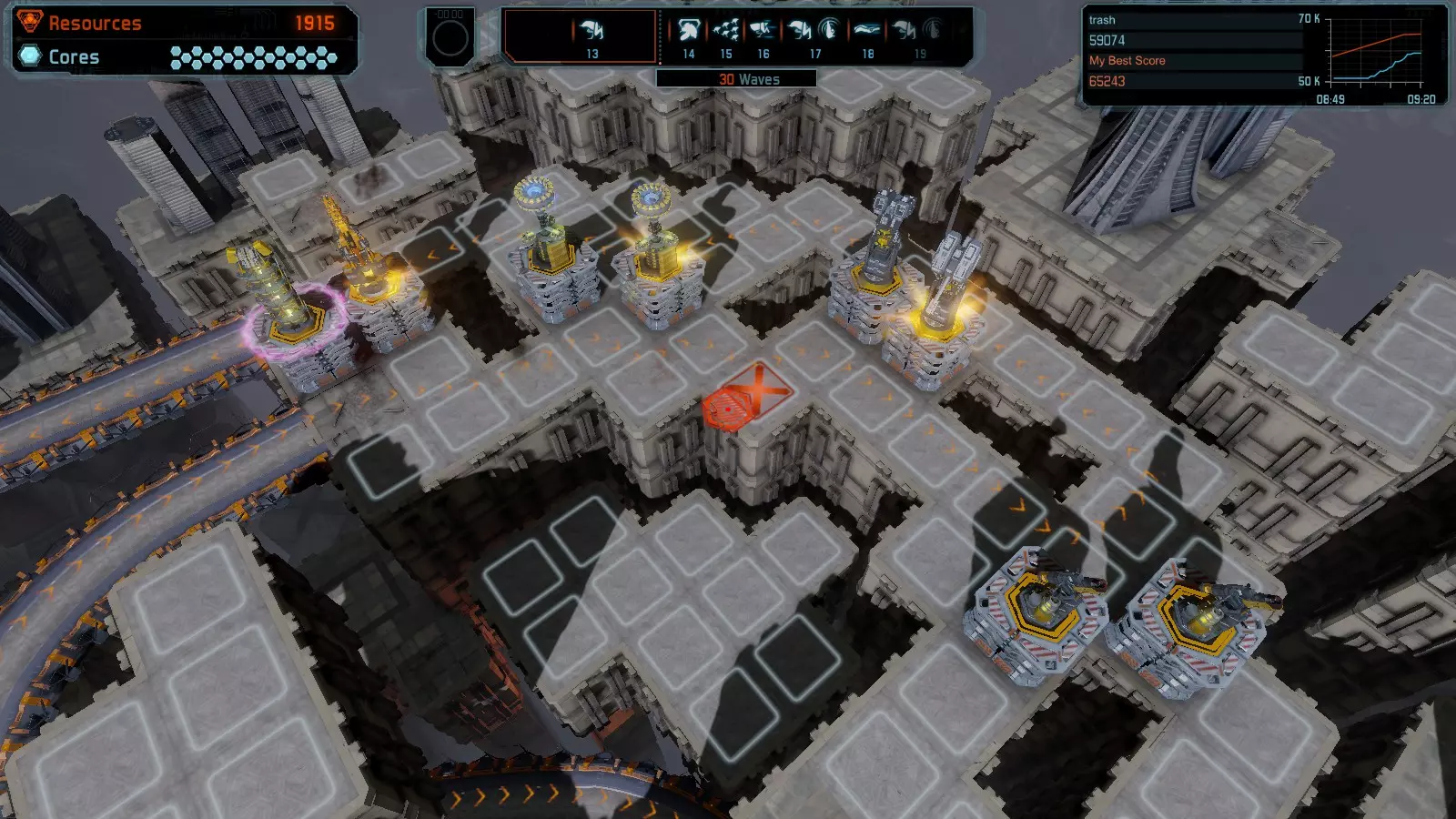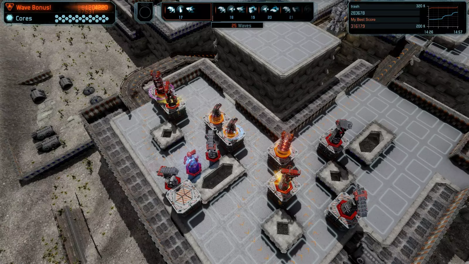 第19关 失控 本指南将介绍如何在简单难度下的开放模式和竞争模式中在此地图获得金牌。 此布局可在以下所有模式中获得金牌: 固定资源 焦点模式 有限塔防 全装模式 冰封核心 练习模式 建造方案: 1座红色时间塔 1座强化塔搭配1座红色激光塔 3座强化塔作为障碍物 4座强化塔搭配4座红色震荡塔,其中1座配备干扰器,1座配备得分加成 17座红色加农炮