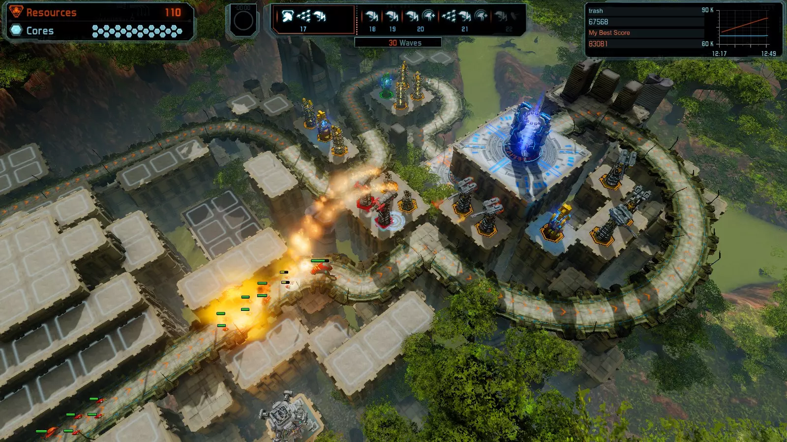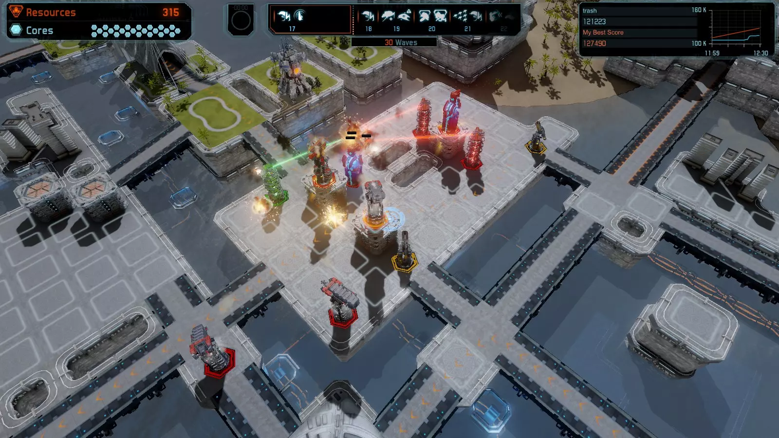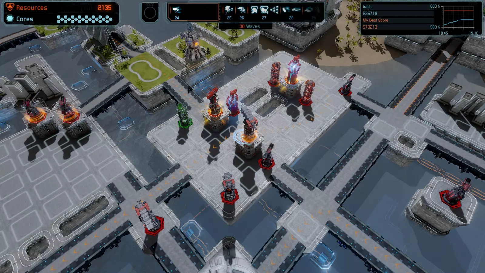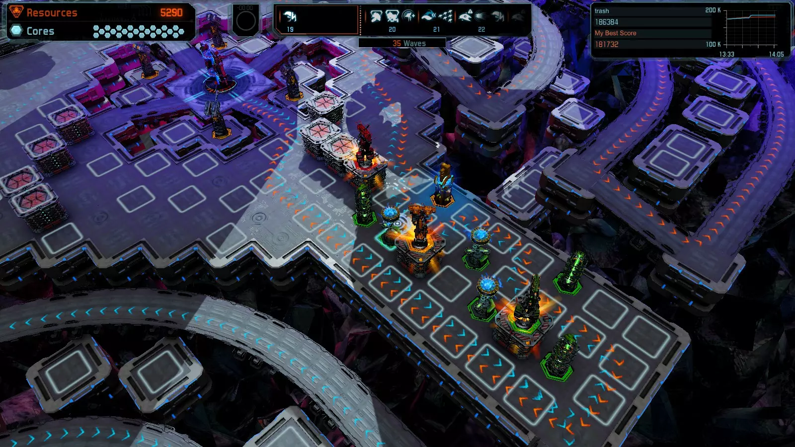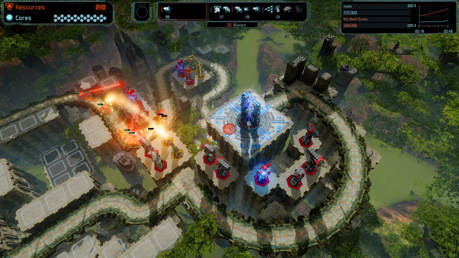 第19关 失控 本指南将介绍如何在简单难度下的开放模式和竞争模式中在此地图获得金牌。 此布局可在以下所有模式中获得金牌: 固定资源 焦点模式 有限塔防 全装模式 冰封核心 练习模式 建造方案: 1座红色时间塔 1座强化塔搭配1座红色激光塔 3座强化塔作为障碍物 4座强化塔搭配4座红色震荡塔,其中1座配备干扰器,1座配备得分加成 17座红色加农炮