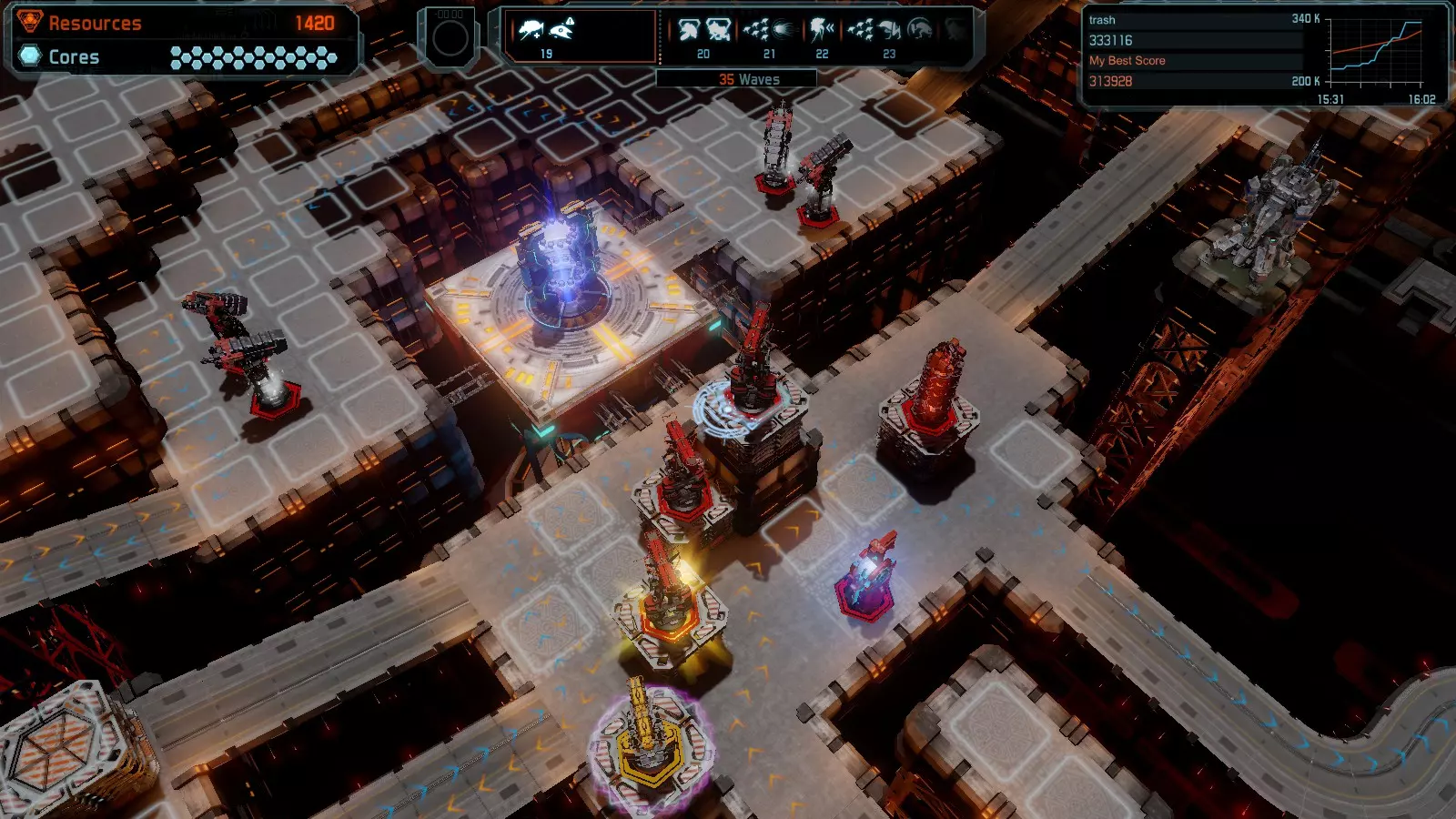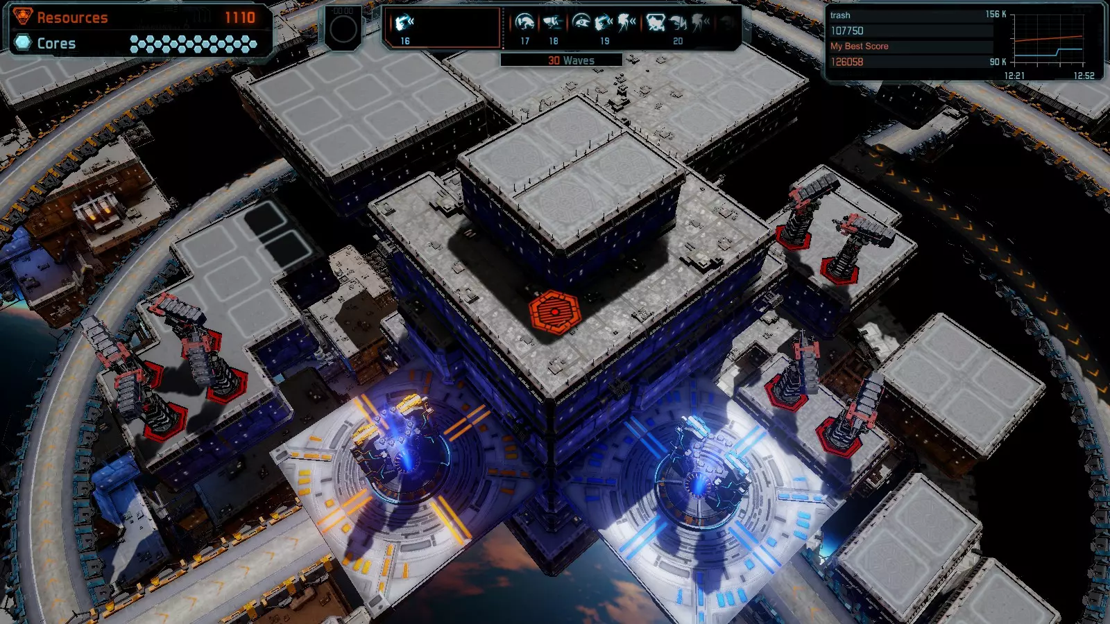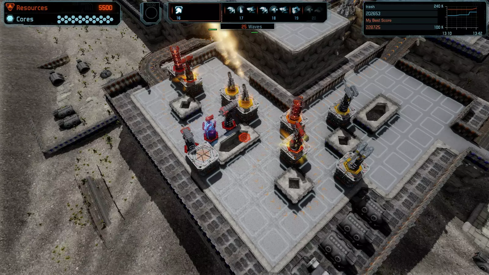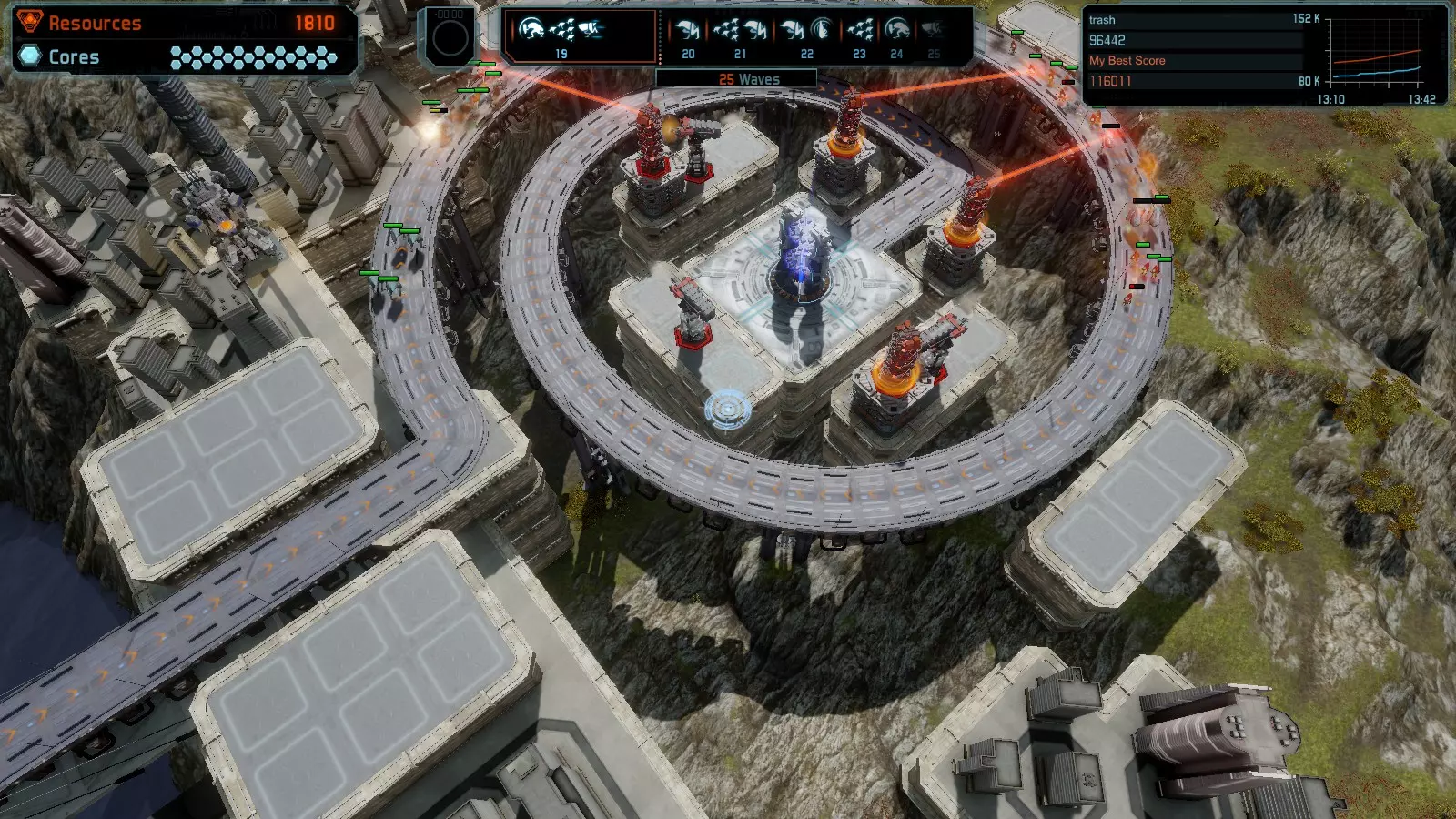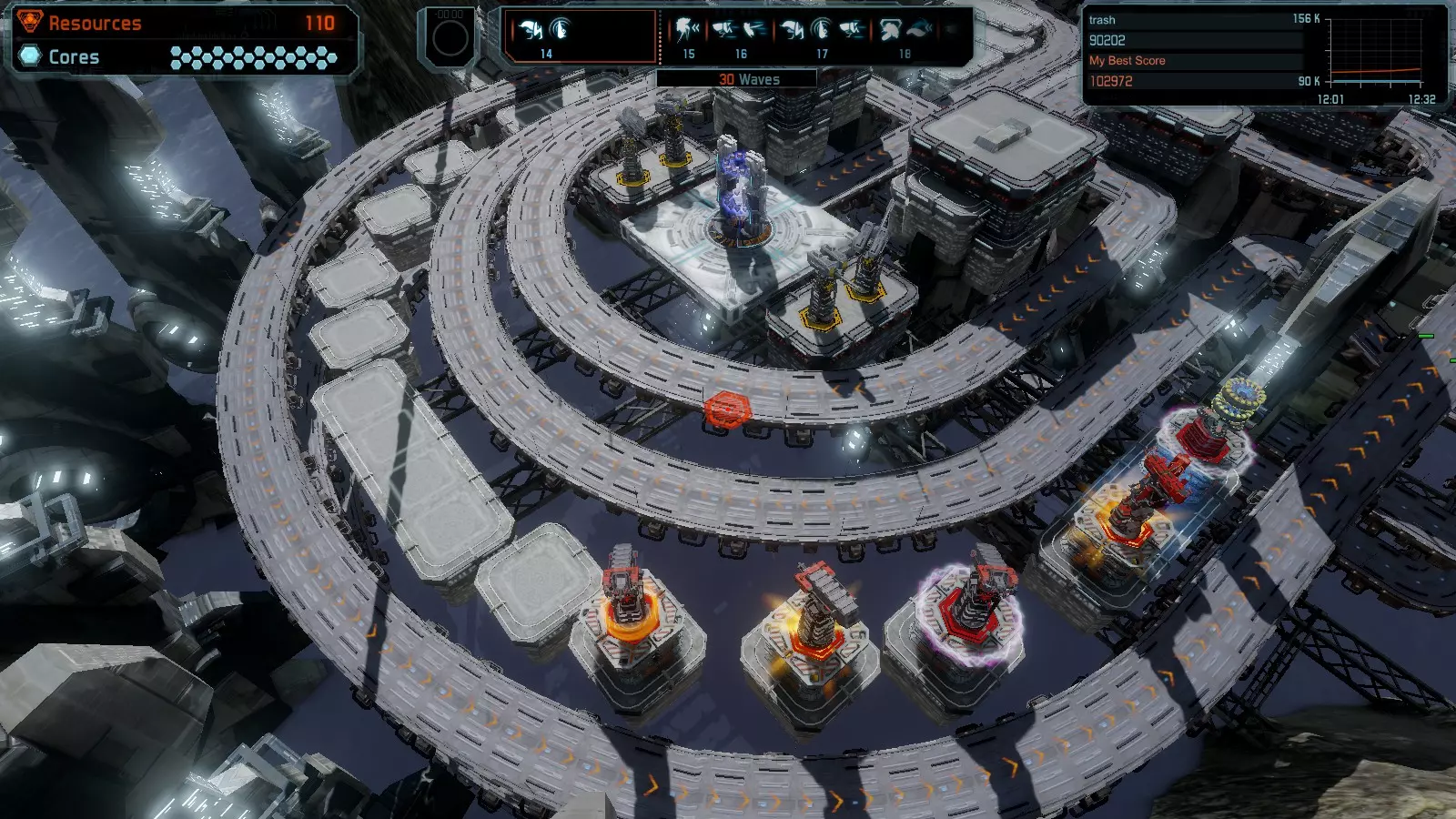 第19关 失控 本指南将介绍如何在简单难度下的开放模式和竞争模式中在此地图获得金牌。 此布局可在以下所有模式中获得金牌: 固定资源 焦点模式 有限塔防 全装模式 冰封核心 练习模式 建造方案: 1座红色时间塔 1座强化塔搭配1座红色激光塔 3座强化塔作为障碍物 4座强化塔搭配4座红色震荡塔,其中1座配备干扰器,1座配备得分加成 17座红色加农炮