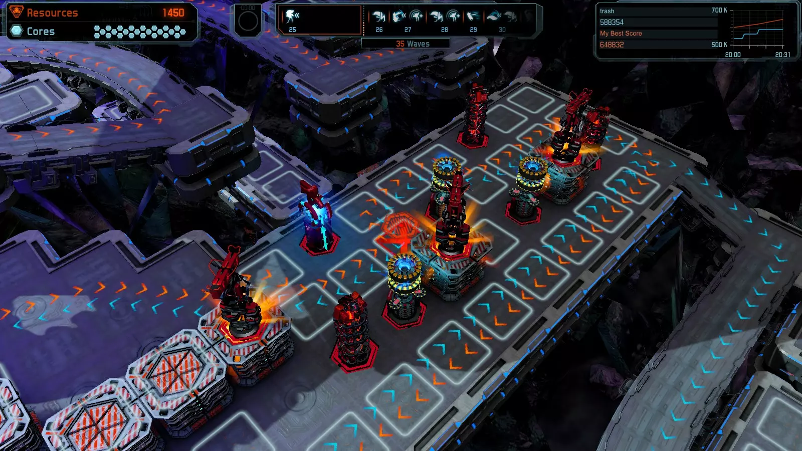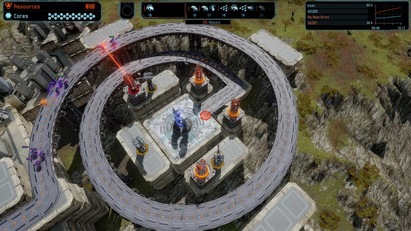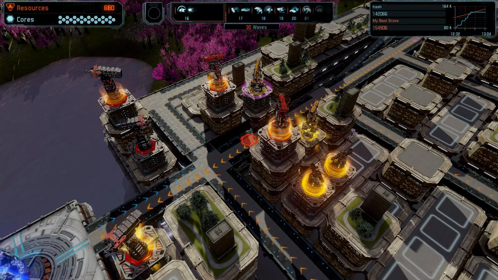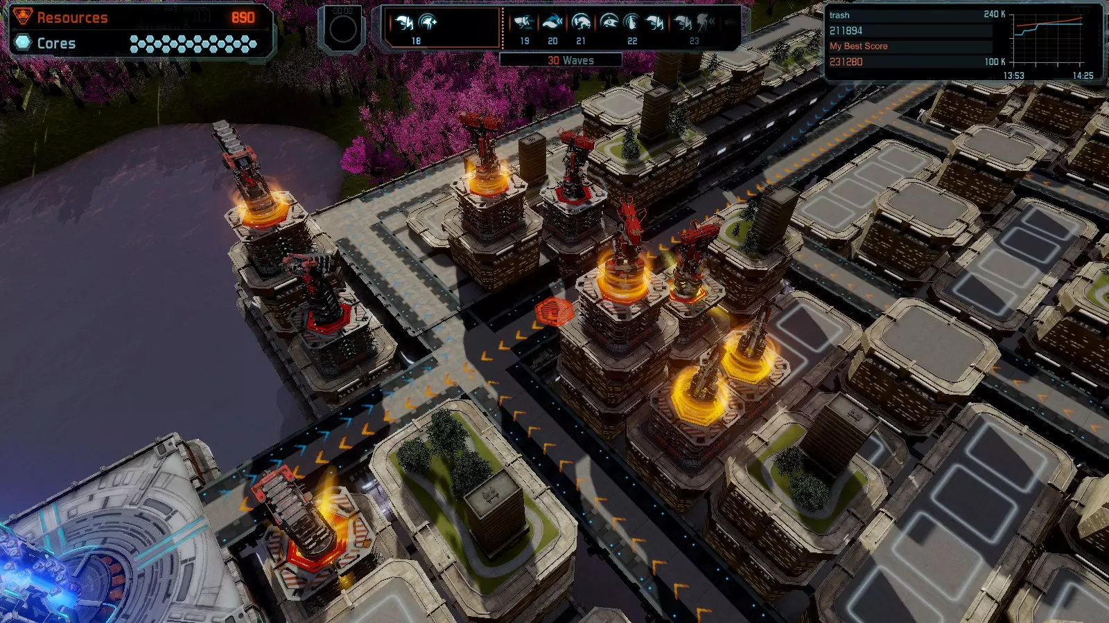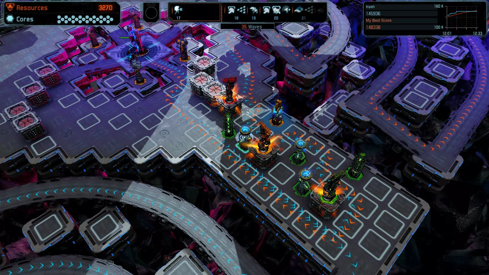 第19关 失控 本指南将介绍如何在简单难度下的开放模式和竞争模式中在此地图获得金牌。 此布局可在以下所有模式中获得金牌: 固定资源 焦点模式 有限塔防 全装模式 冰封核心 练习模式 建造方案: 1座红色时间塔 1座强化塔搭配1座红色激光塔 3座强化塔作为障碍物 4座强化塔搭配4座红色震荡塔,其中1座配备干扰器,1座配备得分加成 17座红色加农炮