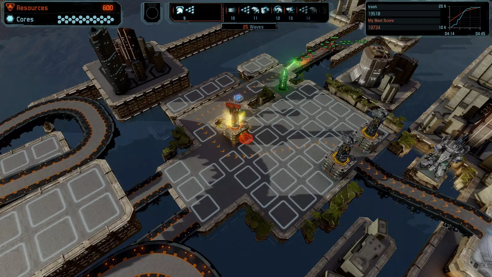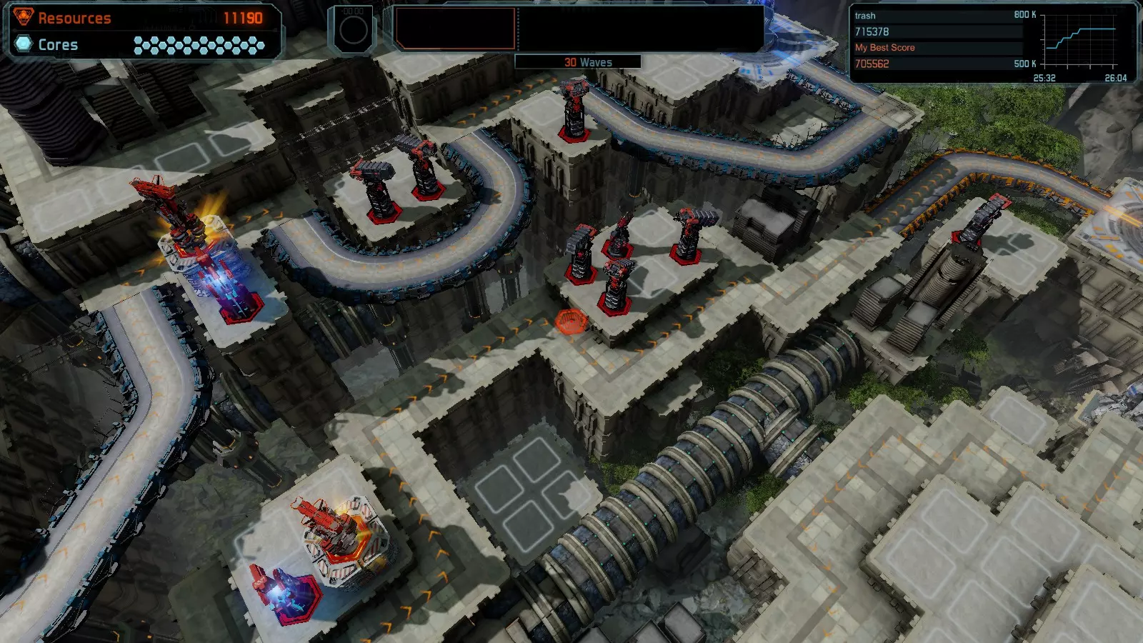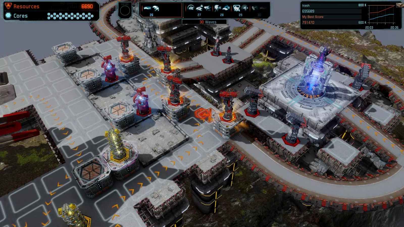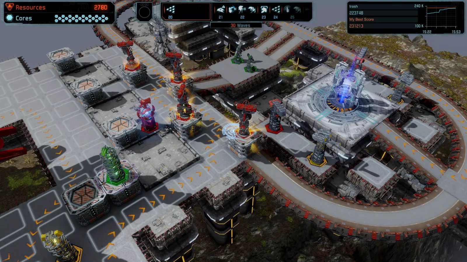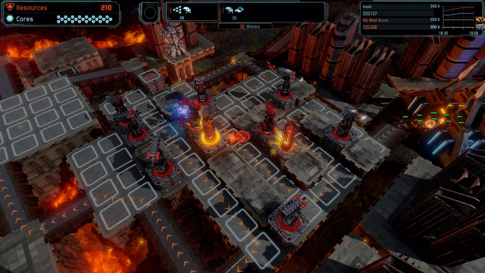 第19关 失控 本指南将介绍如何在简单难度下的开放模式和竞争模式中在此地图获得金牌。 此布局可在以下所有模式中获得金牌: 固定资源 焦点模式 有限塔防 全装模式 冰封核心 练习模式 建造方案: 1座红色时间塔 1座强化塔搭配1座红色激光塔 3座强化塔作为障碍物 4座强化塔搭配4座红色震荡塔,其中1座配备干扰器,1座配备得分加成 17座红色加农炮