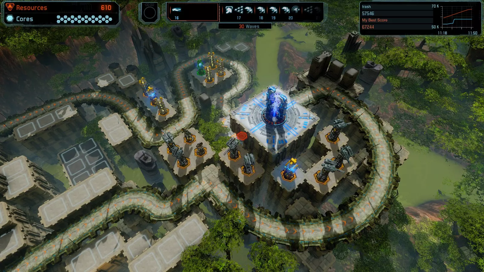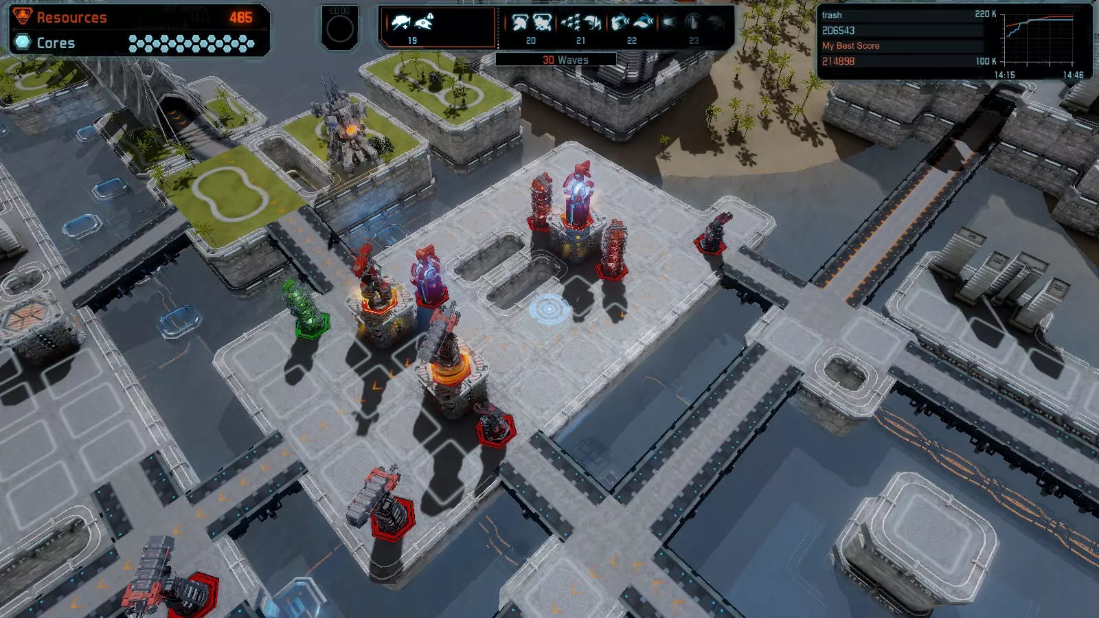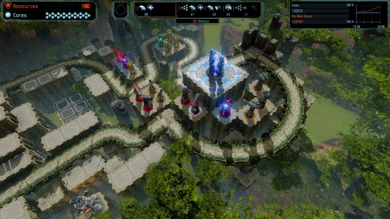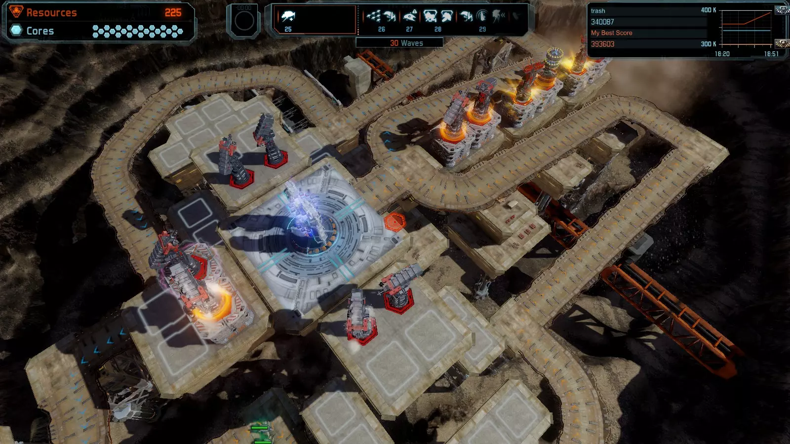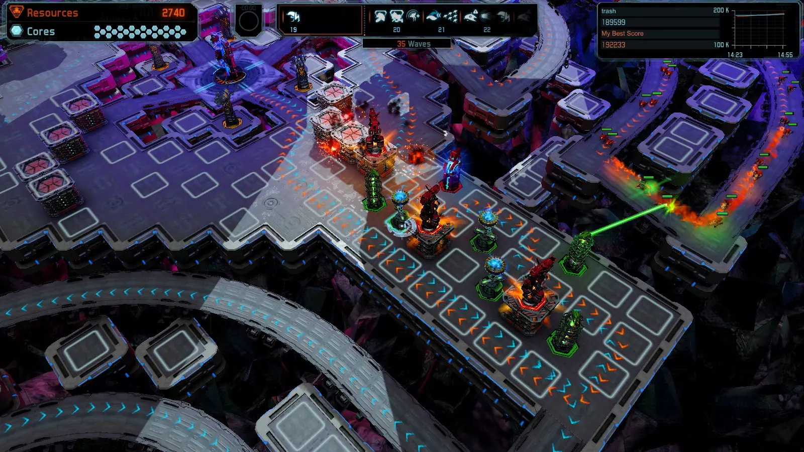 第19关 失控 本指南将介绍如何在简单难度下的开放模式和竞争模式中在此地图获得金牌。 此布局可在以下所有模式中获得金牌: 固定资源 焦点模式 有限塔防 全装模式 冰封核心 练习模式 建造方案: 1座红色时间塔 1座强化塔搭配1座红色激光塔 3座强化塔作为障碍物 4座强化塔搭配4座红色震荡塔,其中1座配备干扰器,1座配备得分加成 17座红色加农炮