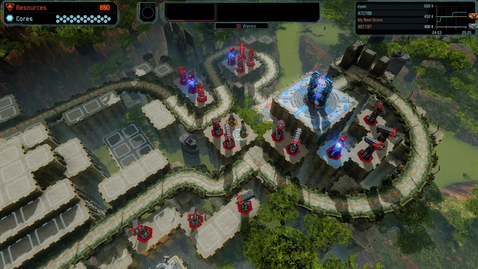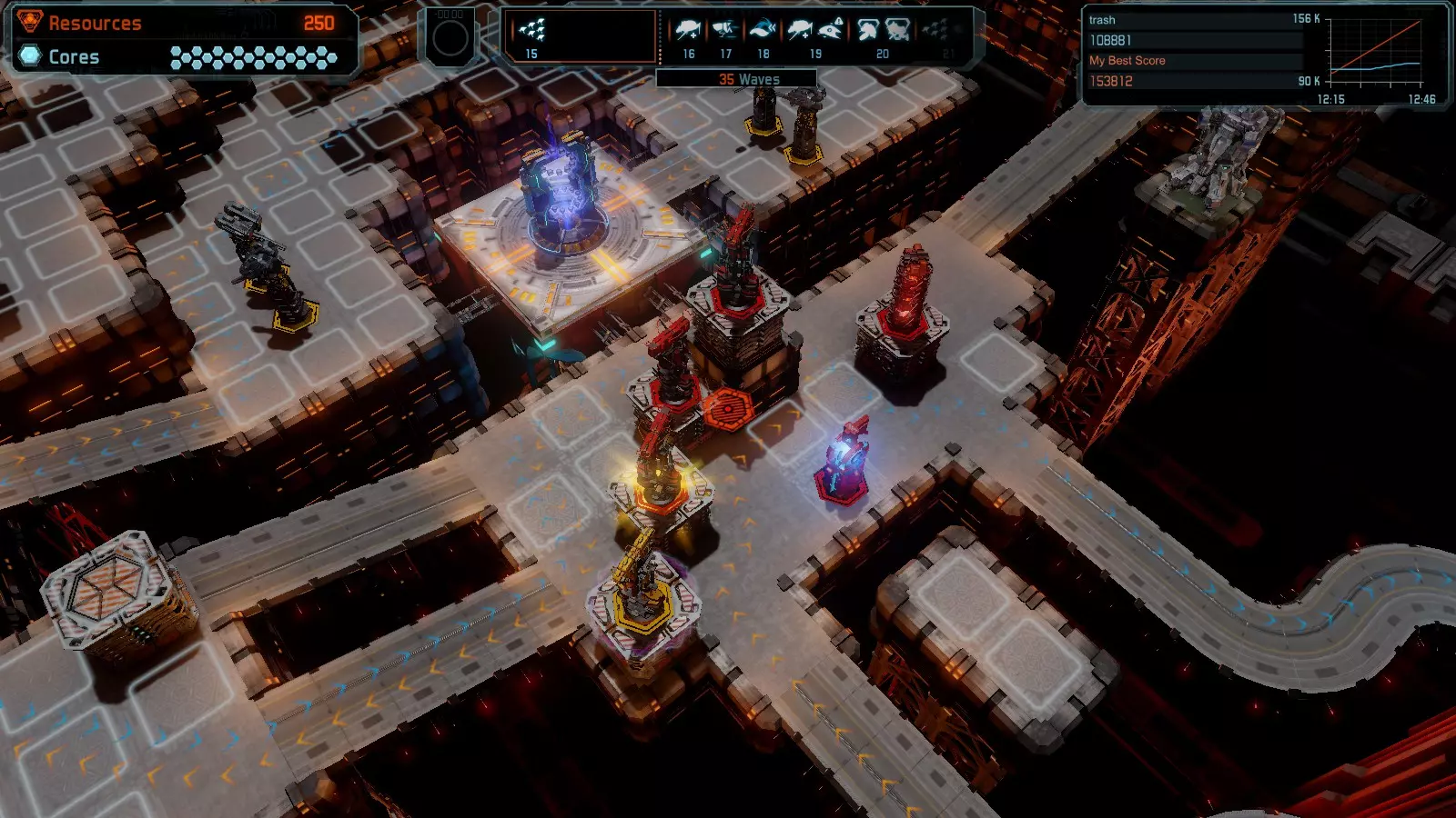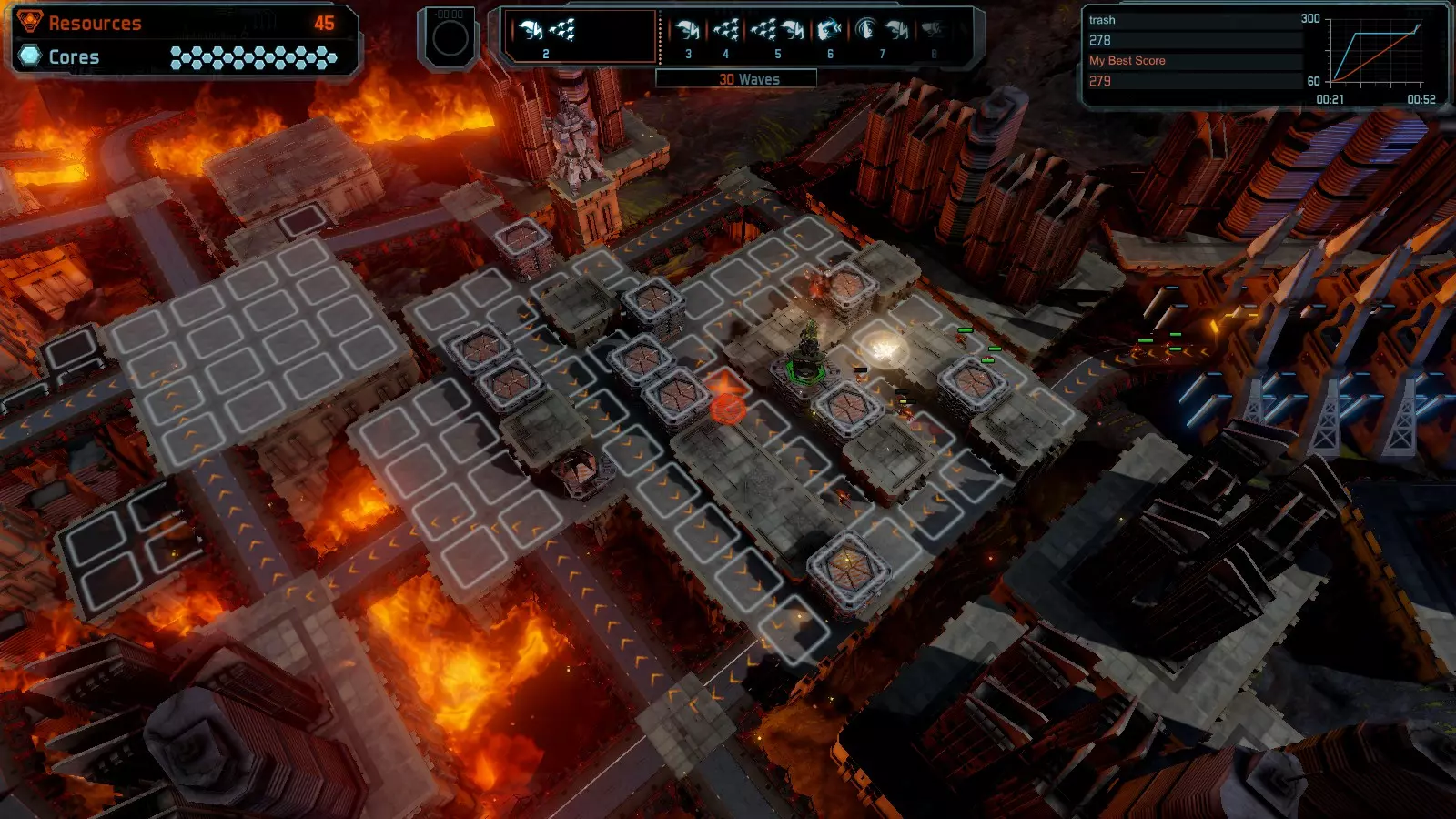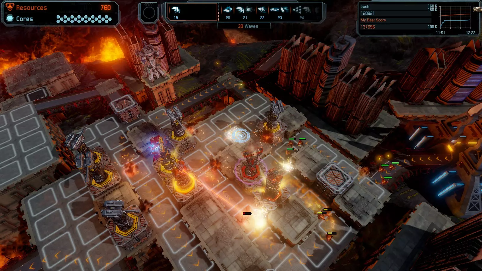 第19关 失控 本指南将介绍如何在简单难度下的开放模式和竞争模式中在此地图获得金牌。 此布局可在以下所有模式中获得金牌: 固定资源 焦点模式 有限塔防 全装模式 冰封核心 练习模式 建造方案: 1座红色时间塔 1座强化塔搭配1座红色激光塔 3座强化塔作为障碍物 4座强化塔搭配4座红色震荡塔,其中1座配备干扰器,1座配备得分加成 17座红色加农炮