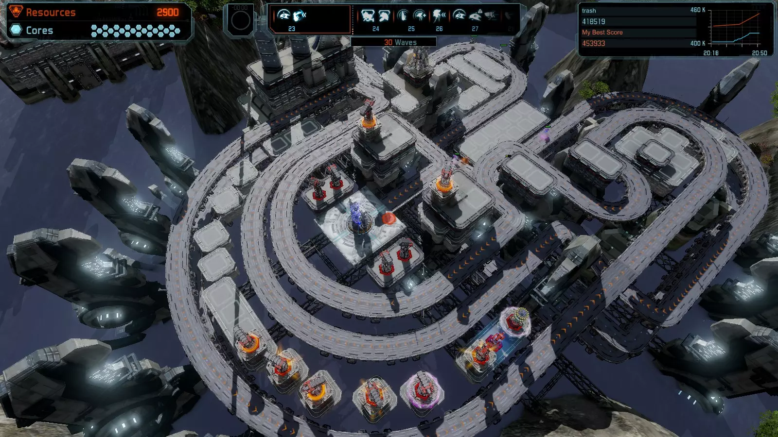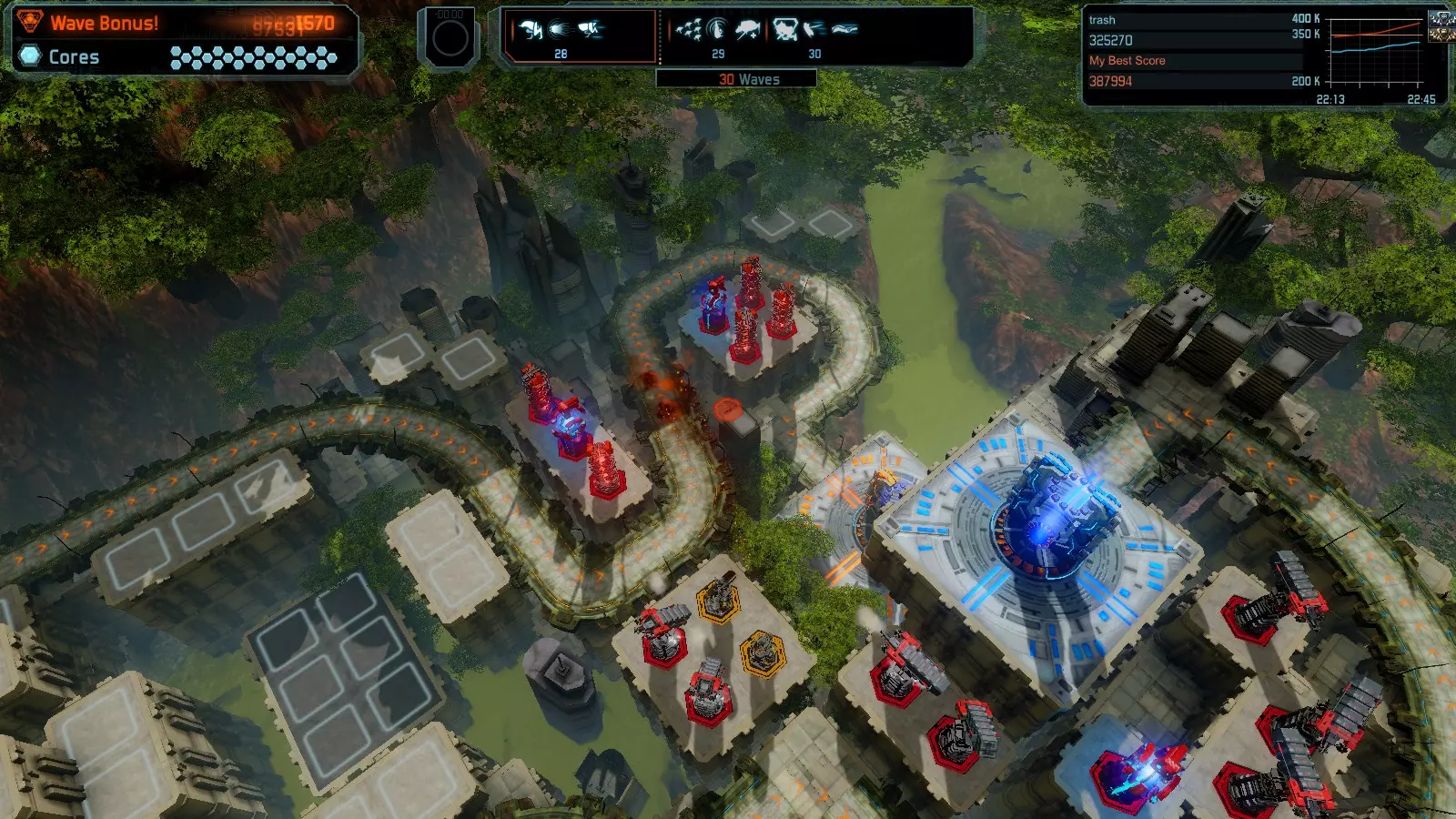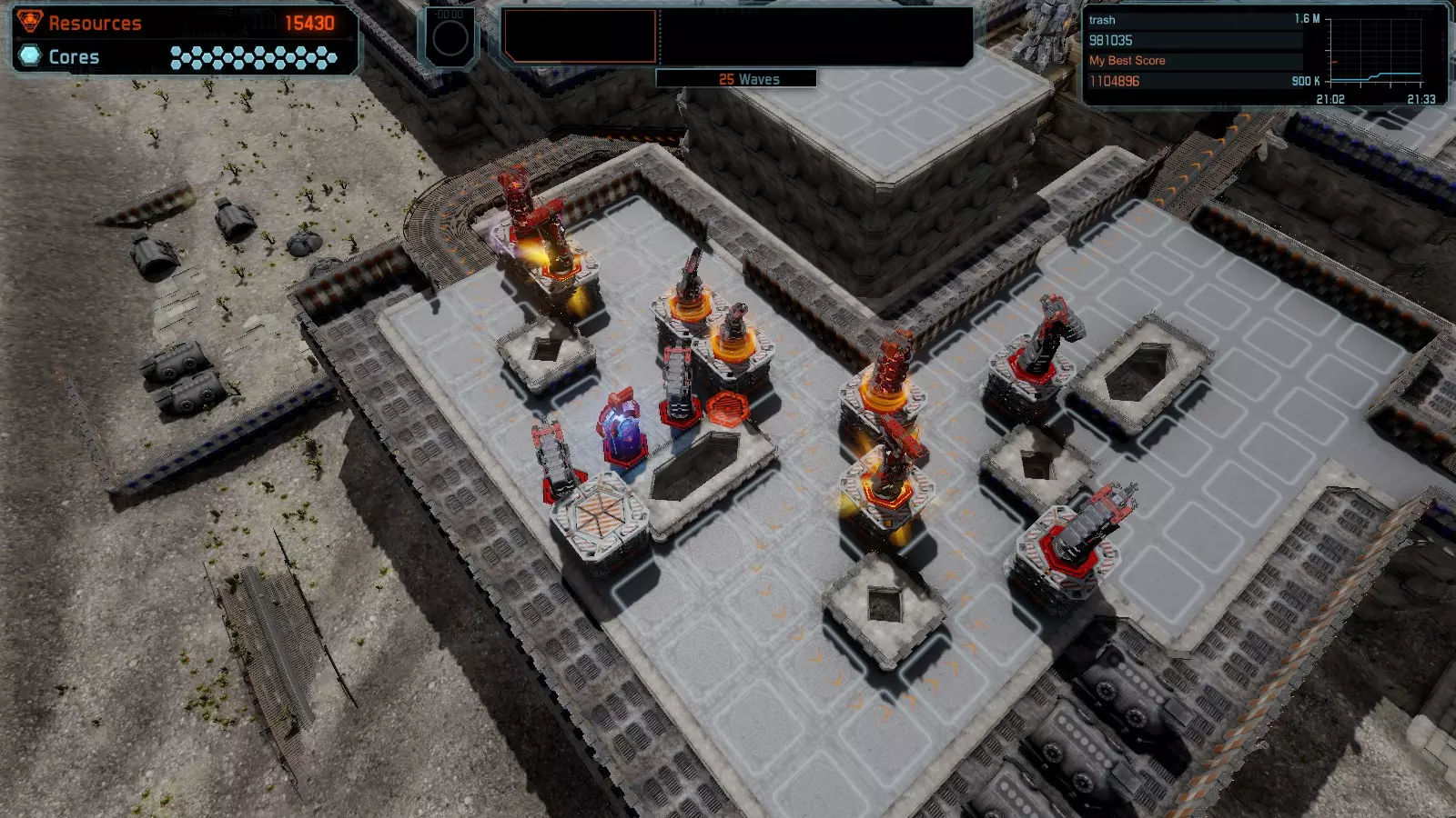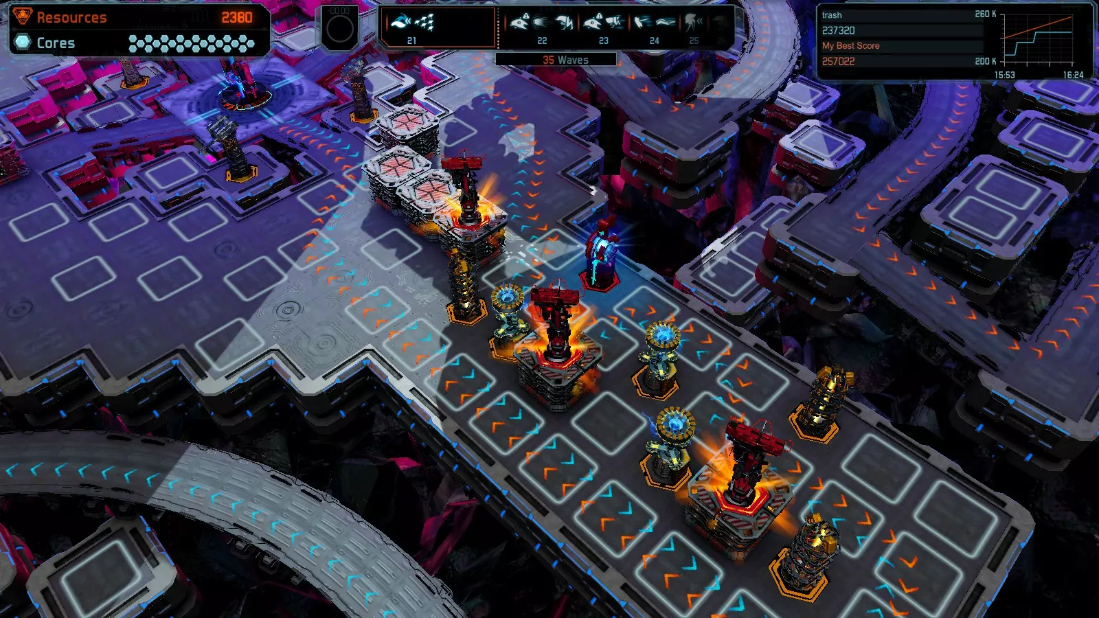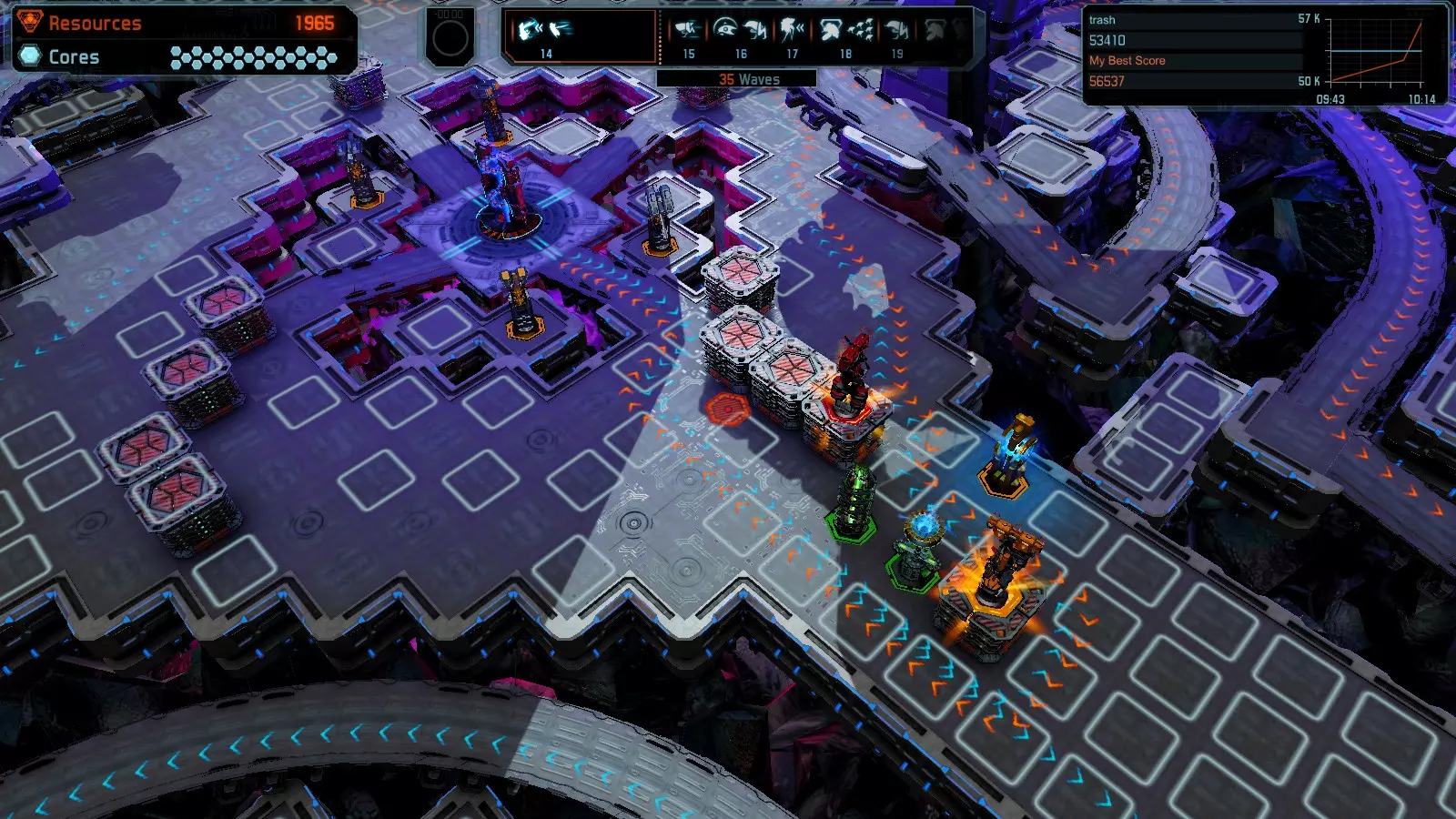 第19关 失控 本指南将介绍如何在简单难度下的开放模式和竞争模式中在此地图获得金牌。 此布局可在以下所有模式中获得金牌: 固定资源 焦点模式 有限塔防 全装模式 冰封核心 练习模式 建造方案: 1座红色时间塔 1座强化塔搭配1座红色激光塔 3座强化塔作为障碍物 4座强化塔搭配4座红色震荡塔,其中1座配备干扰器,1座配备得分加成 17座红色加农炮