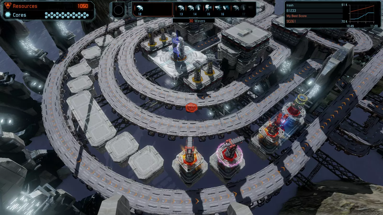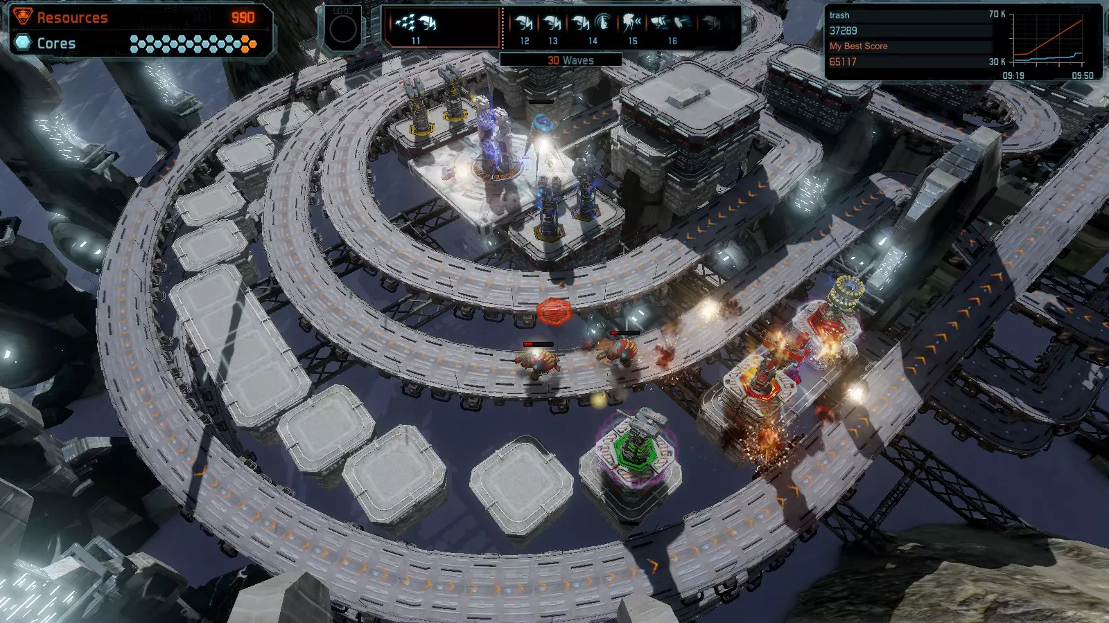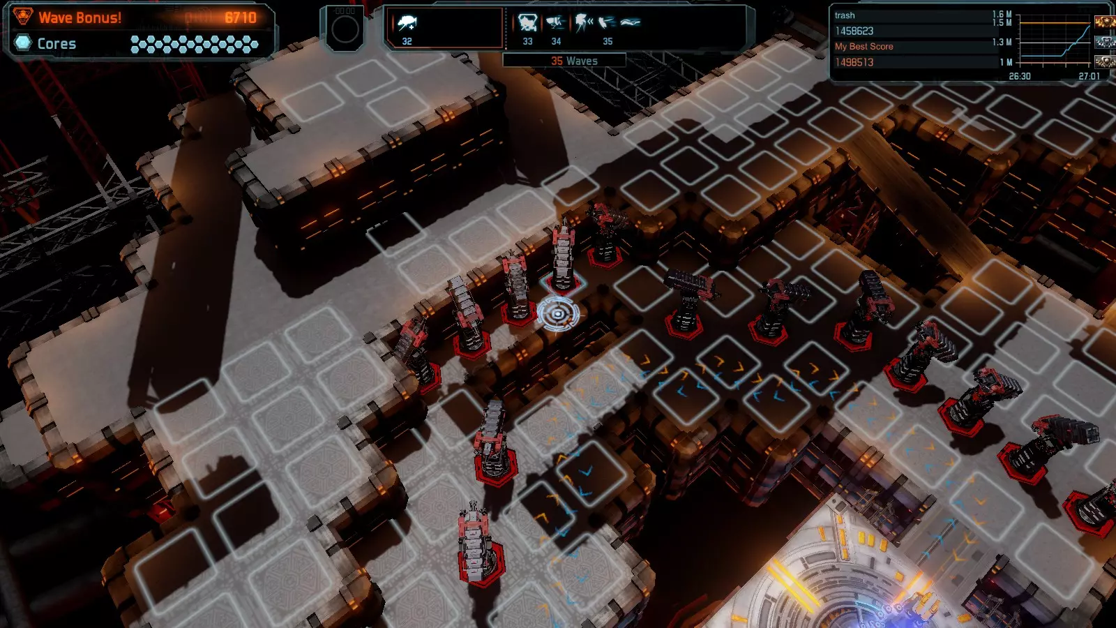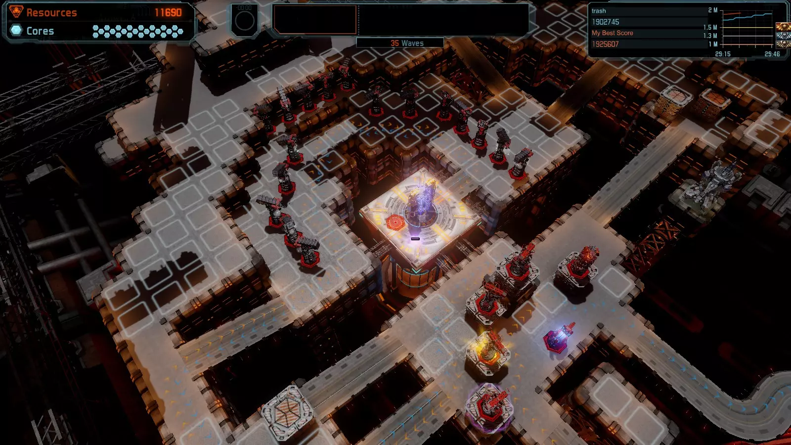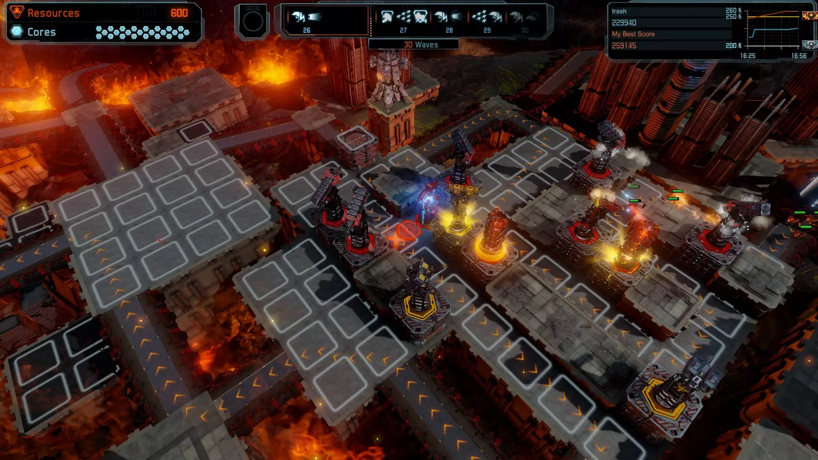 第19关 失控 本指南将介绍如何在简单难度下的开放模式和竞争模式中在此地图获得金牌。 此布局可在以下所有模式中获得金牌: 固定资源 焦点模式 有限塔防 全装模式 冰封核心 练习模式 建造方案: 1座红色时间塔 1座强化塔搭配1座红色激光塔 3座强化塔作为障碍物 4座强化塔搭配4座红色震荡塔,其中1座配备干扰器,1座配备得分加成 17座红色加农炮