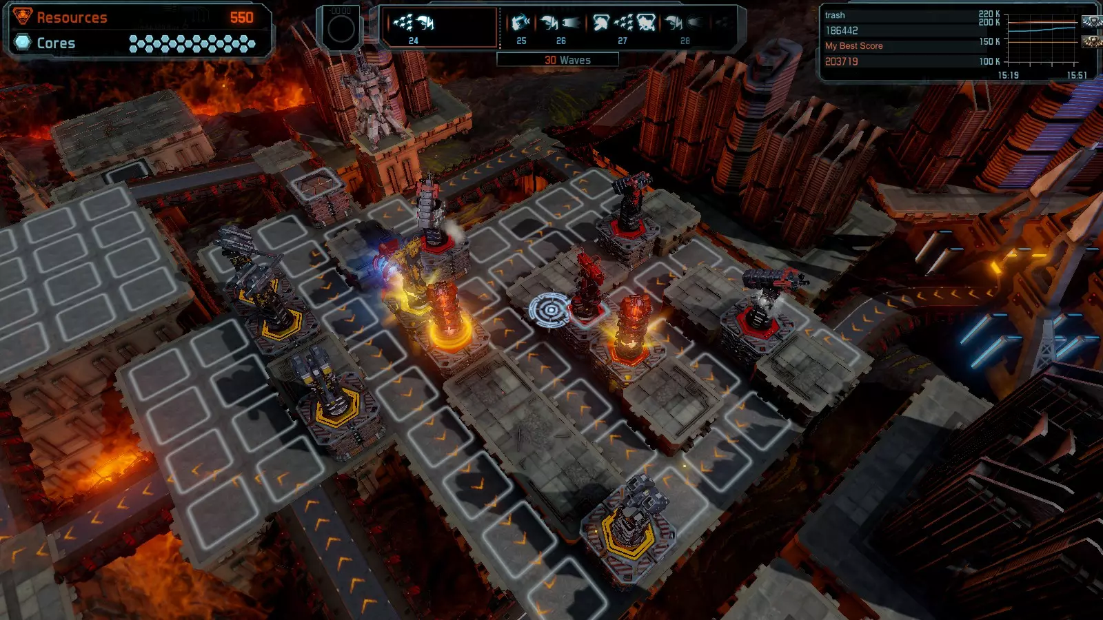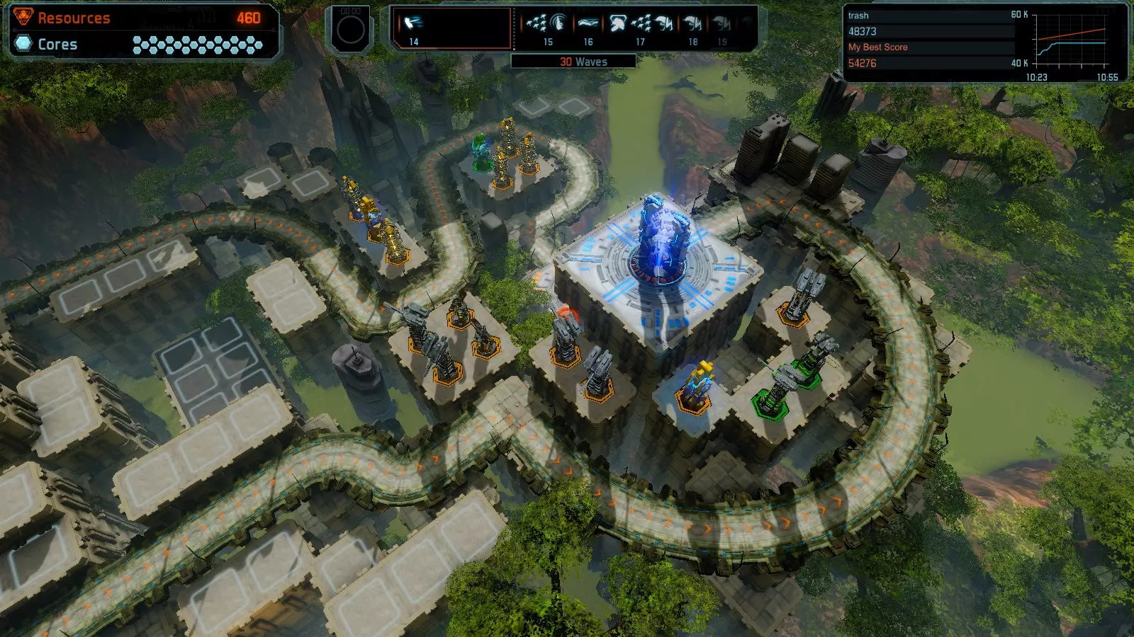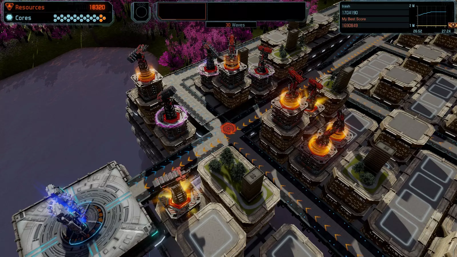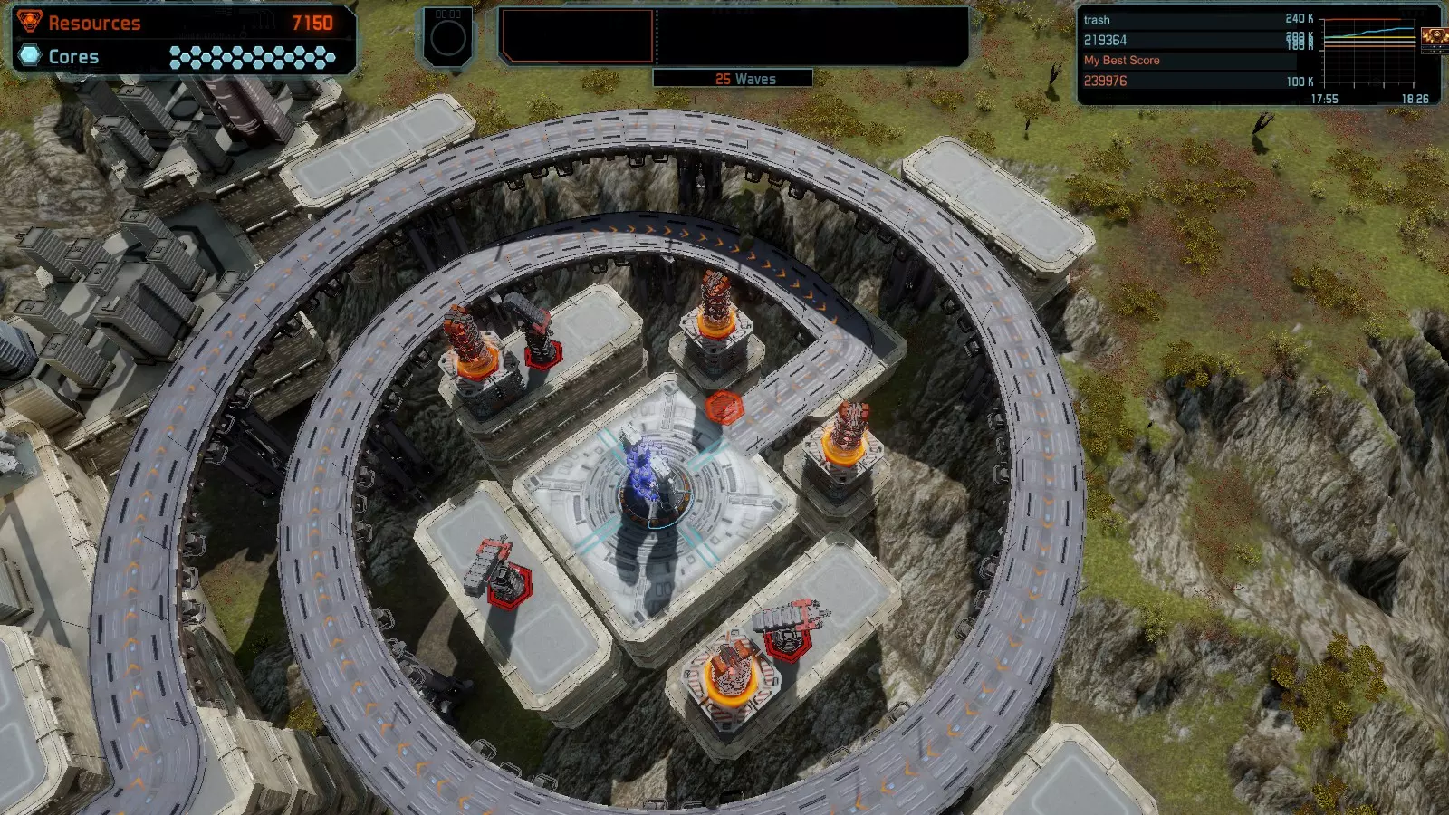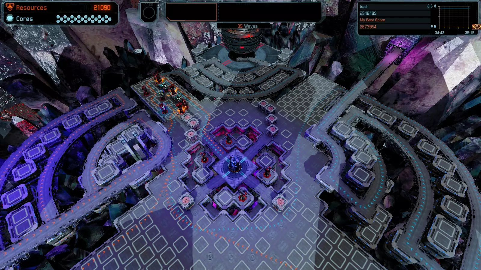 第19关 失控 本指南将介绍如何在简单难度下的开放模式和竞争模式中在此地图获得金牌。 此布局可在以下所有模式中获得金牌: 固定资源 焦点模式 有限塔防 全装模式 冰封核心 练习模式 建造方案: 1座红色时间塔 1座强化塔搭配1座红色激光塔 3座强化塔作为障碍物 4座强化塔搭配4座红色震荡塔,其中1座配备干扰器,1座配备得分加成 17座红色加农炮