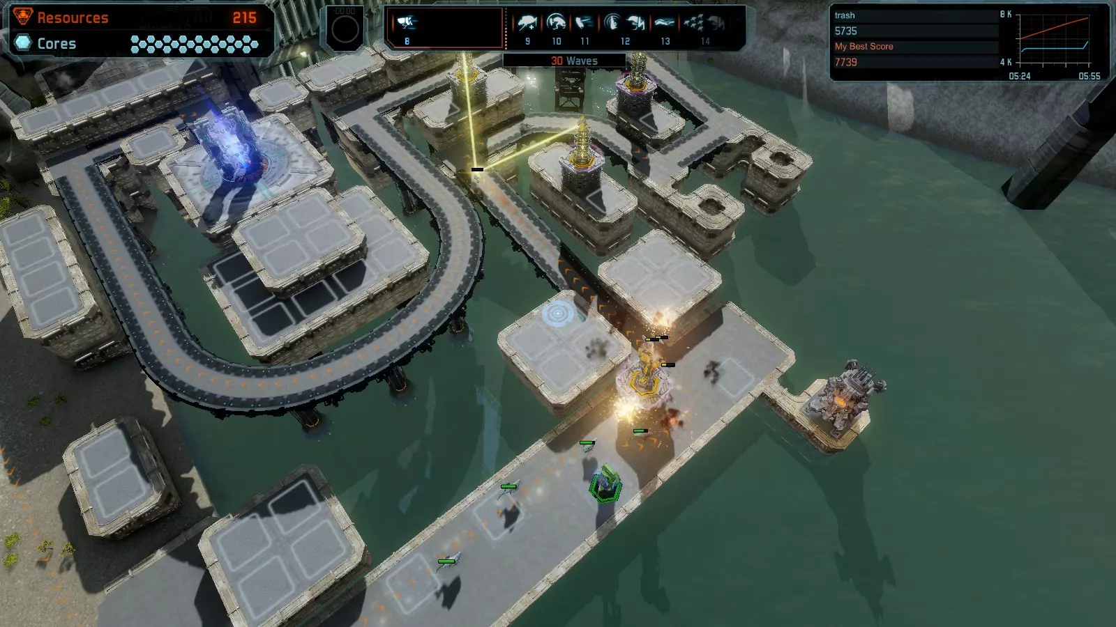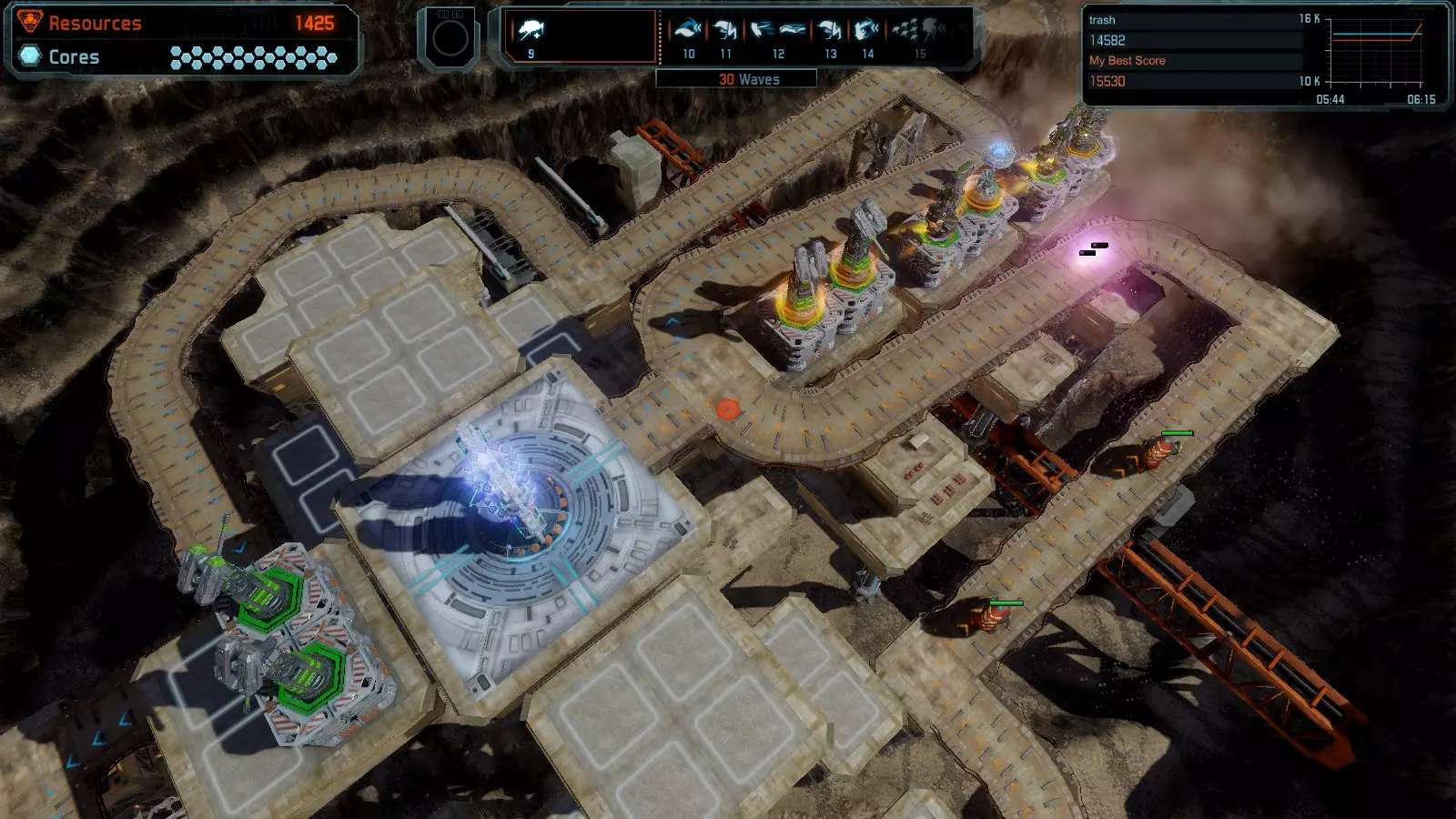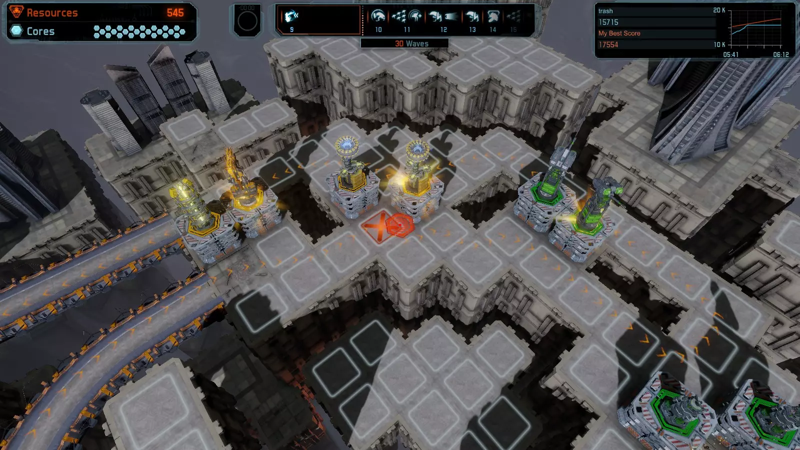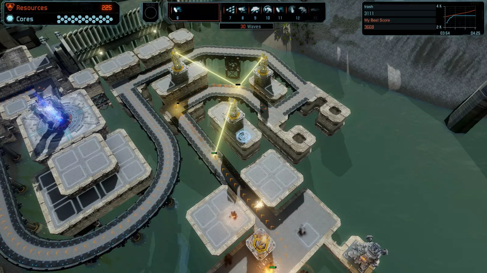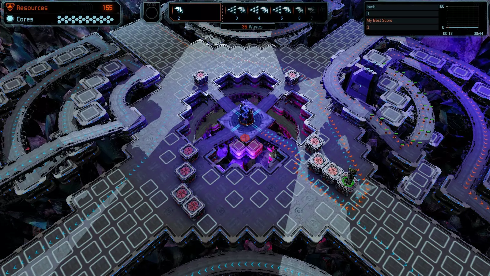 地图06:快速崩塌 本指南介绍如何在简单难度的开放模式和竞争模式下在此地图获得金牌。 此布局适用于以下所有模式并可获得金牌: 固定资源 电力中断 焦点 有限塔防 满载 子弹耗尽 核心冻结 练习 建造方案: 1座绿色时间塔 2座红色激光塔 1座带黄色震荡干扰器的增强塔 3座带红色激光干扰器的增强塔
