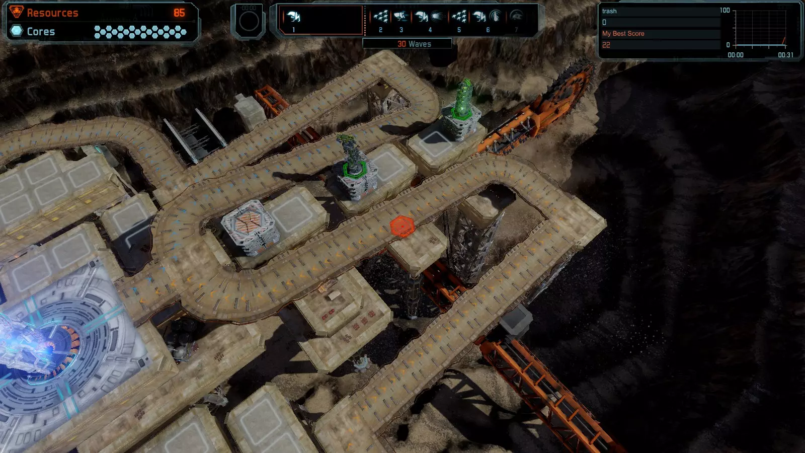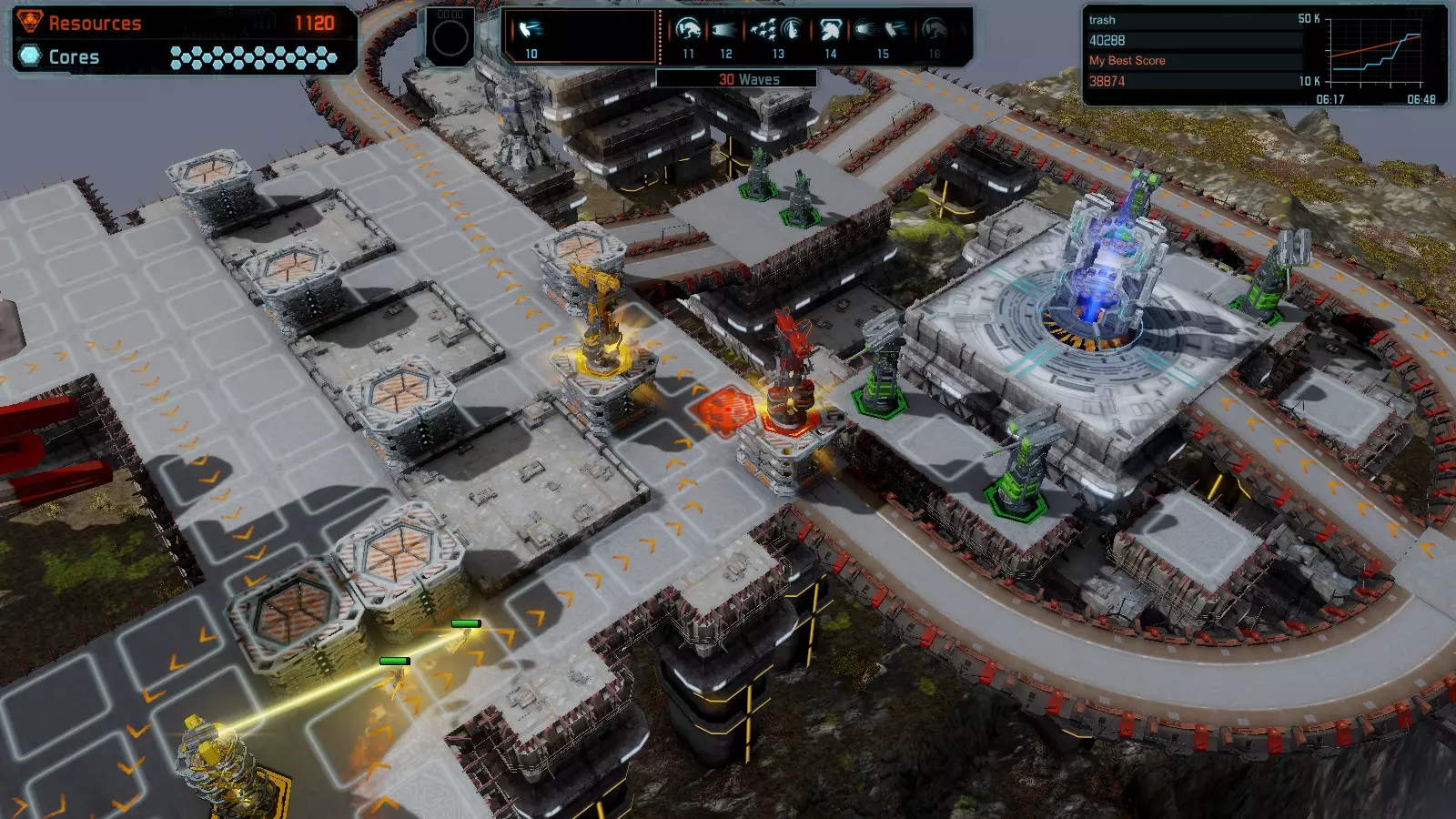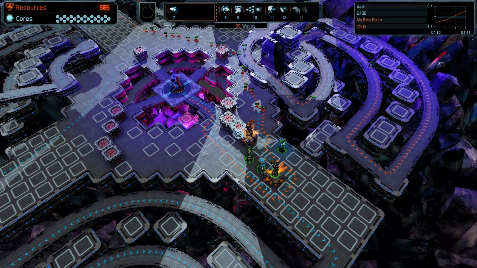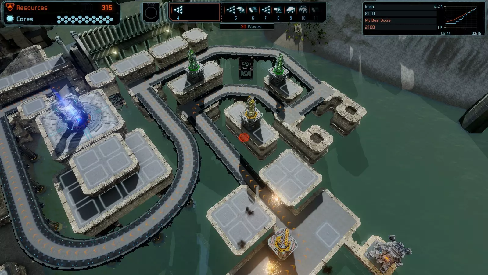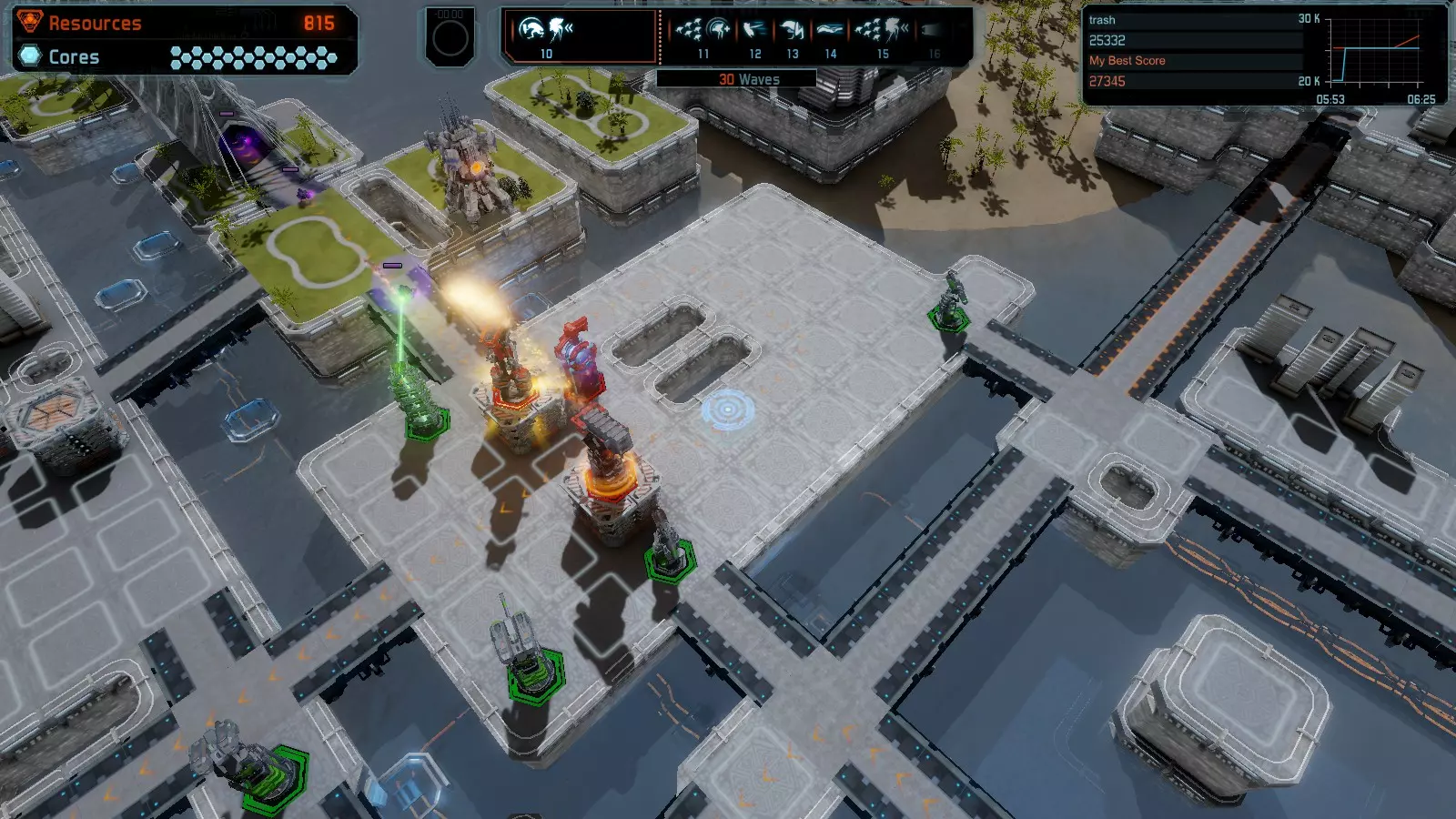 地图06:快速崩塌 本指南介绍如何在简单难度的开放模式和竞争模式下在此地图获得金牌。 此布局适用于以下所有模式并可获得金牌: 固定资源 电力中断 焦点 有限塔防 满载 子弹耗尽 核心冻结 练习 建造方案: 1座绿色时间塔 2座红色激光塔 1座带黄色震荡干扰器的增强塔 3座带红色激光干扰器的增强塔