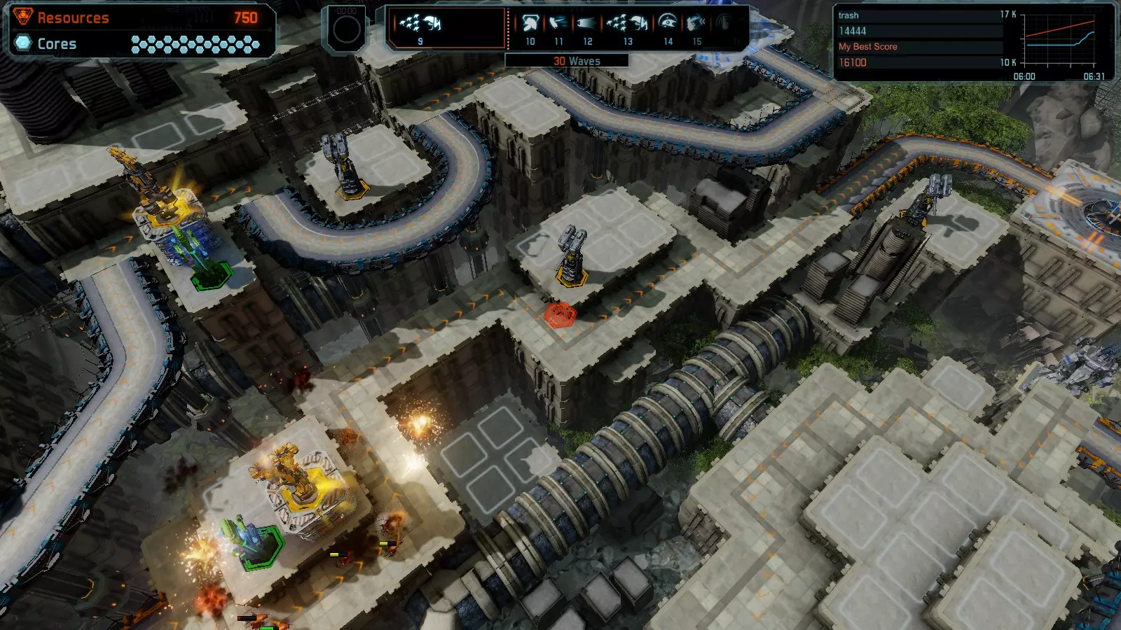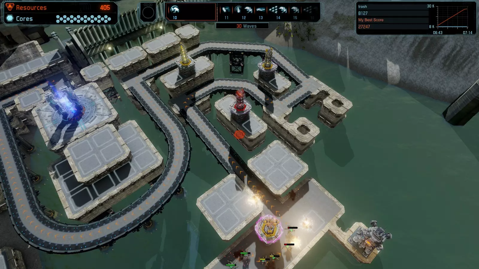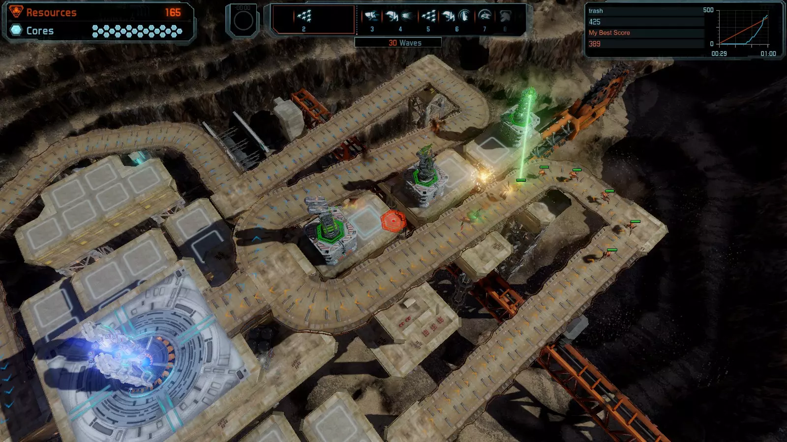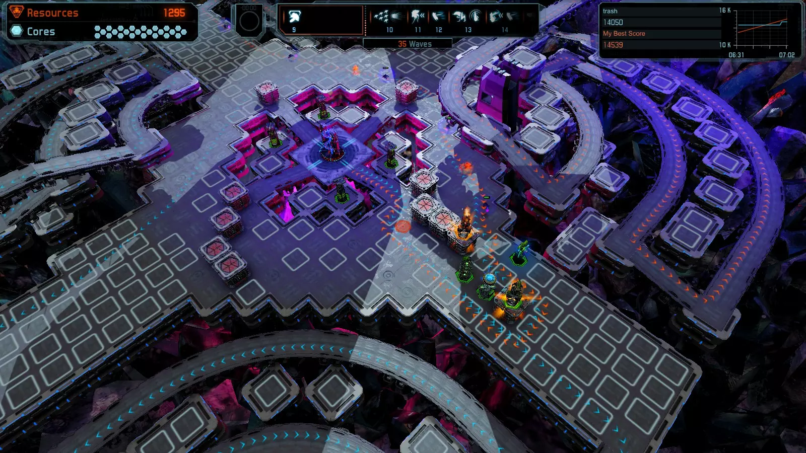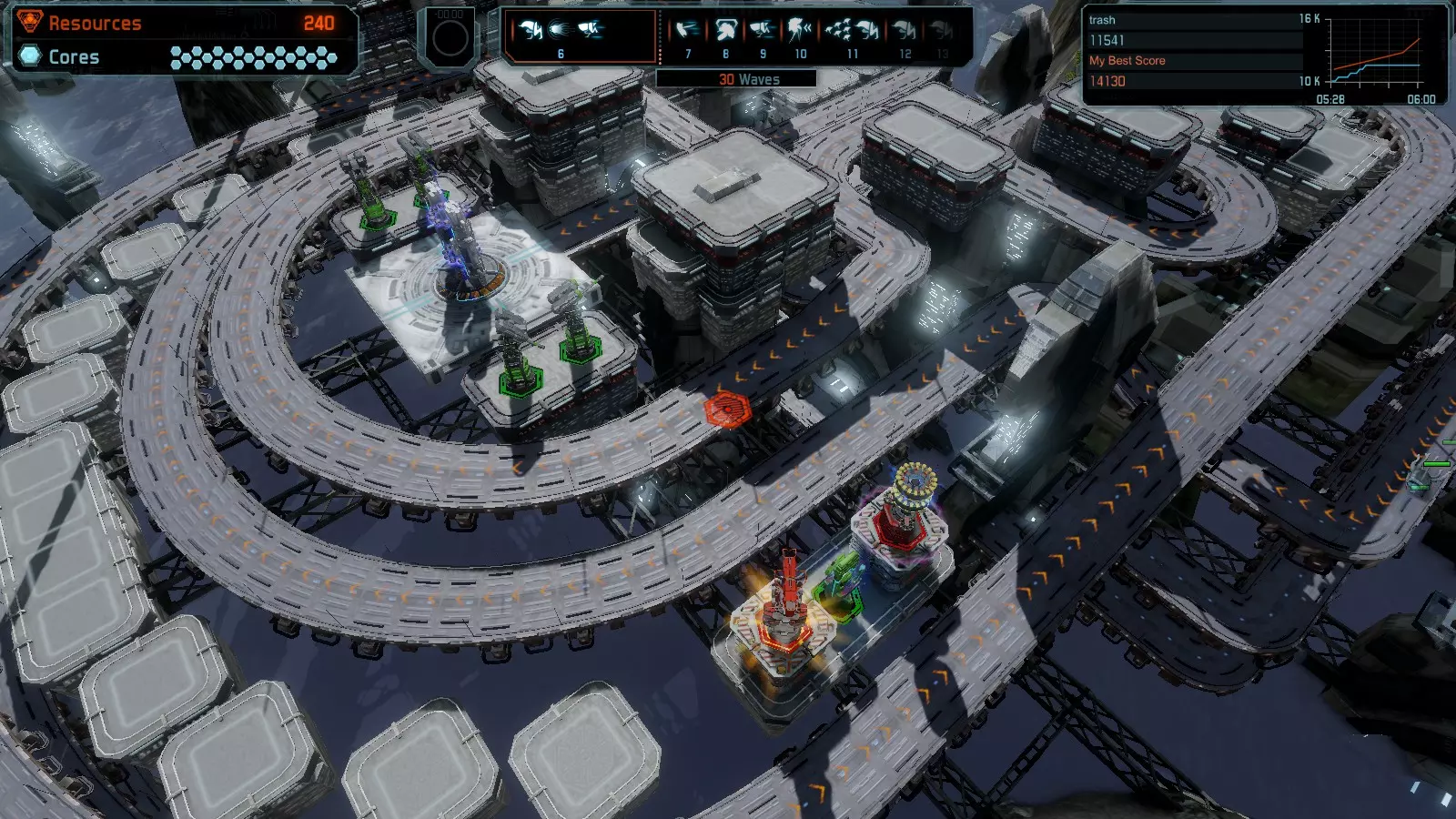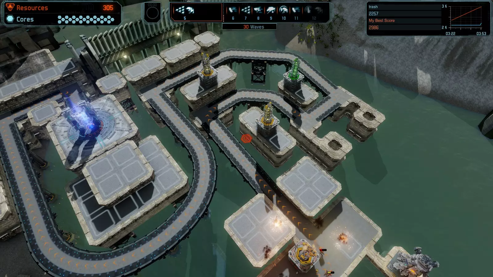 地图06:快速崩塌 本指南介绍如何在简单难度的开放模式和竞争模式下在此地图获得金牌。 此布局适用于以下所有模式并可获得金牌: 固定资源 电力中断 焦点 有限塔防 满载 子弹耗尽 核心冻结 练习 建造方案: 1座绿色时间塔 2座红色激光塔 1座带黄色震荡干扰器的增强塔 3座带红色激光干扰器的增强塔