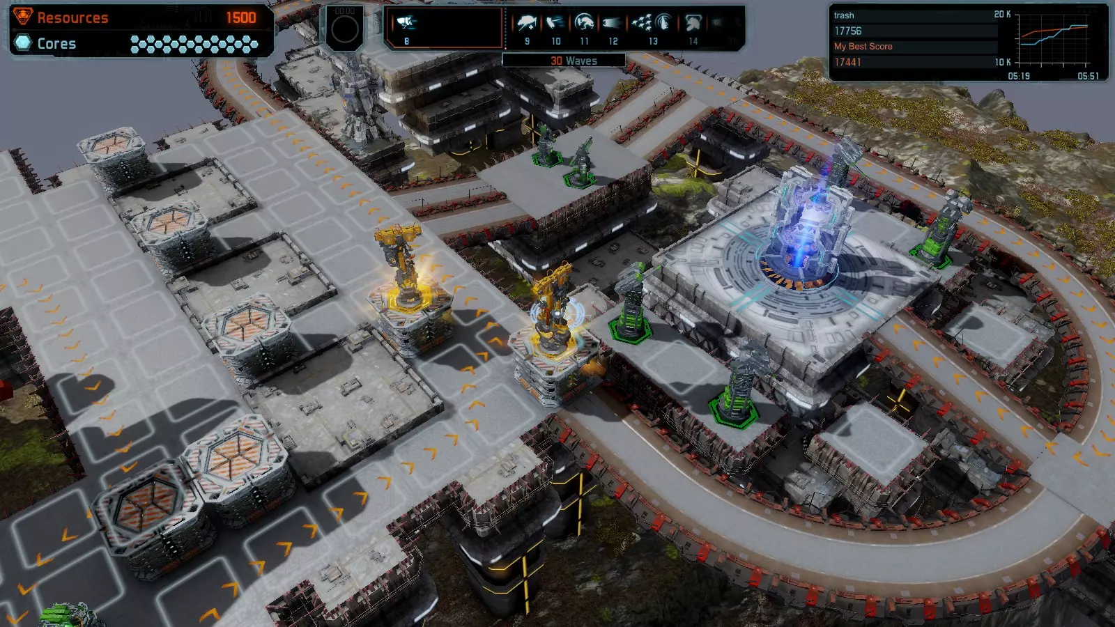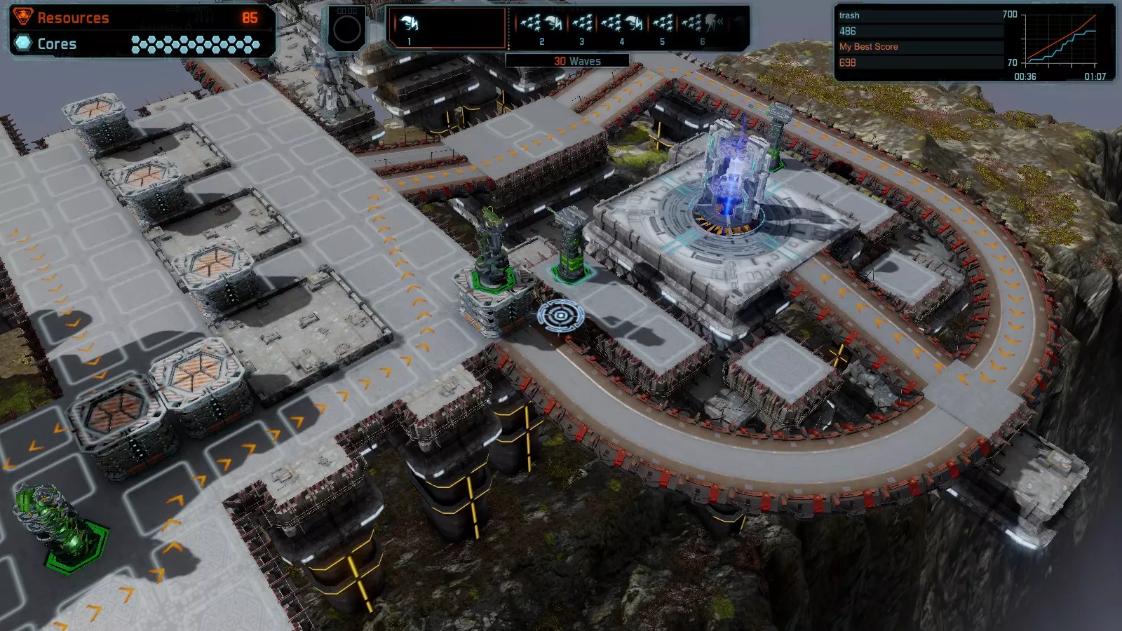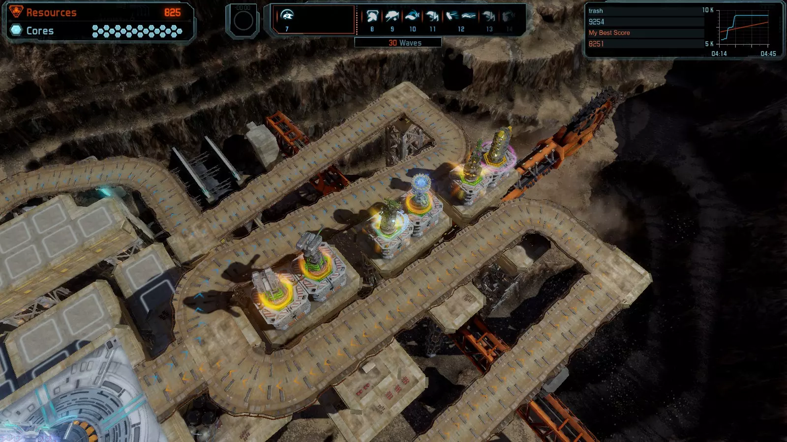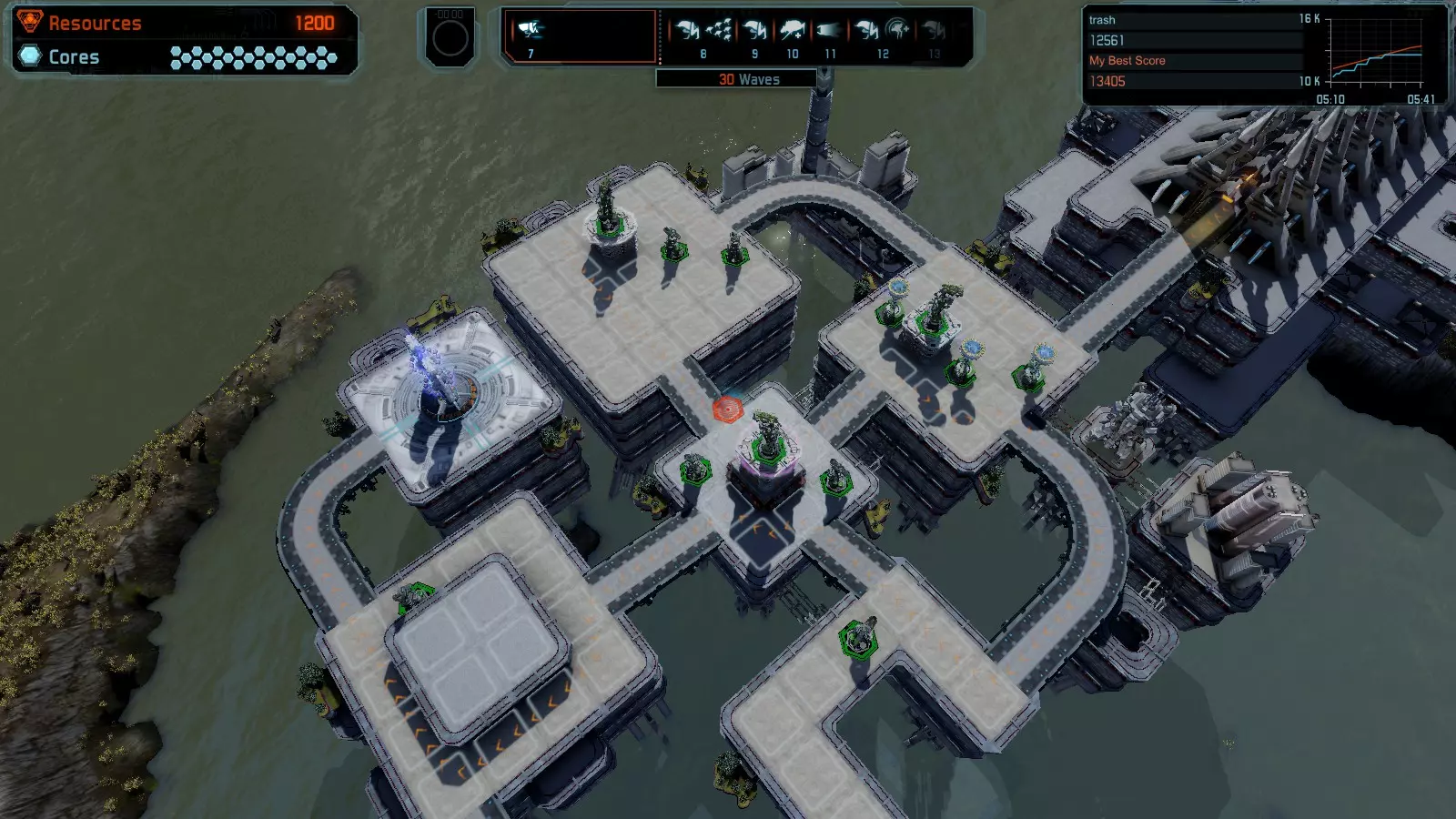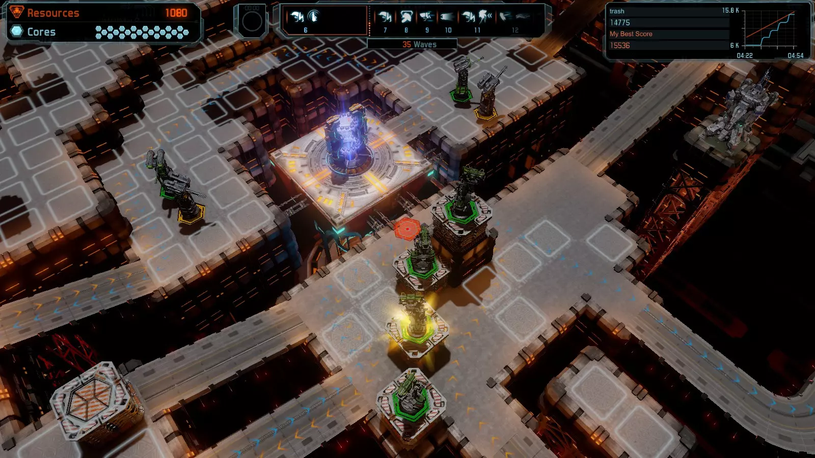 地图06:快速崩塌 本指南介绍如何在简单难度的开放模式和竞争模式下在此地图获得金牌。 此布局适用于以下所有模式并可获得金牌: 固定资源 电力中断 焦点 有限塔防 满载 子弹耗尽 核心冻结 练习 建造方案: 1座绿色时间塔 2座红色激光塔 1座带黄色震荡干扰器的增强塔 3座带红色激光干扰器的增强塔