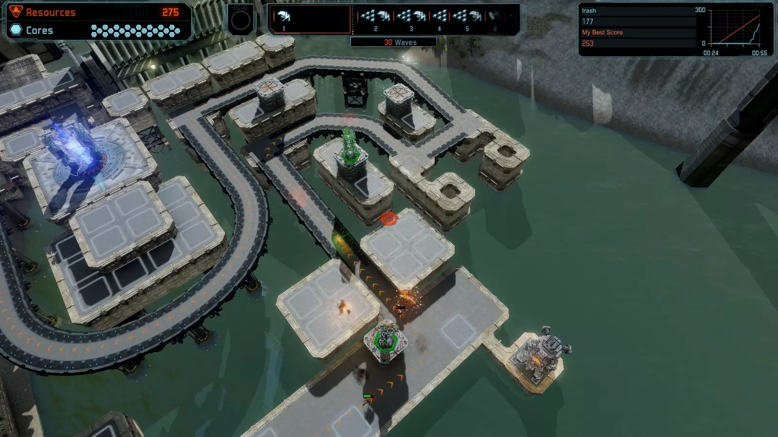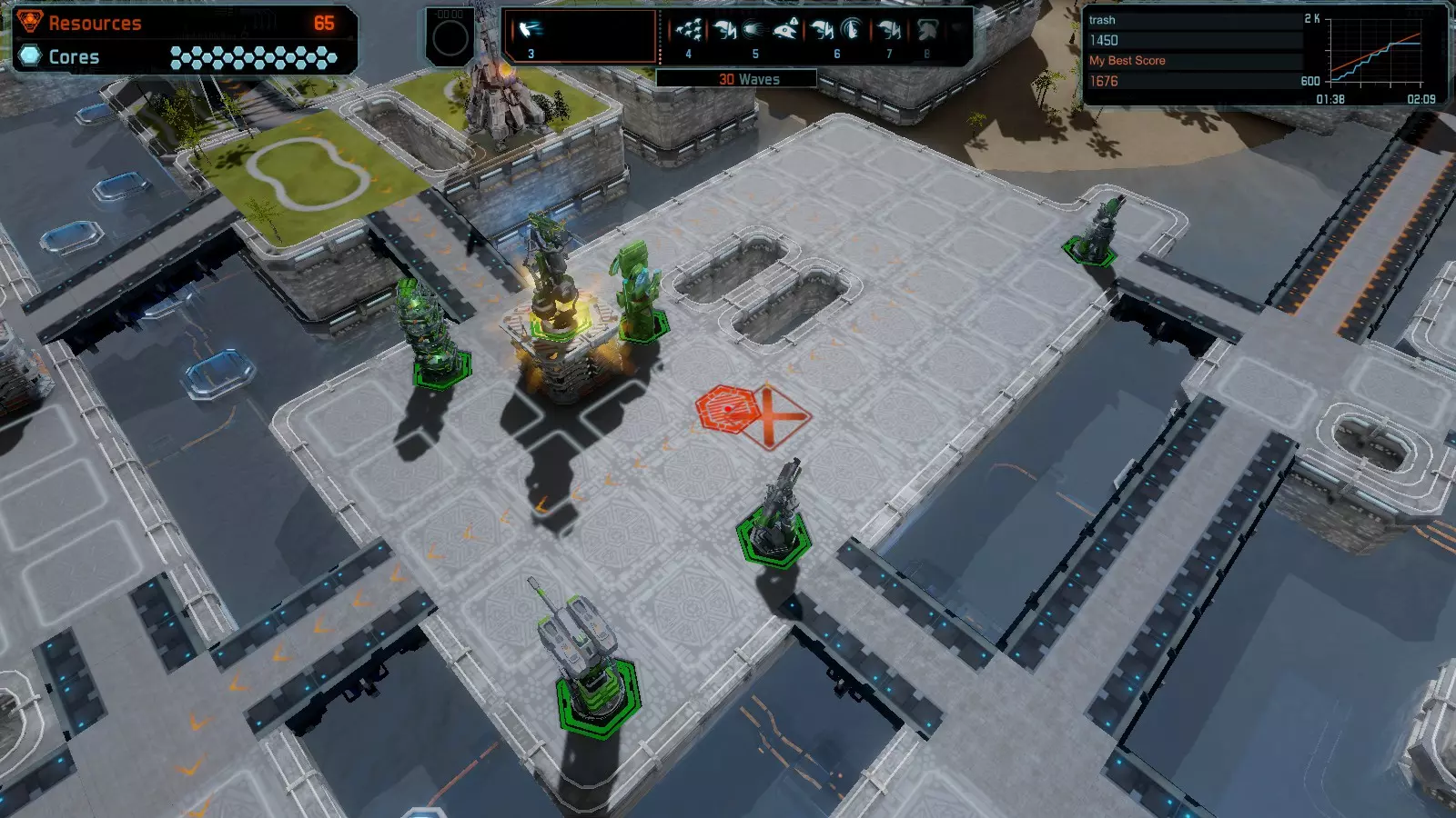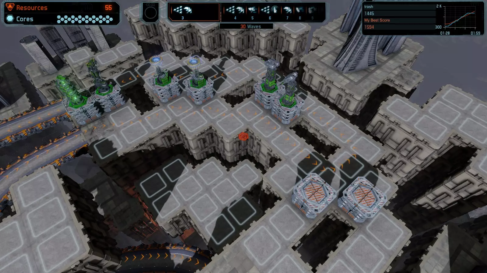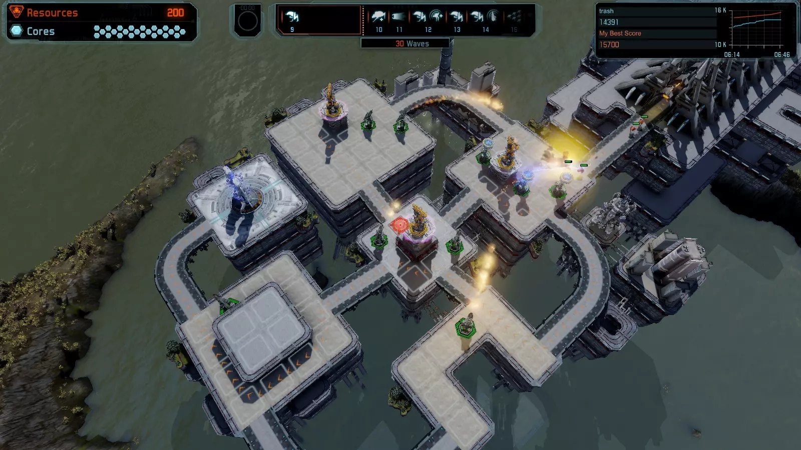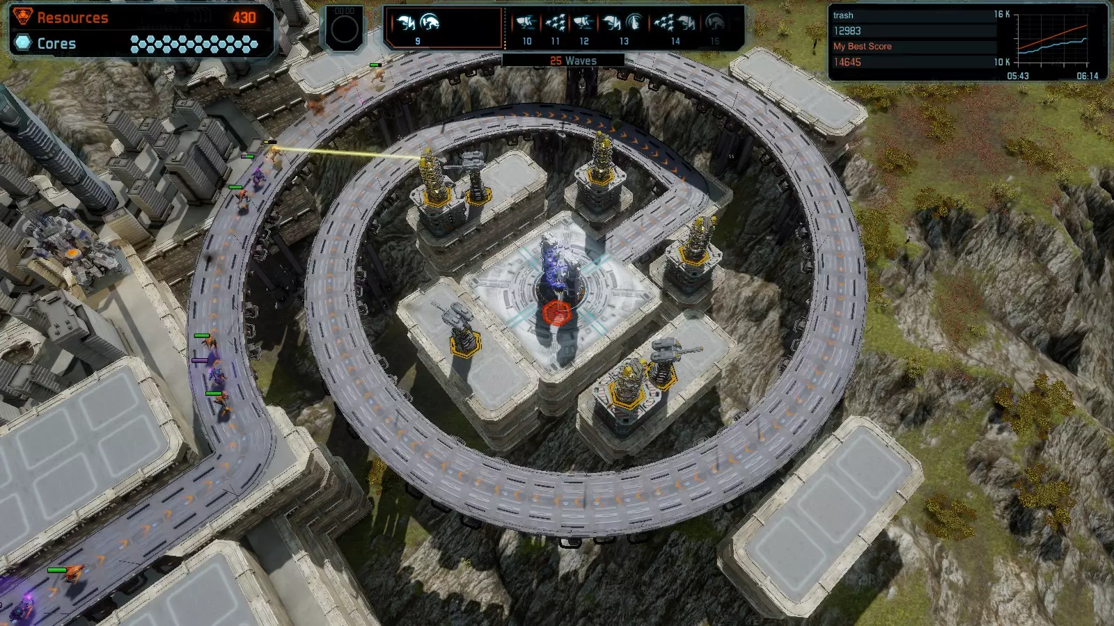 地图06:快速崩塌 本指南介绍如何在简单难度的开放模式和竞争模式下在此地图获得金牌。 此布局适用于以下所有模式并可获得金牌: 固定资源 电力中断 焦点 有限塔防 满载 子弹耗尽 核心冻结 练习 建造方案: 1座绿色时间塔 2座红色激光塔 1座带黄色震荡干扰器的增强塔 3座带红色激光干扰器的增强塔