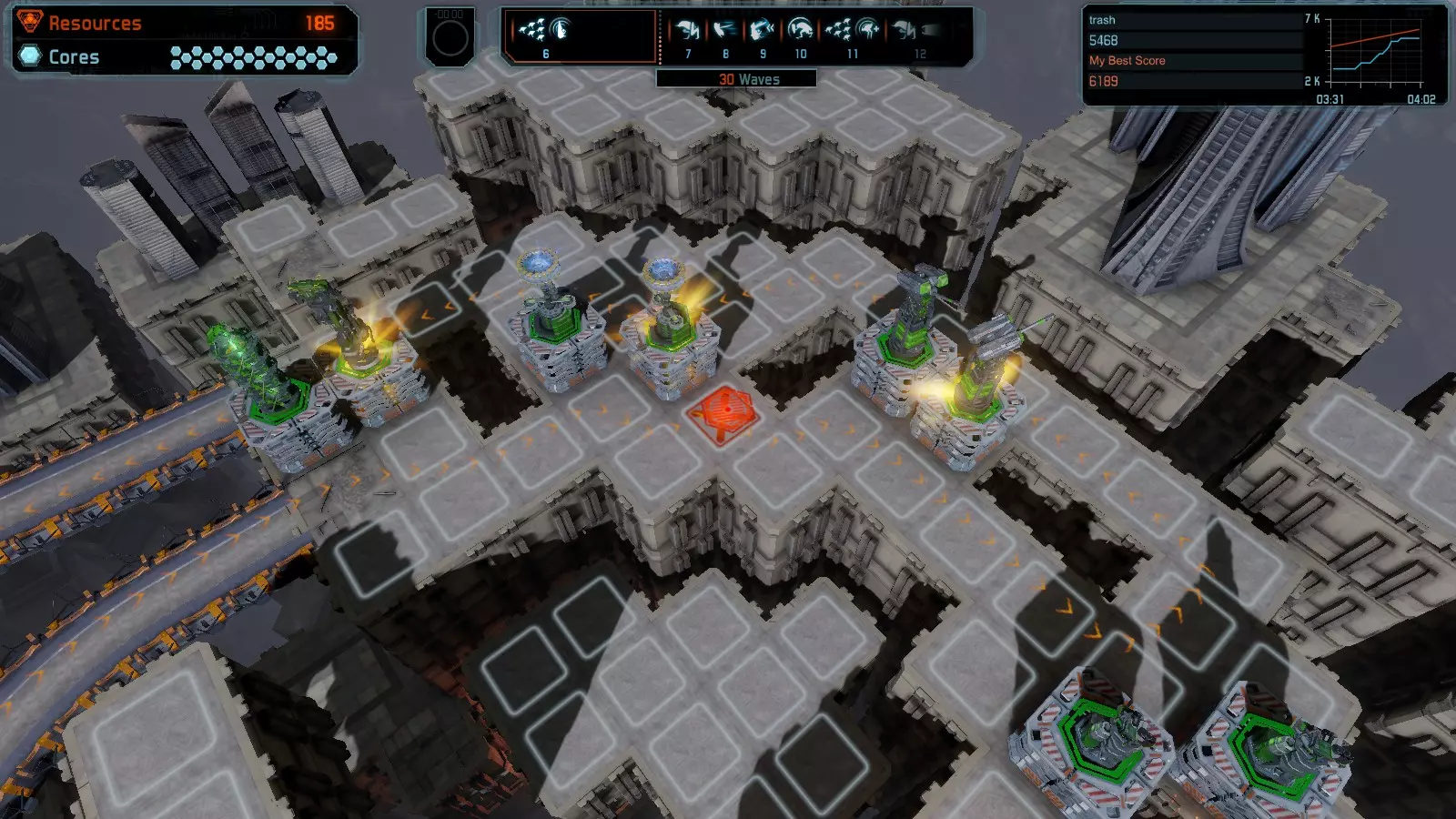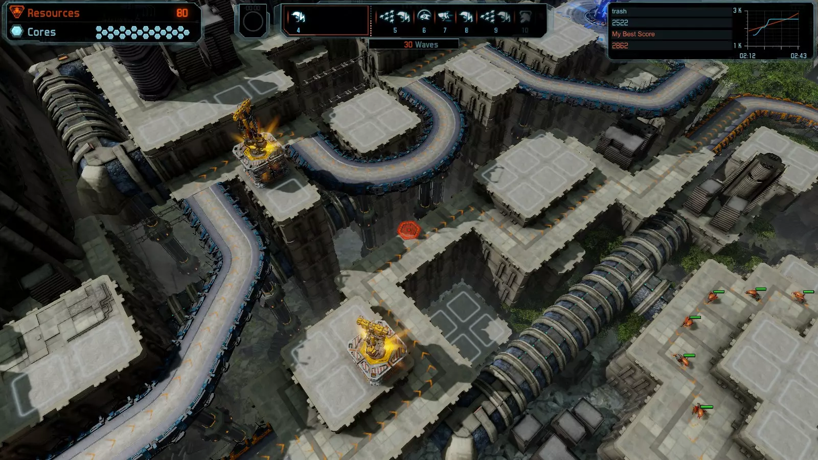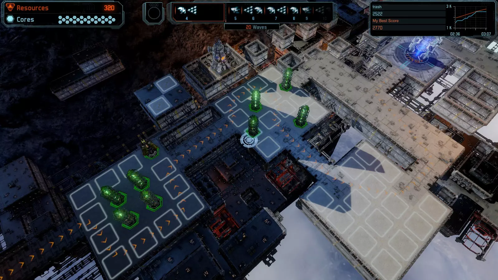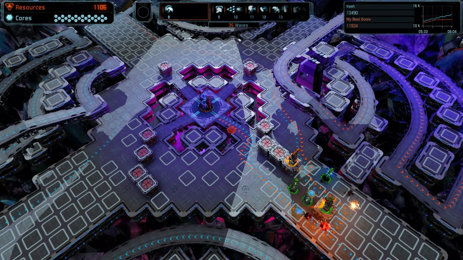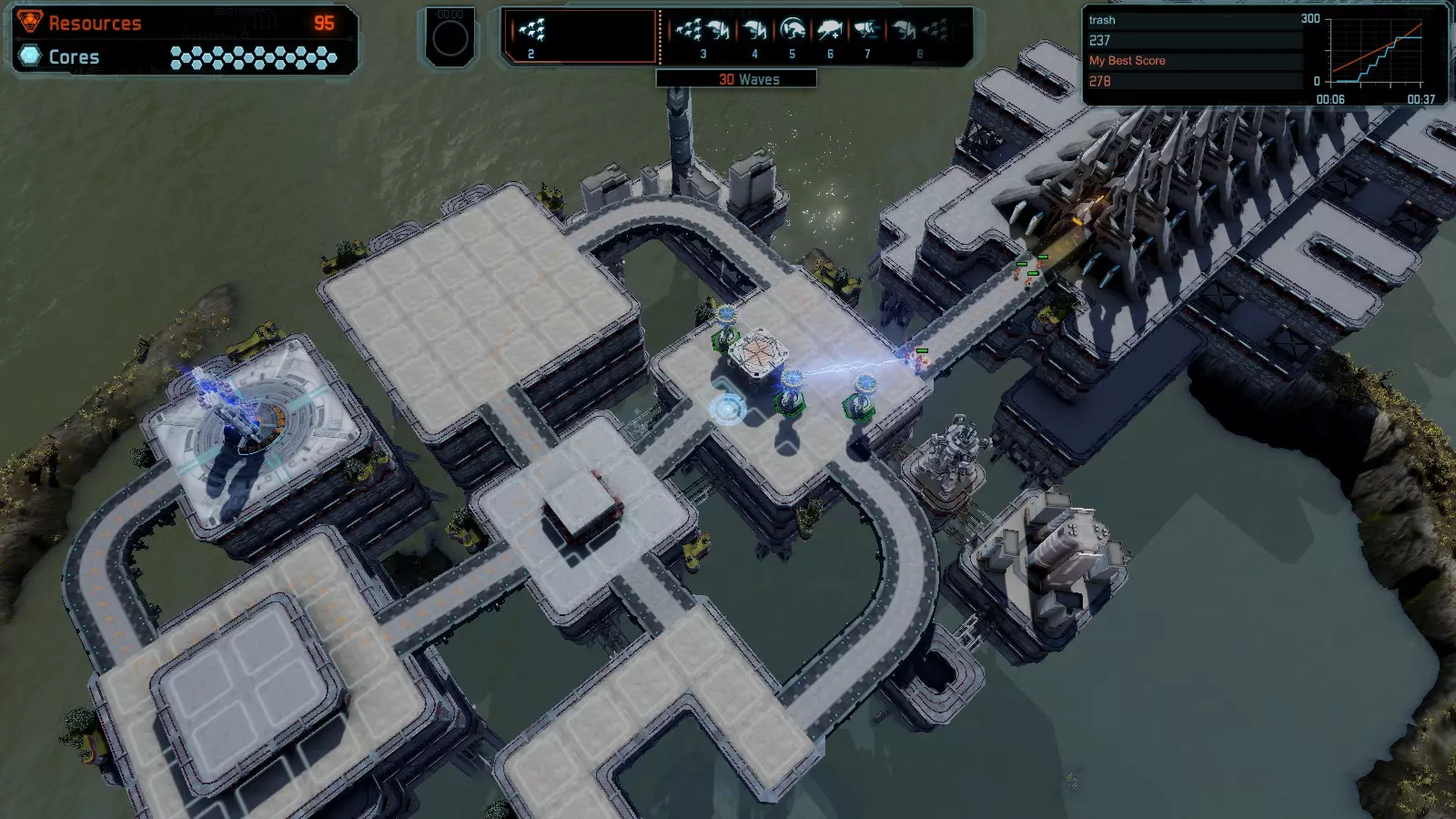 地图06:快速崩塌 本指南介绍如何在简单难度的开放模式和竞争模式下在此地图获得金牌。 此布局适用于以下所有模式并可获得金牌: 固定资源 电力中断 焦点 有限塔防 满载 子弹耗尽 核心冻结 练习 建造方案: 1座绿色时间塔 2座红色激光塔 1座带黄色震荡干扰器的增强塔 3座带红色激光干扰器的增强塔