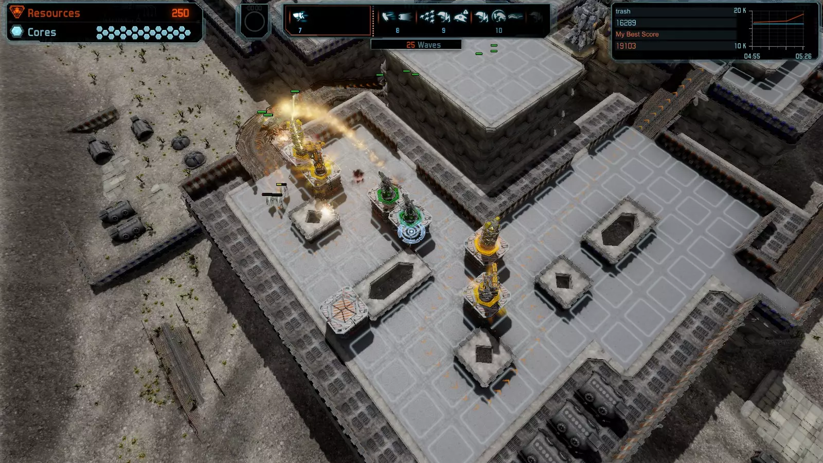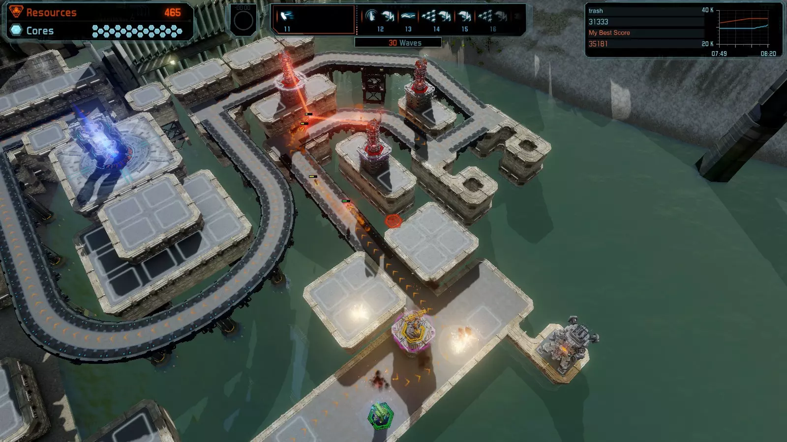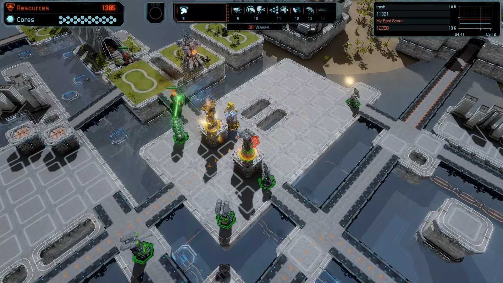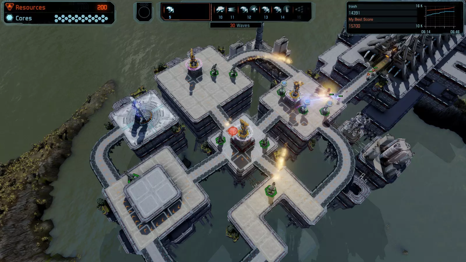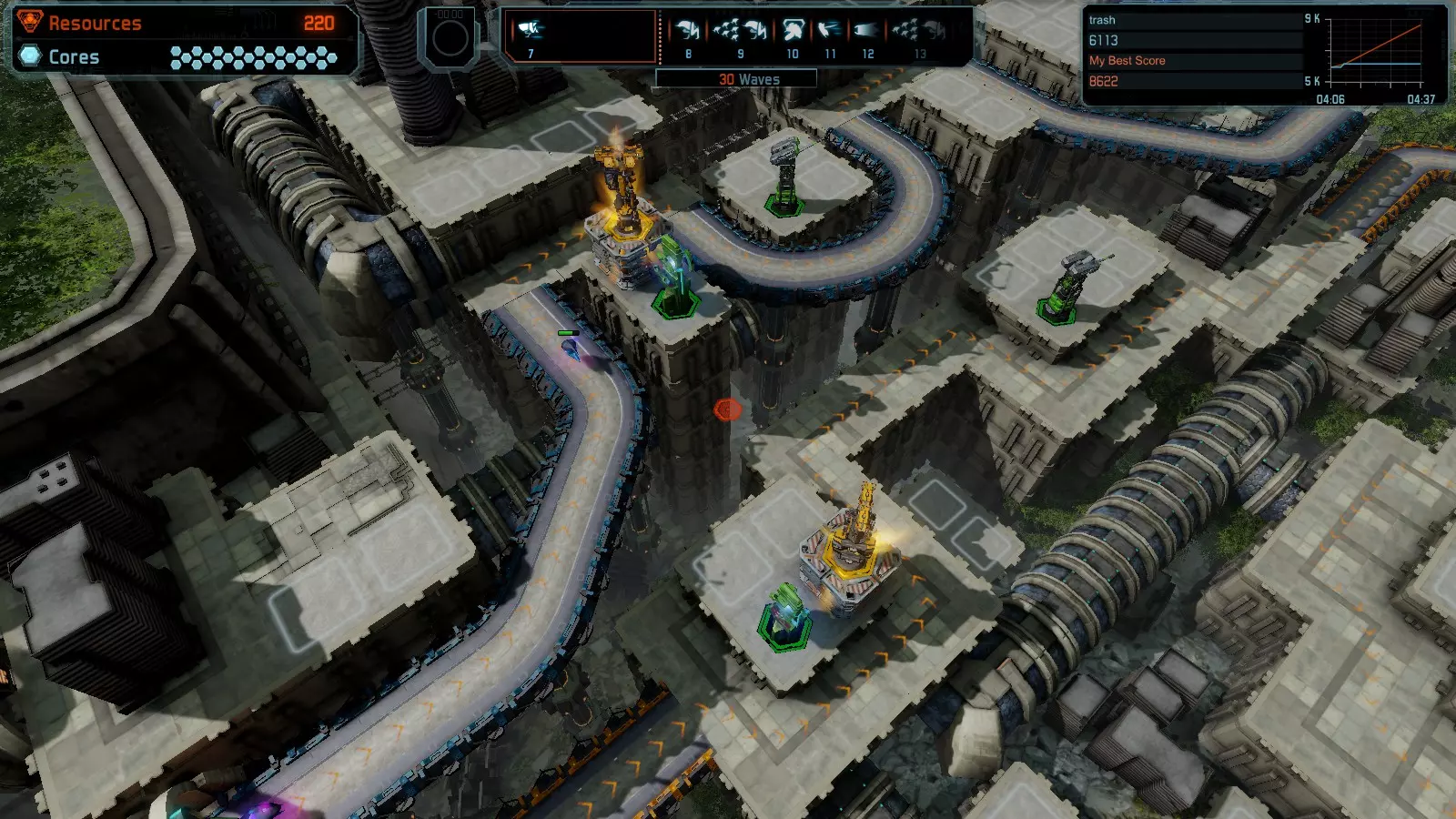 地图06:快速崩塌 本指南介绍如何在简单难度的开放模式和竞争模式下在此地图获得金牌。 此布局适用于以下所有模式并可获得金牌: 固定资源 电力中断 焦点 有限塔防 满载 子弹耗尽 核心冻结 练习 建造方案: 1座绿色时间塔 2座红色激光塔 1座带黄色震荡干扰器的增强塔 3座带红色激光干扰器的增强塔