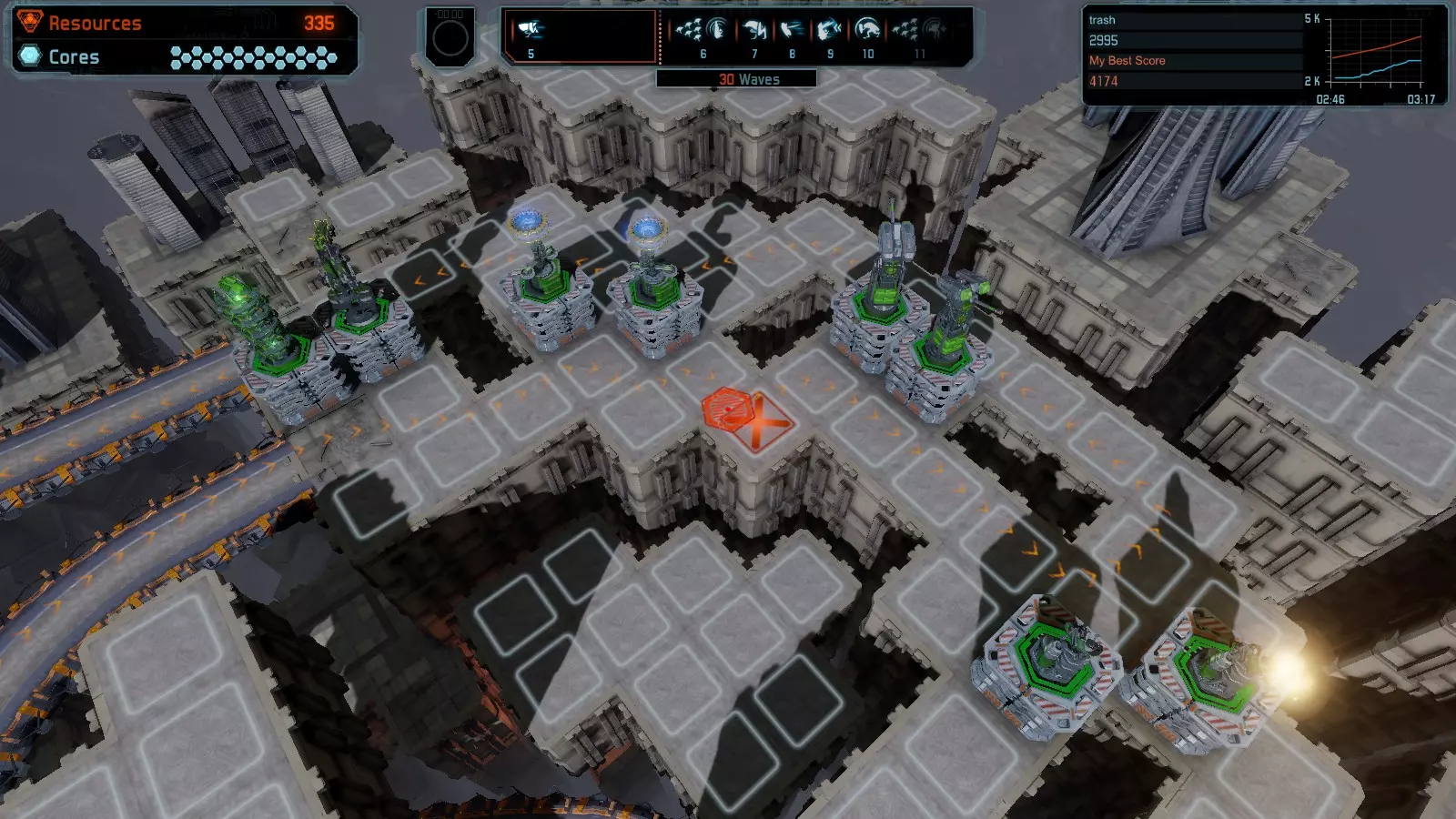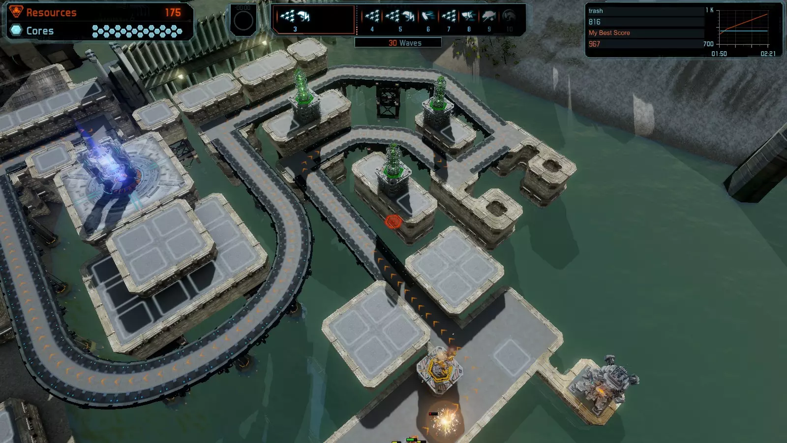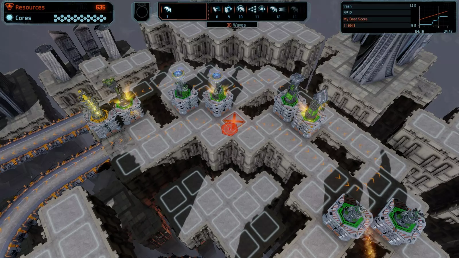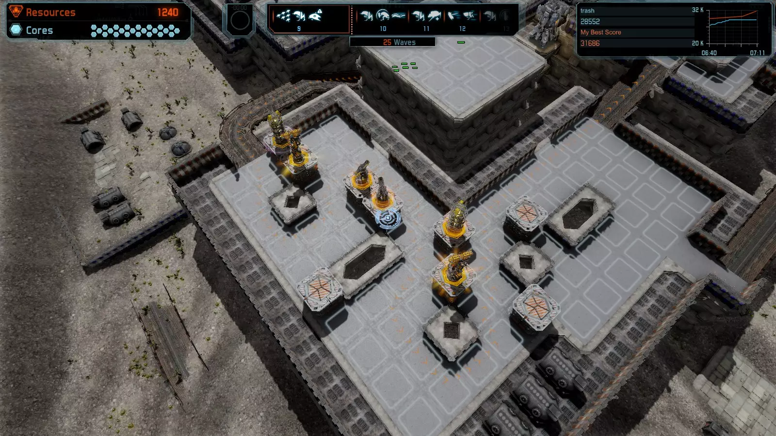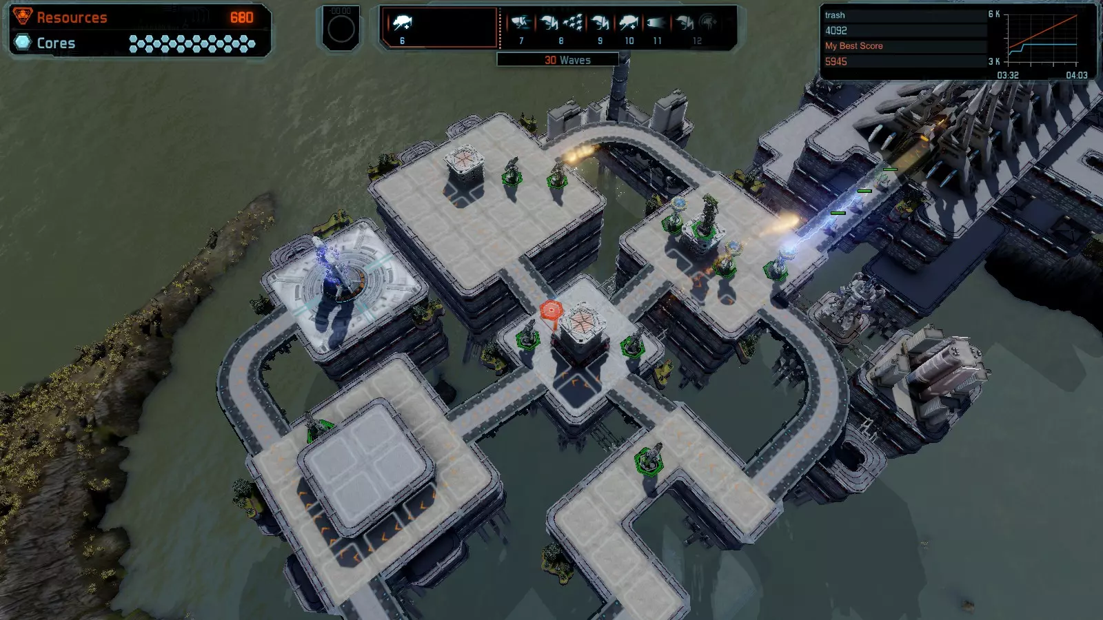 地图06:快速崩塌 本指南介绍如何在简单难度的开放模式和竞争模式下在此地图获得金牌。 此布局适用于以下所有模式并可获得金牌: 固定资源 电力中断 焦点 有限塔防 满载 子弹耗尽 核心冻结 练习 建造方案: 1座绿色时间塔 2座红色激光塔 1座带黄色震荡干扰器的增强塔 3座带红色激光干扰器的增强塔