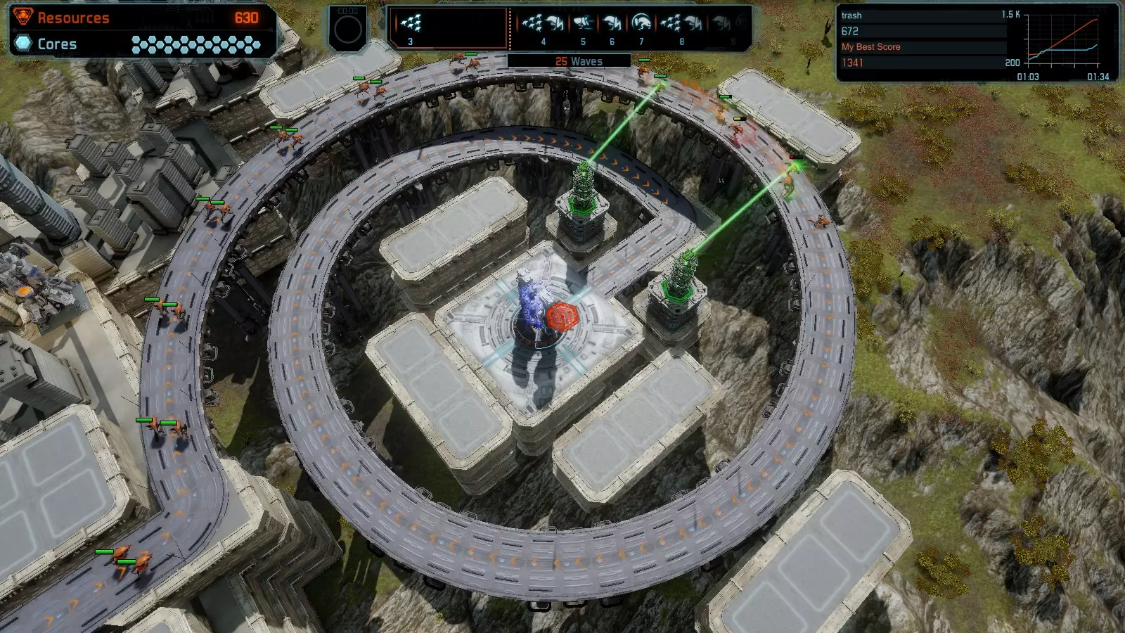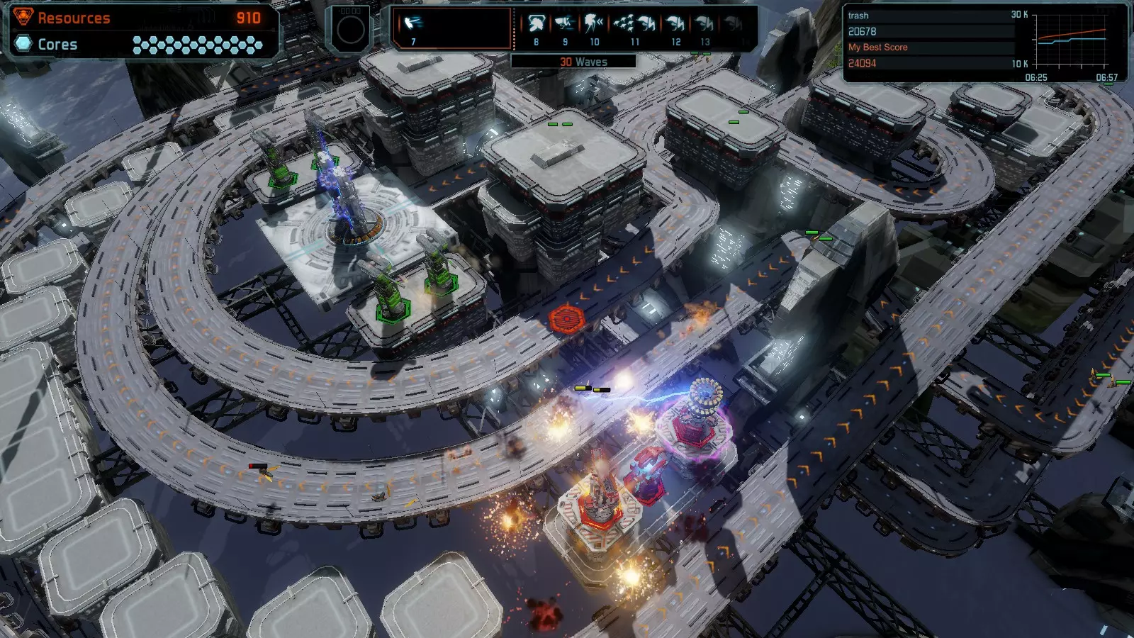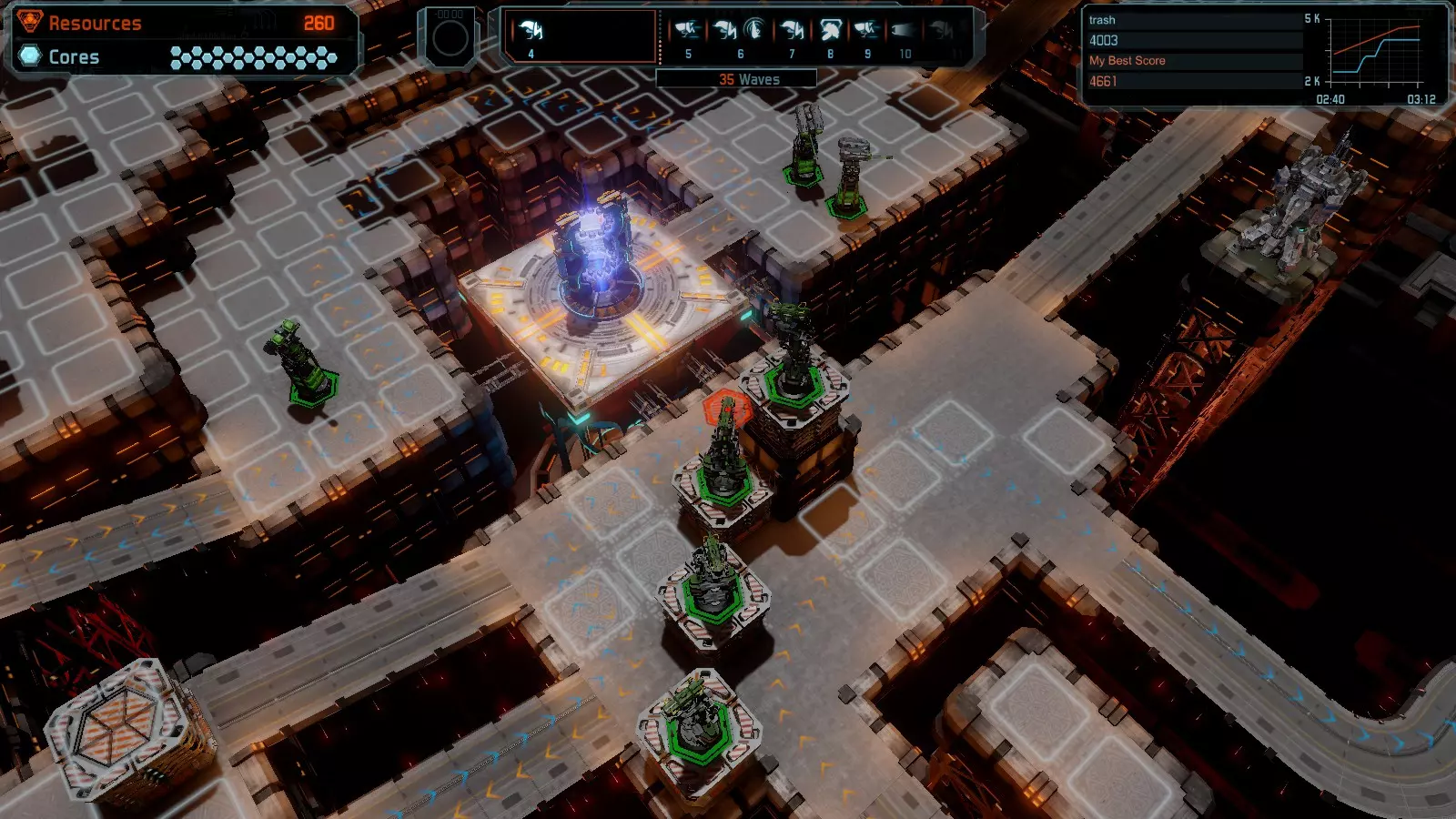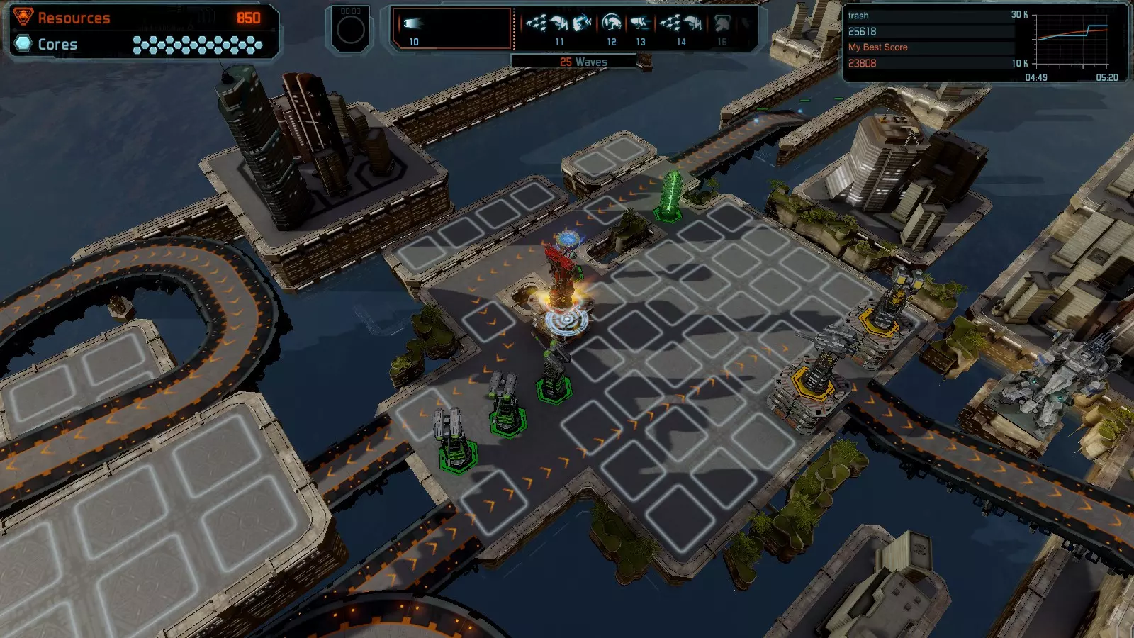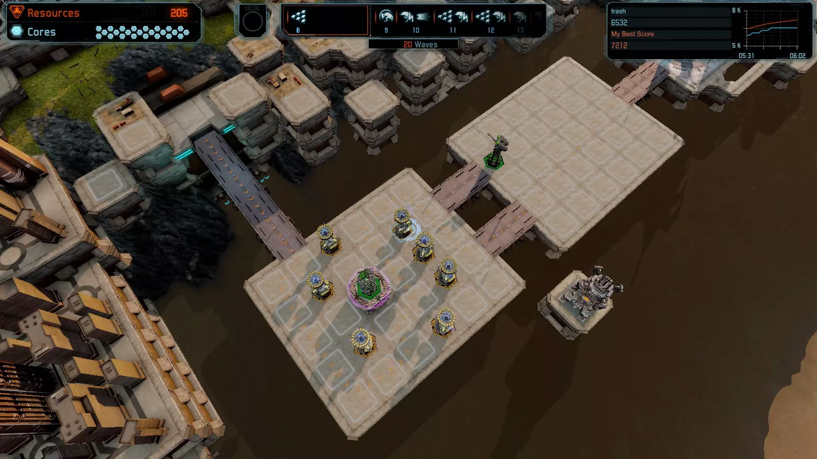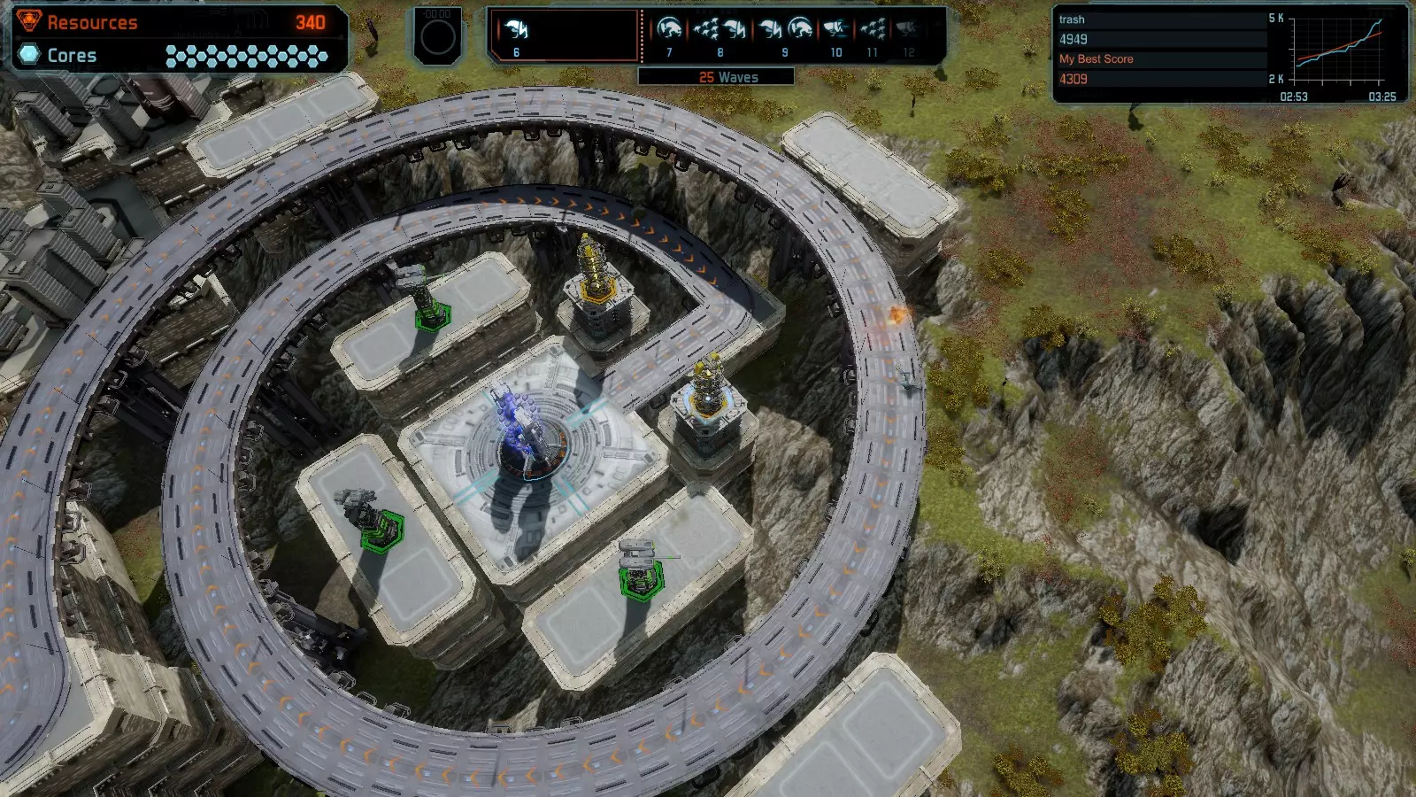 地图06:快速崩塌 本指南介绍如何在简单难度的开放模式和竞争模式下在此地图获得金牌。 此布局适用于以下所有模式并可获得金牌: 固定资源 电力中断 焦点 有限塔防 满载 子弹耗尽 核心冻结 练习 建造方案: 1座绿色时间塔 2座红色激光塔 1座带黄色震荡干扰器的增强塔 3座带红色激光干扰器的增强塔