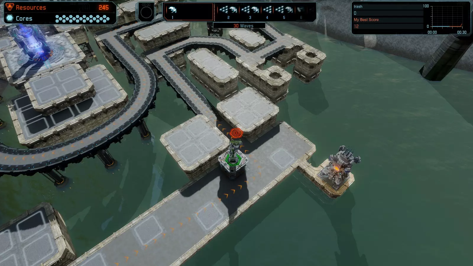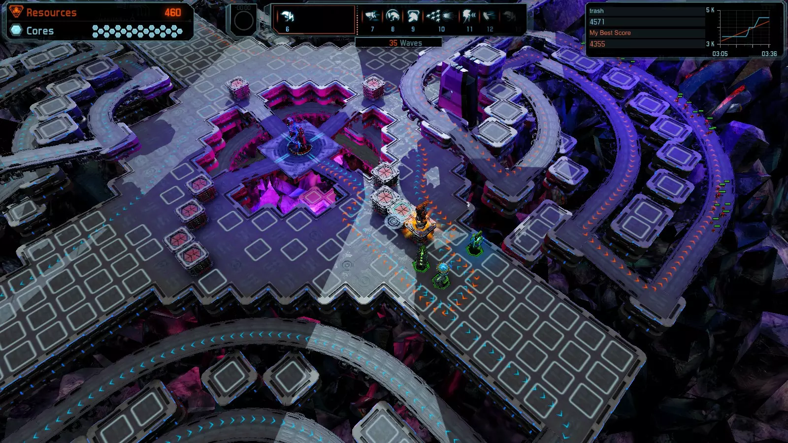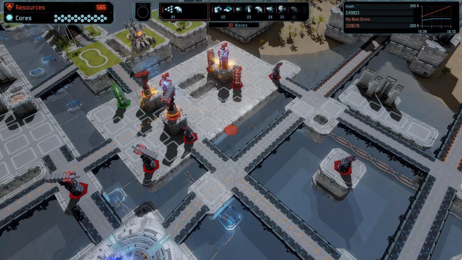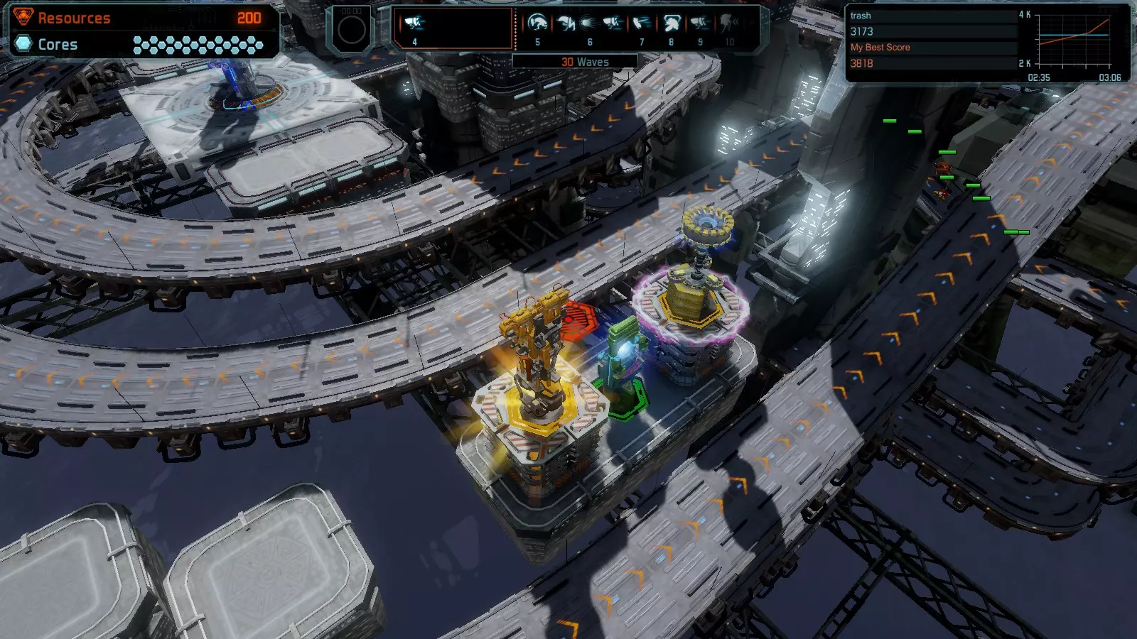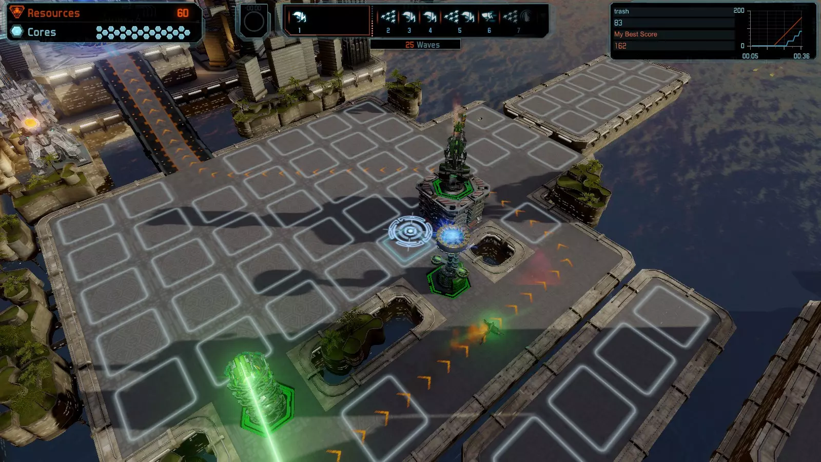 地图06:快速崩塌 本指南介绍如何在简单难度的开放模式和竞争模式下在此地图获得金牌。 此布局适用于以下所有模式并可获得金牌: 固定资源 电力中断 焦点 有限塔防 满载 子弹耗尽 核心冻结 练习 建造方案: 1座绿色时间塔 2座红色激光塔 1座带黄色震荡干扰器的增强塔 3座带红色激光干扰器的增强塔