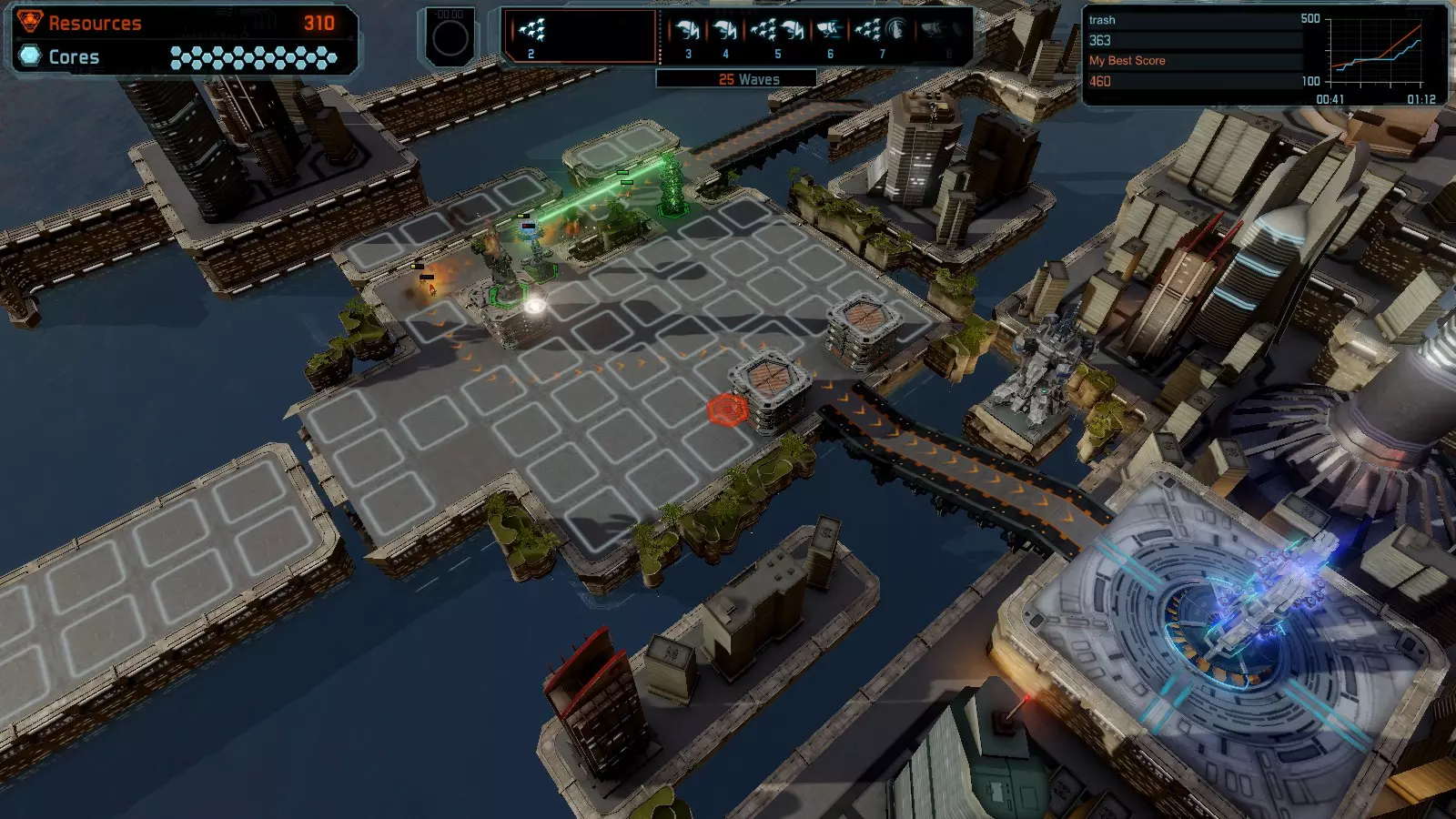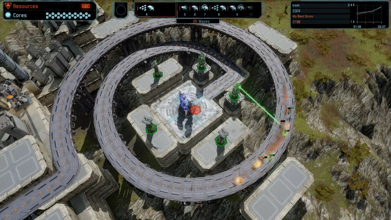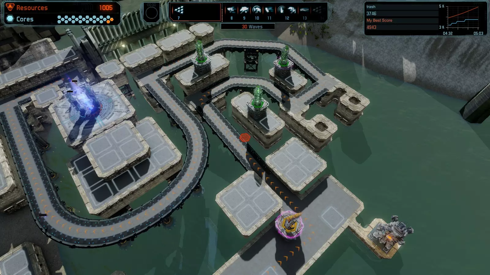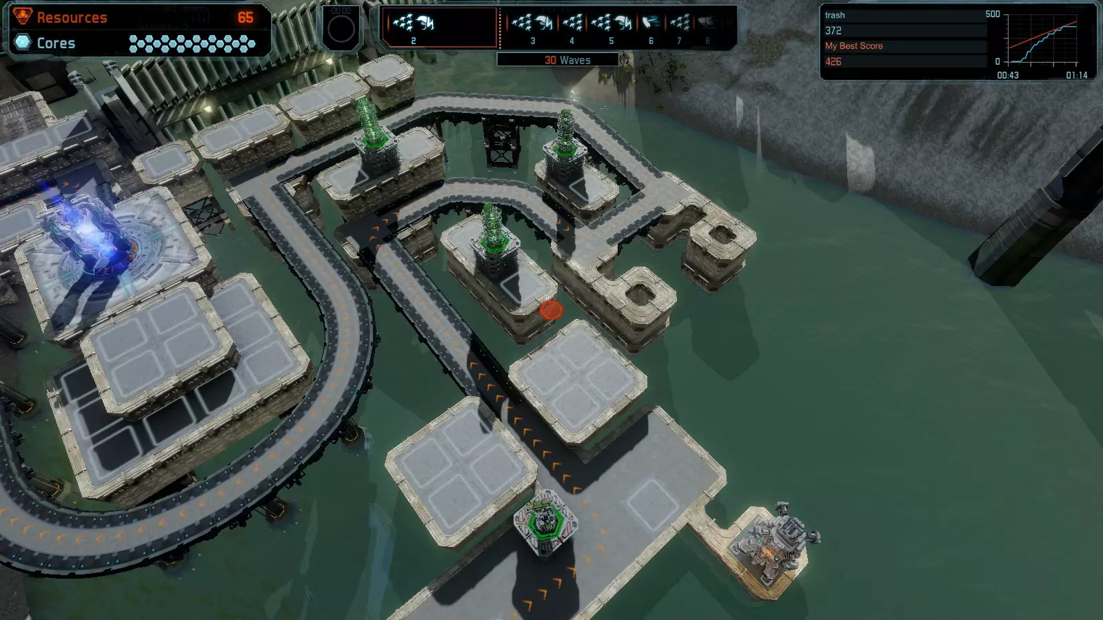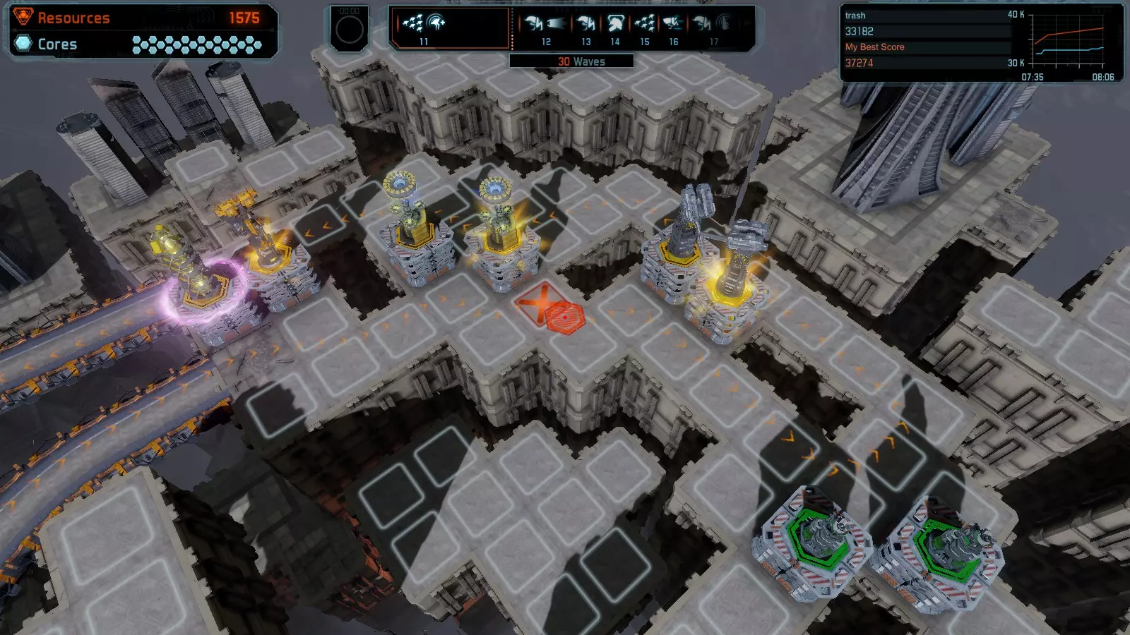 地图06:快速崩塌 本指南介绍如何在简单难度的开放模式和竞争模式下在此地图获得金牌。 此布局适用于以下所有模式并可获得金牌: 固定资源 电力中断 焦点 有限塔防 满载 子弹耗尽 核心冻结 练习 建造方案: 1座绿色时间塔 2座红色激光塔 1座带黄色震荡干扰器的增强塔 3座带红色激光干扰器的增强塔