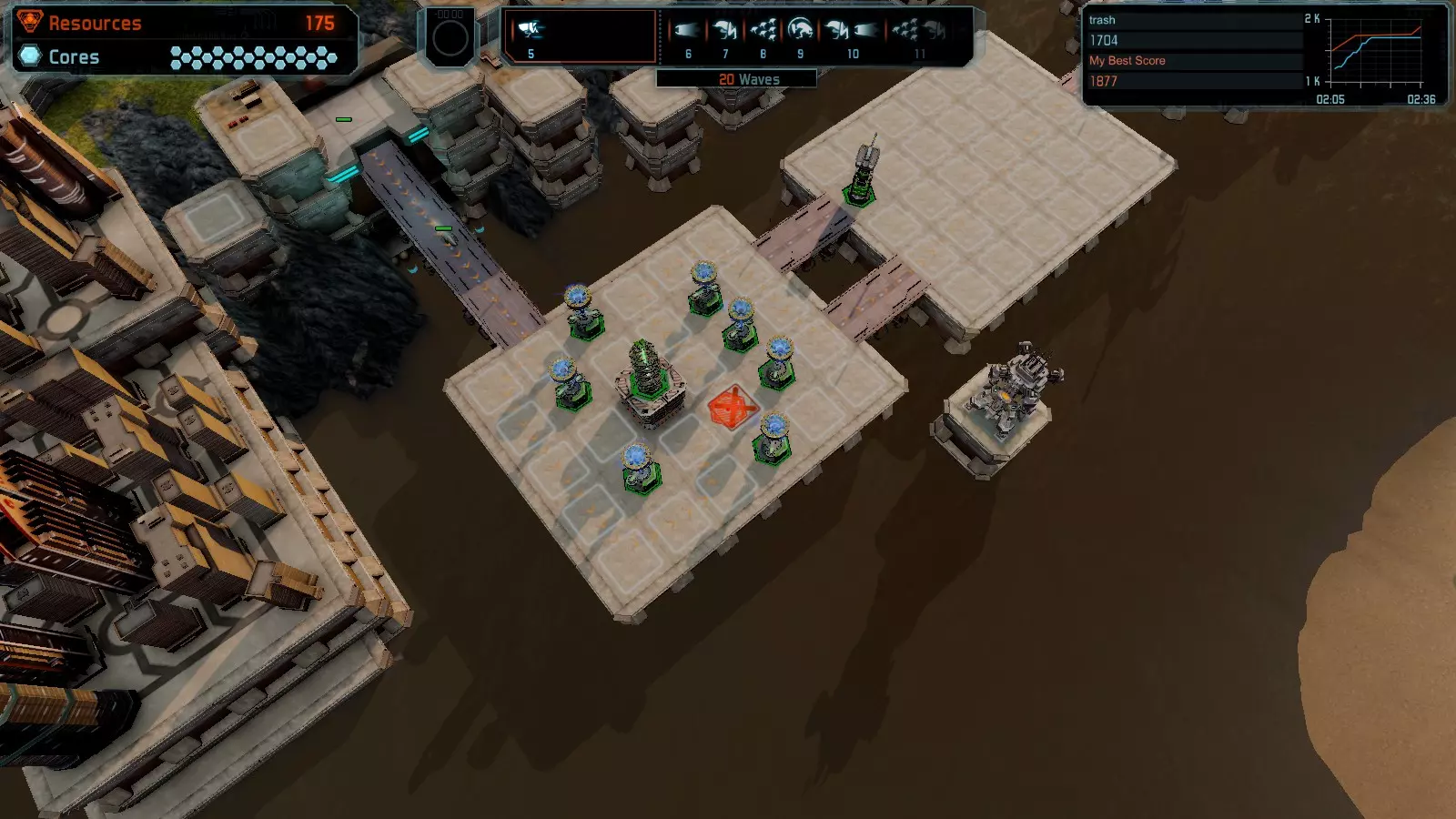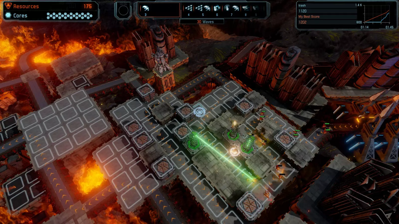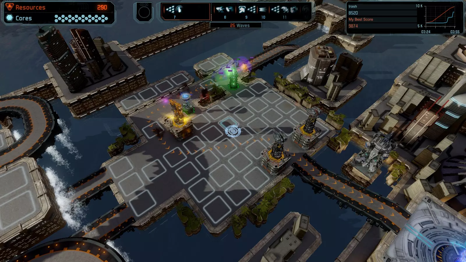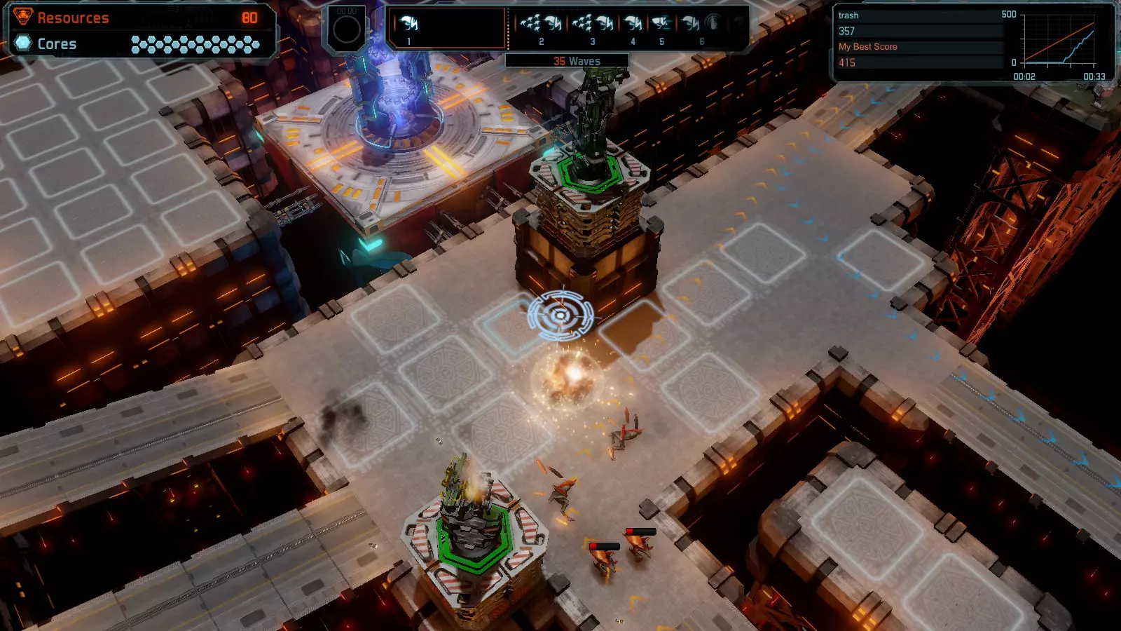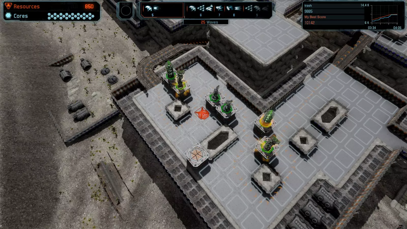 地图06:快速崩塌 本指南介绍如何在简单难度的开放模式和竞争模式下在此地图获得金牌。 此布局适用于以下所有模式并可获得金牌: 固定资源 电力中断 焦点 有限塔防 满载 子弹耗尽 核心冻结 练习 建造方案: 1座绿色时间塔 2座红色激光塔 1座带黄色震荡干扰器的增强塔 3座带红色激光干扰器的增强塔