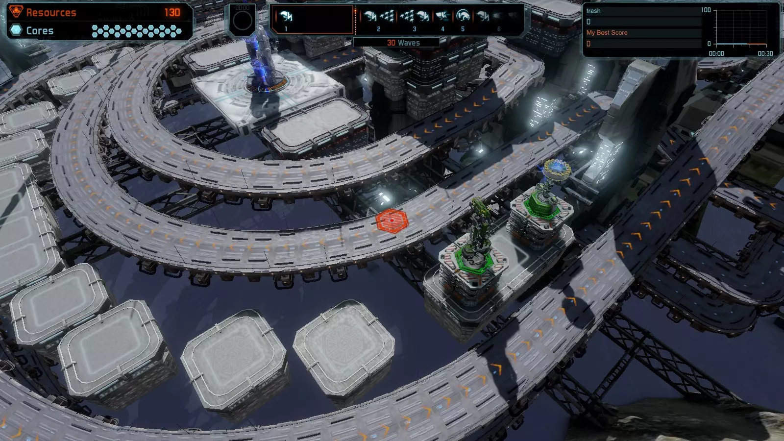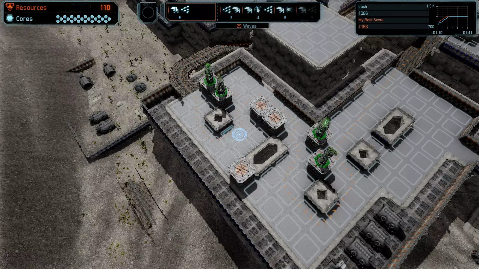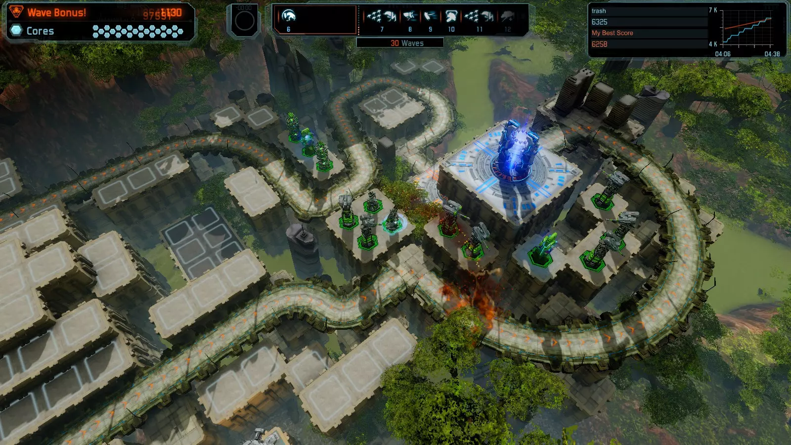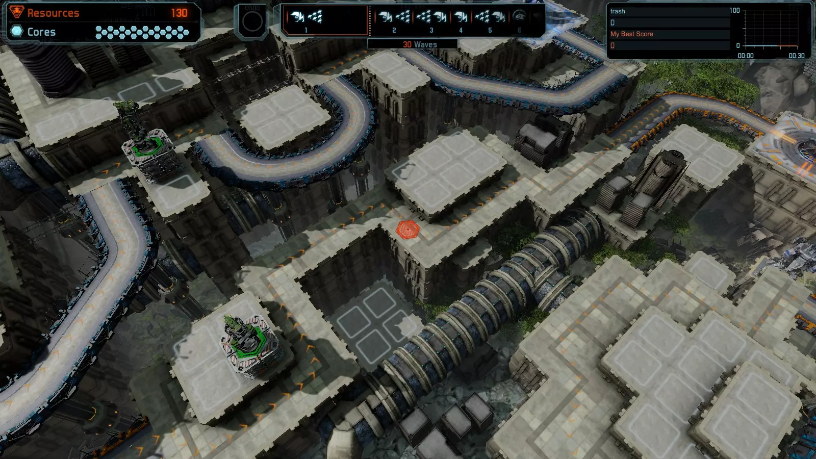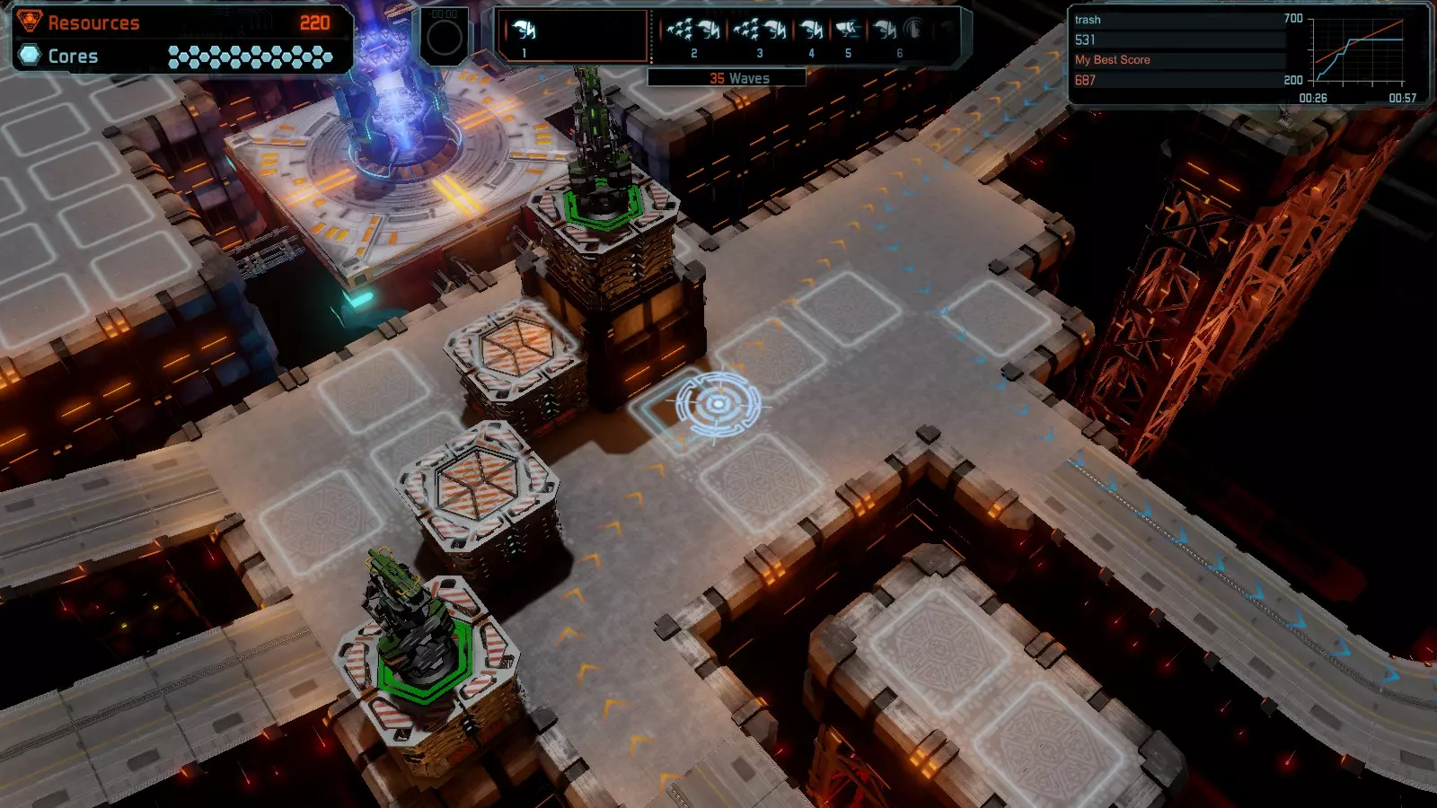 地图06:快速崩塌 本指南介绍如何在简单难度的开放模式和竞争模式下在此地图获得金牌。 此布局适用于以下所有模式并可获得金牌: 固定资源 电力中断 焦点 有限塔防 满载 子弹耗尽 核心冻结 练习 建造方案: 1座绿色时间塔 2座红色激光塔 1座带黄色震荡干扰器的增强塔 3座带红色激光干扰器的增强塔