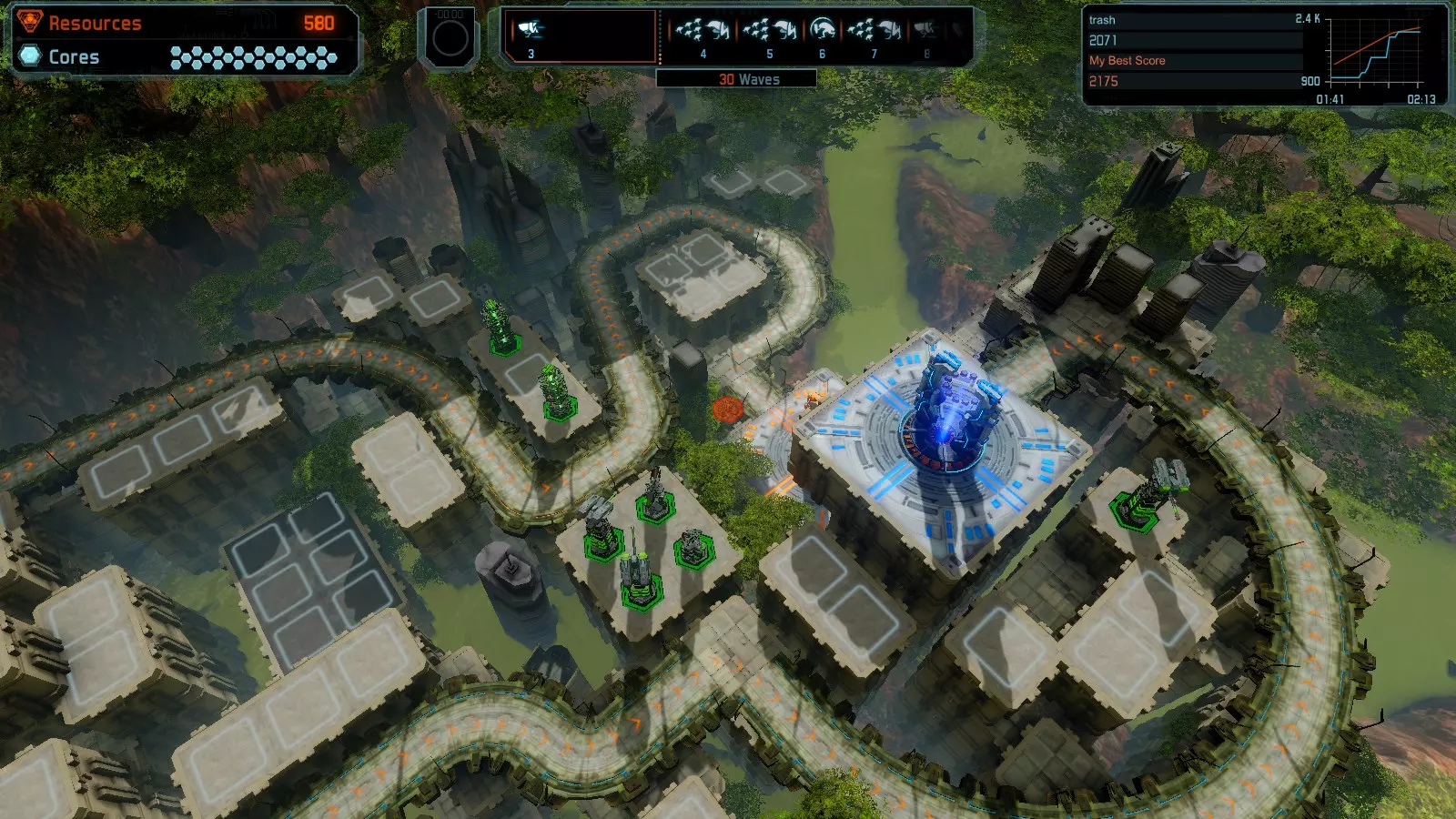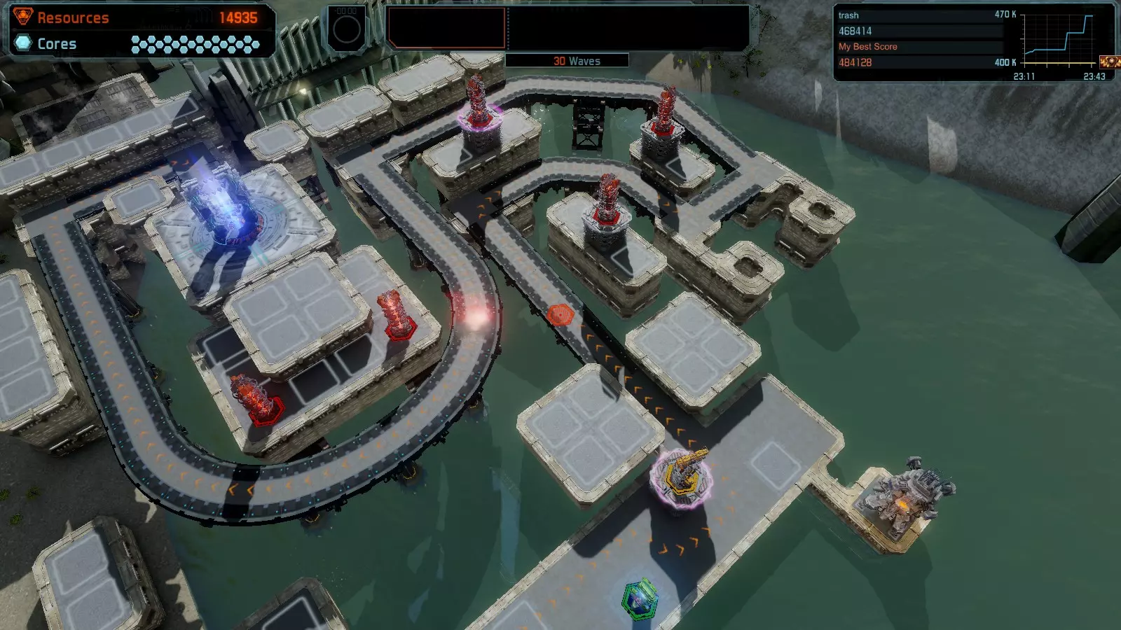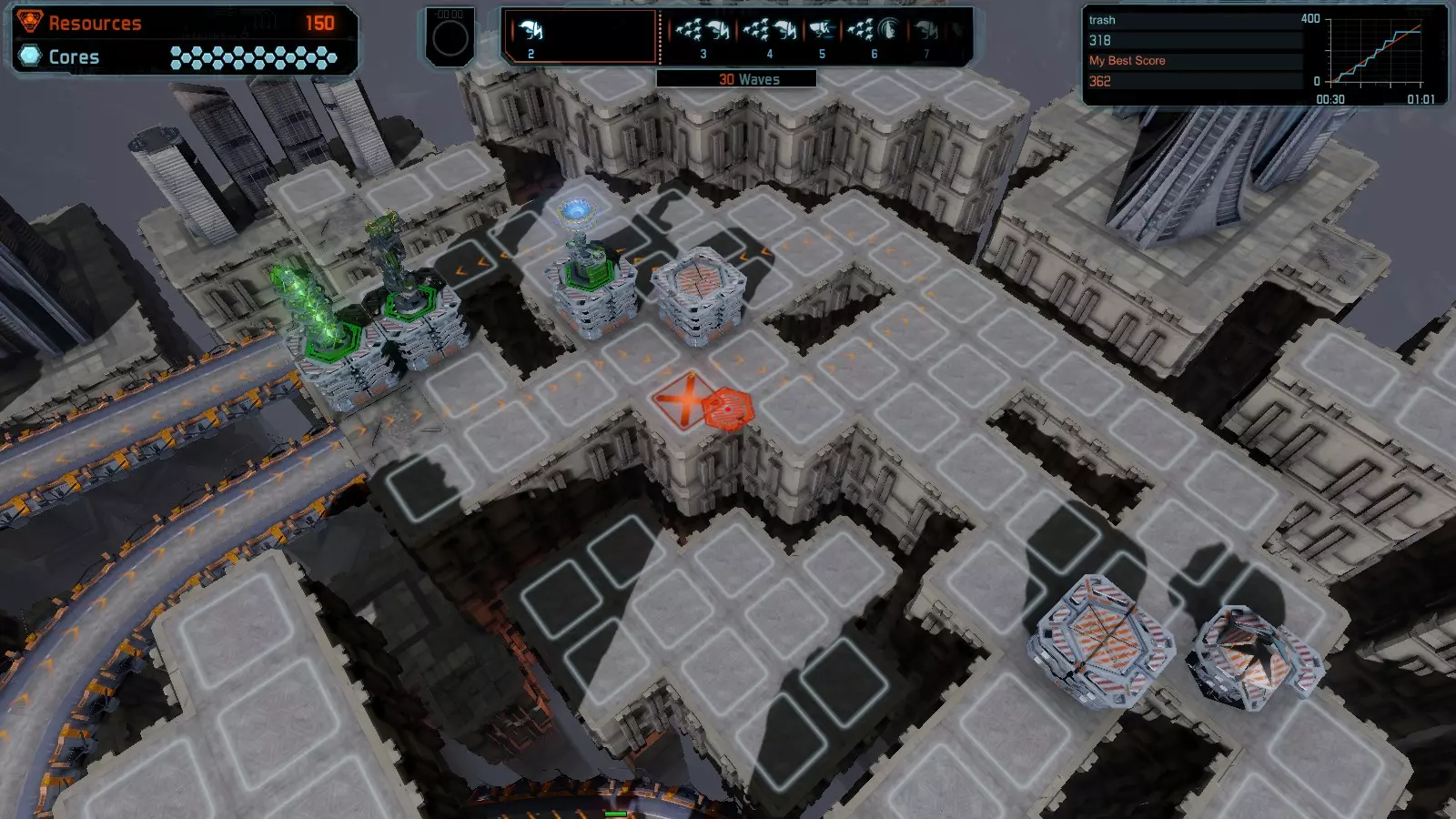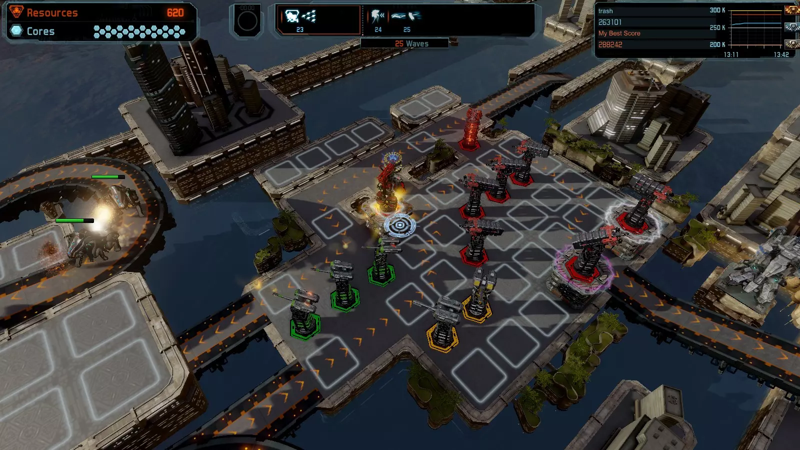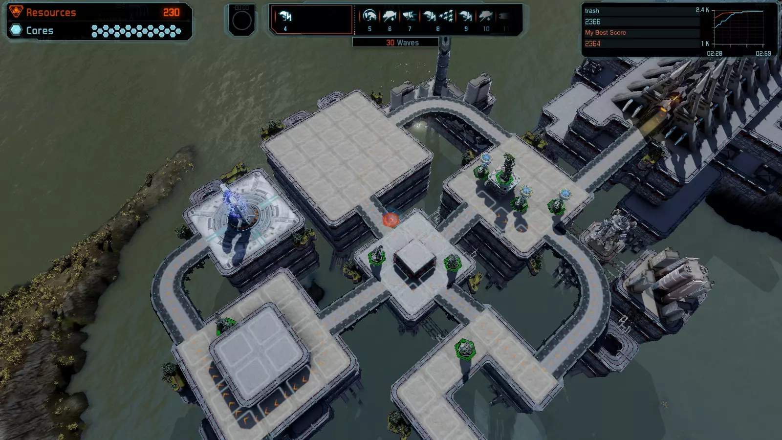 地图06:快速崩塌 本指南介绍如何在简单难度的开放模式和竞争模式下在此地图获得金牌。 此布局适用于以下所有模式并可获得金牌: 固定资源 电力中断 焦点 有限塔防 满载 子弹耗尽 核心冻结 练习 建造方案: 1座绿色时间塔 2座红色激光塔 1座带黄色震荡干扰器的增强塔 3座带红色激光干扰器的增强塔