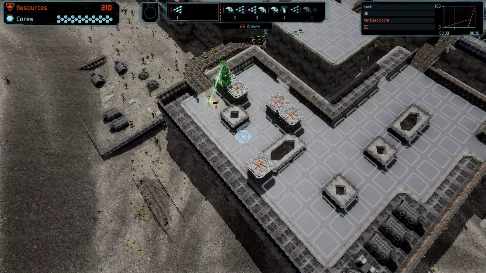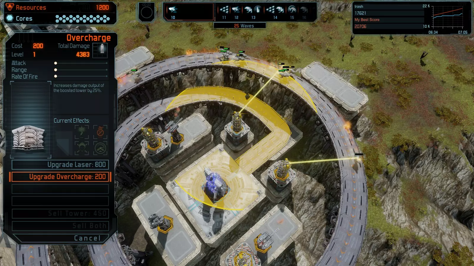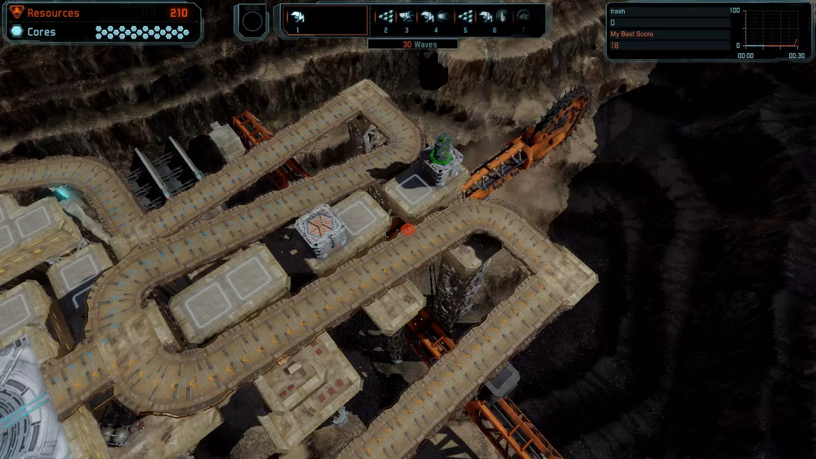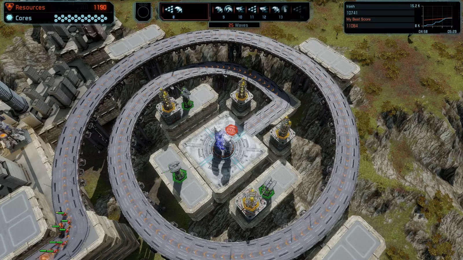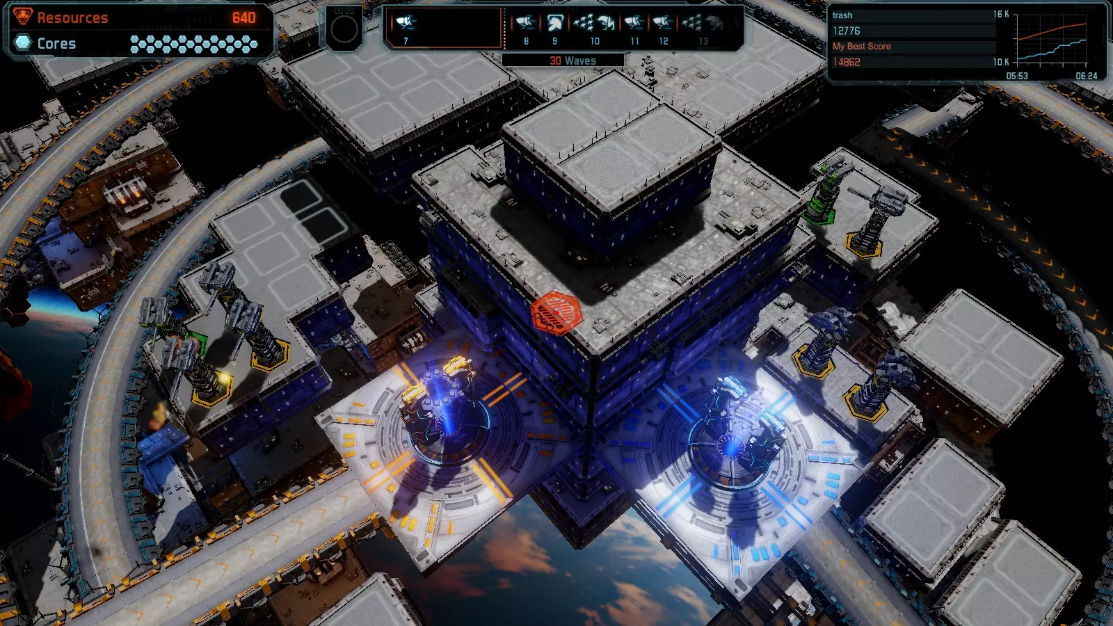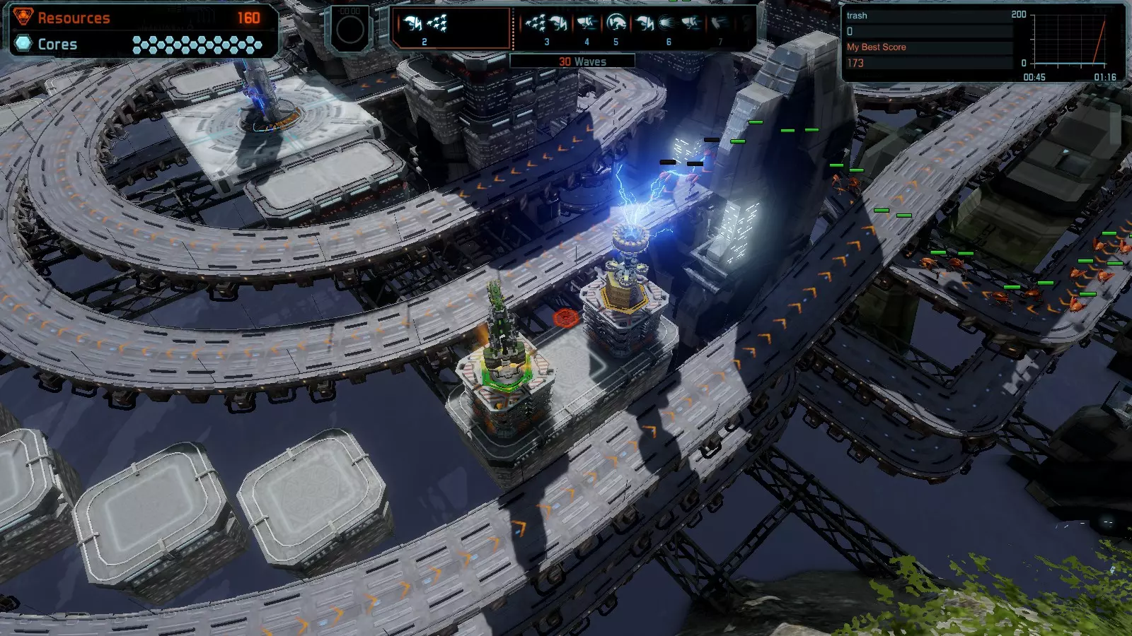 地图06:快速崩塌 本指南介绍如何在简单难度的开放模式和竞争模式下在此地图获得金牌。 此布局适用于以下所有模式并可获得金牌: 固定资源 电力中断 焦点 有限塔防 满载 子弹耗尽 核心冻结 练习 建造方案: 1座绿色时间塔 2座红色激光塔 1座带黄色震荡干扰器的增强塔 3座带红色激光干扰器的增强塔