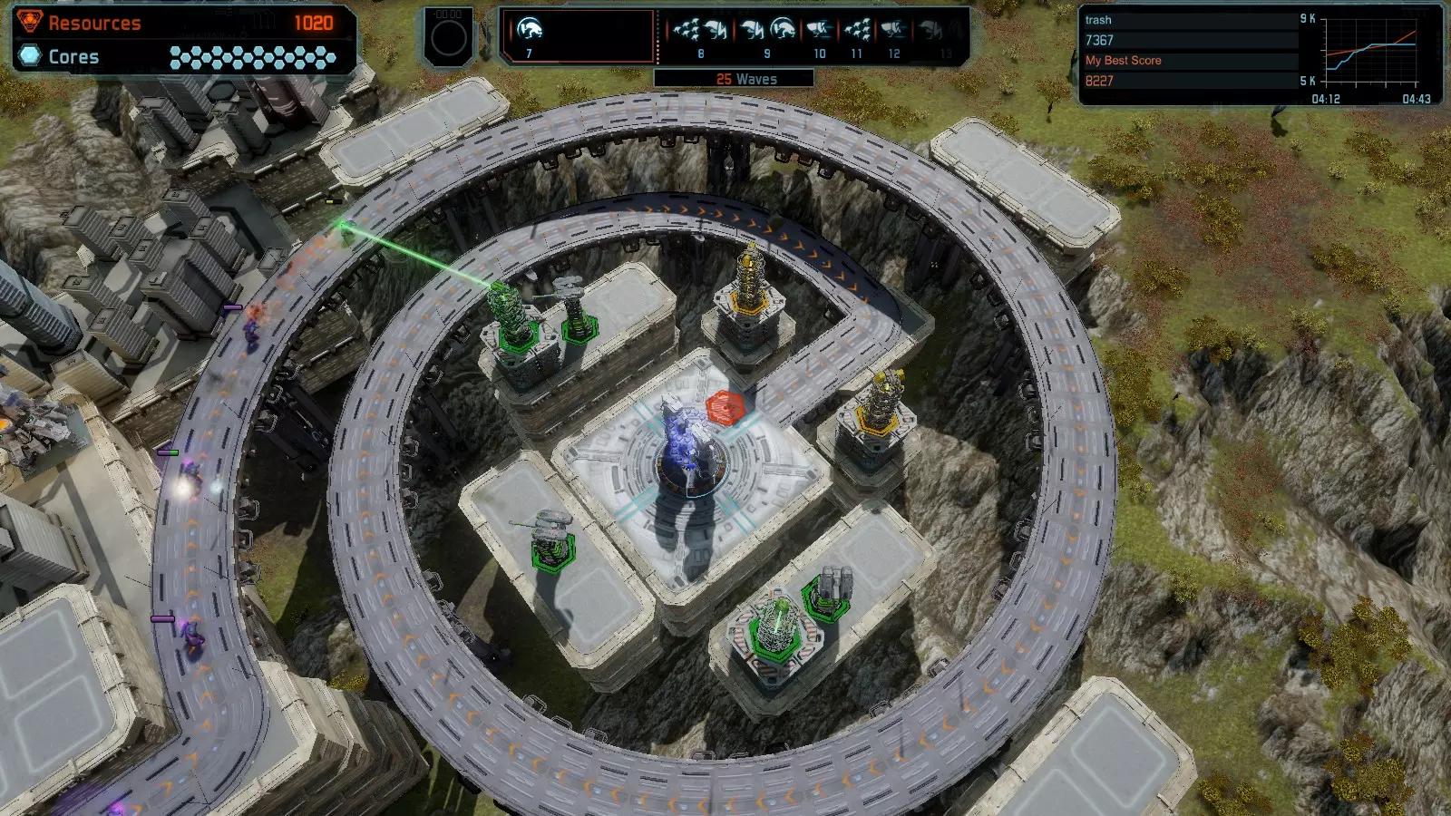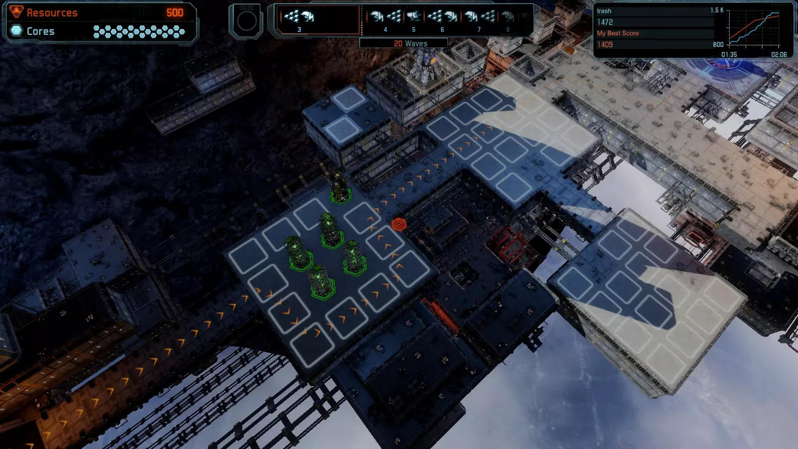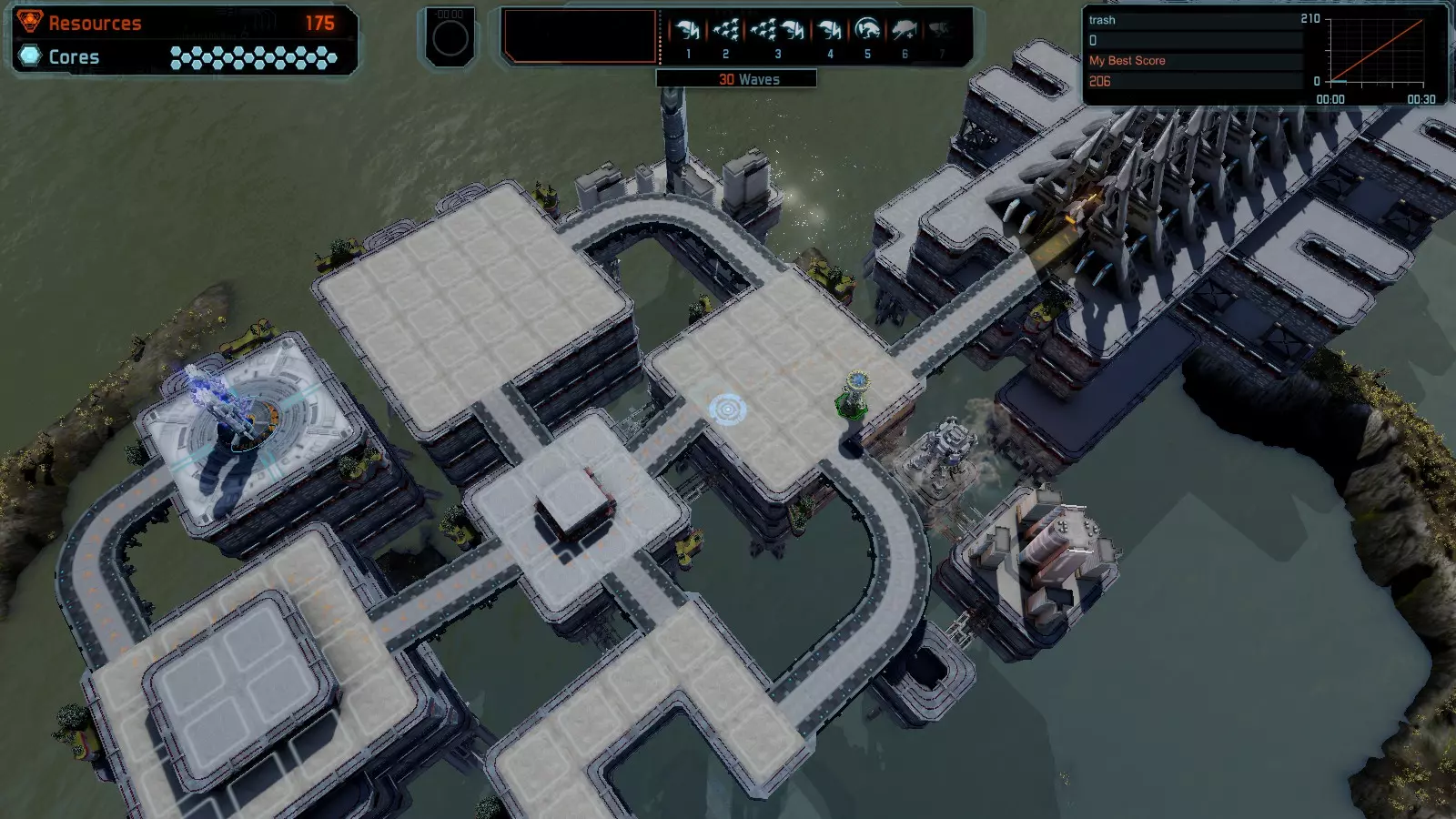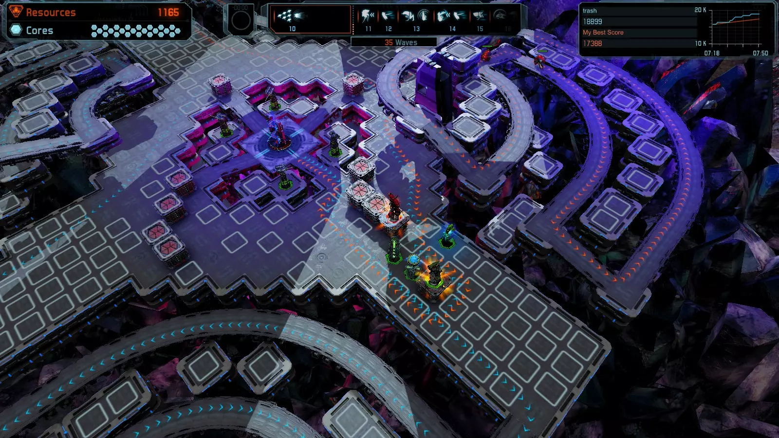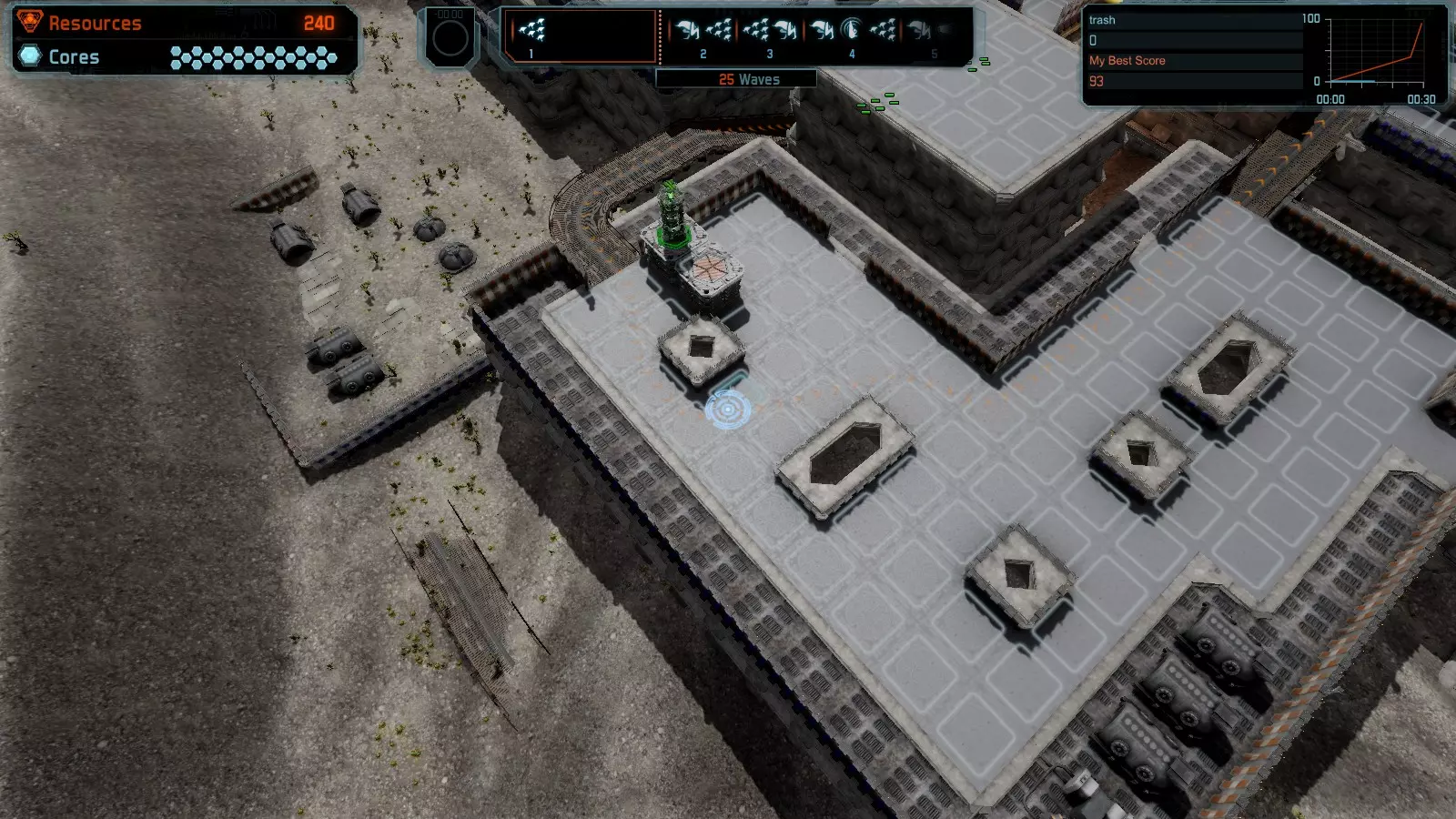 地图06:快速崩塌 本指南介绍如何在简单难度的开放模式和竞争模式下在此地图获得金牌。 此布局适用于以下所有模式并可获得金牌: 固定资源 电力中断 焦点 有限塔防 满载 子弹耗尽 核心冻结 练习 建造方案: 1座绿色时间塔 2座红色激光塔 1座带黄色震荡干扰器的增强塔 3座带红色激光干扰器的增强塔