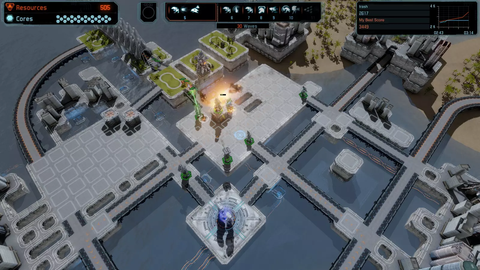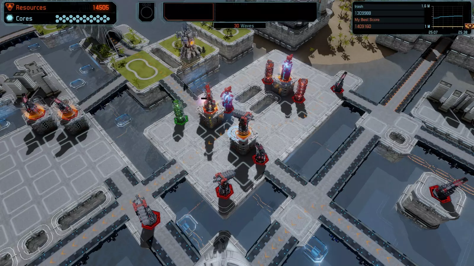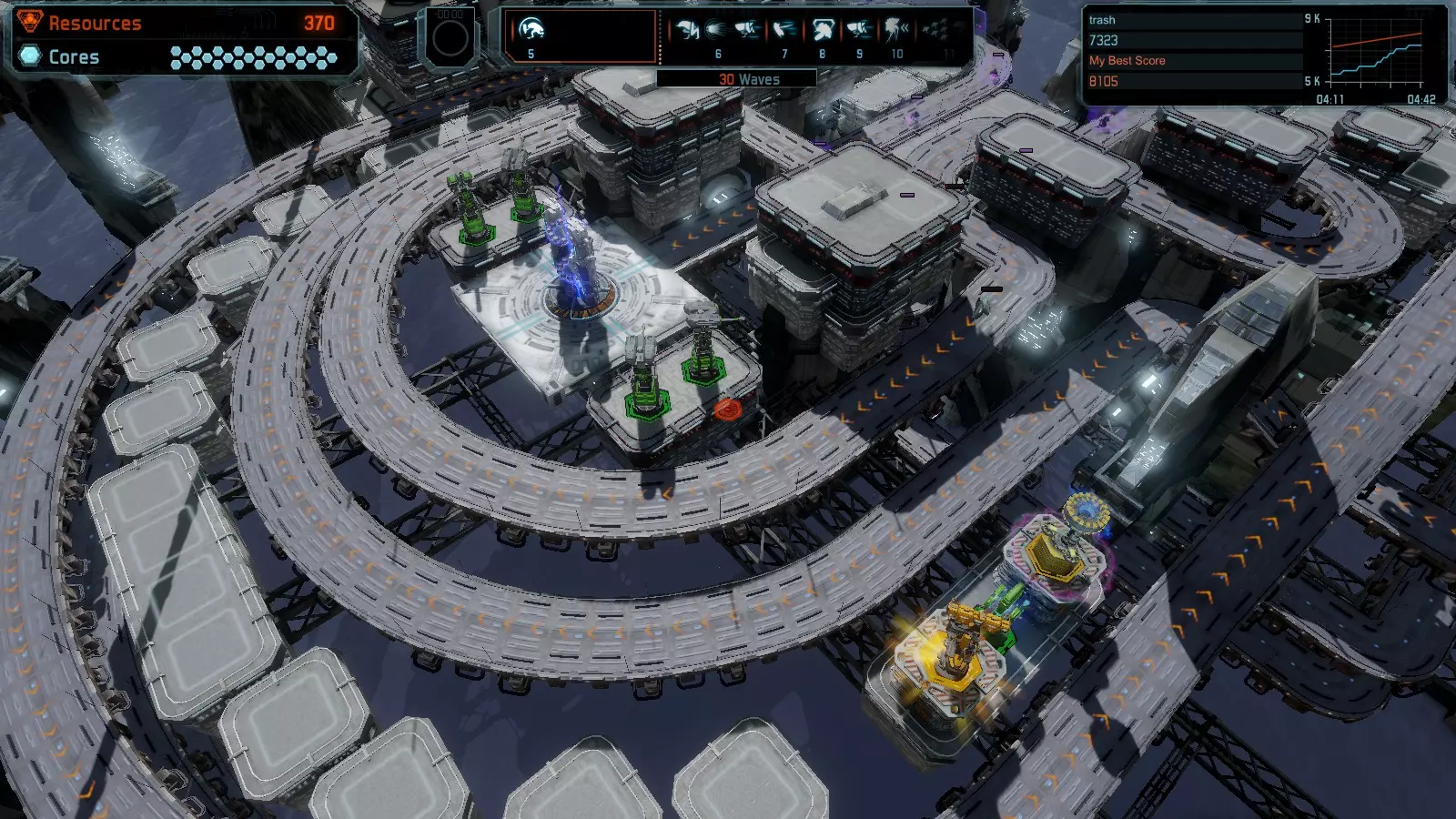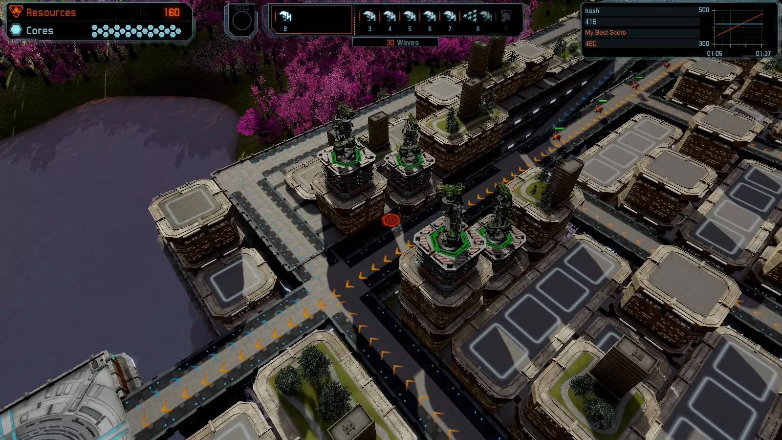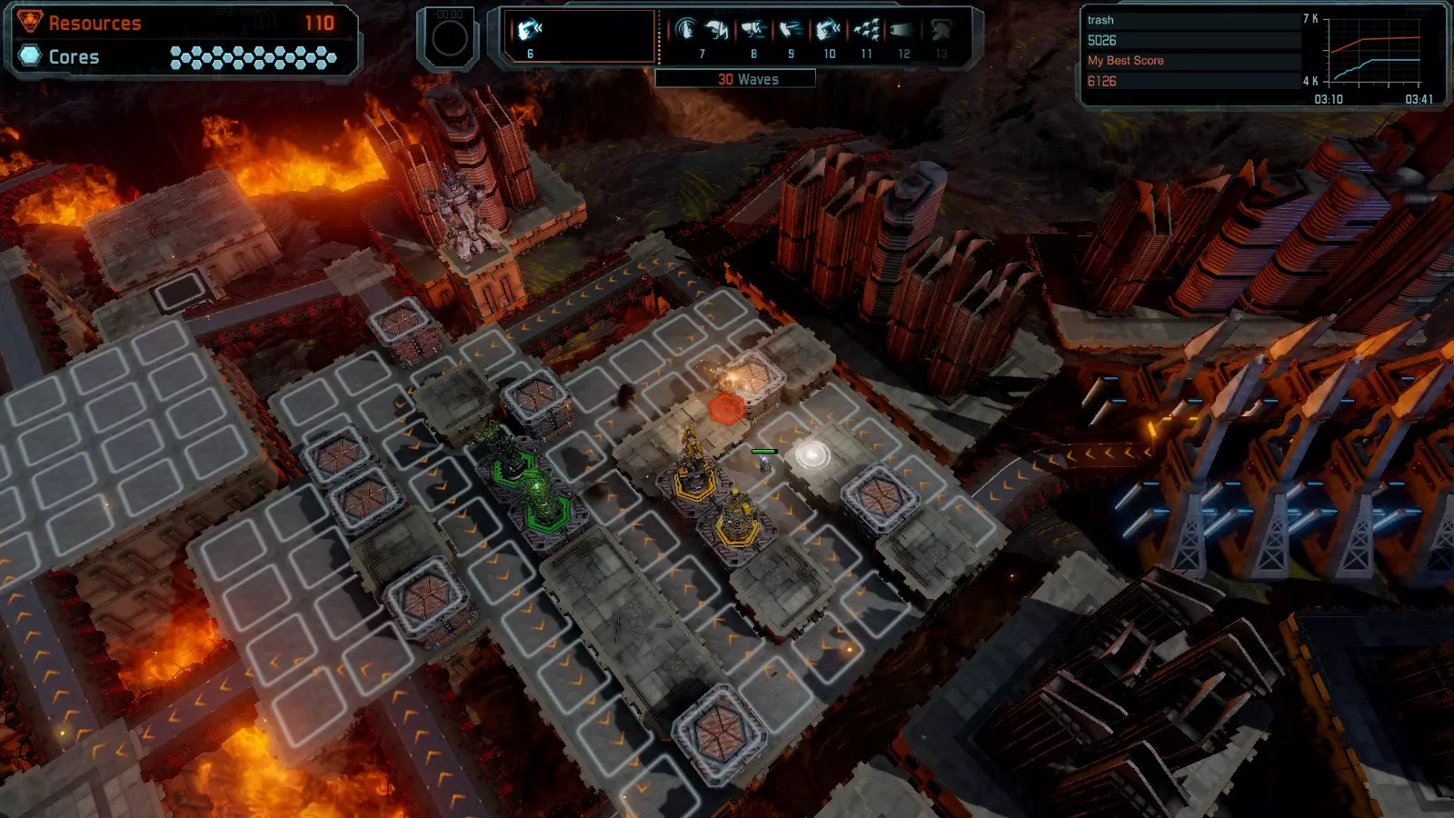 地图06:快速崩塌 本指南介绍如何在简单难度的开放模式和竞争模式下在此地图获得金牌。 此布局适用于以下所有模式并可获得金牌: 固定资源 电力中断 焦点 有限塔防 满载 子弹耗尽 核心冻结 练习 建造方案: 1座绿色时间塔 2座红色激光塔 1座带黄色震荡干扰器的增强塔 3座带红色激光干扰器的增强塔