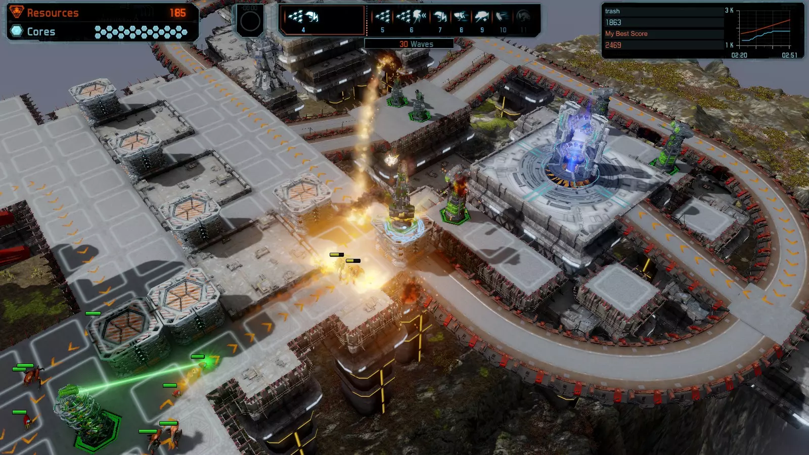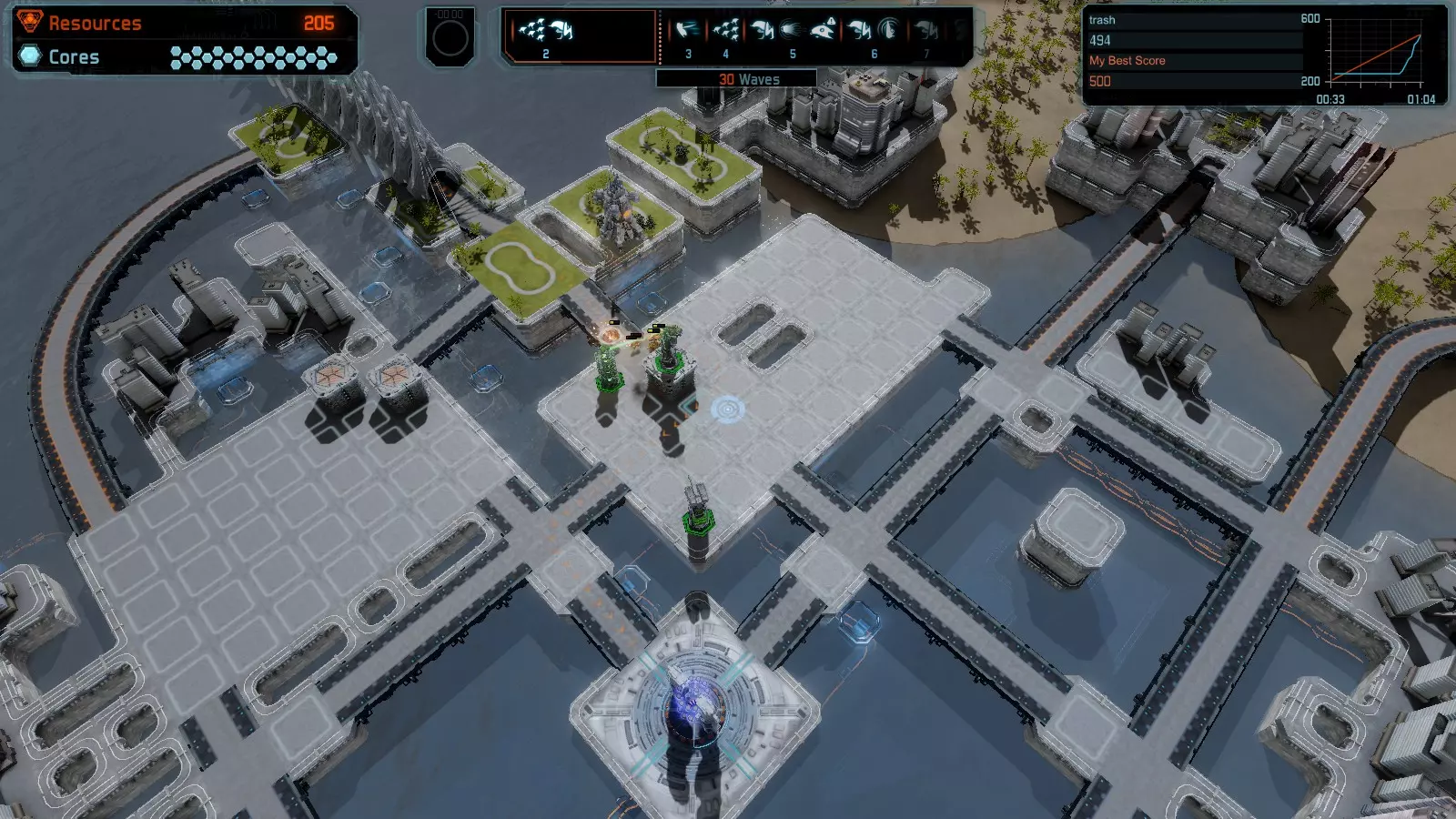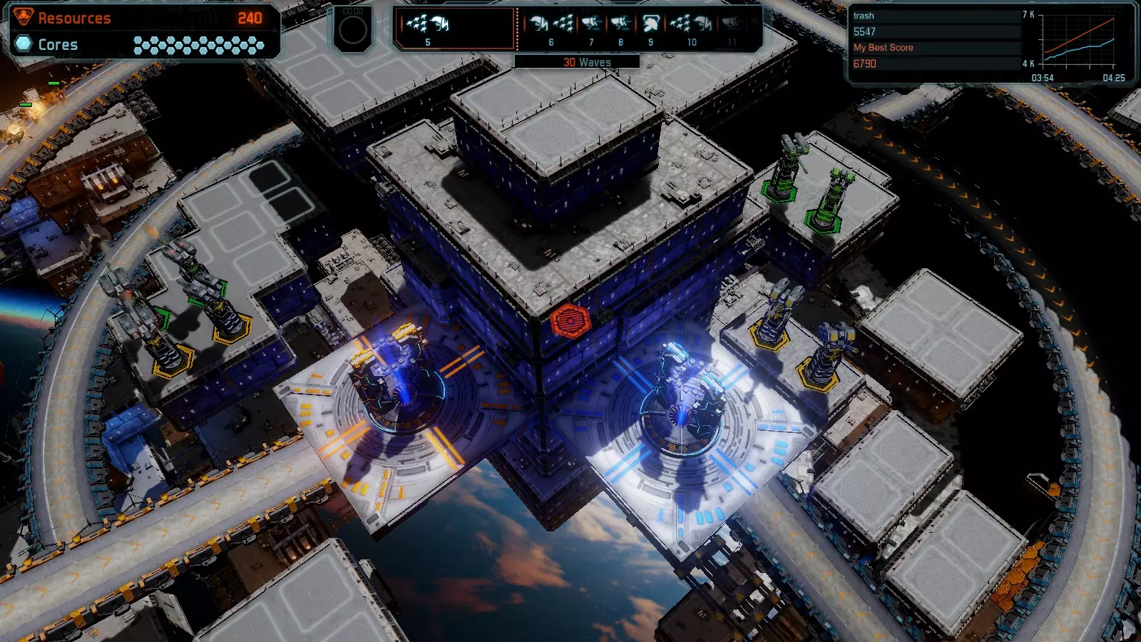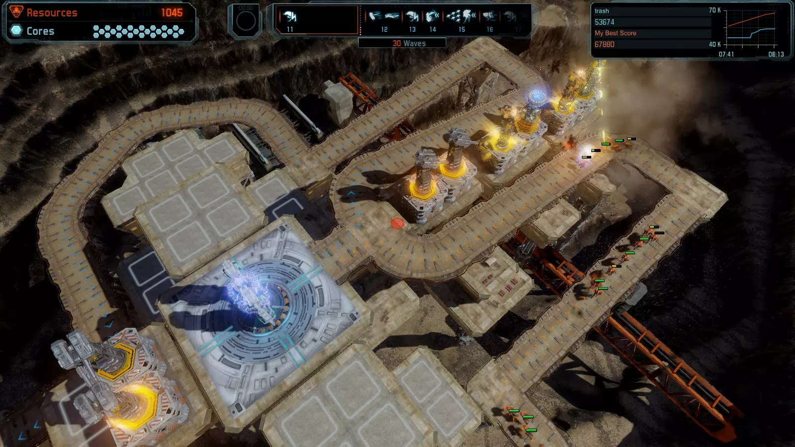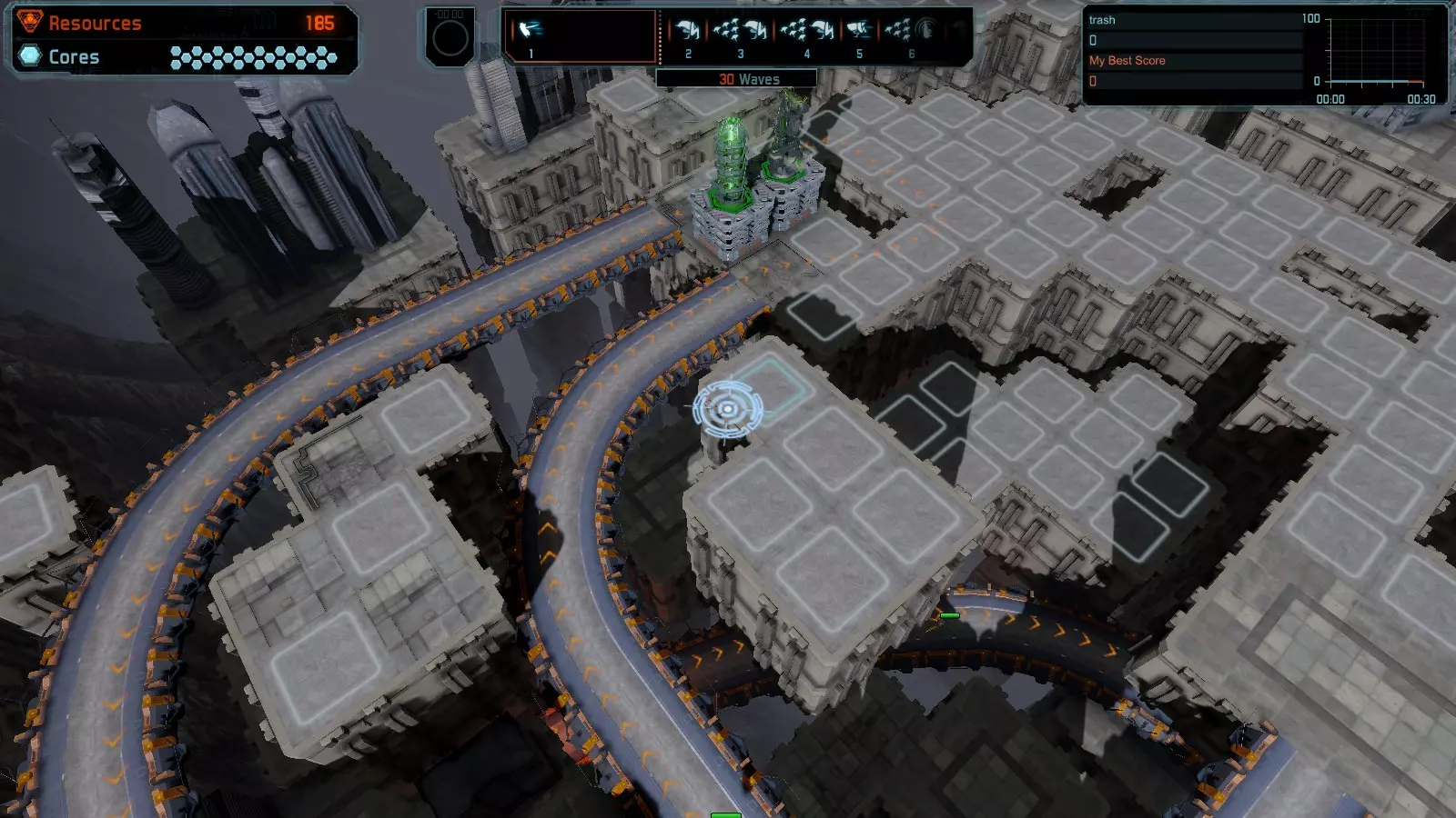 地图06:快速崩塌 本指南介绍如何在简单难度的开放模式和竞争模式下在此地图获得金牌。 此布局适用于以下所有模式并可获得金牌: 固定资源 电力中断 焦点 有限塔防 满载 子弹耗尽 核心冻结 练习 建造方案: 1座绿色时间塔 2座红色激光塔 1座带黄色震荡干扰器的增强塔 3座带红色激光干扰器的增强塔