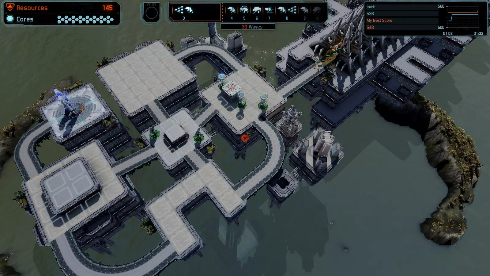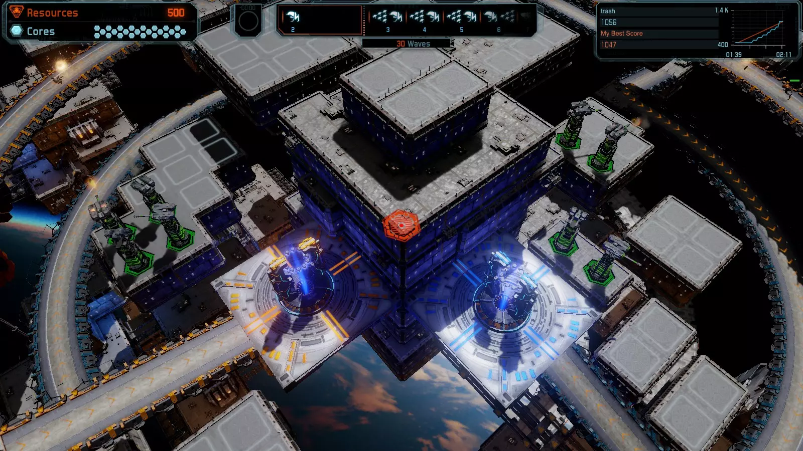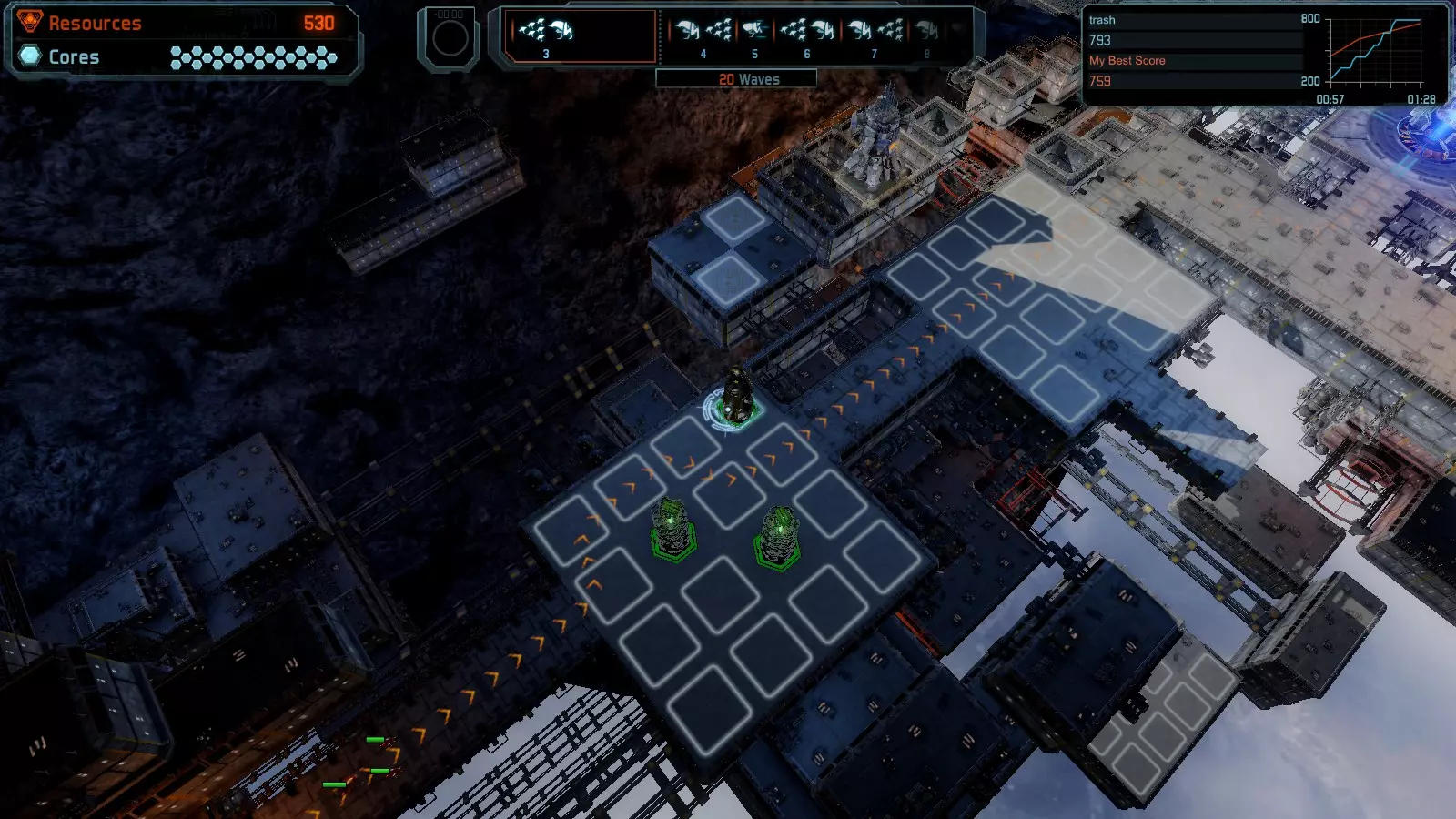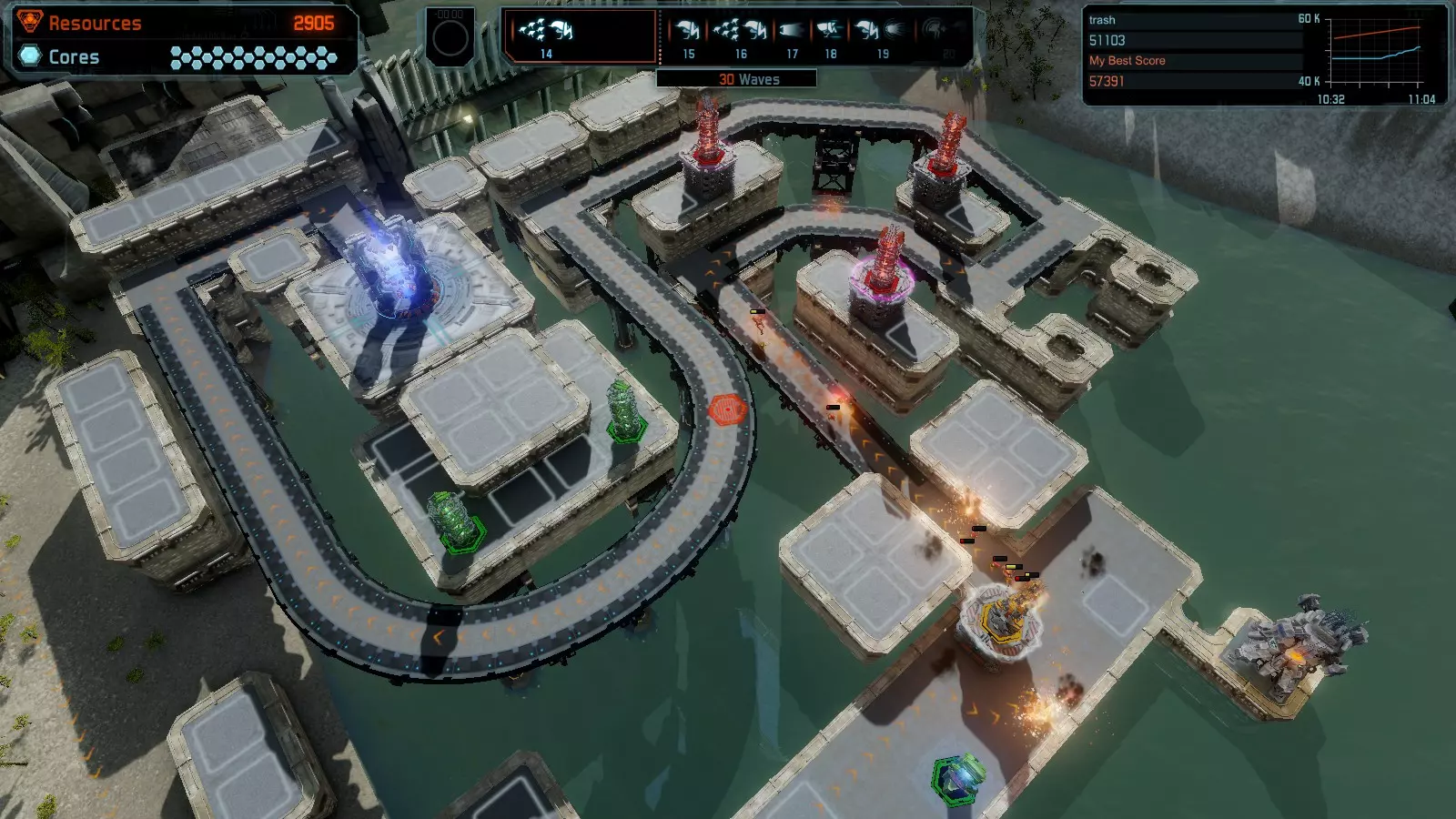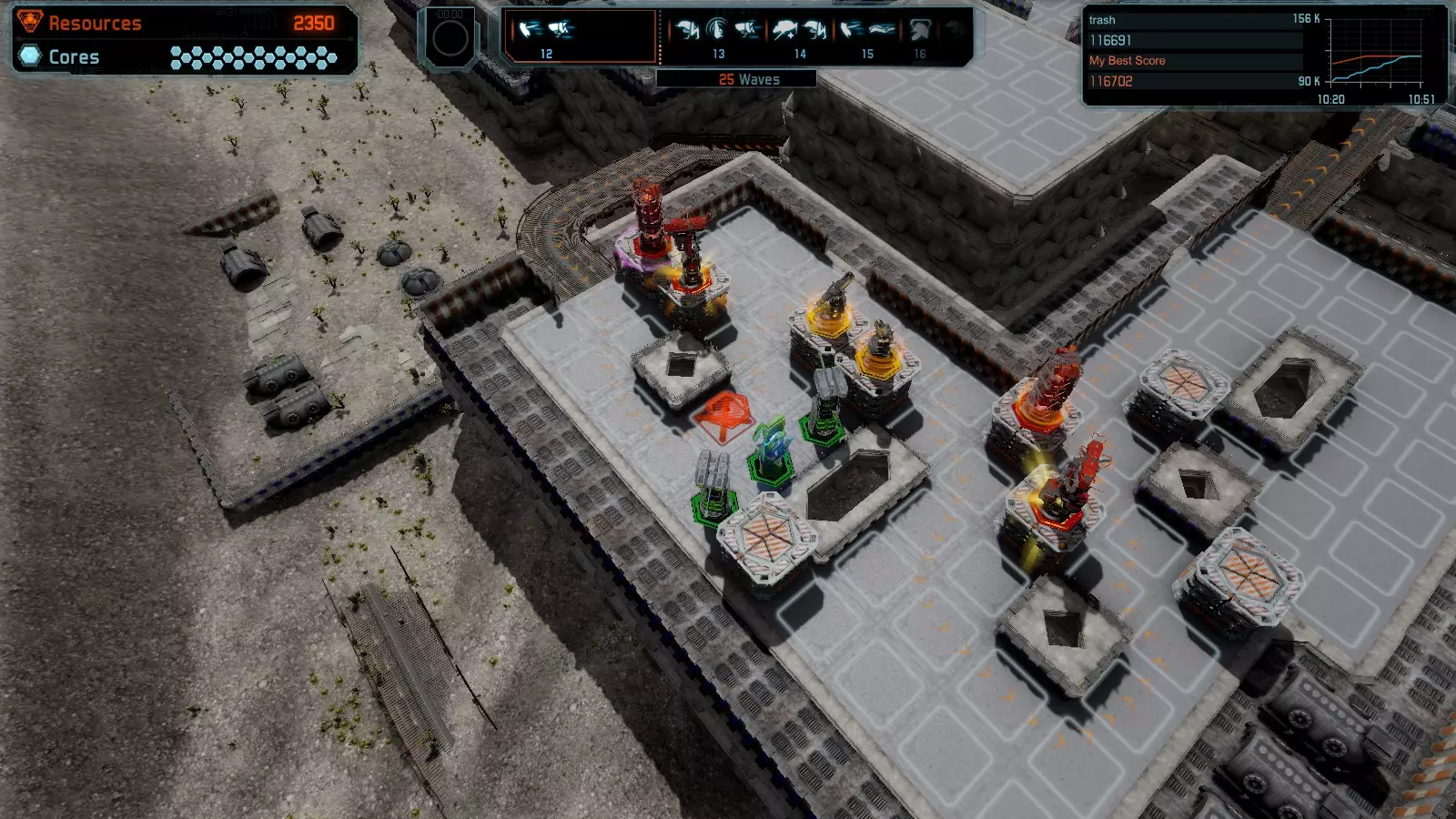 地图06:快速崩塌 本指南介绍如何在简单难度的开放模式和竞争模式下在此地图获得金牌。 此布局适用于以下所有模式并可获得金牌: 固定资源 电力中断 焦点 有限塔防 满载 子弹耗尽 核心冻结 练习 建造方案: 1座绿色时间塔 2座红色激光塔 1座带黄色震荡干扰器的增强塔 3座带红色激光干扰器的增强塔