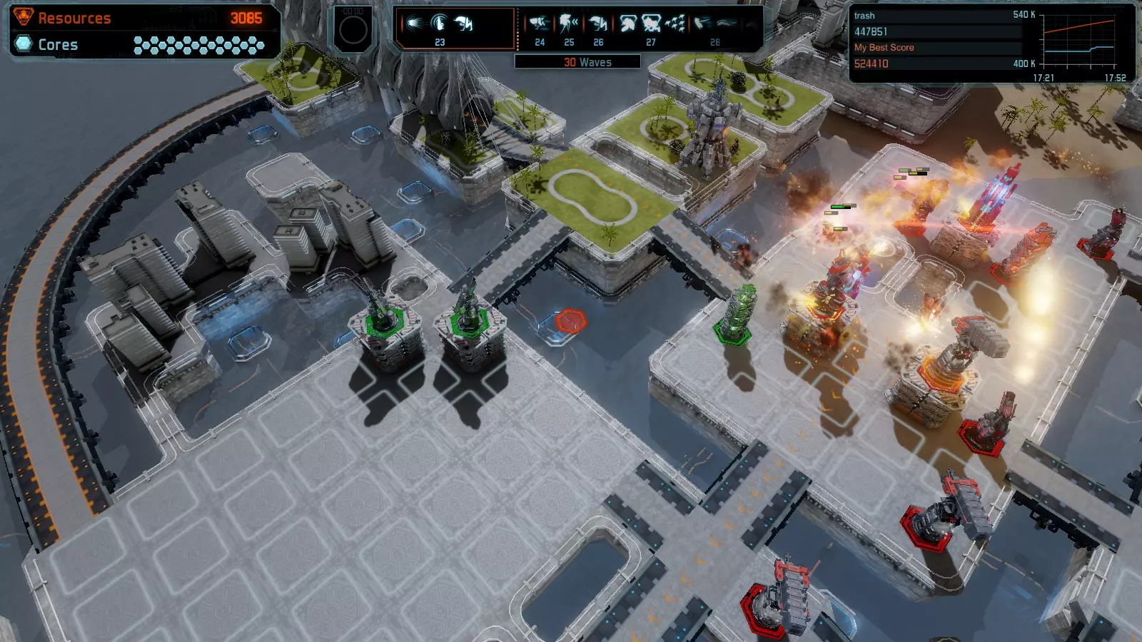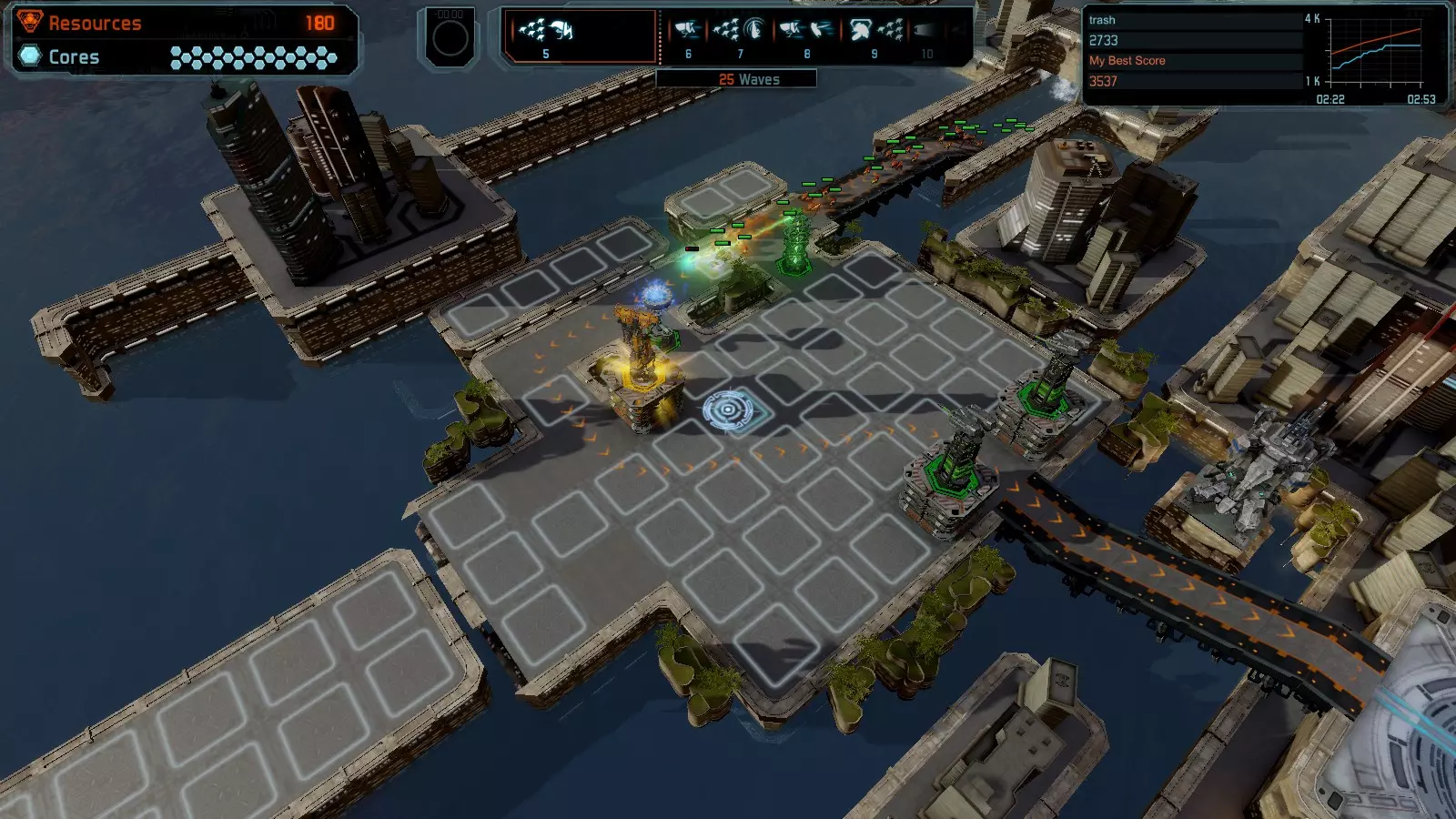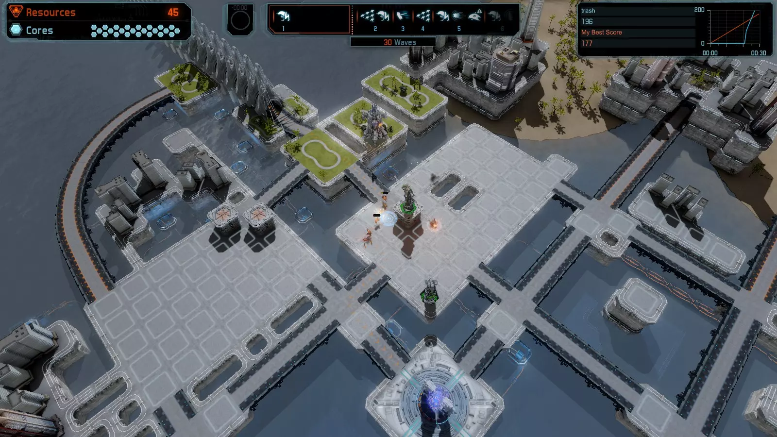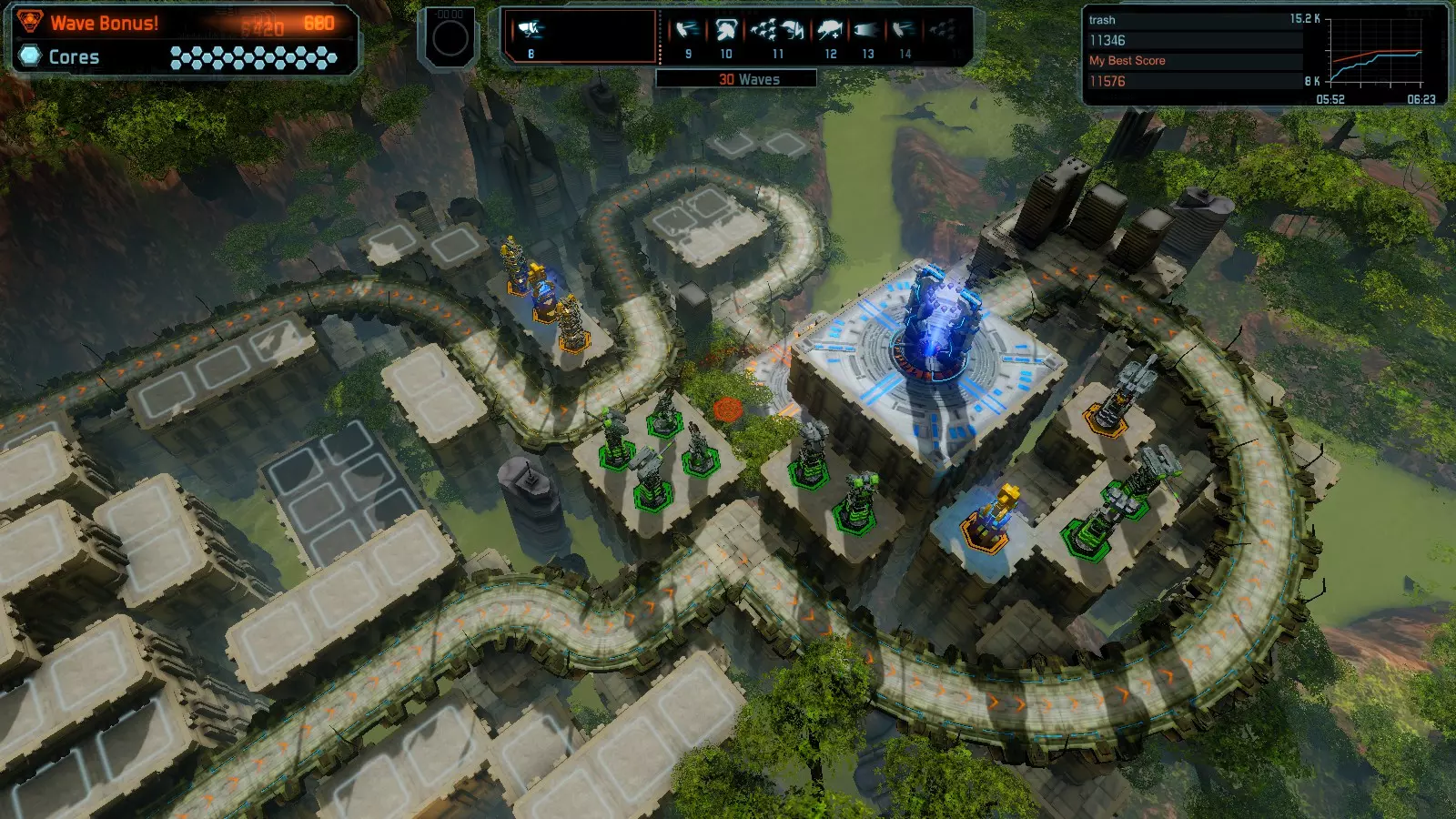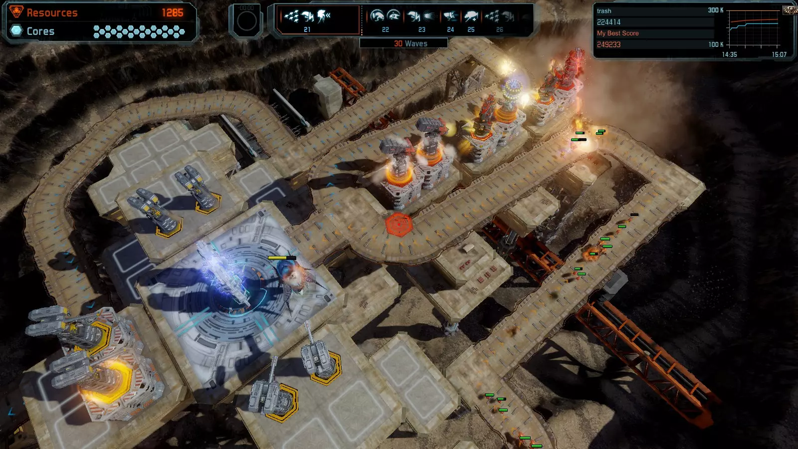地图06:快速崩塌 本指南介绍如何在简单难度的开放模式和竞争模式下在此地图获得金牌。 此布局适用于以下所有模式并可获得金牌: 固定资源 电力中断 焦点 有限塔防 满载 子弹耗尽 核心冻结 练习 建造方案: 1座绿色时间塔 2座红色激光塔 1座带黄色震荡干扰器的增强塔 3座带红色激光干扰器的增强塔
