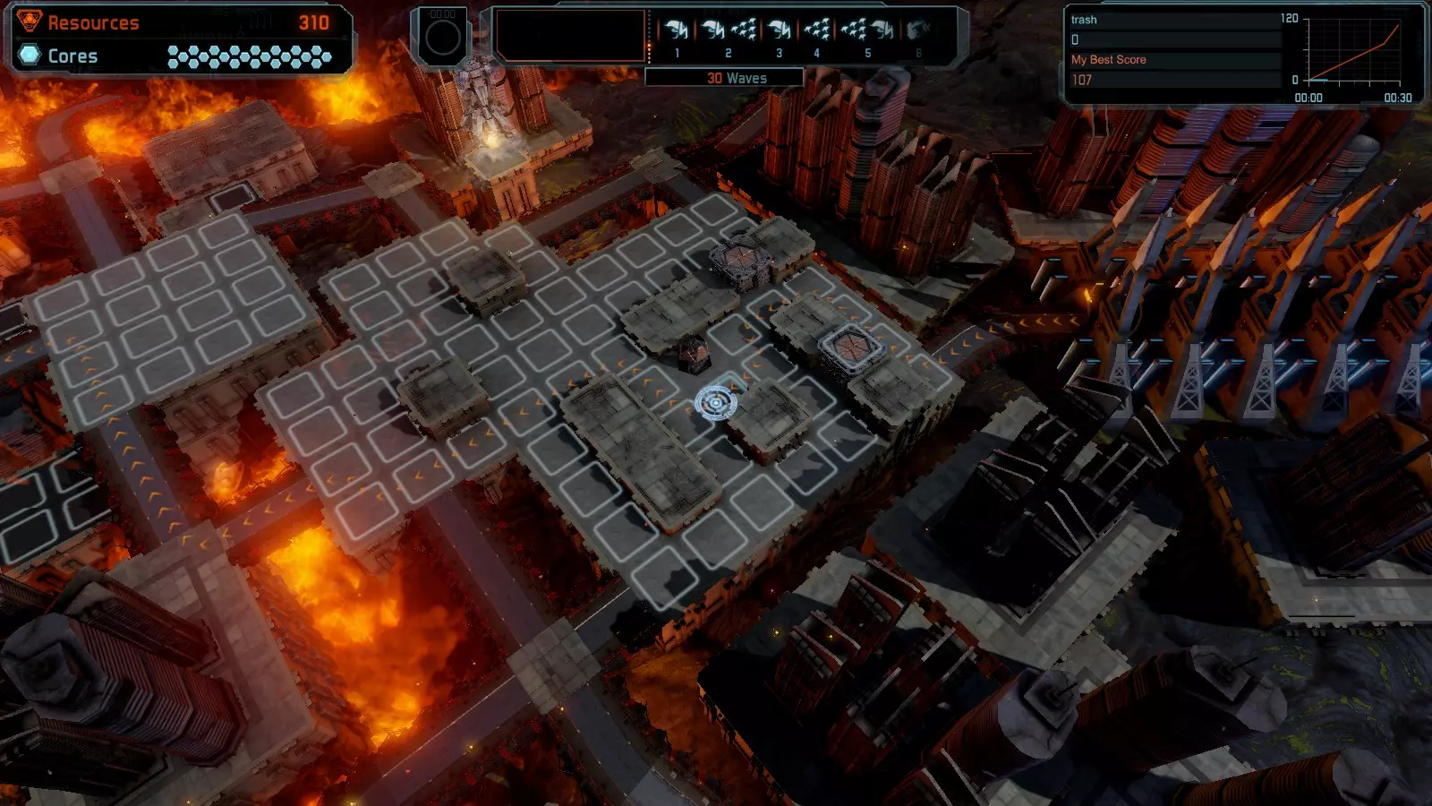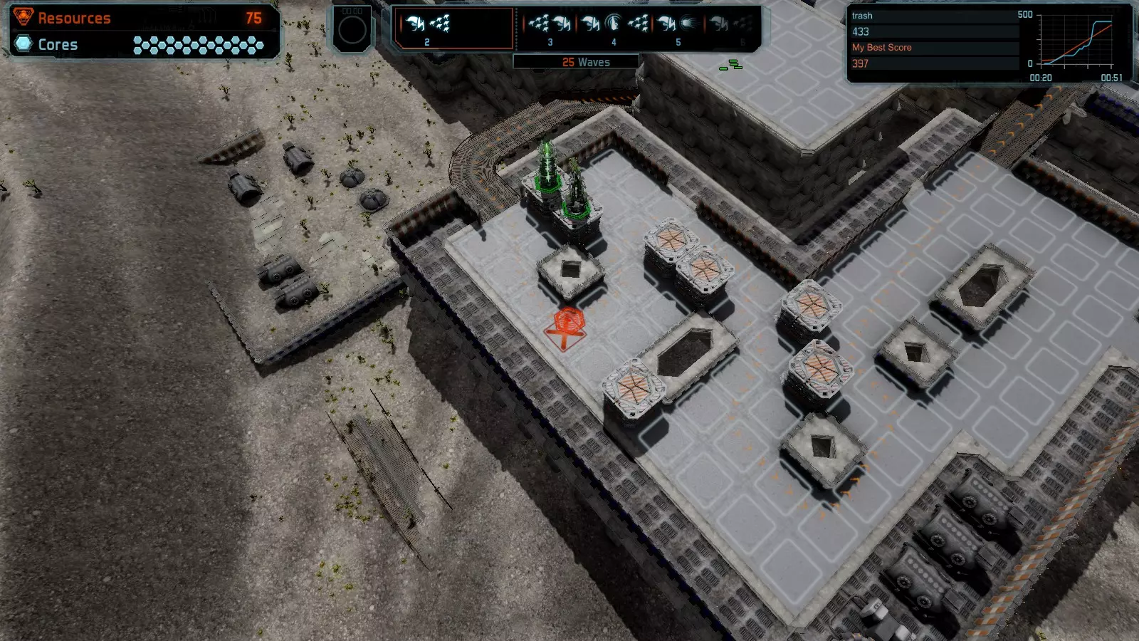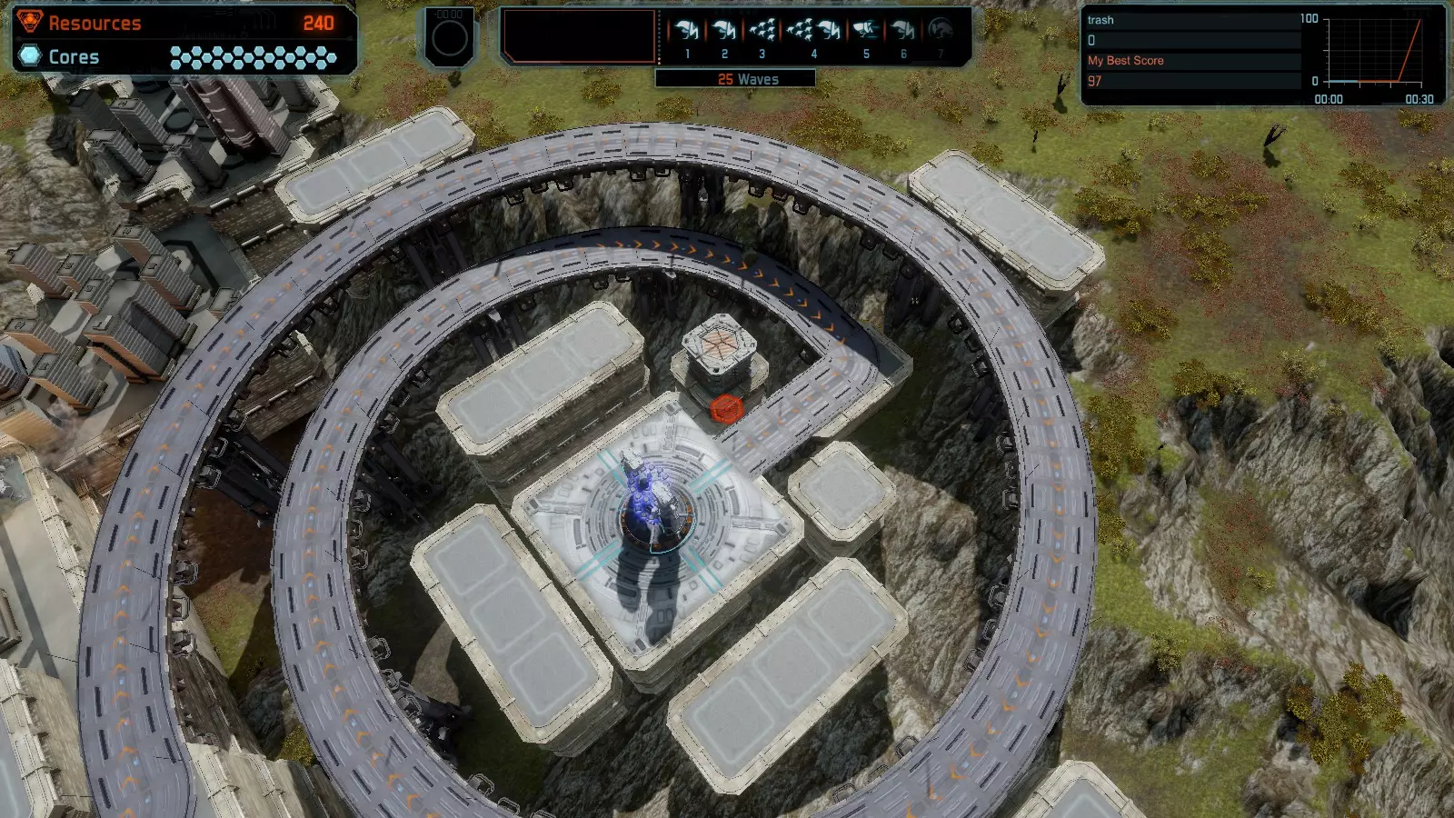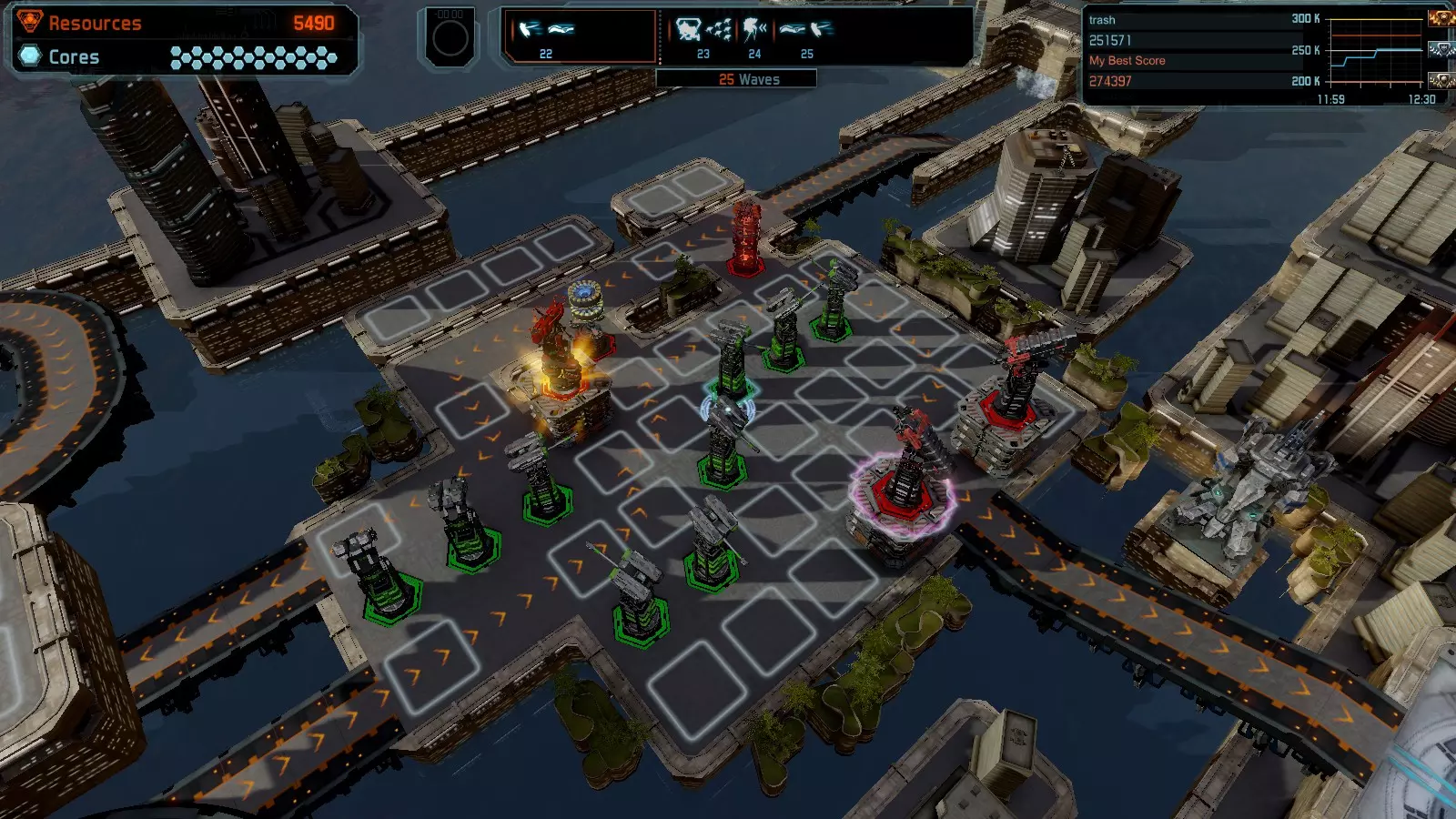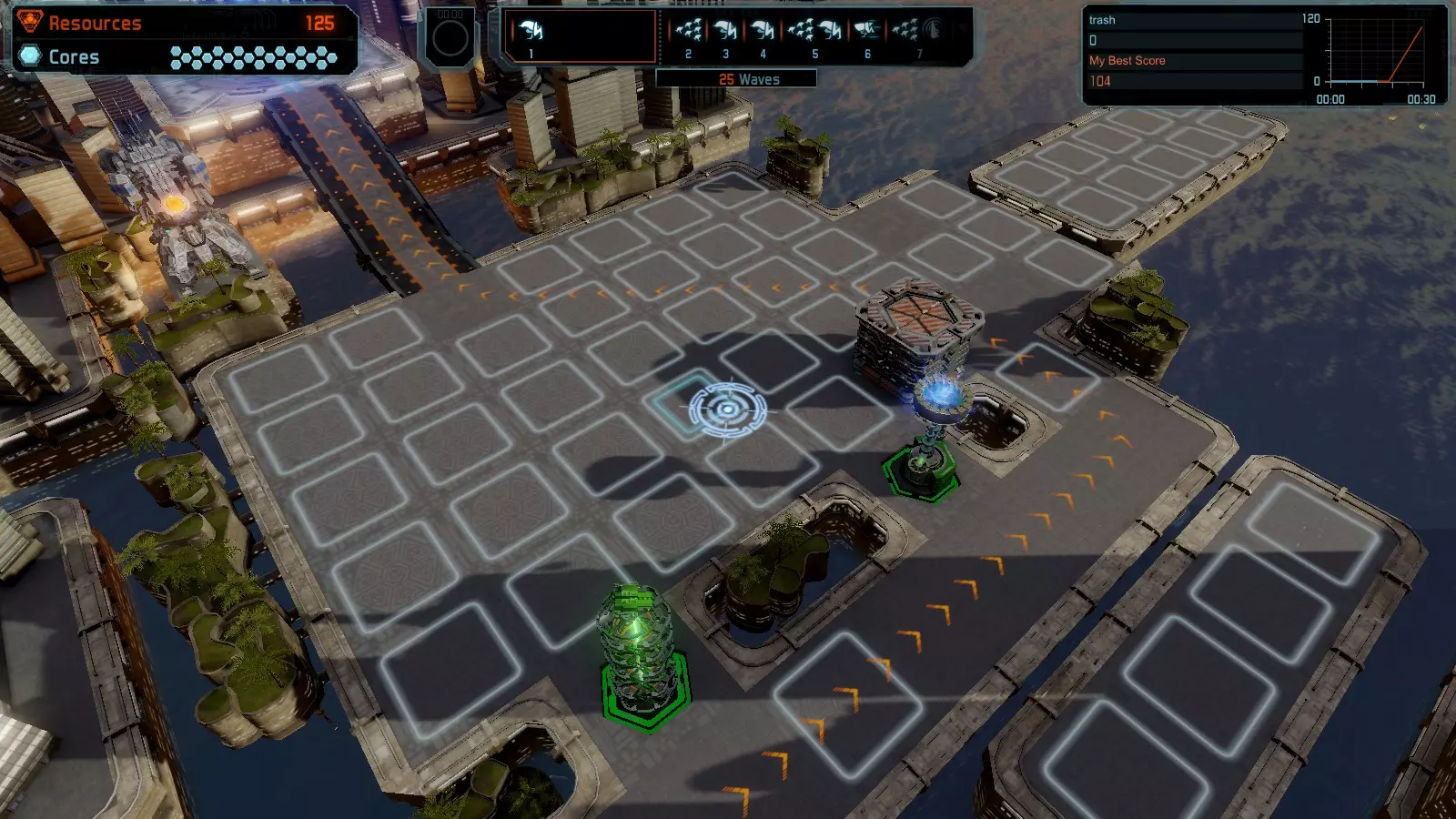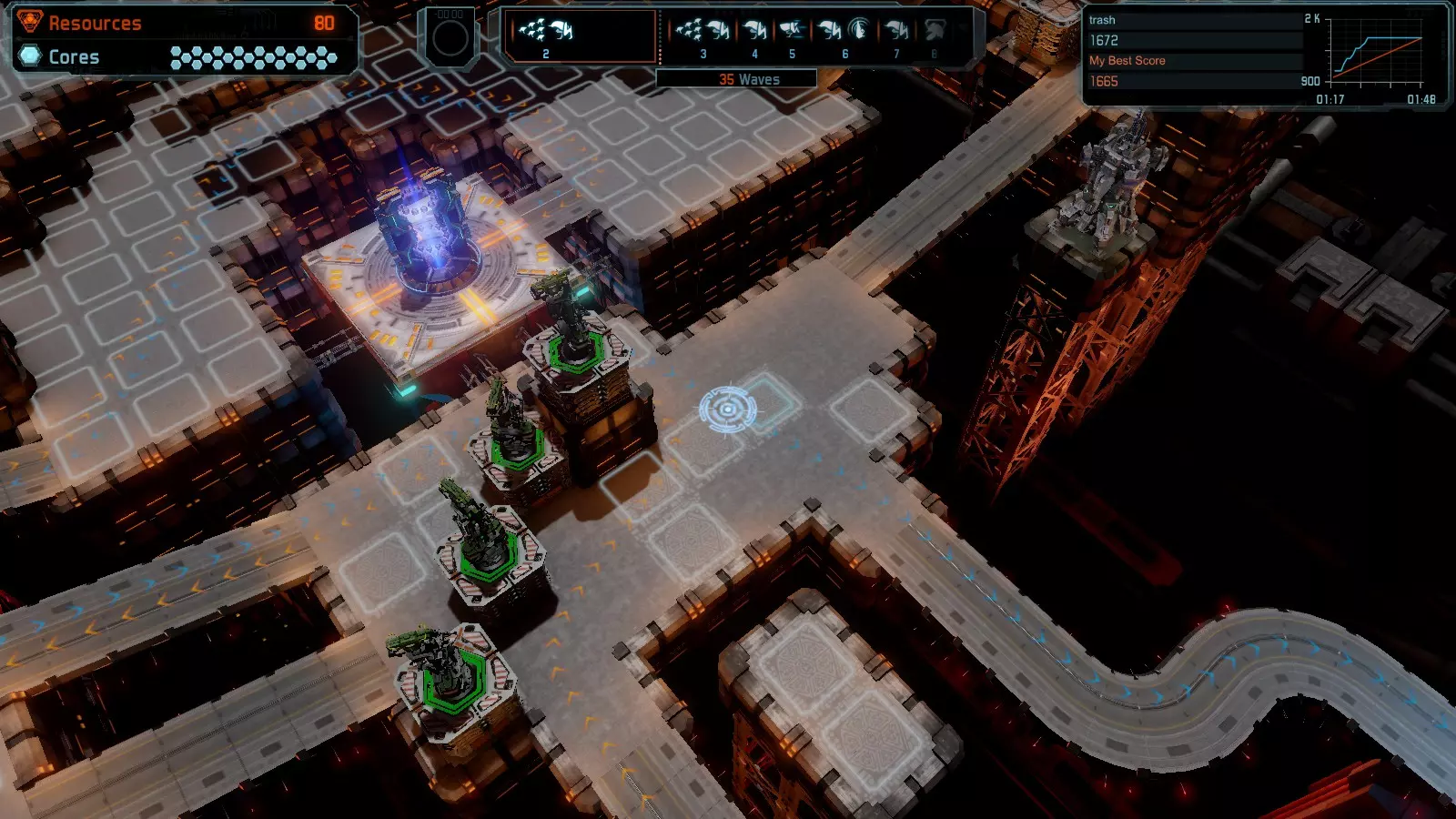 地图06:快速崩塌 本指南介绍如何在简单难度的开放模式和竞争模式下在此地图获得金牌。 此布局适用于以下所有模式并可获得金牌: 固定资源 电力中断 焦点 有限塔防 满载 子弹耗尽 核心冻结 练习 建造方案: 1座绿色时间塔 2座红色激光塔 1座带黄色震荡干扰器的增强塔 3座带红色激光干扰器的增强塔