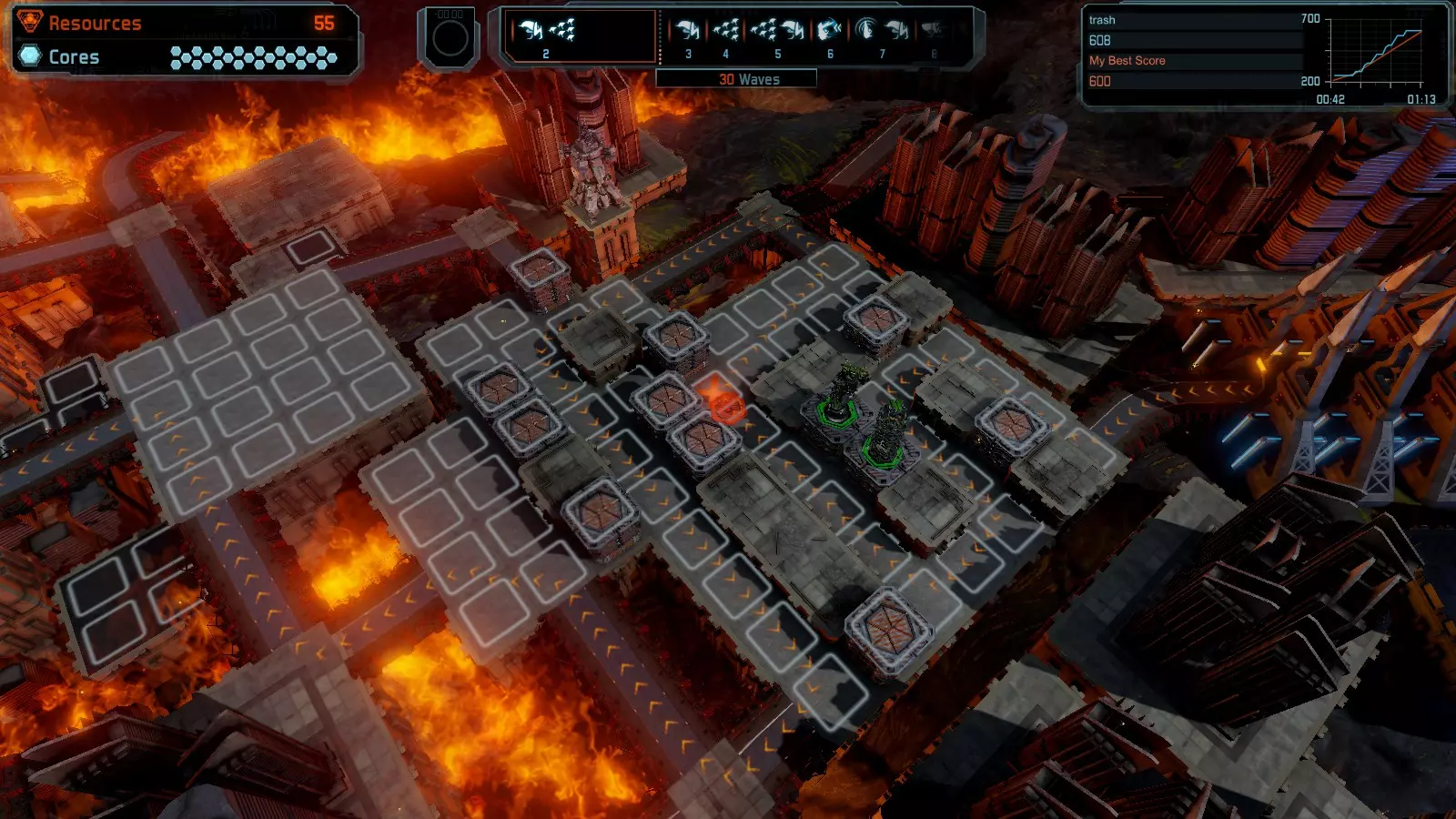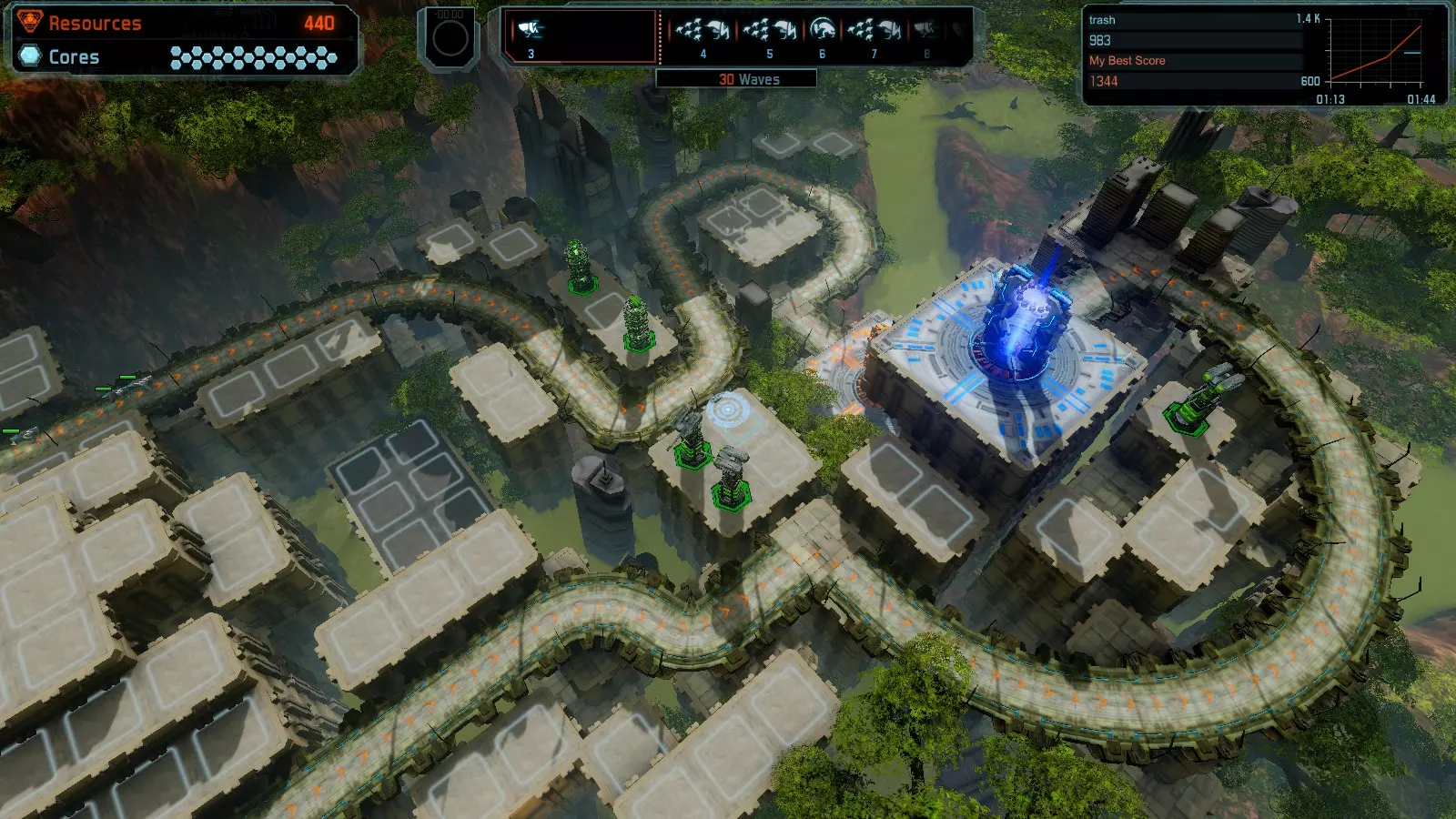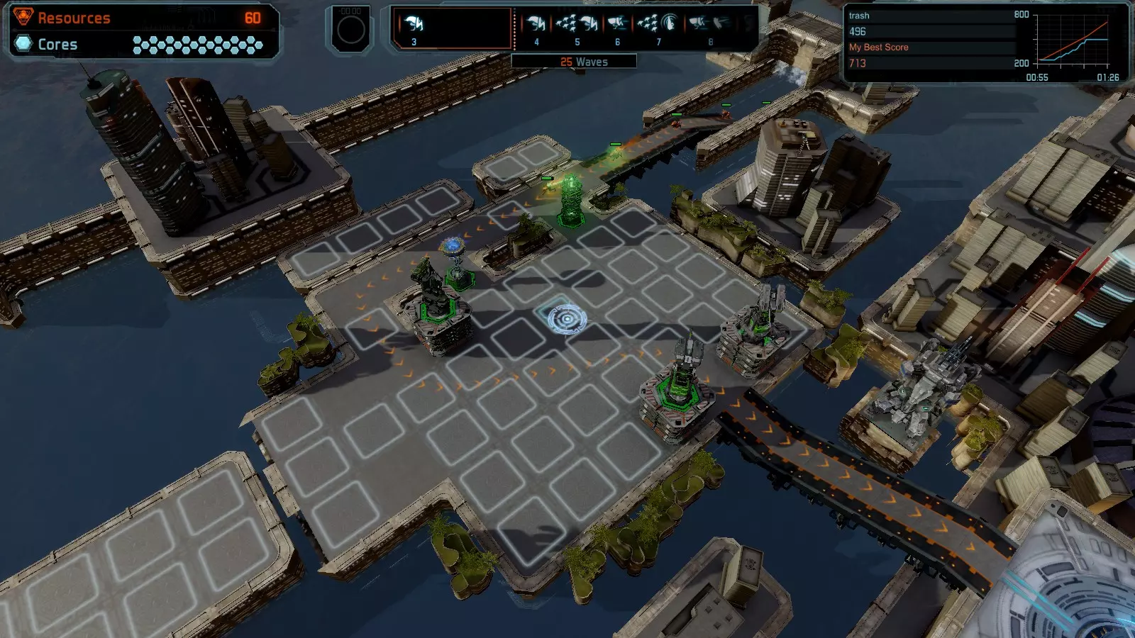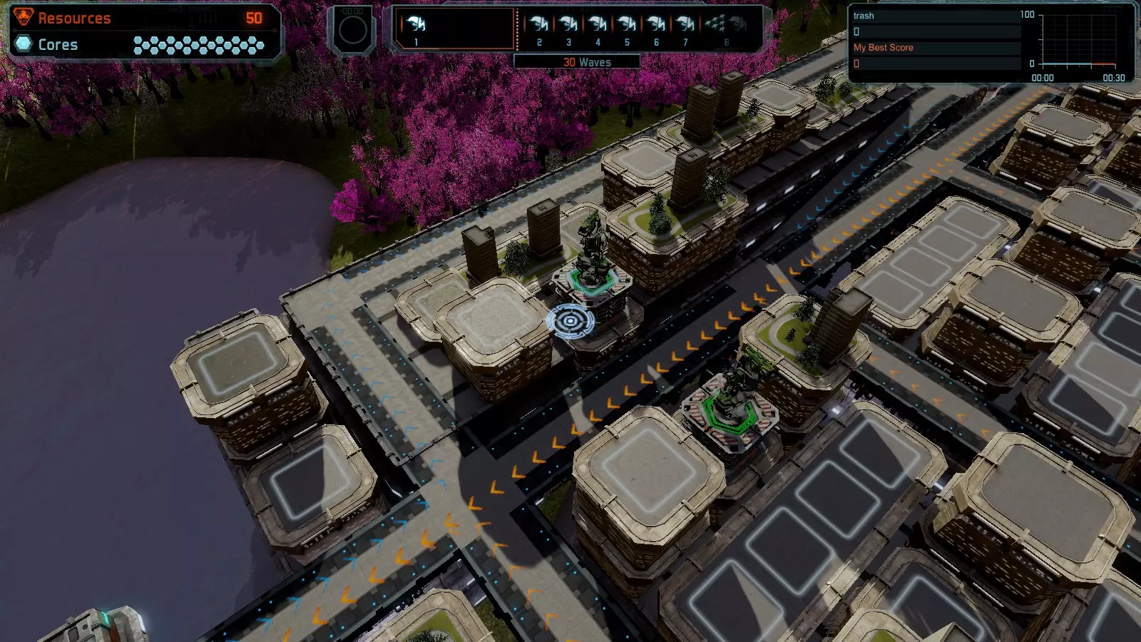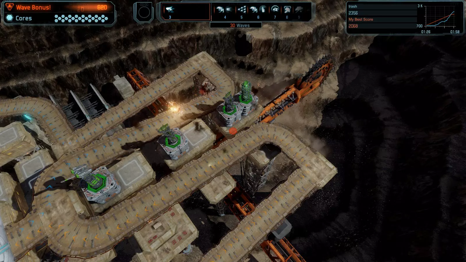 地图06:快速崩塌 本指南介绍如何在简单难度的开放模式和竞争模式下在此地图获得金牌。 此布局适用于以下所有模式并可获得金牌: 固定资源 电力中断 焦点 有限塔防 满载 子弹耗尽 核心冻结 练习 建造方案: 1座绿色时间塔 2座红色激光塔 1座带黄色震荡干扰器的增强塔 3座带红色激光干扰器的增强塔