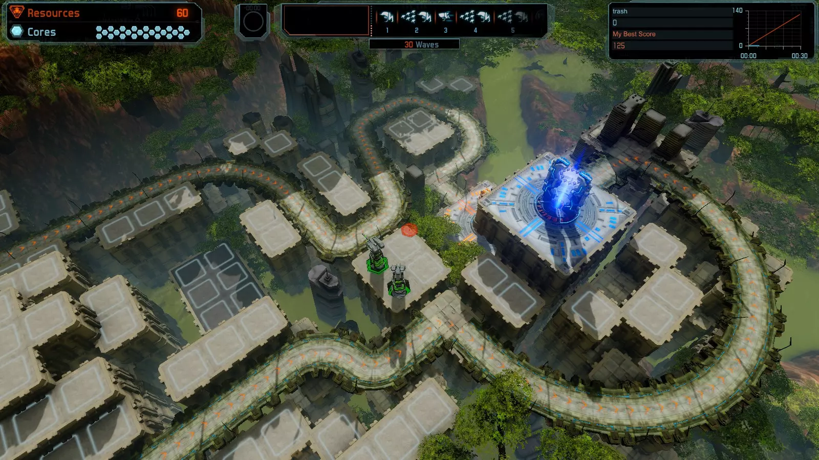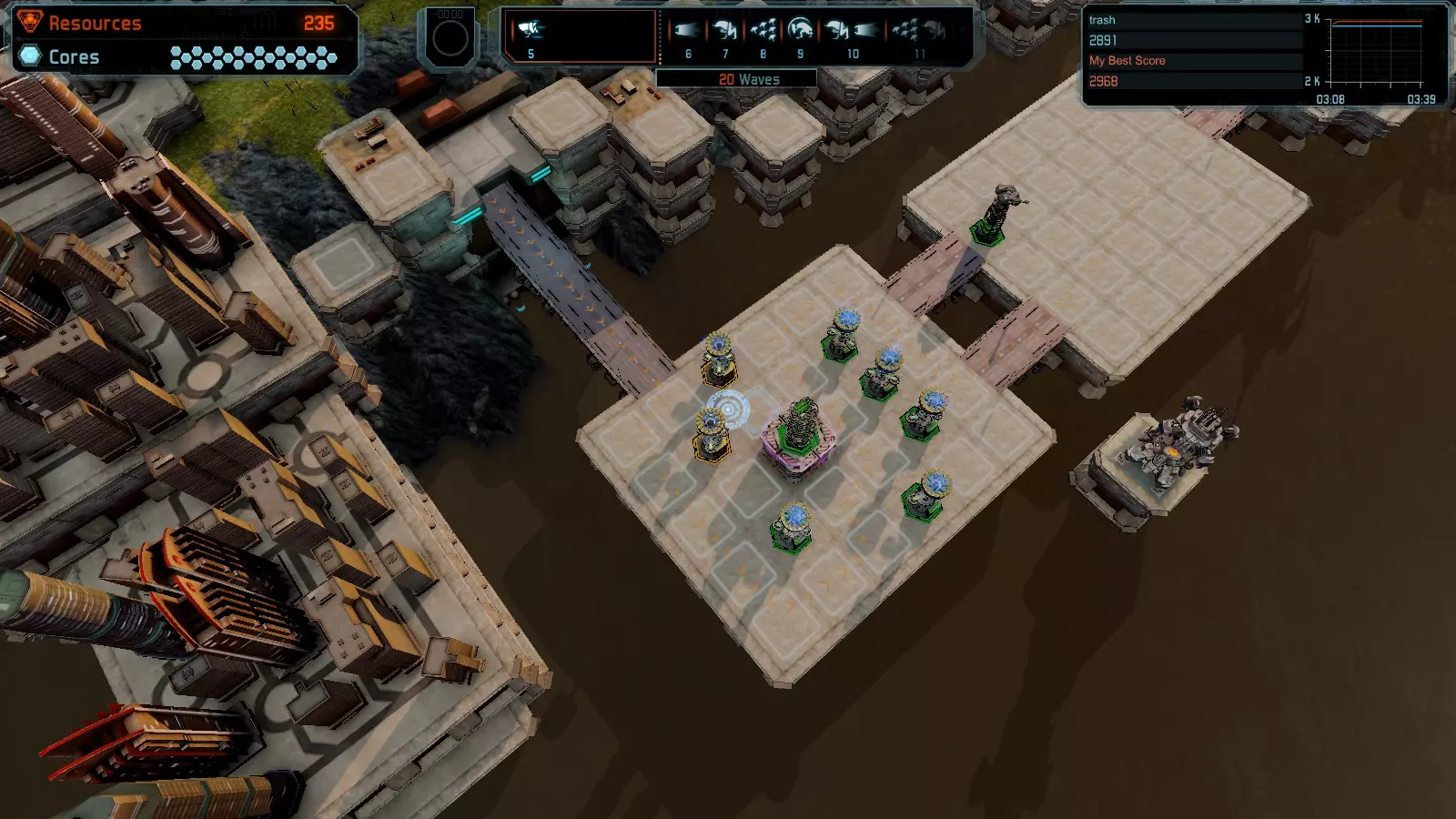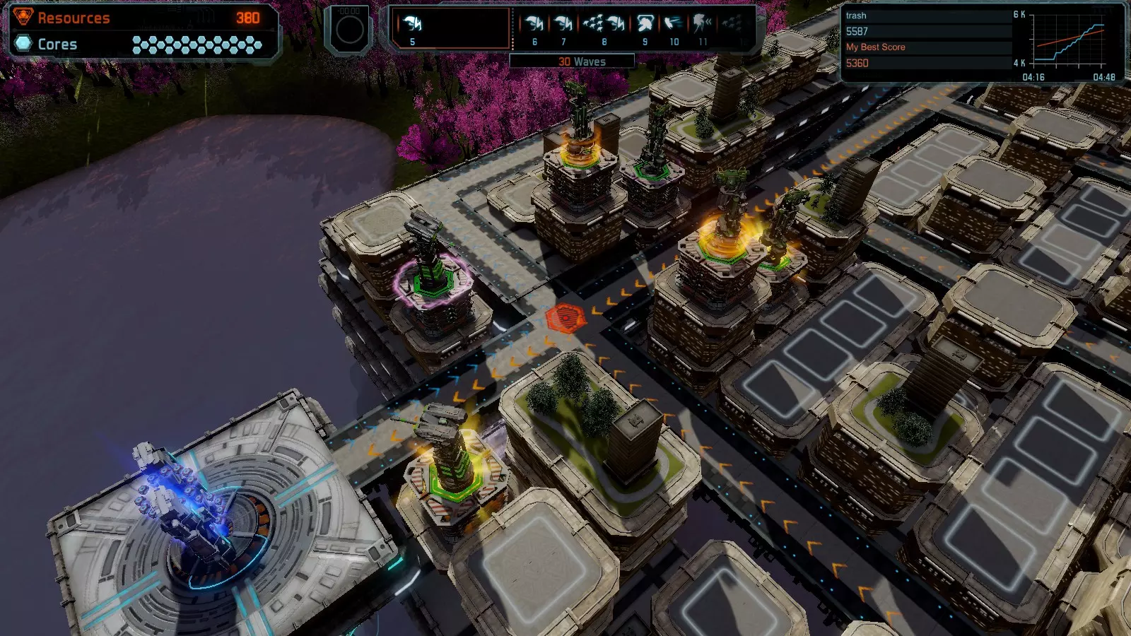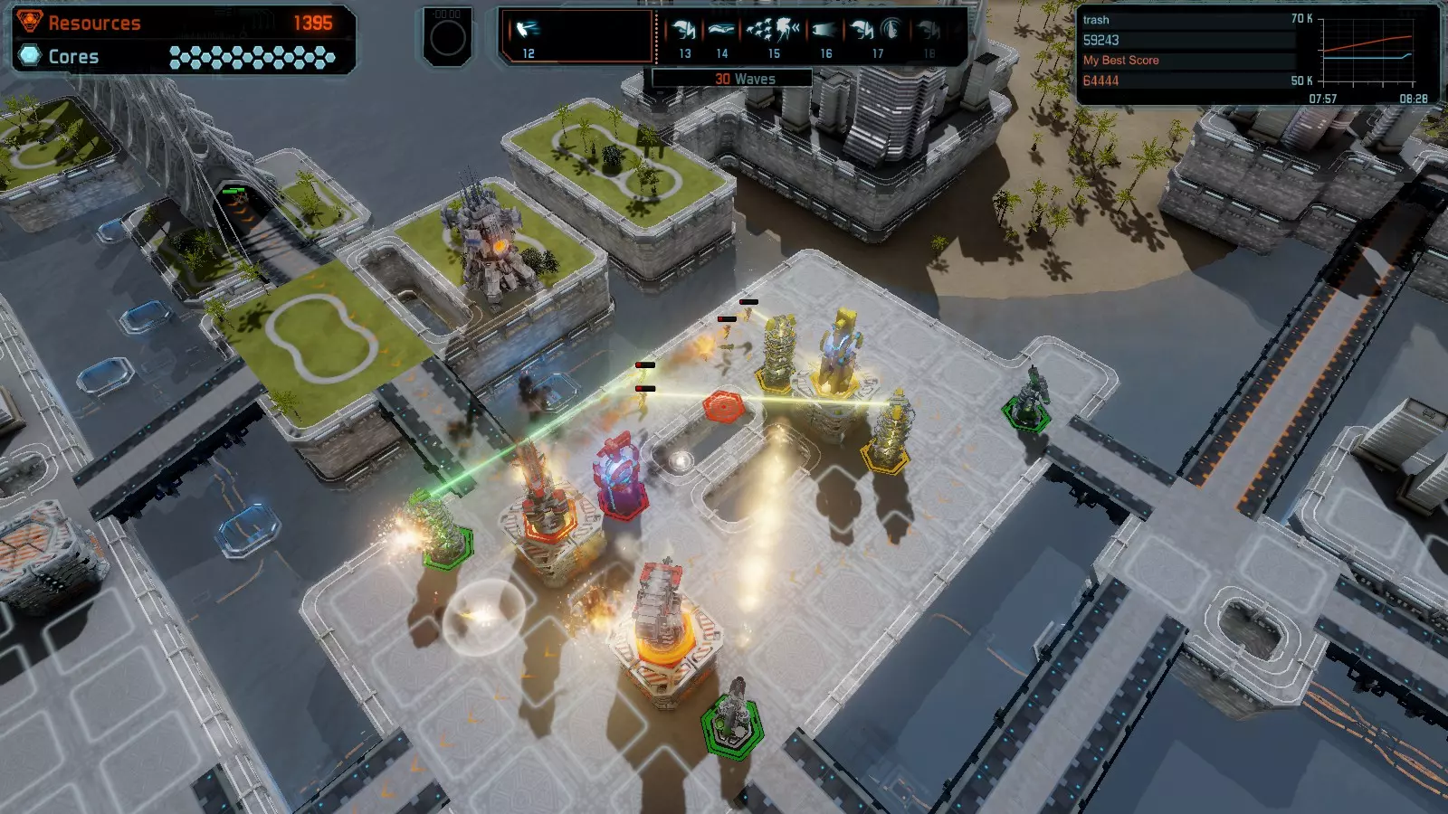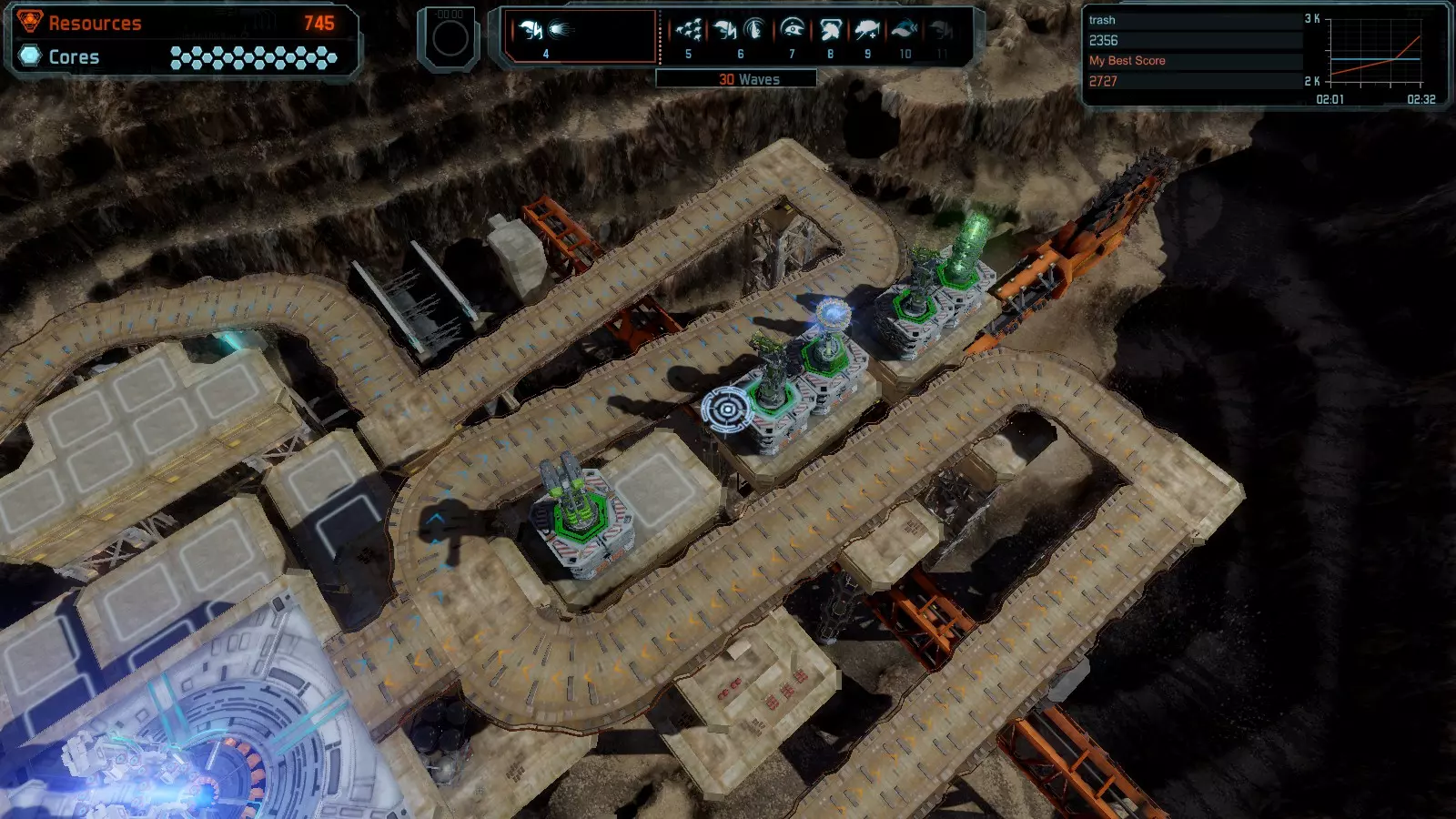 地图06:快速崩塌 本指南介绍如何在简单难度的开放模式和竞争模式下在此地图获得金牌。 此布局适用于以下所有模式并可获得金牌: 固定资源 电力中断 焦点 有限塔防 满载 子弹耗尽 核心冻结 练习 建造方案: 1座绿色时间塔 2座红色激光塔 1座带黄色震荡干扰器的增强塔 3座带红色激光干扰器的增强塔