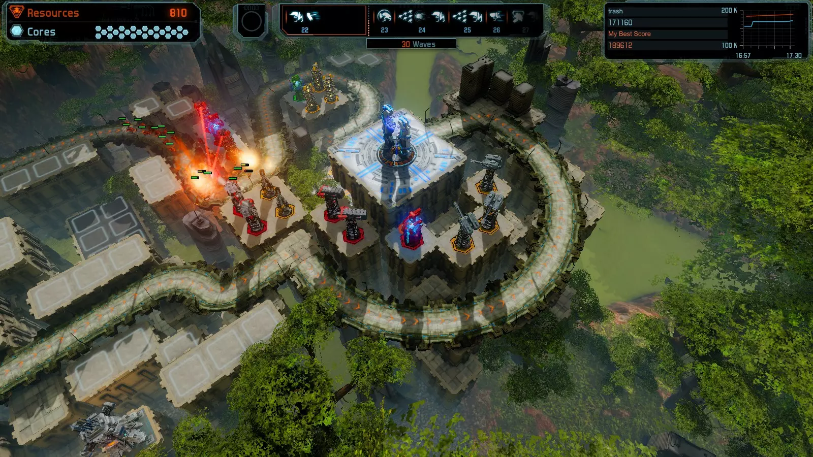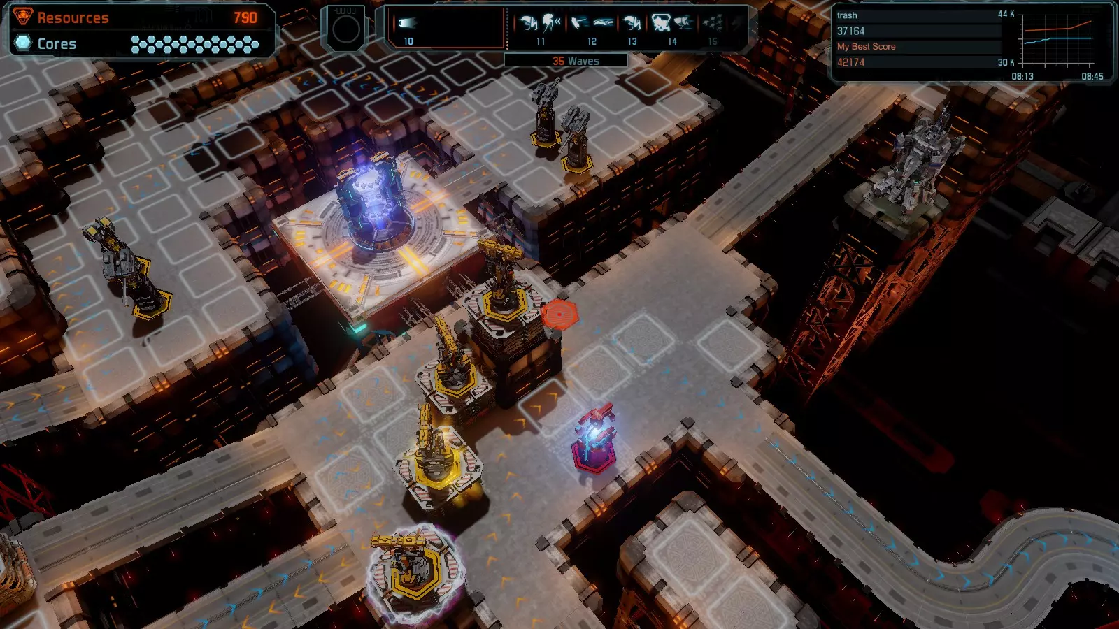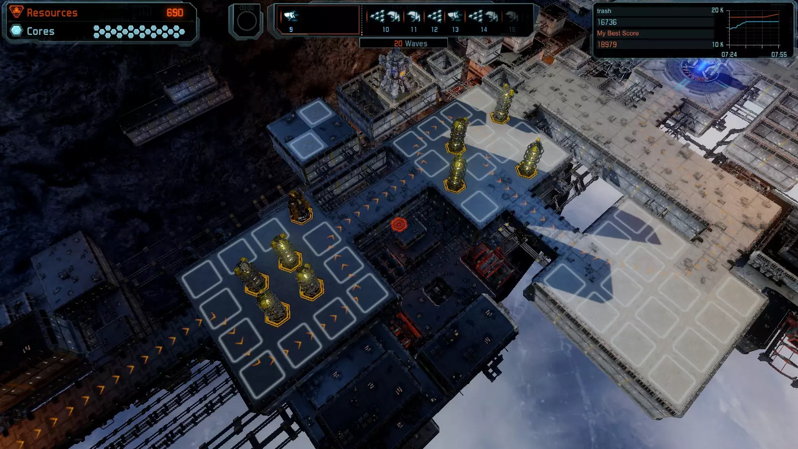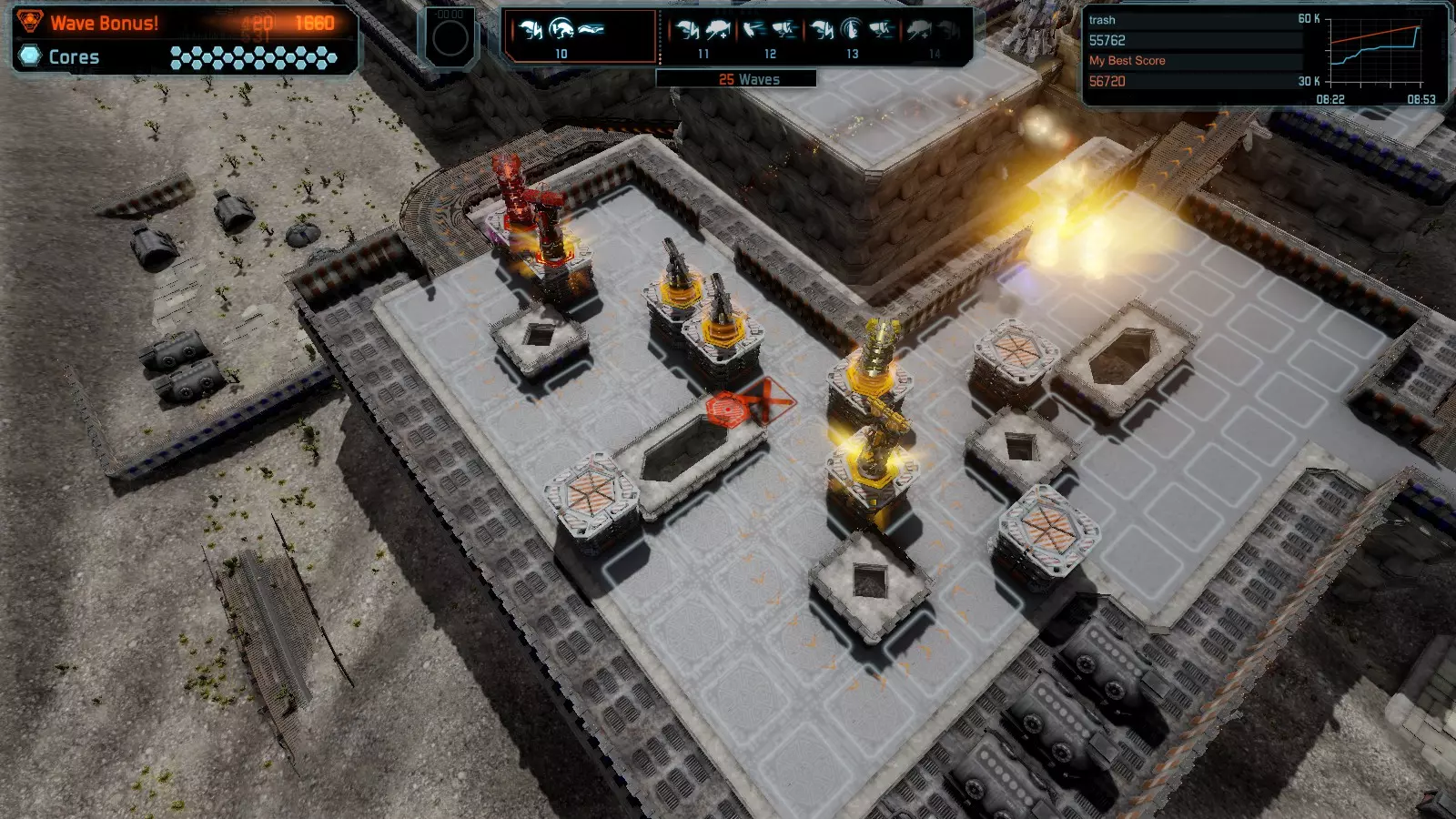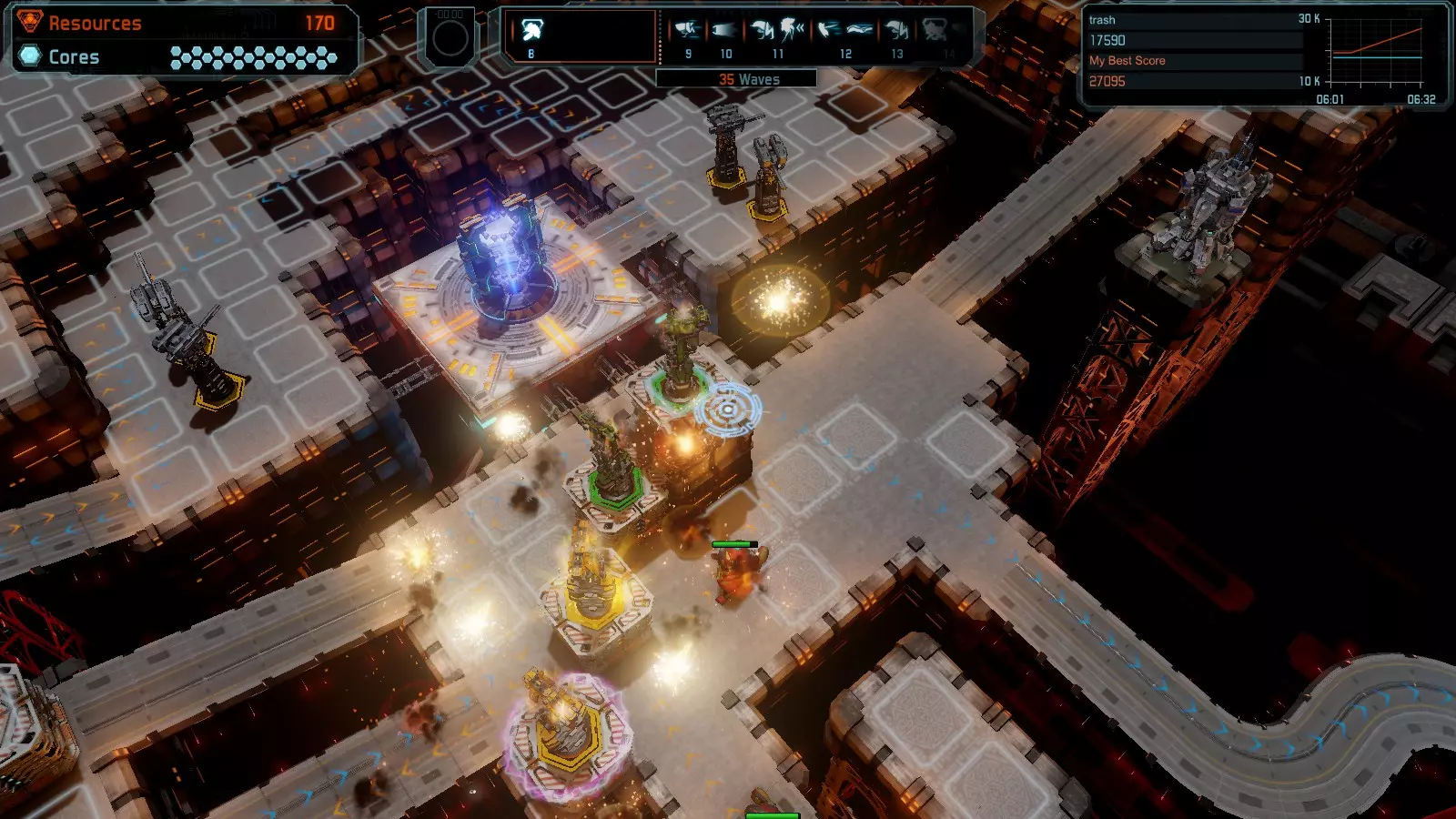 地图08 沸点 本指南介绍如何在开放模式和竞争模式下的简单难度中在此地图获得金牌。 以下所有模式均可使用此布局获得金牌: 固定资源 焦点 满载 冰封核心 练习 建造方案: 1个助推器作为阻挡物 1个红色时间扭曲塔 2个助推器搭配2个红色震荡塔,其中1个震荡塔配备干扰器,1个配备得分加成 7个助推器搭配7个红色加农炮 2个助推器搭配2个红色激光塔,其中1个激光塔配备得分加成,1个配备过载