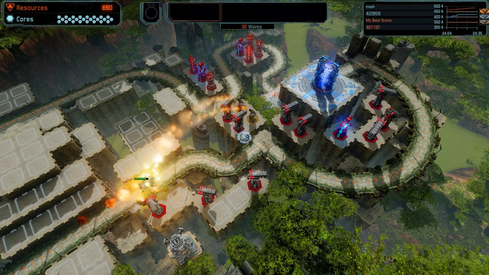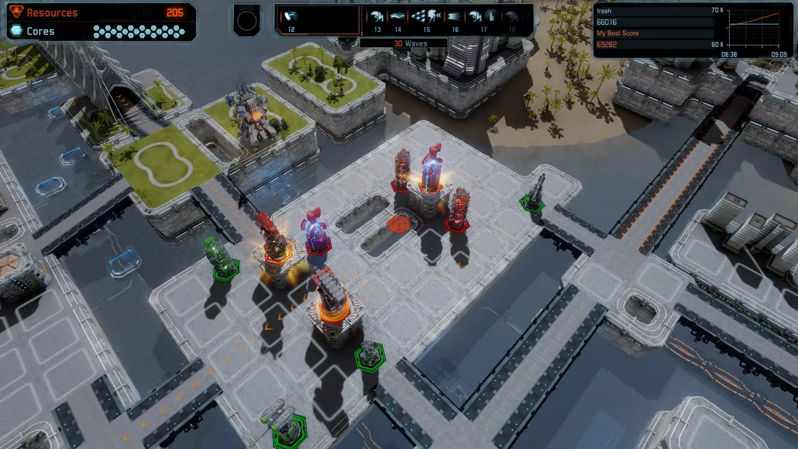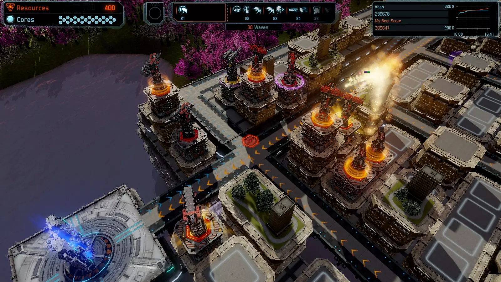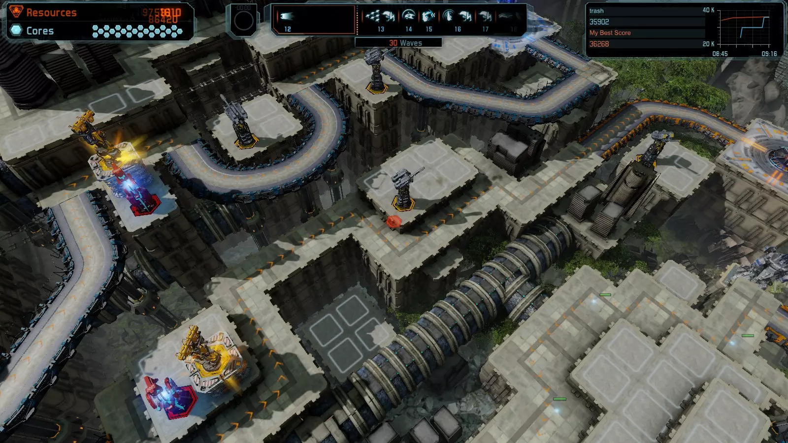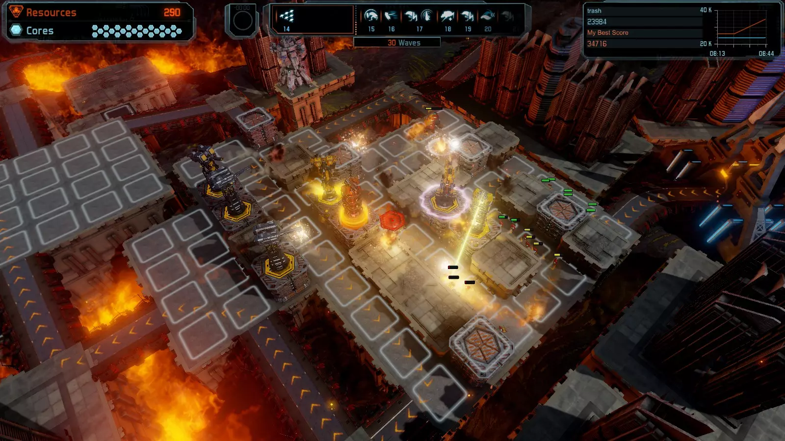地图08 沸点 本指南介绍如何在开放模式和竞争模式下的简单难度中在此地图获得金牌。 以下所有模式均可使用此布局获得金牌: 固定资源 焦点 满载 冰封核心 练习 建造方案: 1个助推器作为阻挡物 1个红色时间扭曲塔 2个助推器搭配2个红色震荡塔,其中1个震荡塔配备干扰器,1个配备得分加成 7个助推器搭配7个红色加农炮 2个助推器搭配2个红色激光塔,其中1个激光塔配备得分加成,1个配备过载