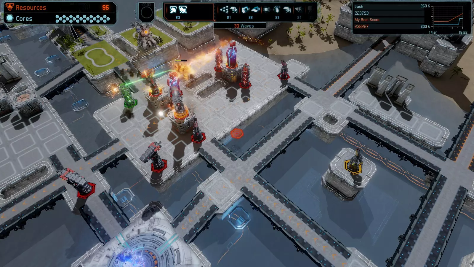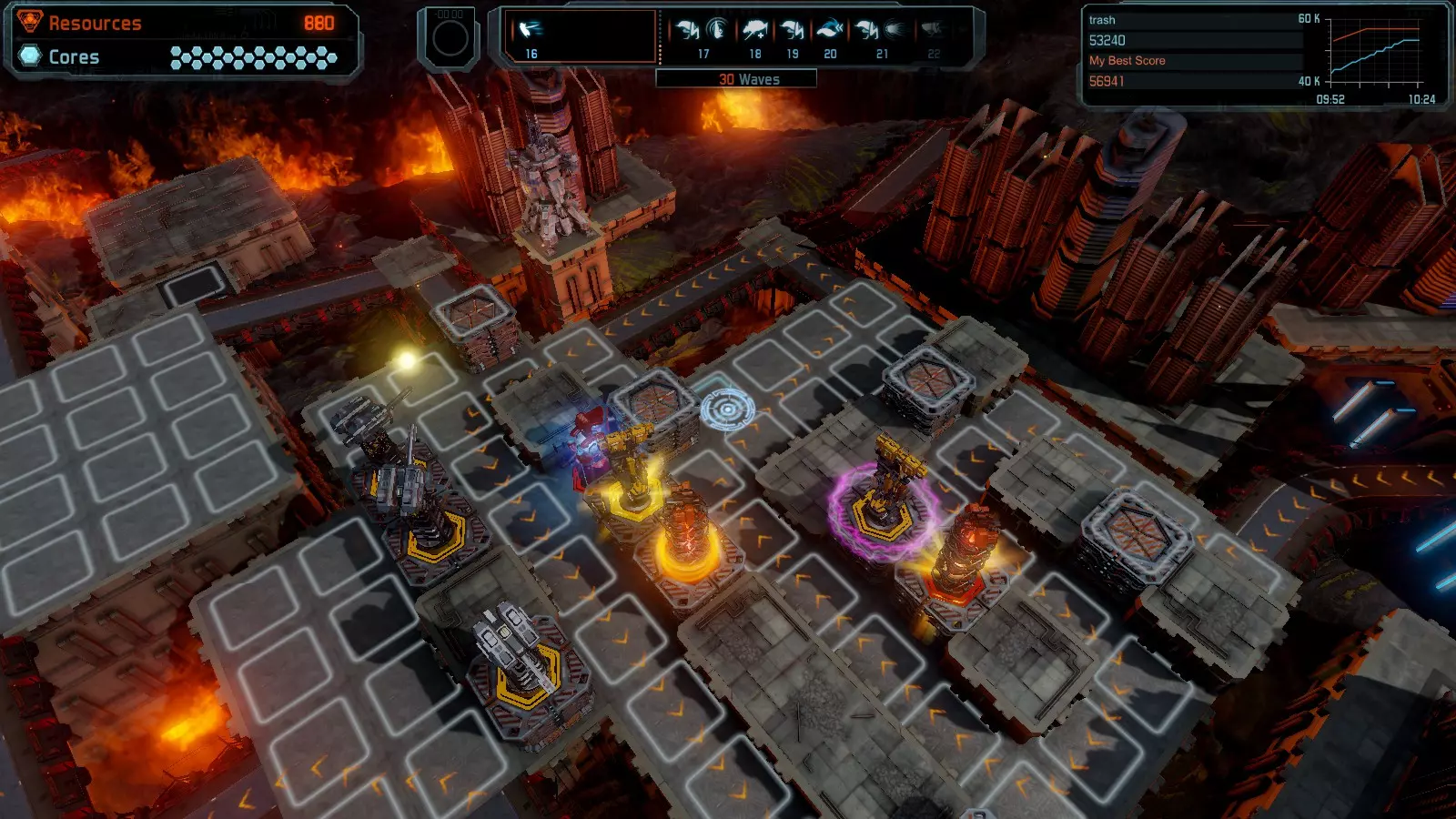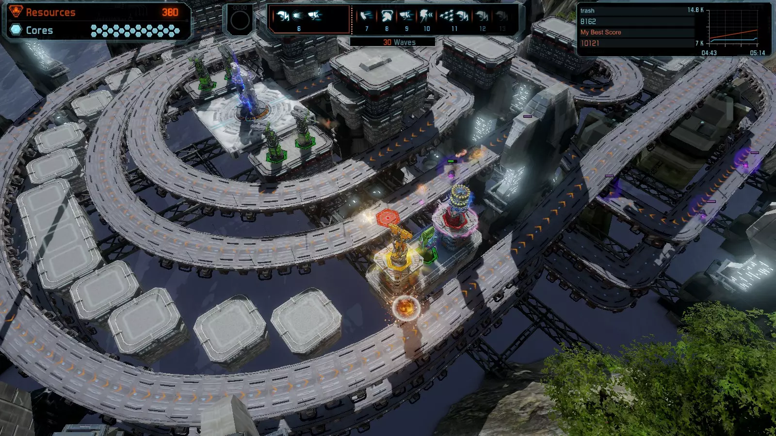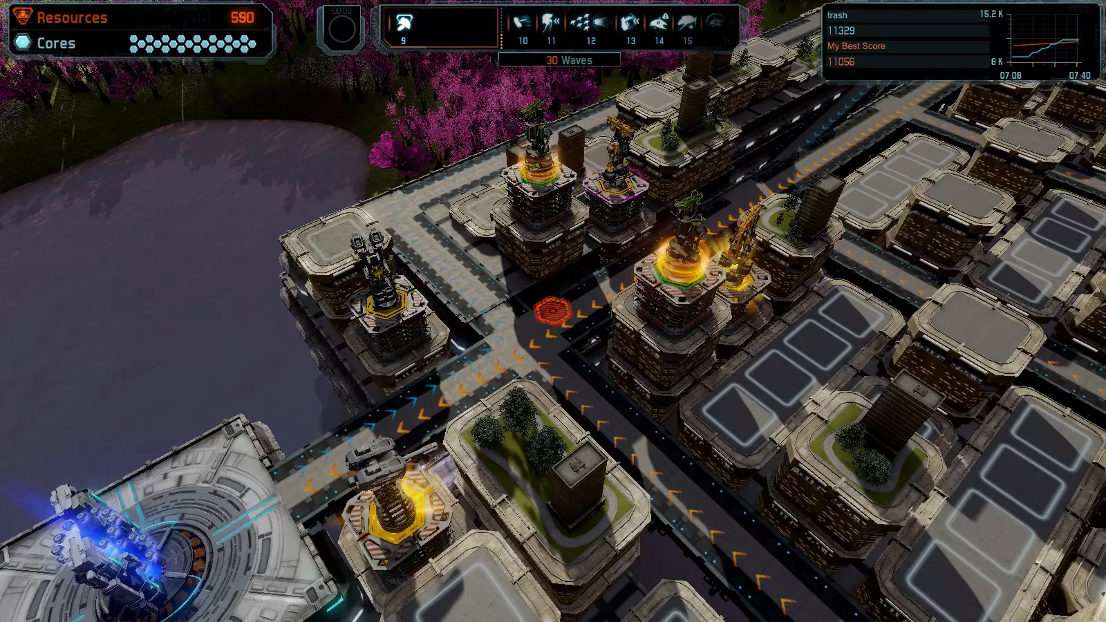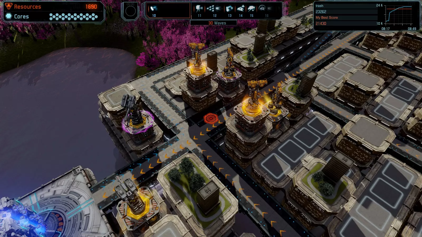 地图08 沸点 本指南介绍如何在开放模式和竞争模式下的简单难度中在此地图获得金牌。 以下所有模式均可使用此布局获得金牌: 固定资源 焦点 满载 冰封核心 练习 建造方案: 1个助推器作为阻挡物 1个红色时间扭曲塔 2个助推器搭配2个红色震荡塔,其中1个震荡塔配备干扰器,1个配备得分加成 7个助推器搭配7个红色加农炮 2个助推器搭配2个红色激光塔,其中1个激光塔配备得分加成,1个配备过载