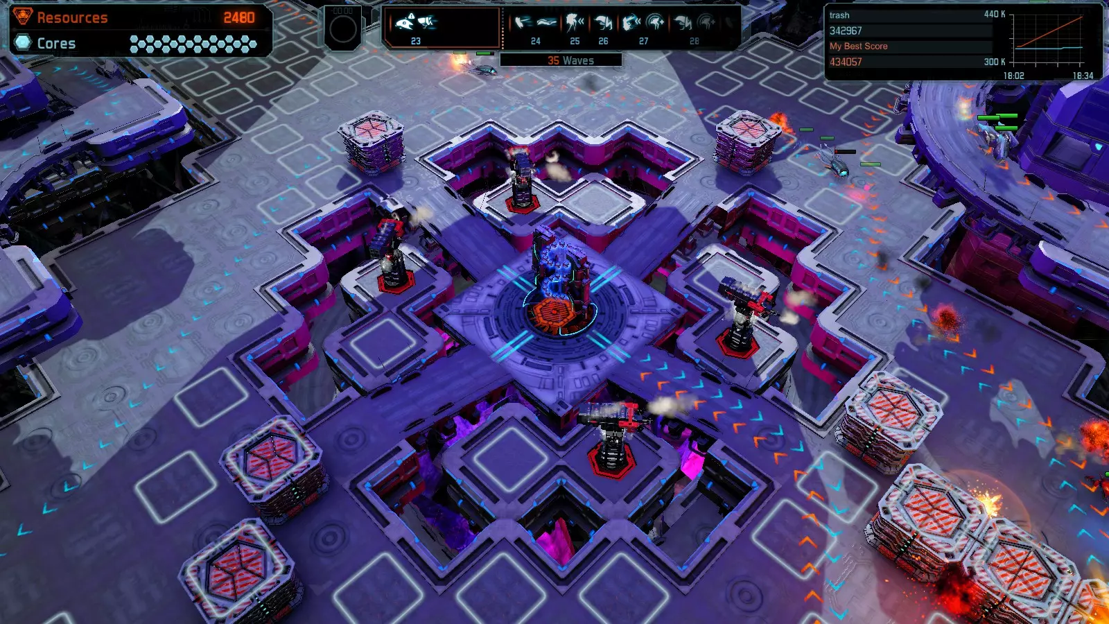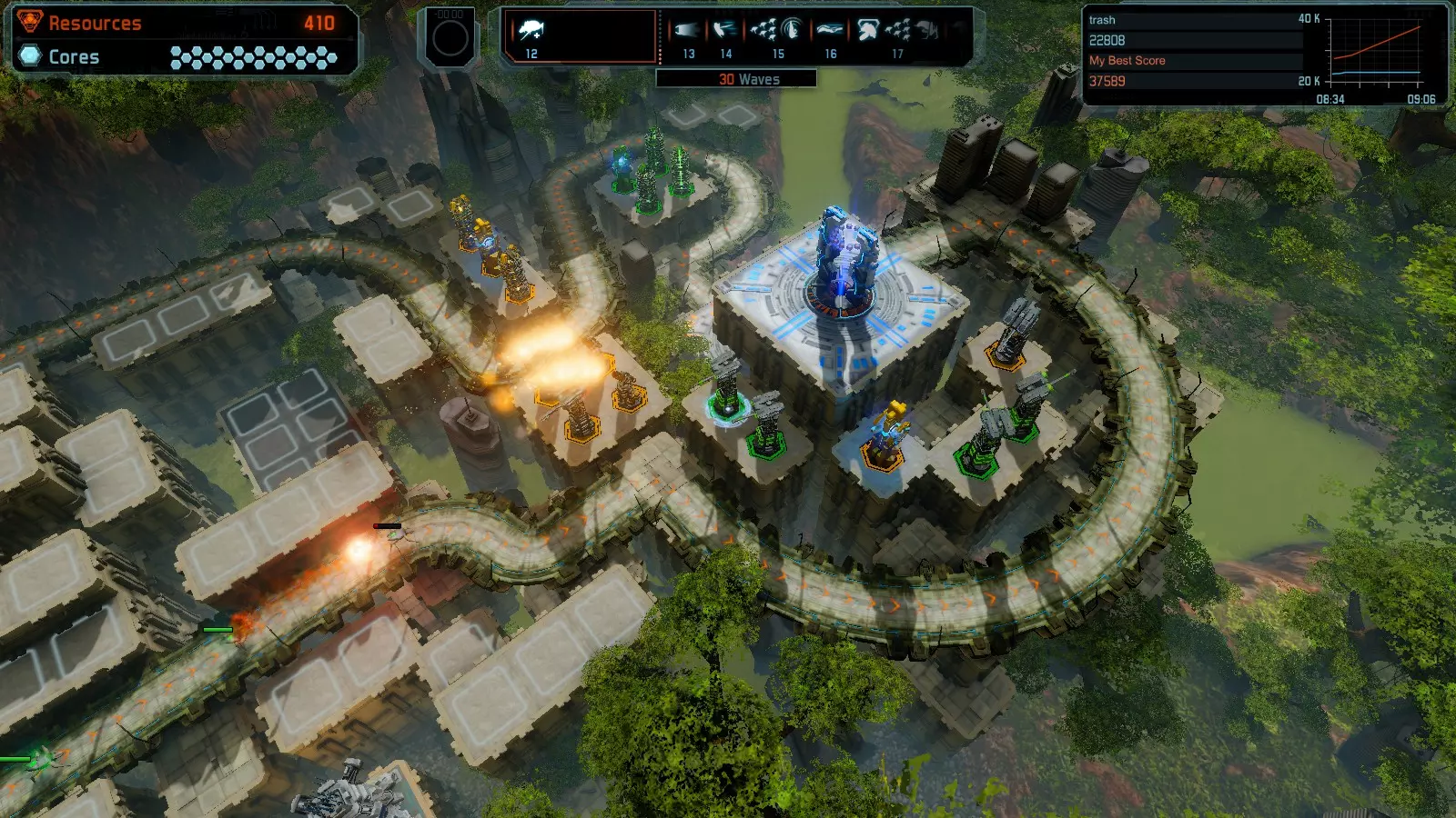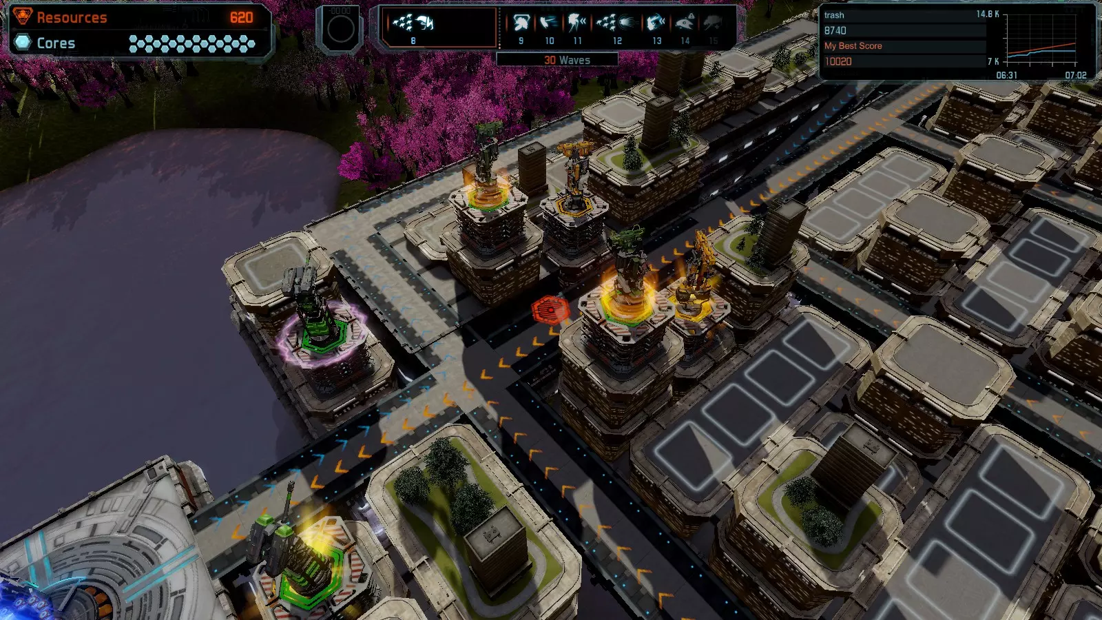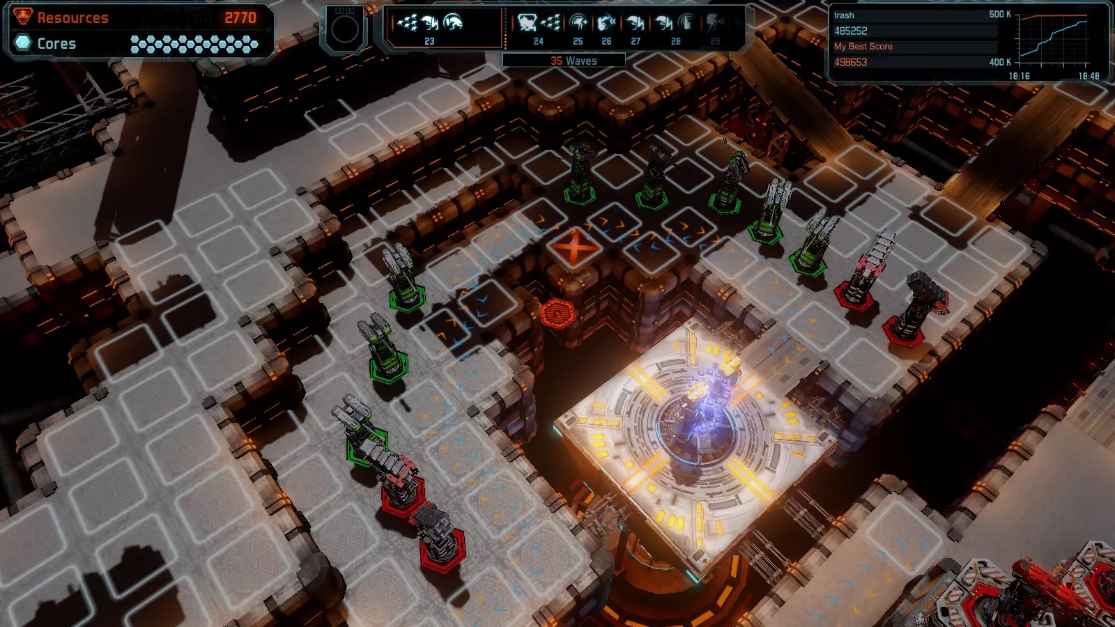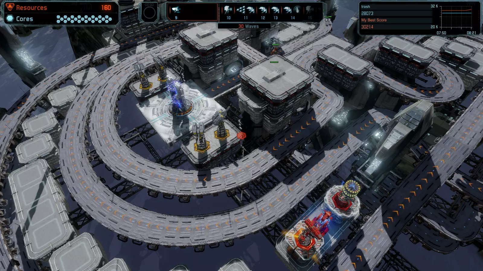 地图08 沸点 本指南介绍如何在开放模式和竞争模式下的简单难度中在此地图获得金牌。 以下所有模式均可使用此布局获得金牌: 固定资源 焦点 满载 冰封核心 练习 建造方案: 1个助推器作为阻挡物 1个红色时间扭曲塔 2个助推器搭配2个红色震荡塔,其中1个震荡塔配备干扰器,1个配备得分加成 7个助推器搭配7个红色加农炮 2个助推器搭配2个红色激光塔,其中1个激光塔配备得分加成,1个配备过载