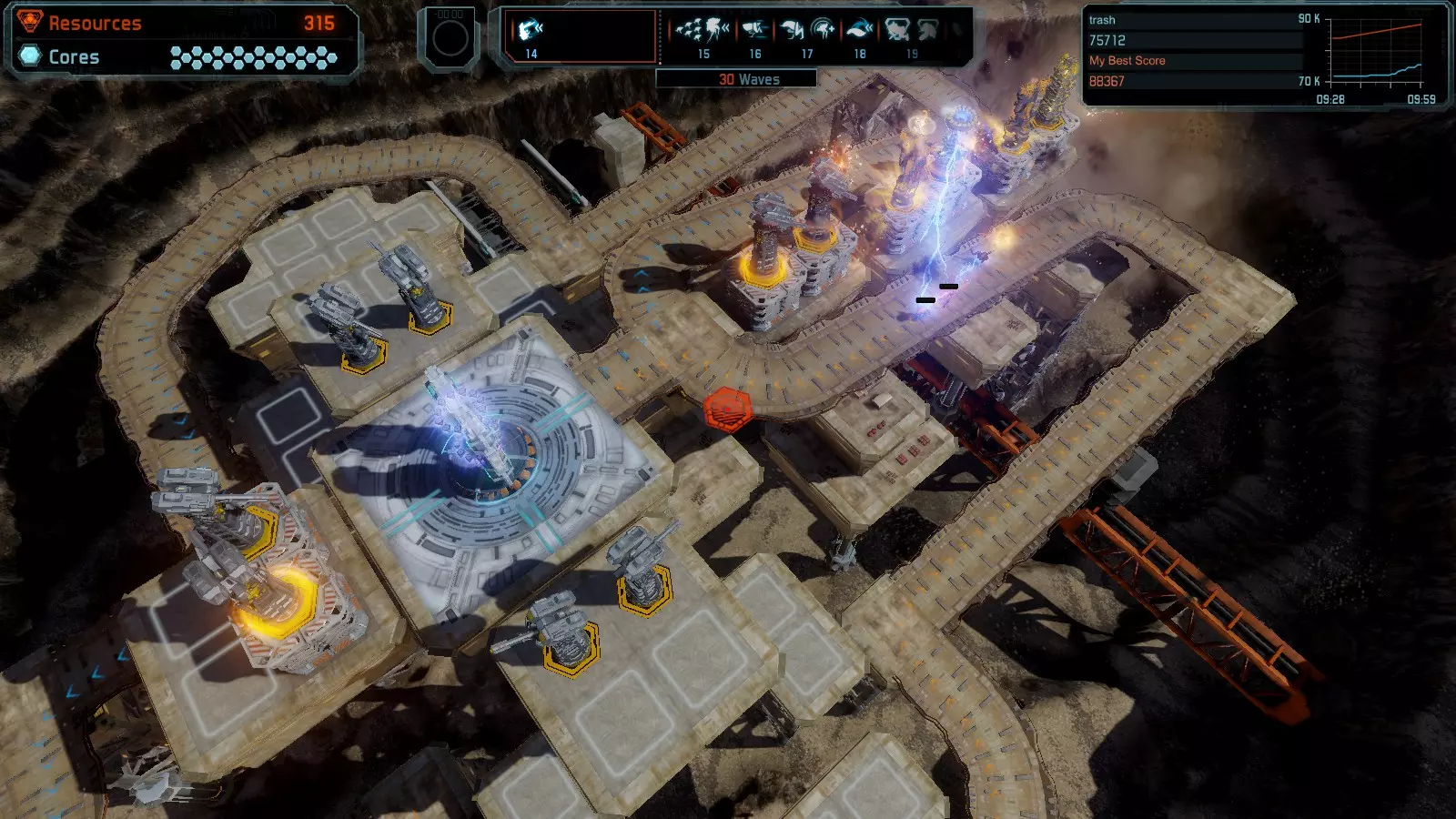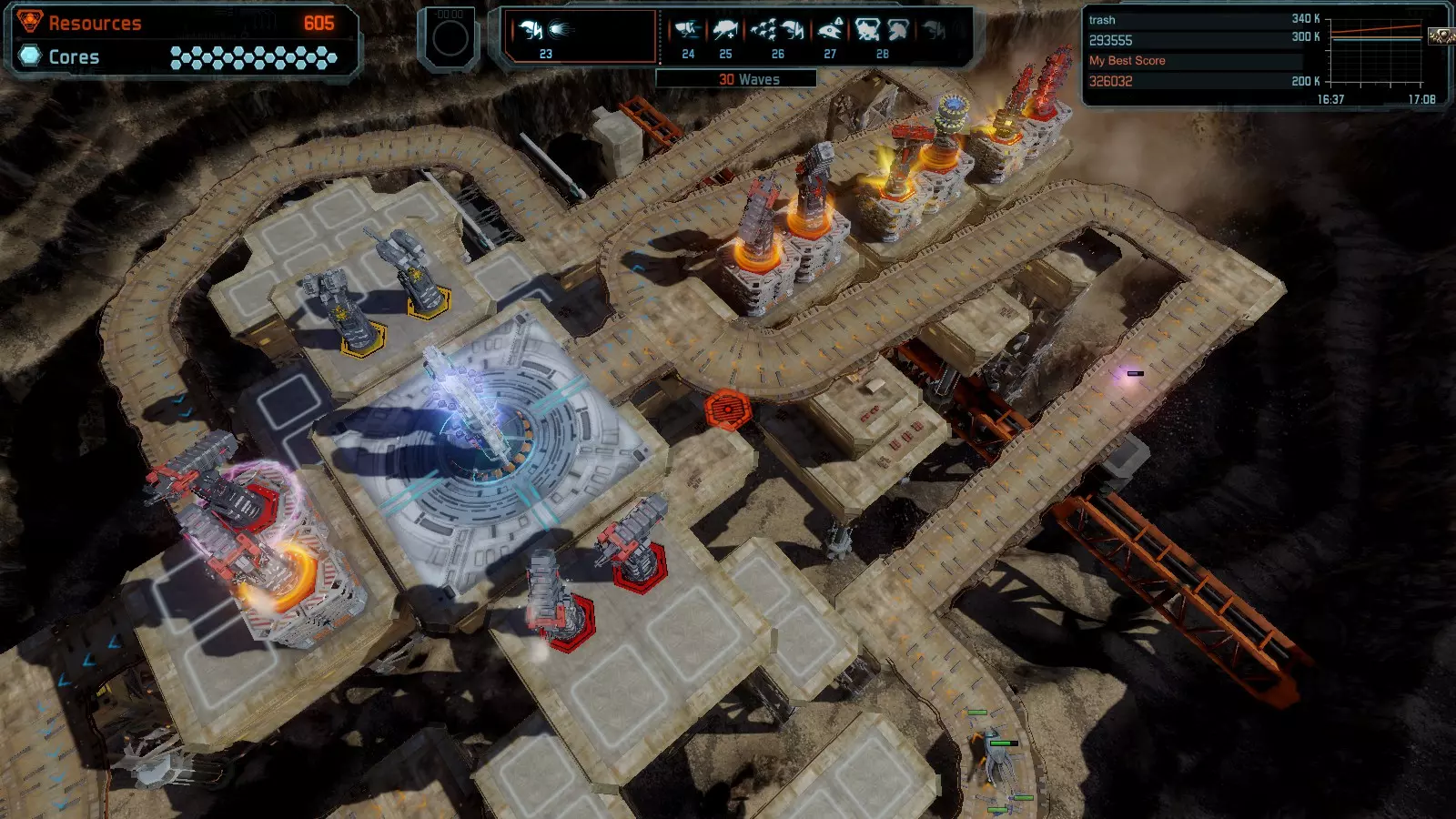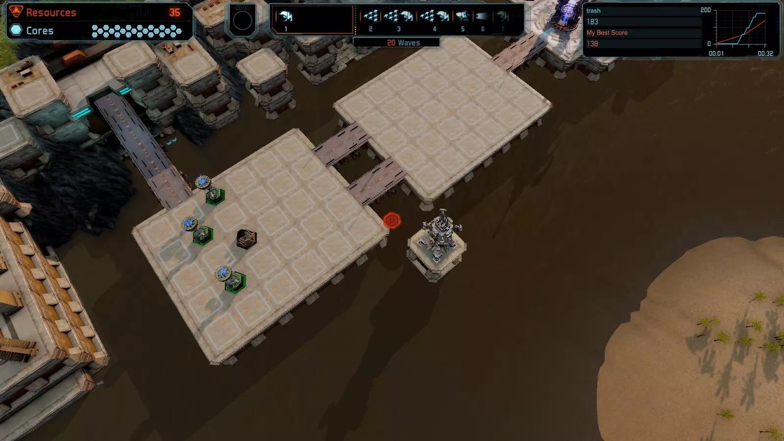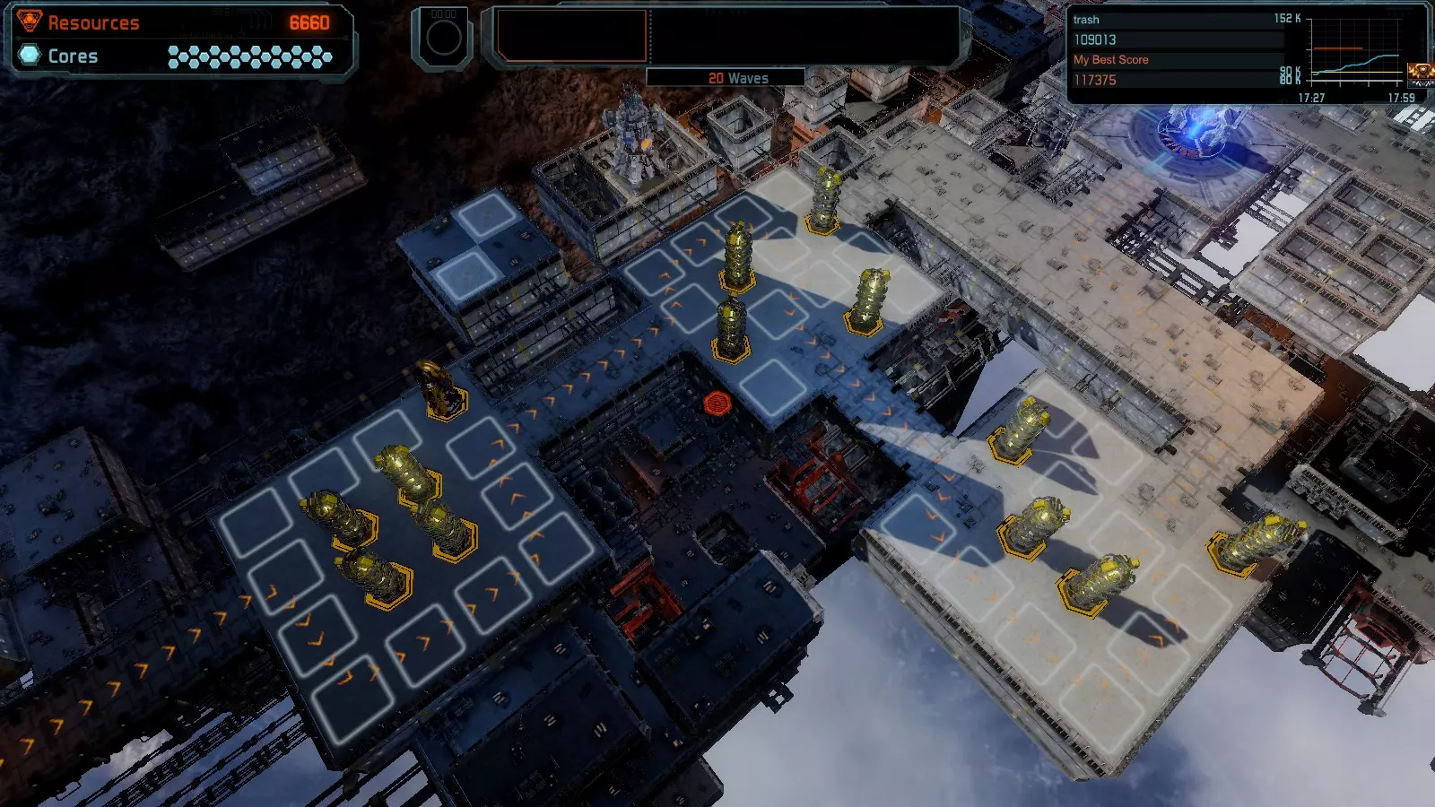 17号地图【资源匮乏】 本指南介绍如何在简单难度的开放模式和竞争模式下在此地图获得金牌。 此布局可在以下所有模式中获得金牌: - 固定资源 - 焦点 - 有限塔楼 - 满载 - 冰封核心 - 练习 建造方案: - 用1座带干扰器的红色特斯拉塔强化 - 1座红色时间塔 - 用1座带得分加成的震荡塔强化 - 用1座带干扰器的红色加农炮强化 - 用2座带得分加成的红色加农炮强化 - 用4座带超载的红色加农炮强化 - 4座红色加农炮