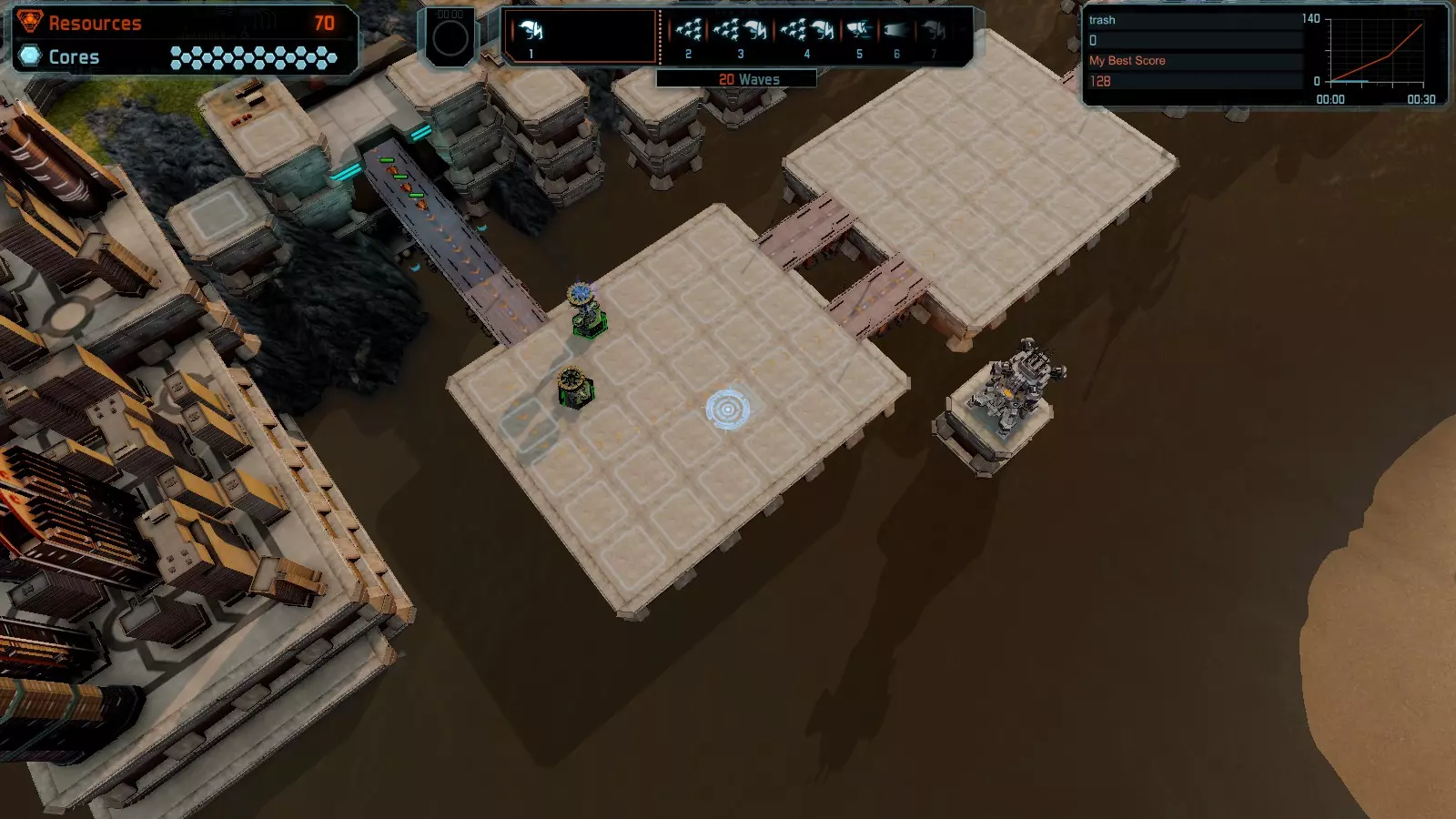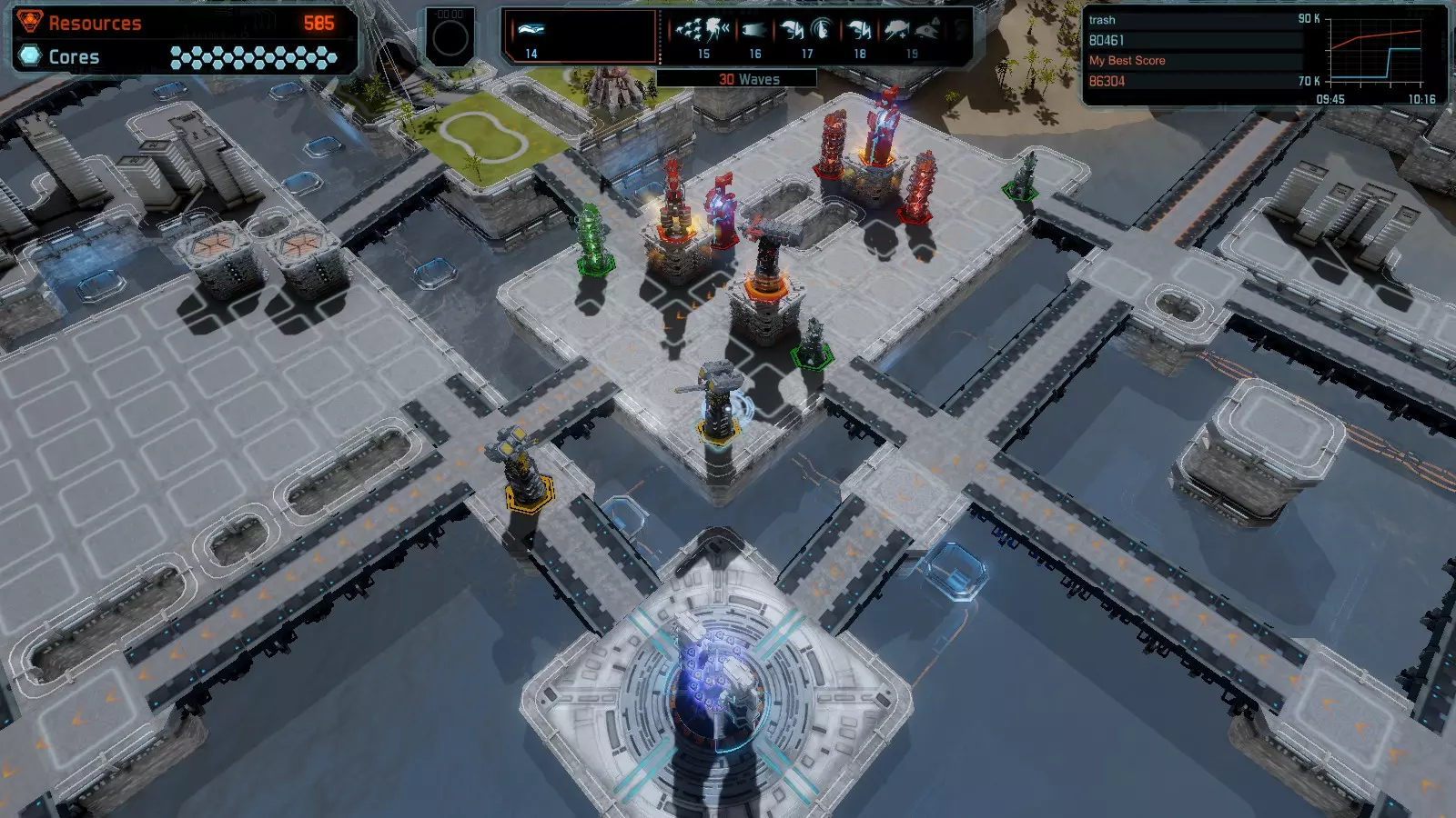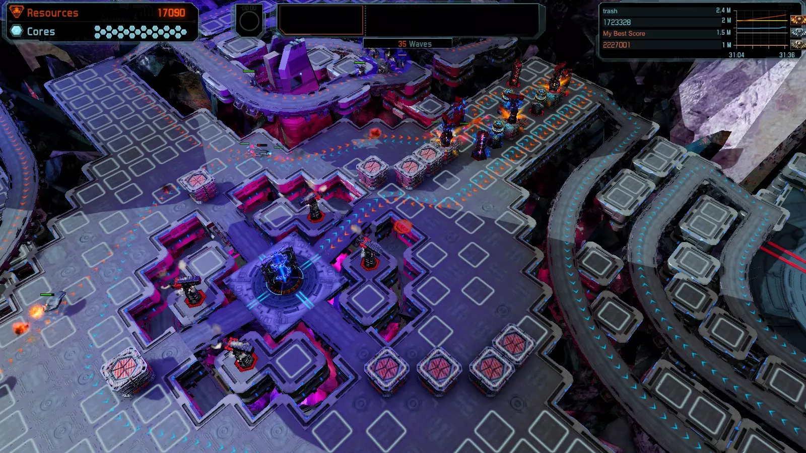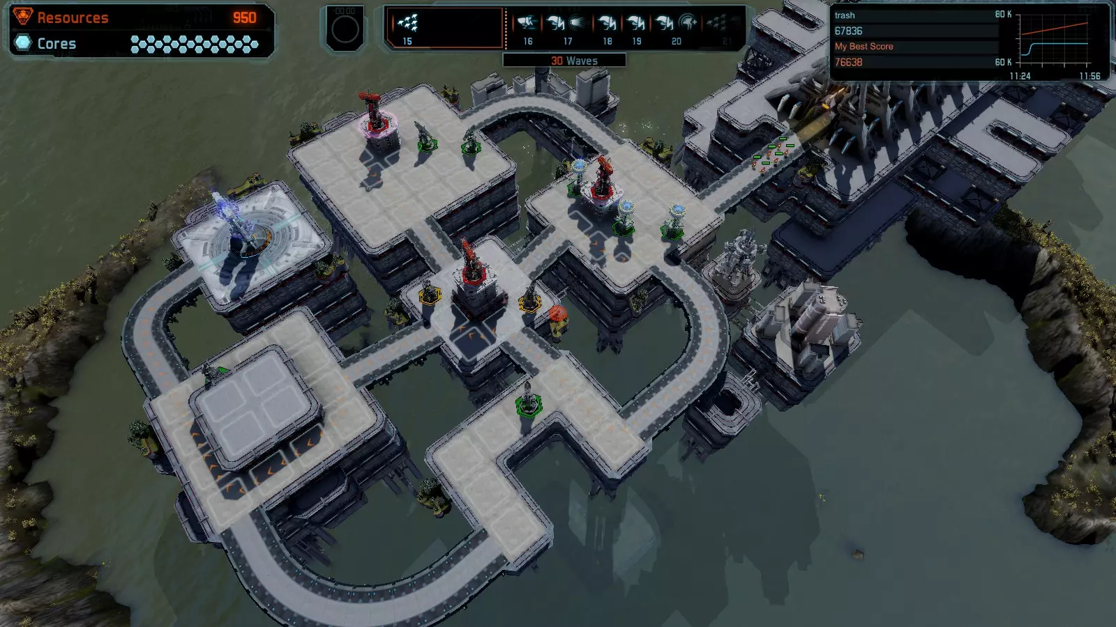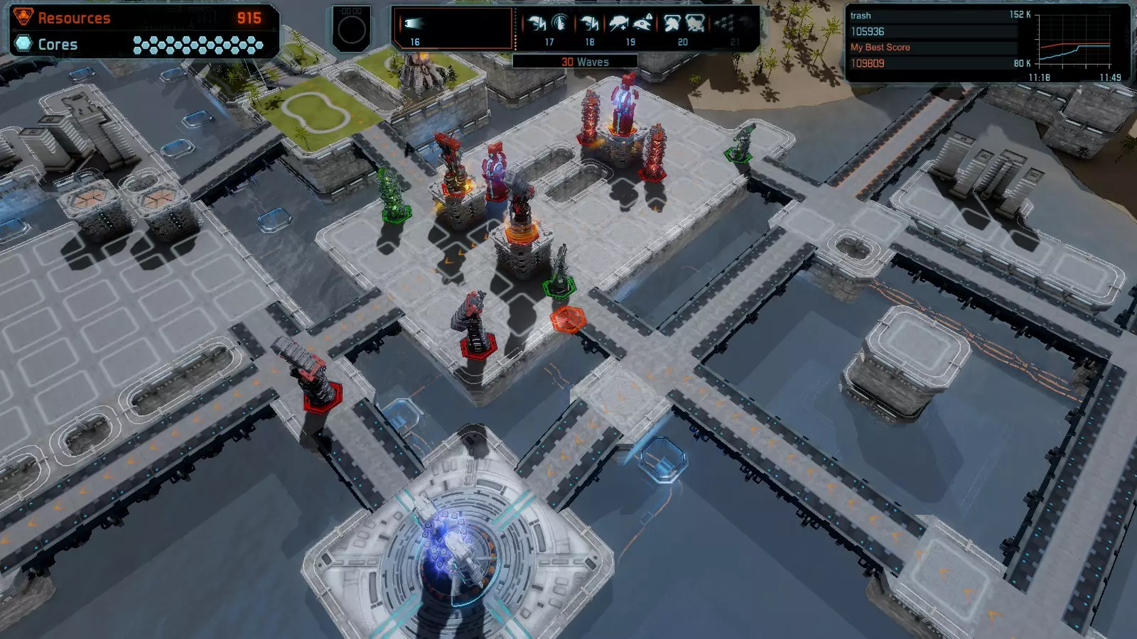 17号地图【资源匮乏】 本指南介绍如何在简单难度的开放模式和竞争模式下在此地图获得金牌。 此布局可在以下所有模式中获得金牌: - 固定资源 - 焦点 - 有限塔楼 - 满载 - 冰封核心 - 练习 建造方案: - 用1座带干扰器的红色特斯拉塔强化 - 1座红色时间塔 - 用1座带得分加成的震荡塔强化 - 用1座带干扰器的红色加农炮强化 - 用2座带得分加成的红色加农炮强化 - 用4座带超载的红色加农炮强化 - 4座红色加农炮