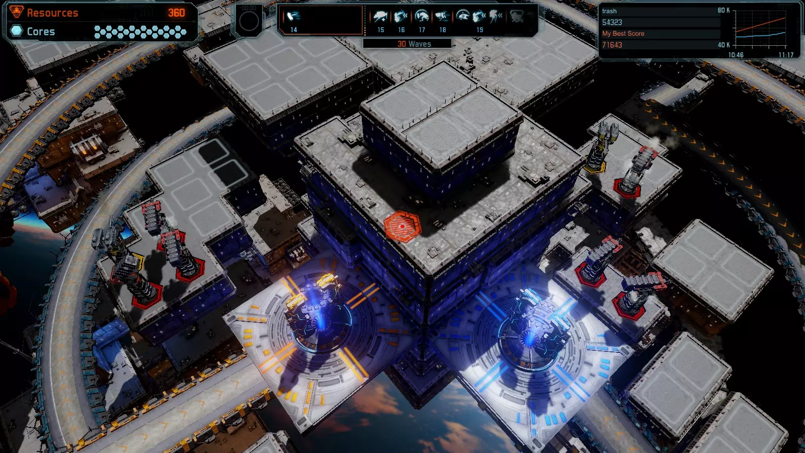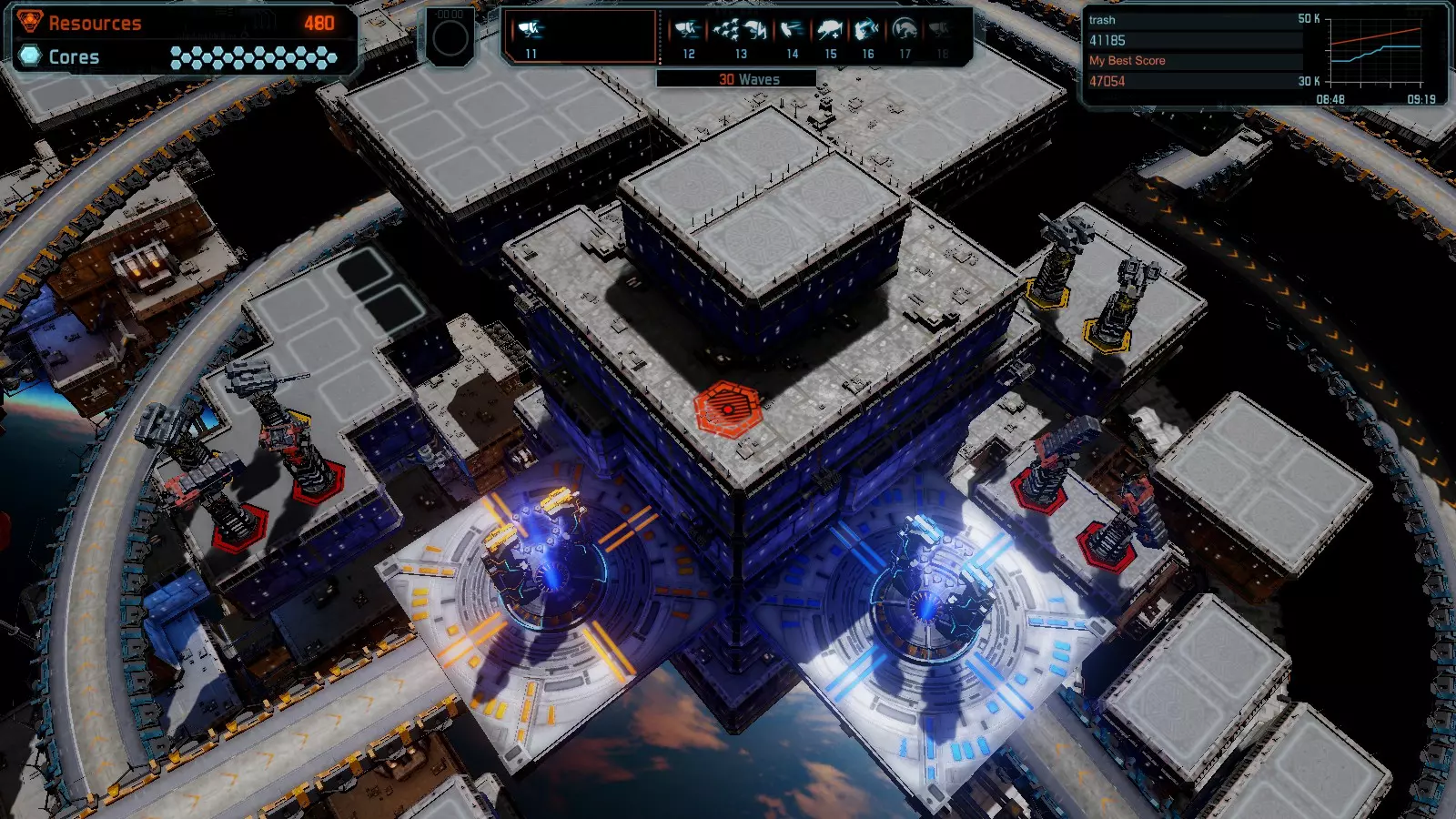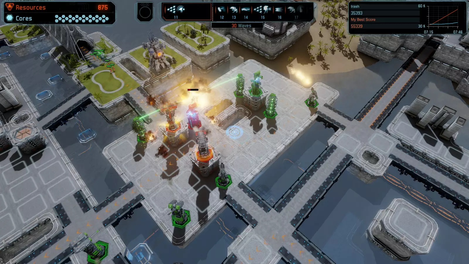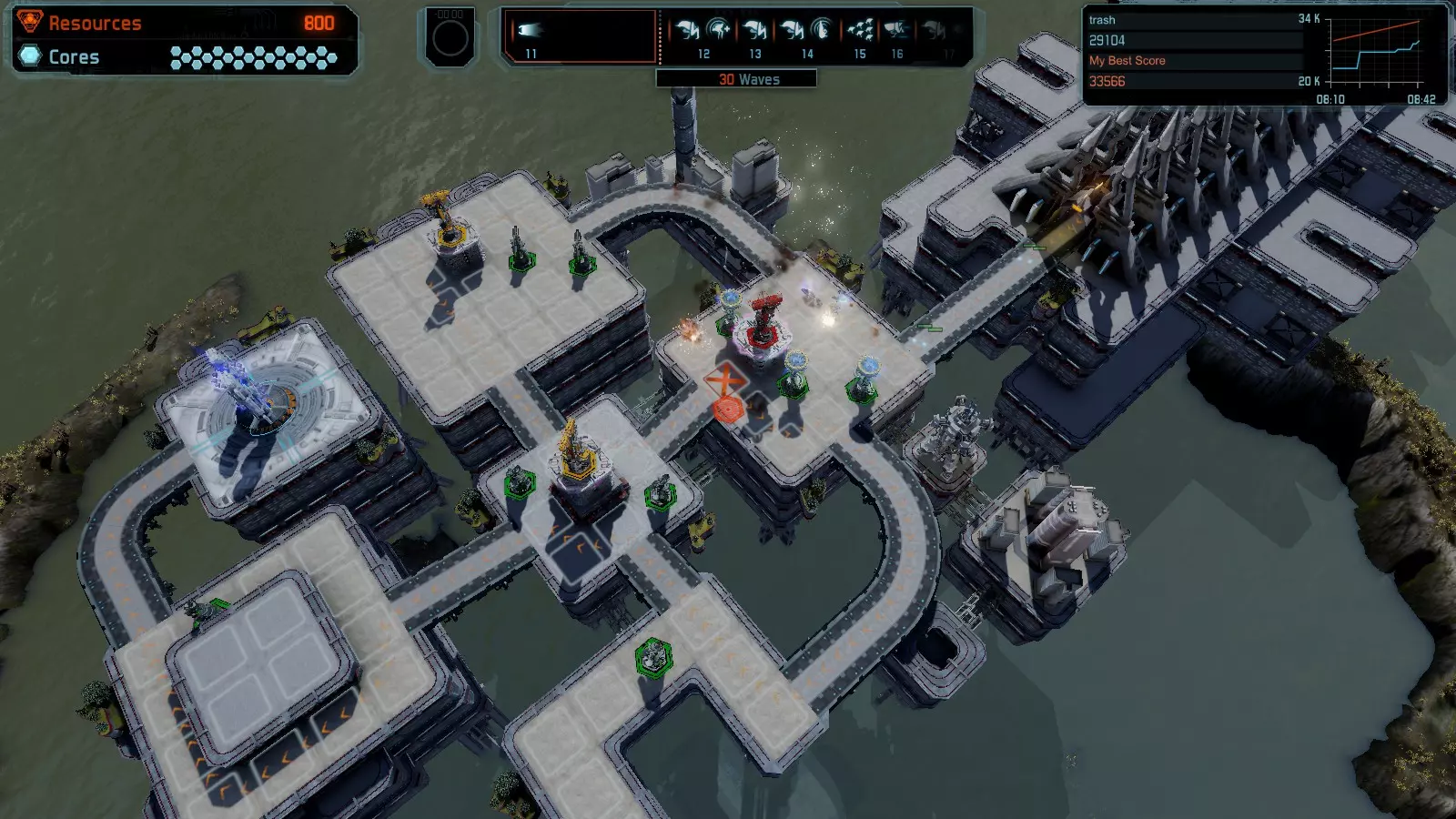 17号地图【资源匮乏】 本指南介绍如何在简单难度的开放模式和竞争模式下在此地图获得金牌。 此布局可在以下所有模式中获得金牌: - 固定资源 - 焦点 - 有限塔楼 - 满载 - 冰封核心 - 练习 建造方案: - 用1座带干扰器的红色特斯拉塔强化 - 1座红色时间塔 - 用1座带得分加成的震荡塔强化 - 用1座带干扰器的红色加农炮强化 - 用2座带得分加成的红色加农炮强化 - 用4座带超载的红色加农炮强化 - 4座红色加农炮