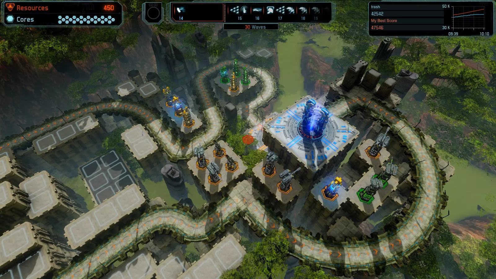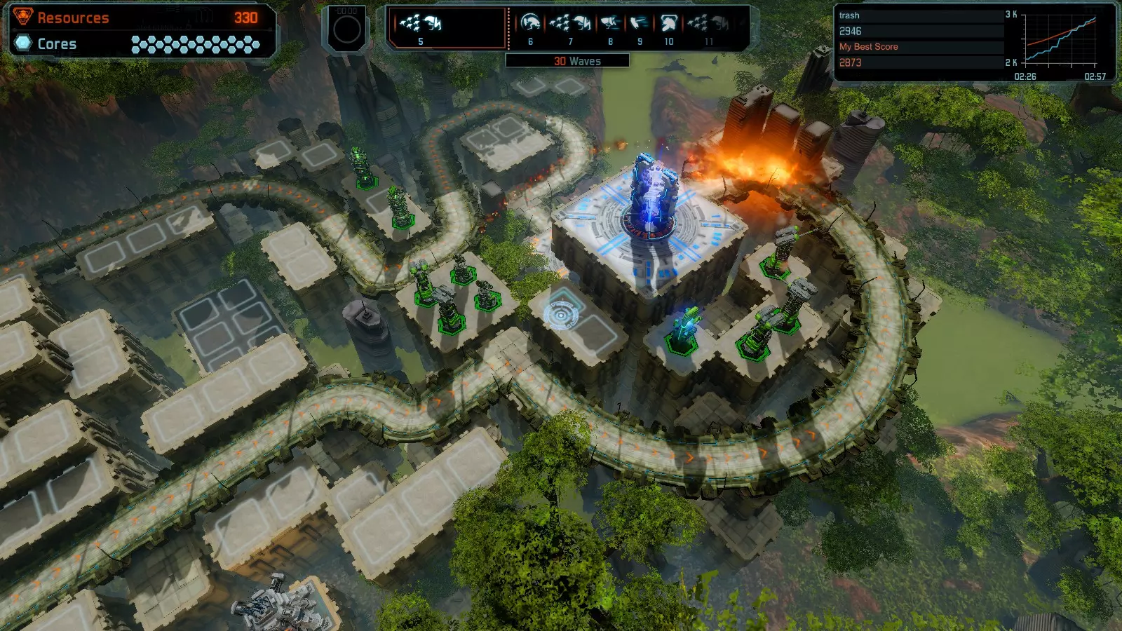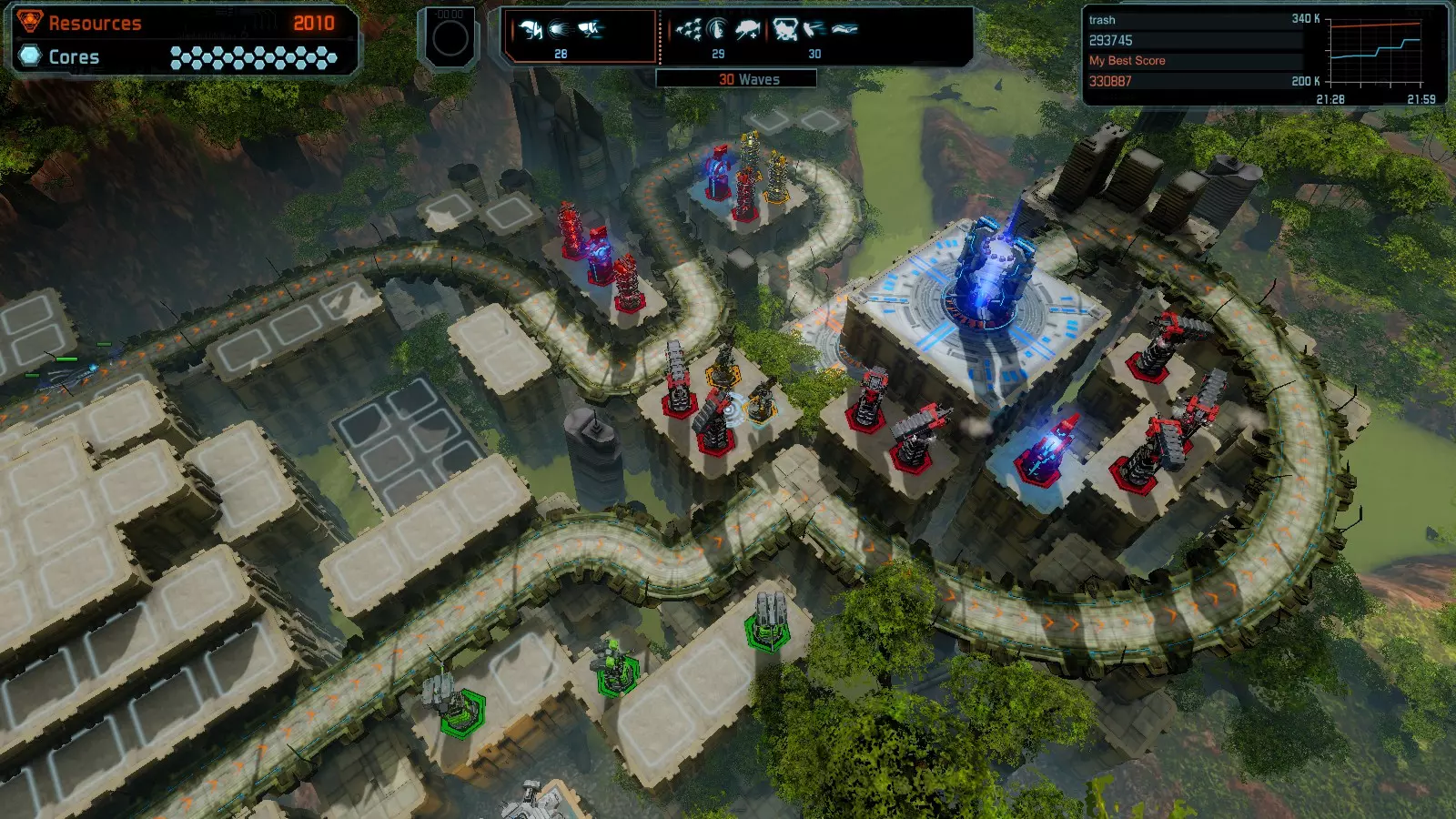 第10关:突破 本指南将帮助你在简单难度的开放模式和竞争模式下获得该地图的金牌。 以下所有模式均可使用此布局获得金牌: 固定资源 焦点 有限塔楼 全装 冰封核心 练习 建造方案: 2座红色时间塔 2座强化塔,搭配2座红色震荡塔(均带得分加成) 1座红色流星塔 7座红色加农炮