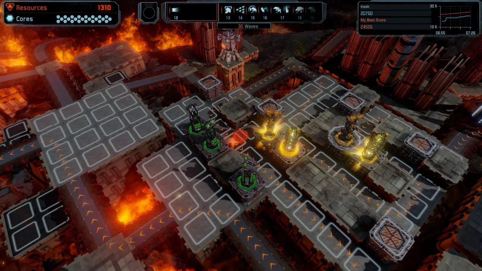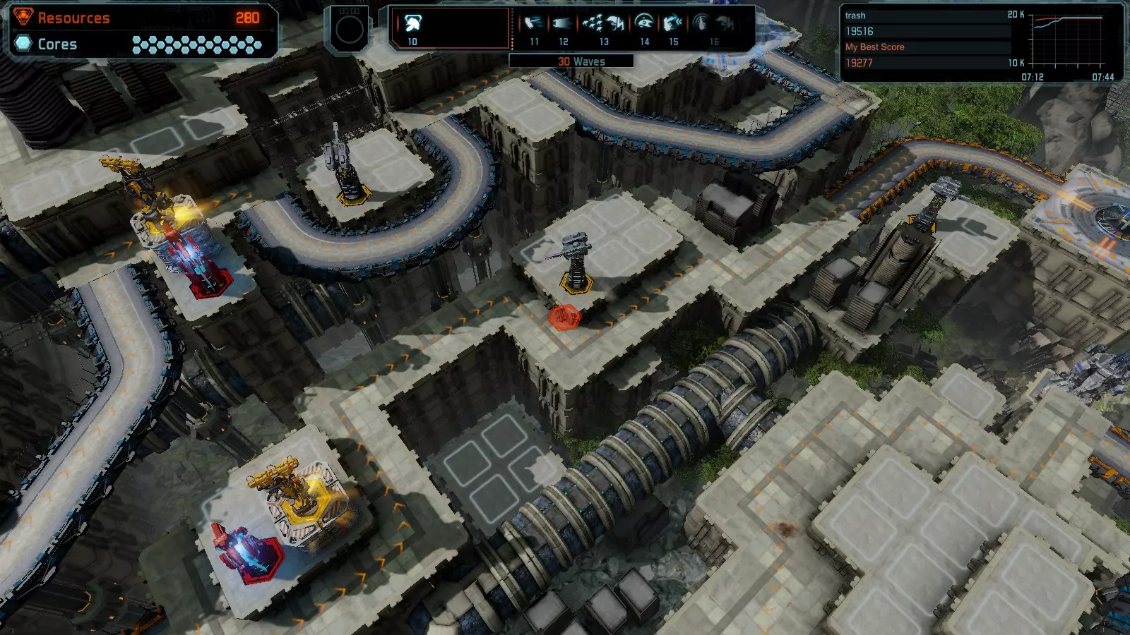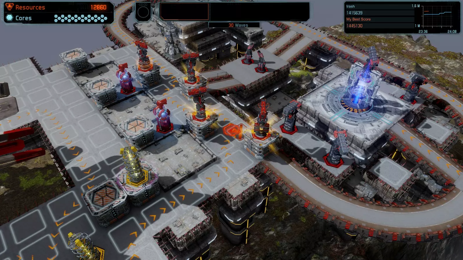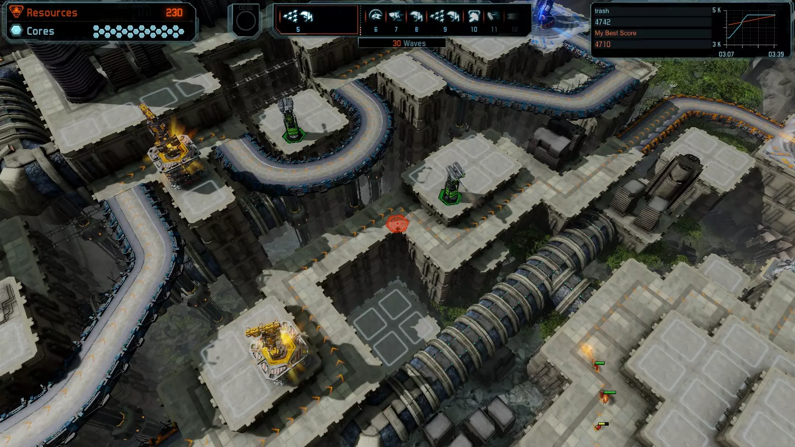第12关:入侵 本指南将介绍如何在简单难度的开放模式和竞争模式下,在此地图获得金牌。 此布局适用于以下所有模式并可获得金牌: 固定资源 电力中断 焦点 有限塔防 满载 冰封核心 练习 建造方案: 1座黄色激光塔 1座带黄色激光塔的增强塔(配备干扰器) 2座红色时间塔 2座红色流星塔 4座红色加农炮 4座增强塔(搭配4座红色震荡塔,均配备得分加成)