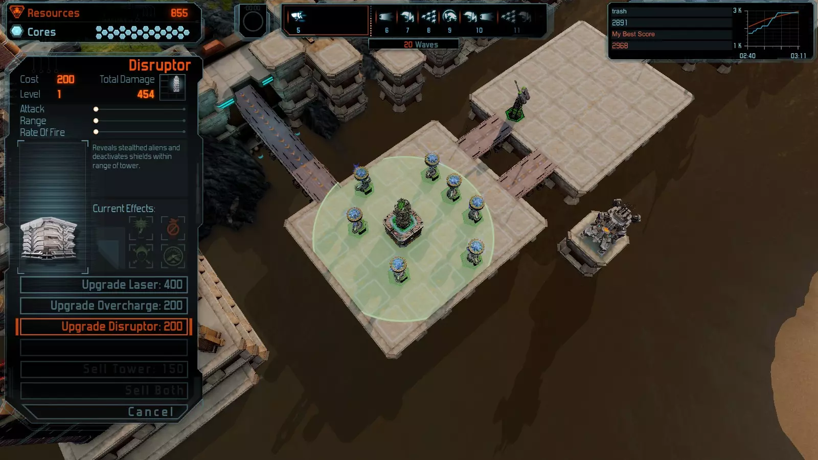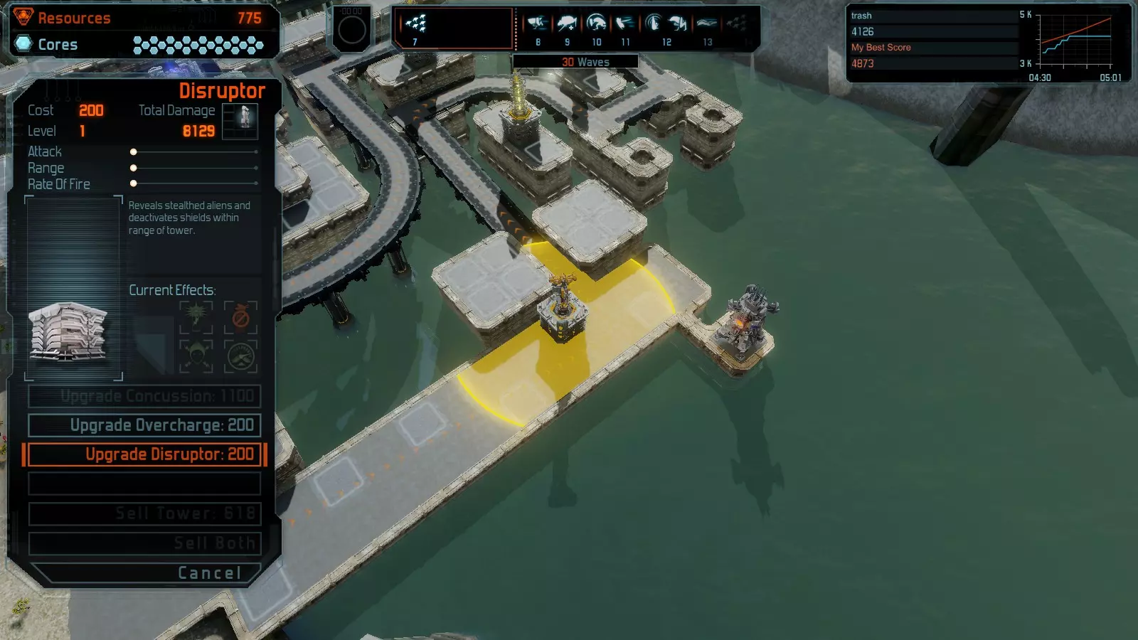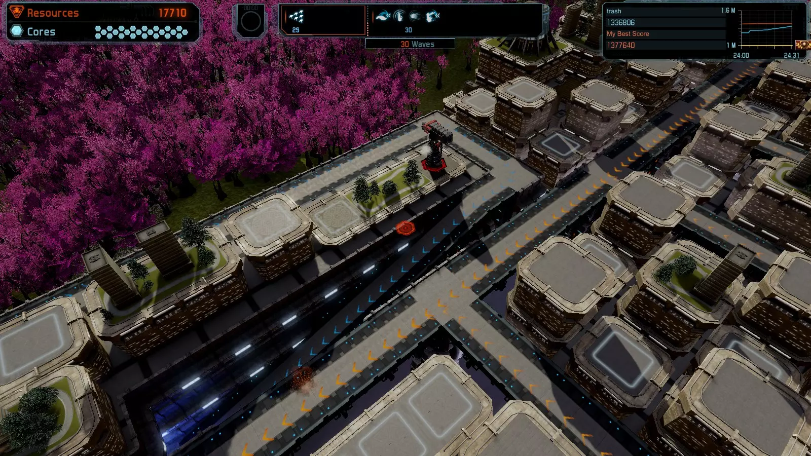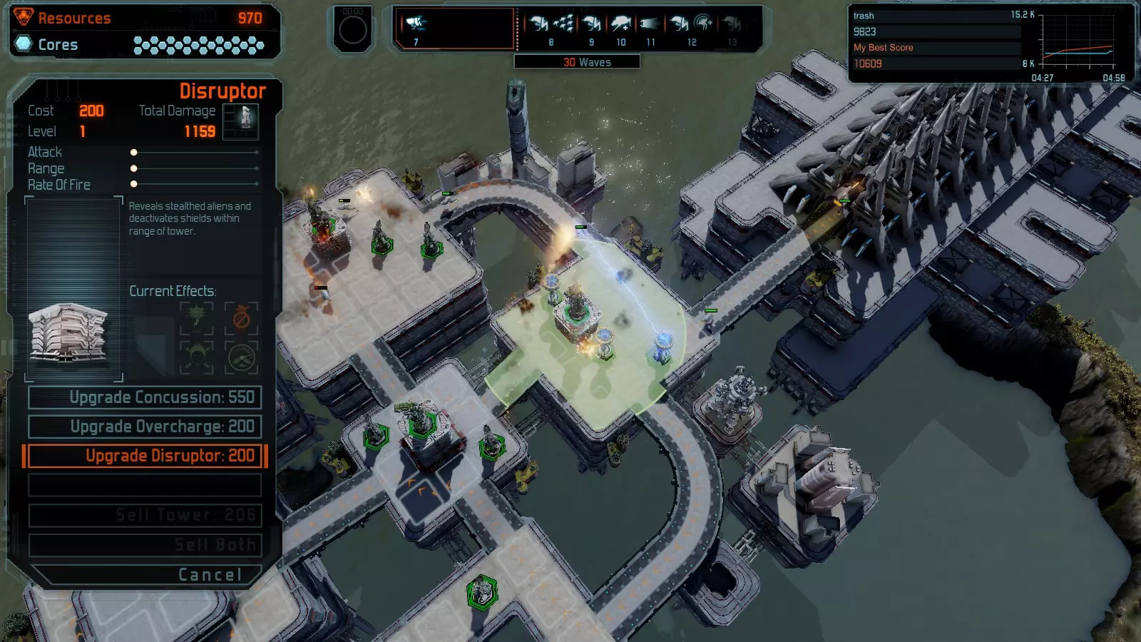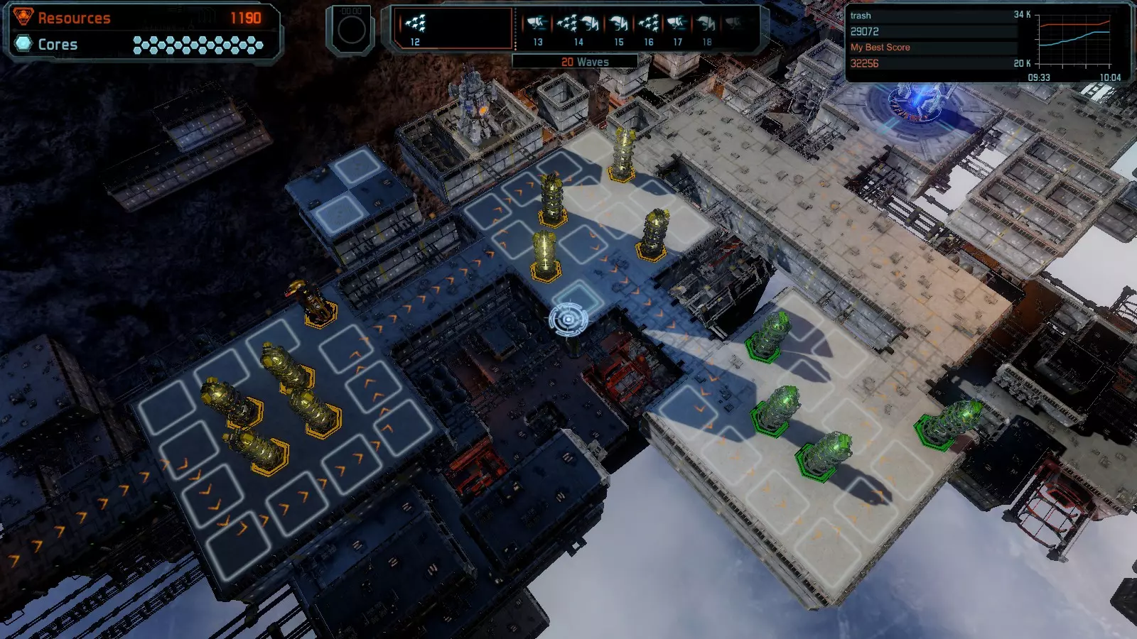 第12关:入侵 本指南将介绍如何在简单难度的开放模式和竞争模式下,在此地图获得金牌。 此布局适用于以下所有模式并可获得金牌: 固定资源 电力中断 焦点 有限塔防 满载 冰封核心 练习 建造方案: 1座黄色激光塔 1座带黄色激光塔的增强塔(配备干扰器) 2座红色时间塔 2座红色流星塔 4座红色加农炮 4座增强塔(搭配4座红色震荡塔,均配备得分加成)